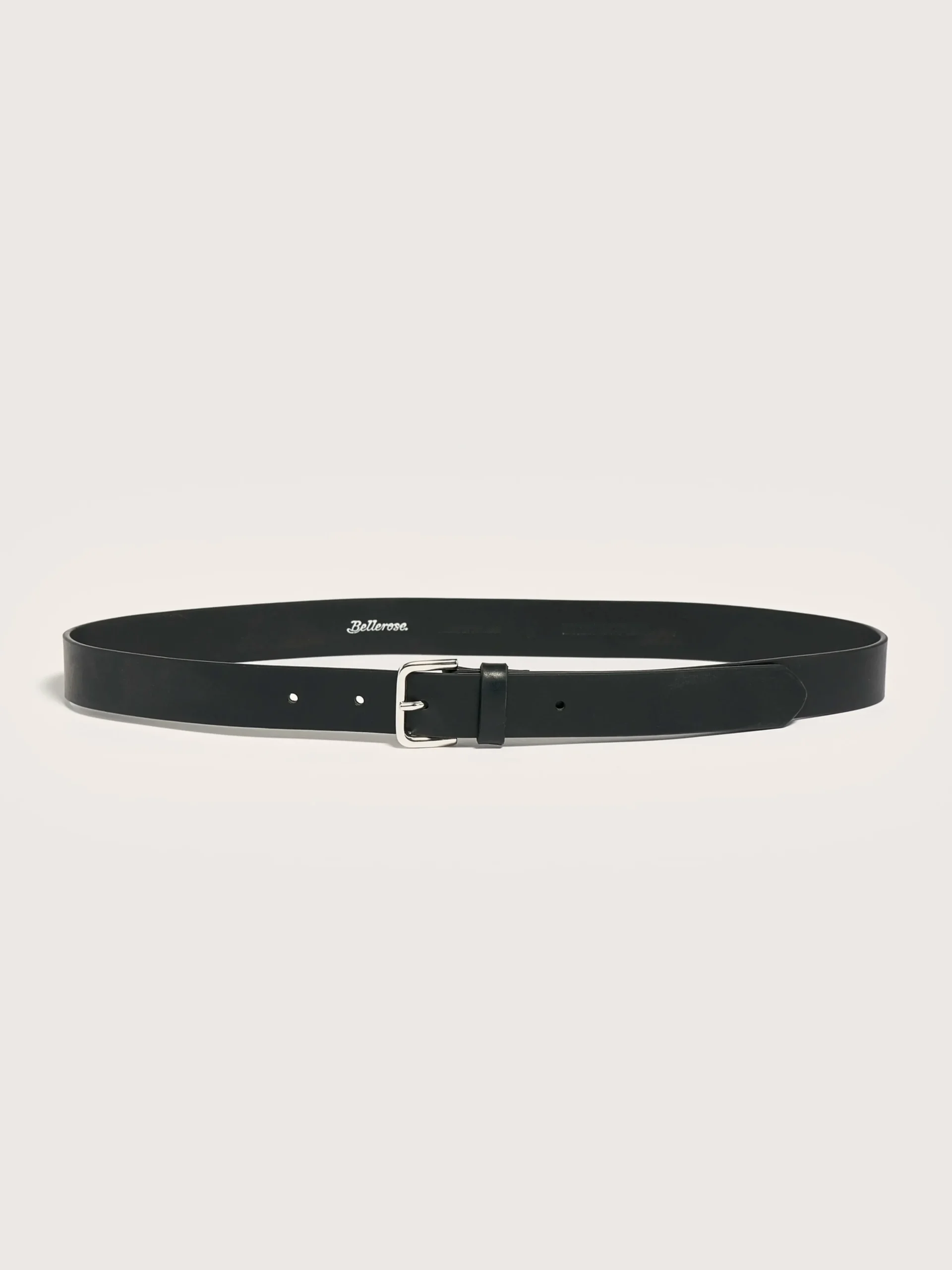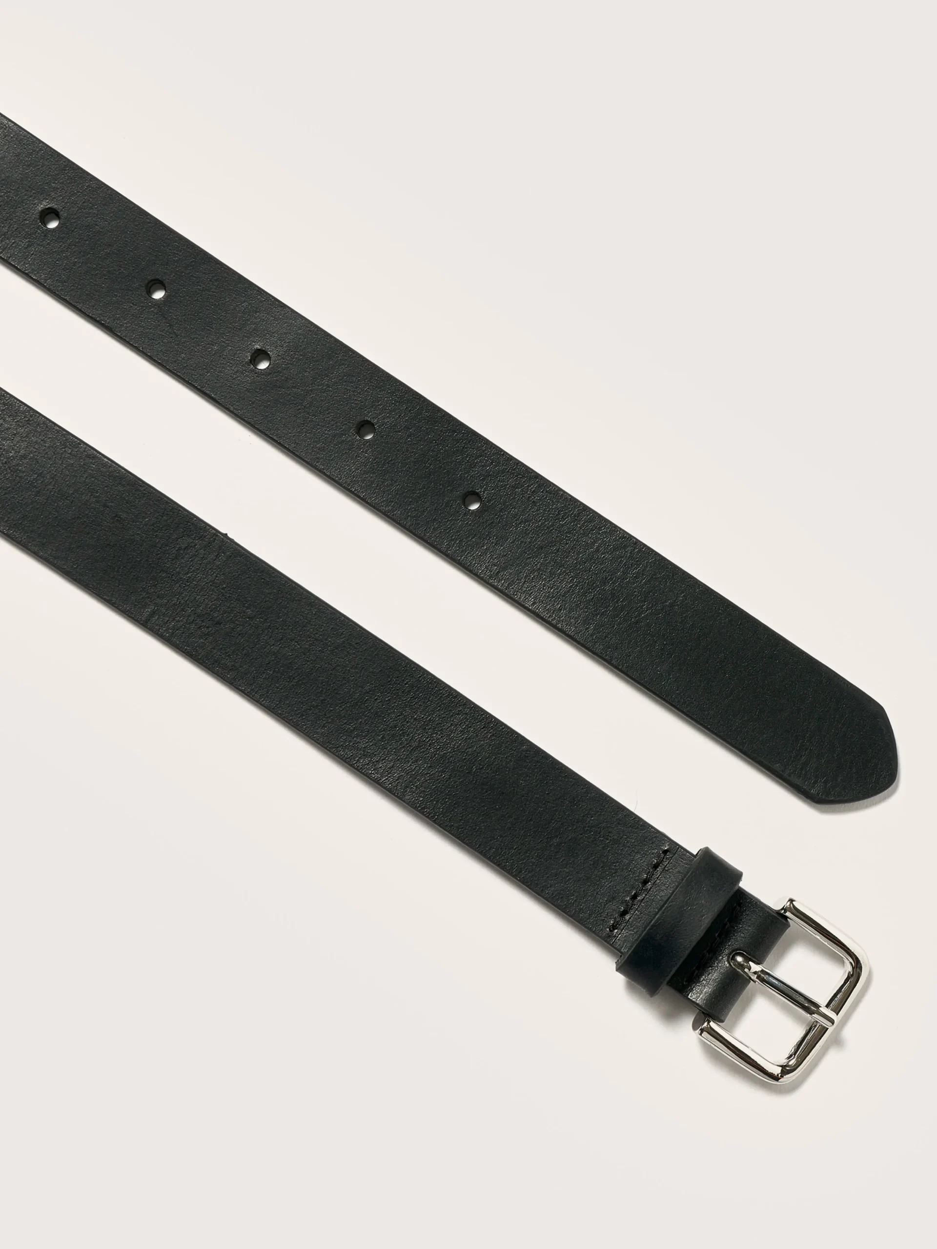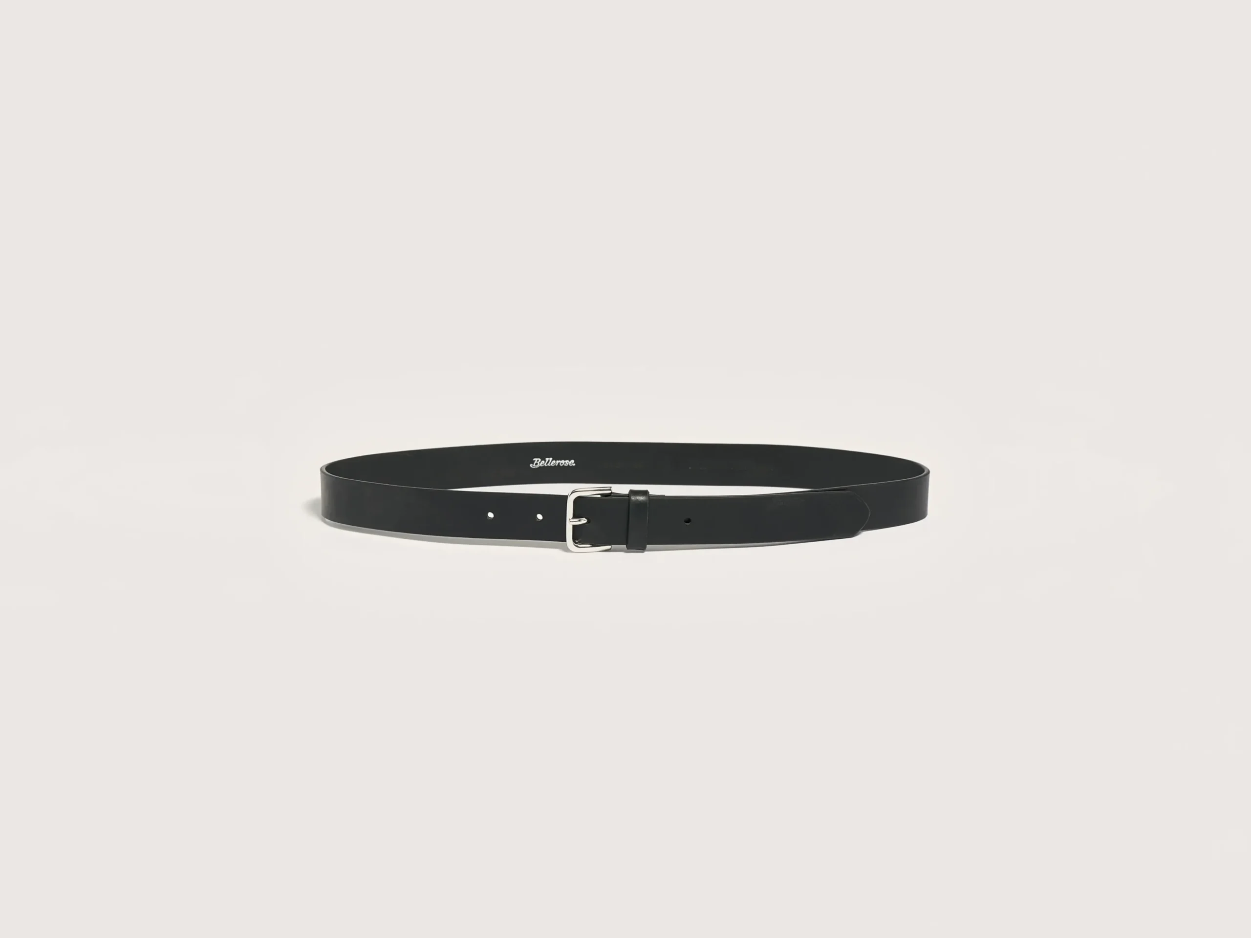 Klassieke riem van zwart leer met rechthoekige zilveren gesp en dubbele riemlussen.r