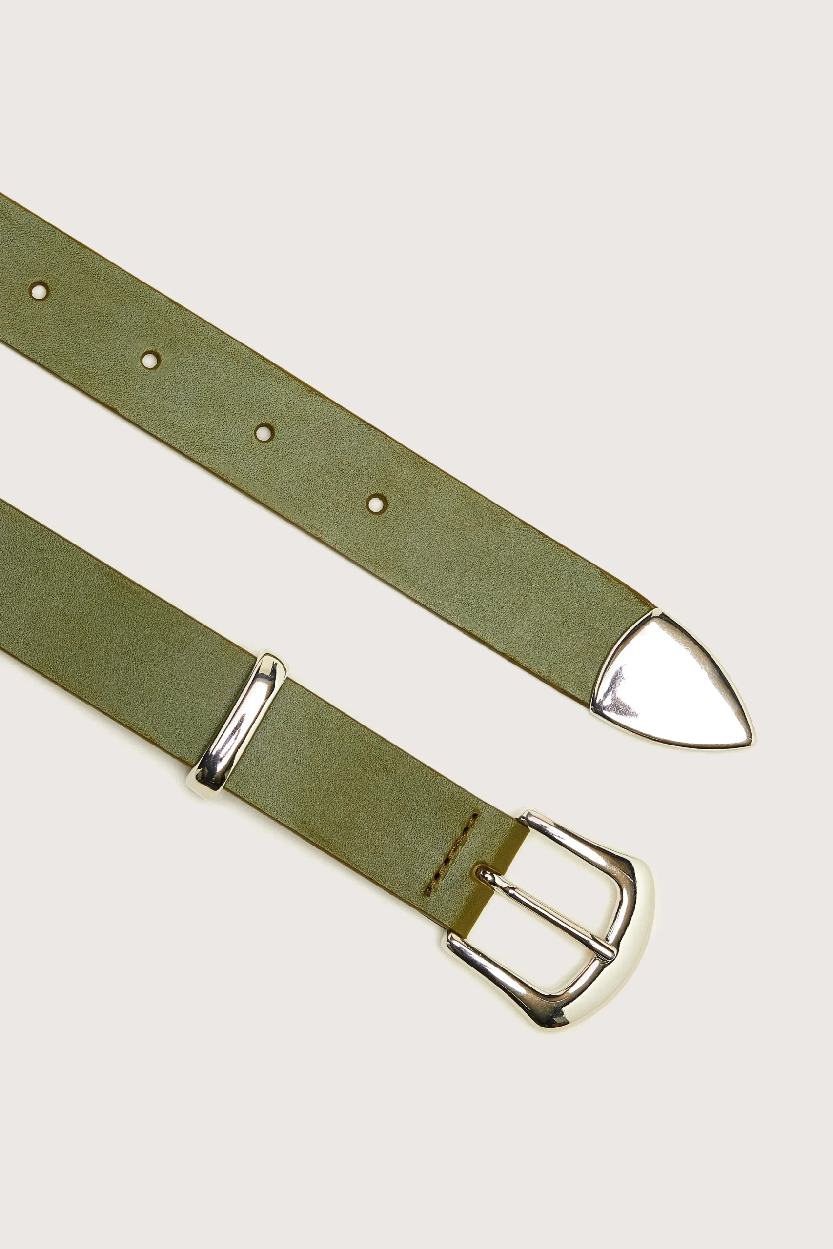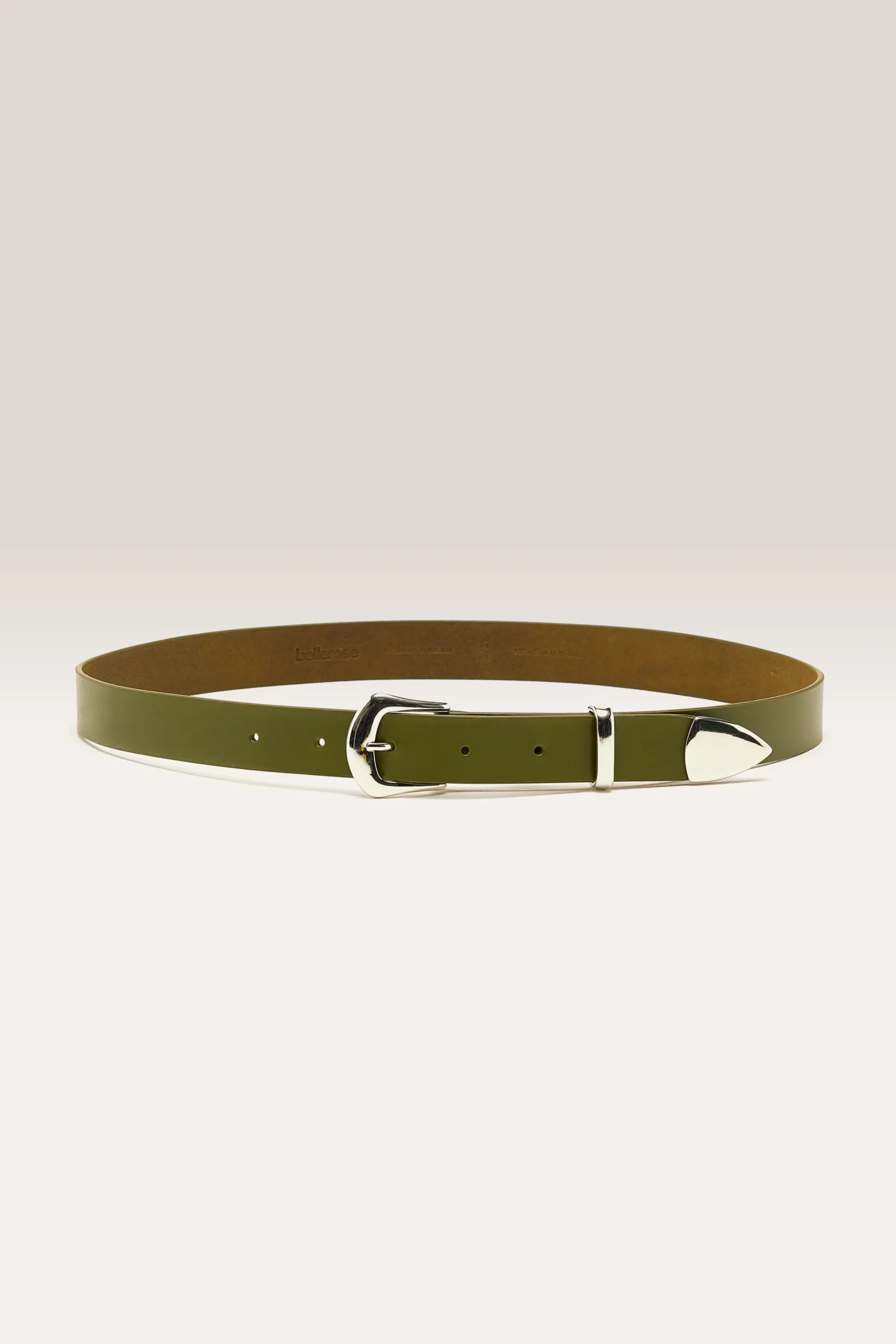 Western-geïnspireerde riem van kakigroen leer met een puntige zilveren punt en riemlus en een zilveren gesp.Western-geïnspireerde vorm Leren riemZilveren gesp Zilveren punt en lus Breedte: 3 cm