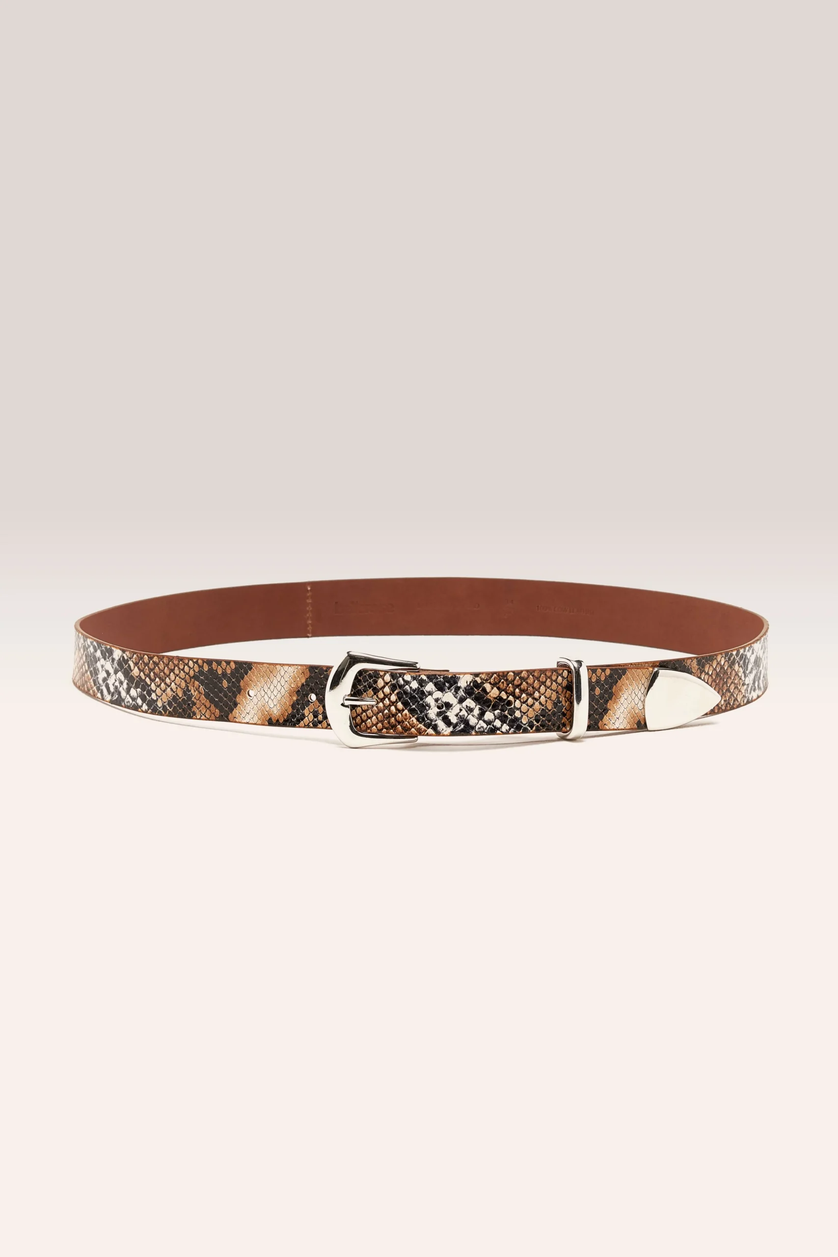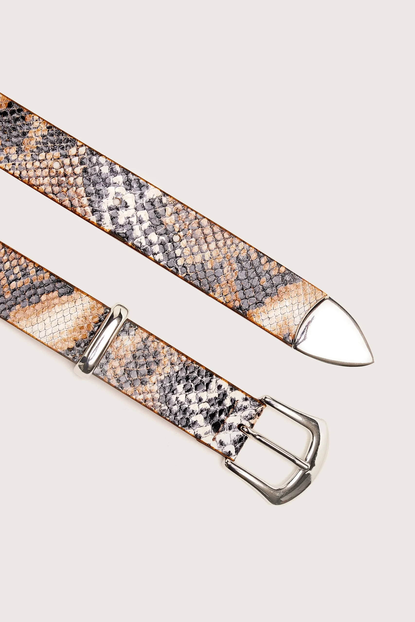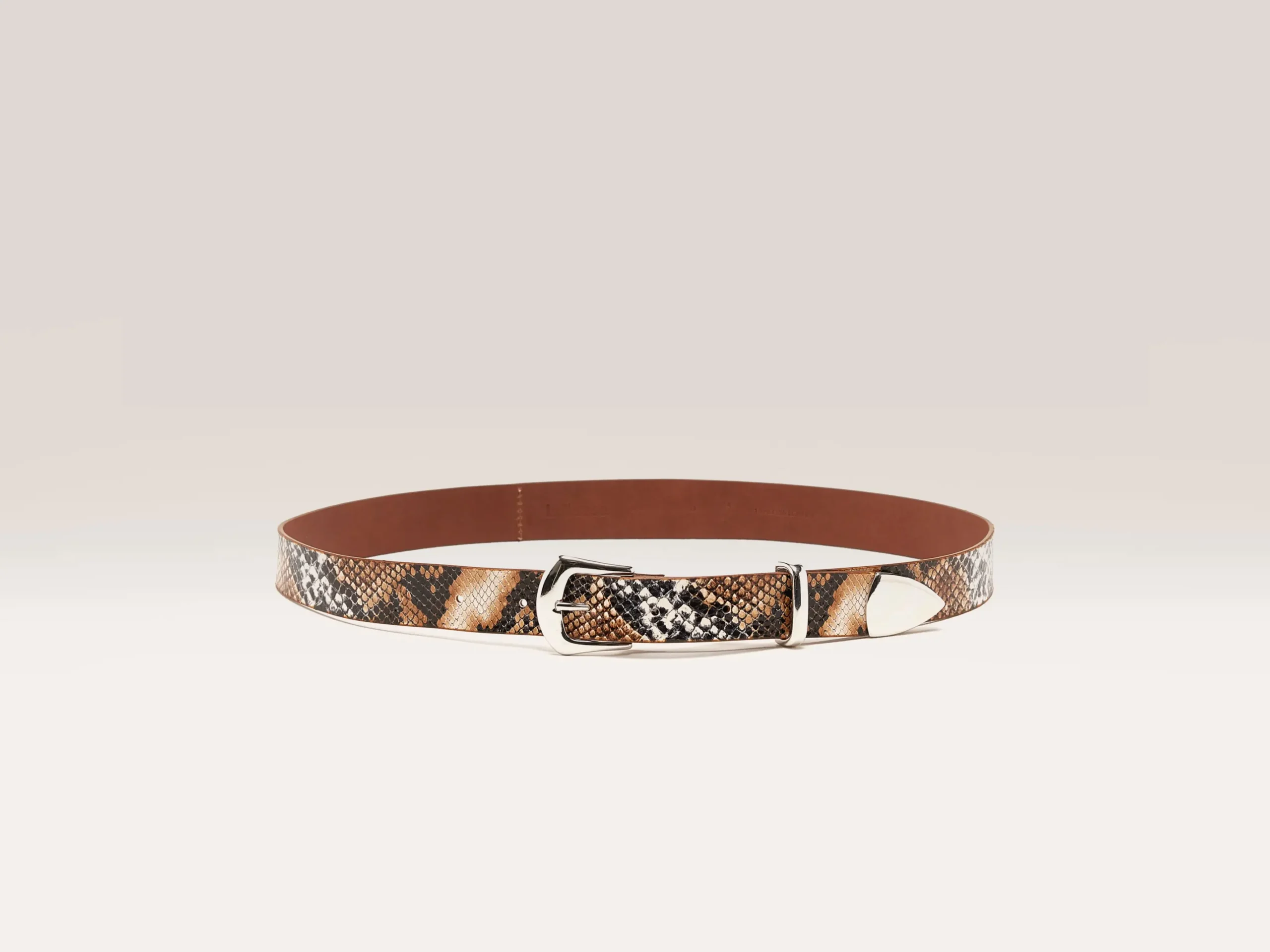 Western-geïnspireerde riem van leer met pythonprint met een puntige zilveren punt en riemlus en vastgezet met een zilveren gesp.Western-geïnspireerde vorm Leren riemZilveren gesp Zilveren punt en lus Breedte: 3 cm
