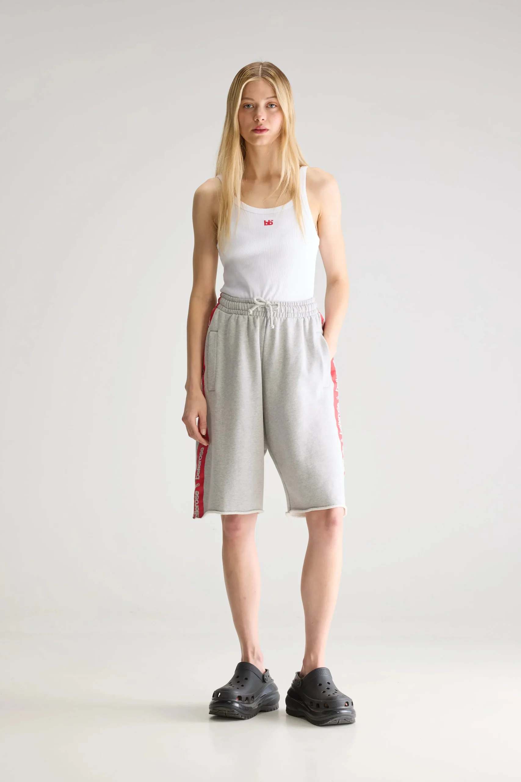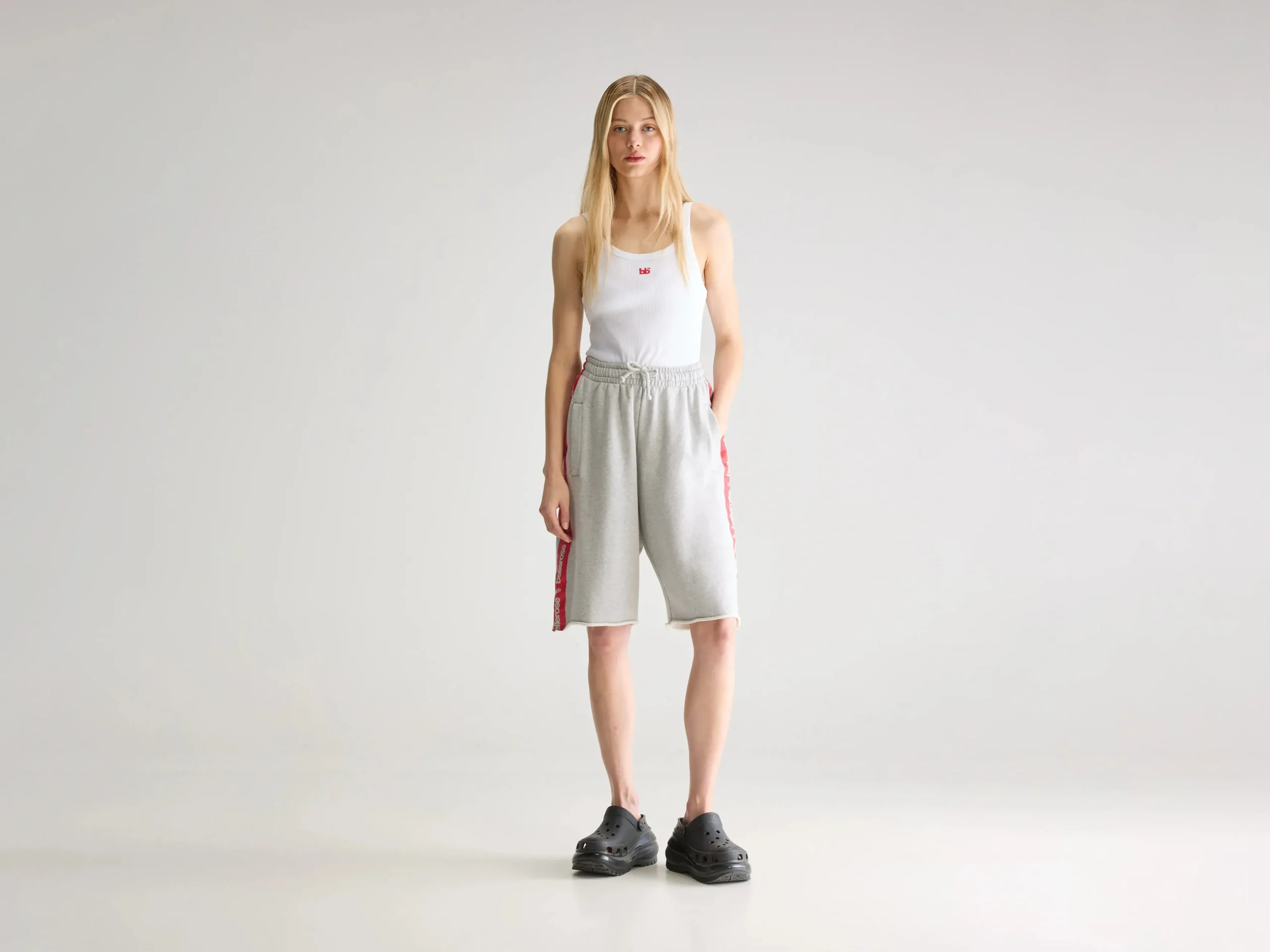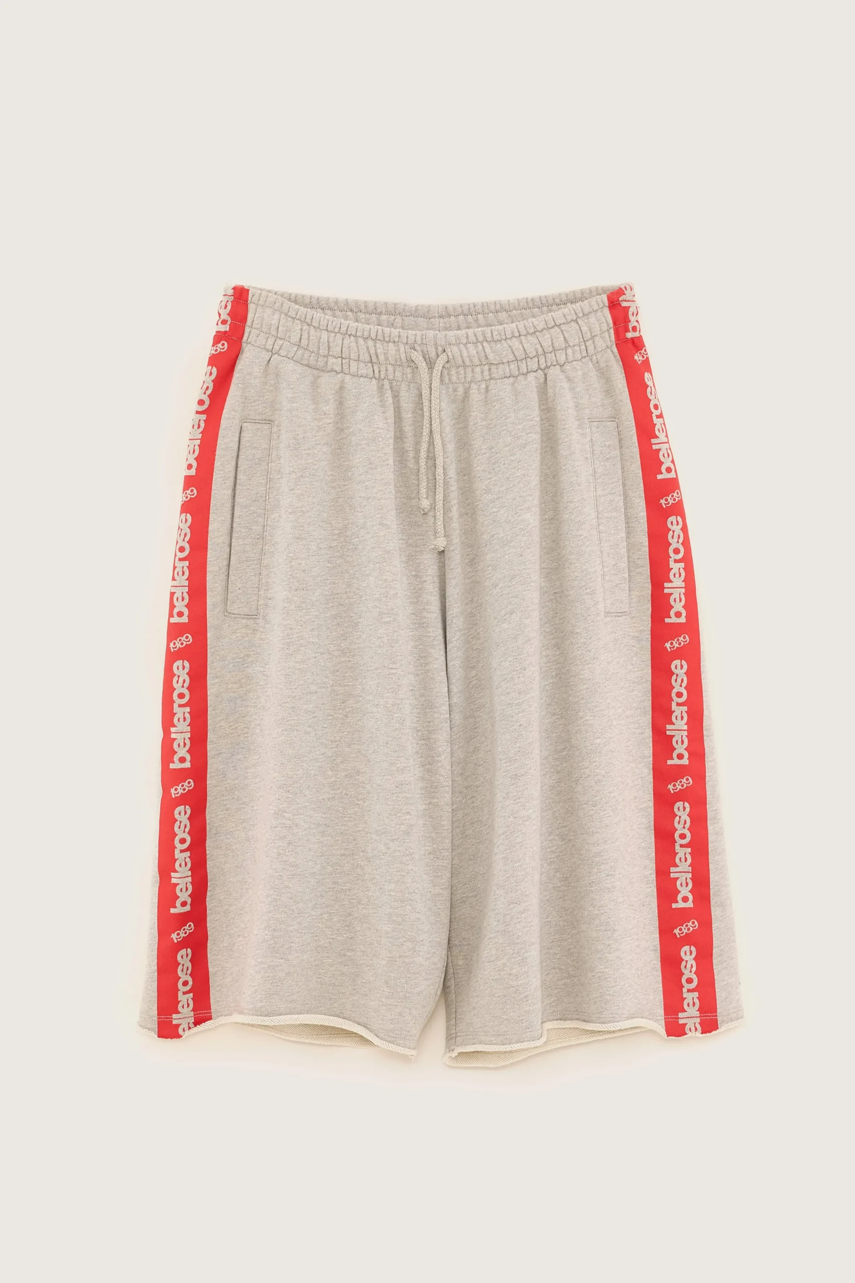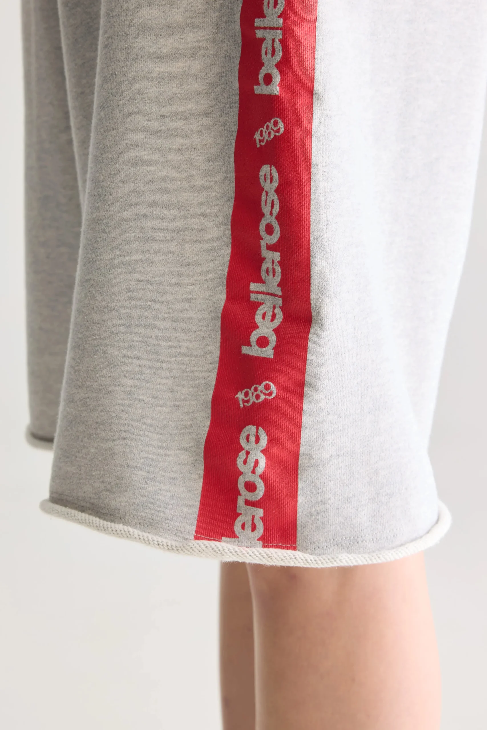 Lange grijze joggingbroek met opvallende rode zijstrepen met Bellerose-logo.Boyfriend-stijlHalfhoog met elastische tailleKnielengteZijzakkenRode zijstrepen met Bellerose-logoZoom met onafgewerkte randenKoordsluiting in de taille