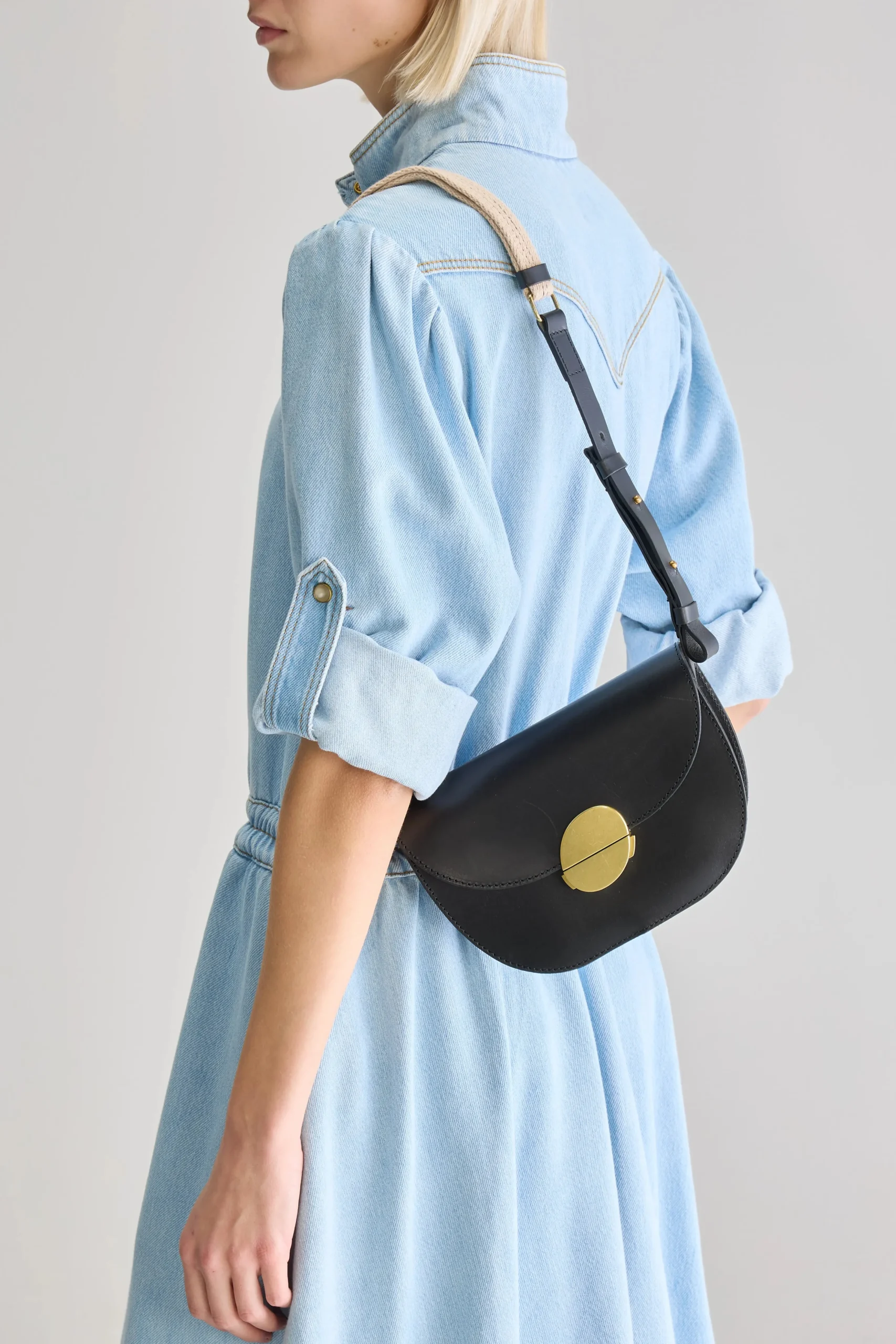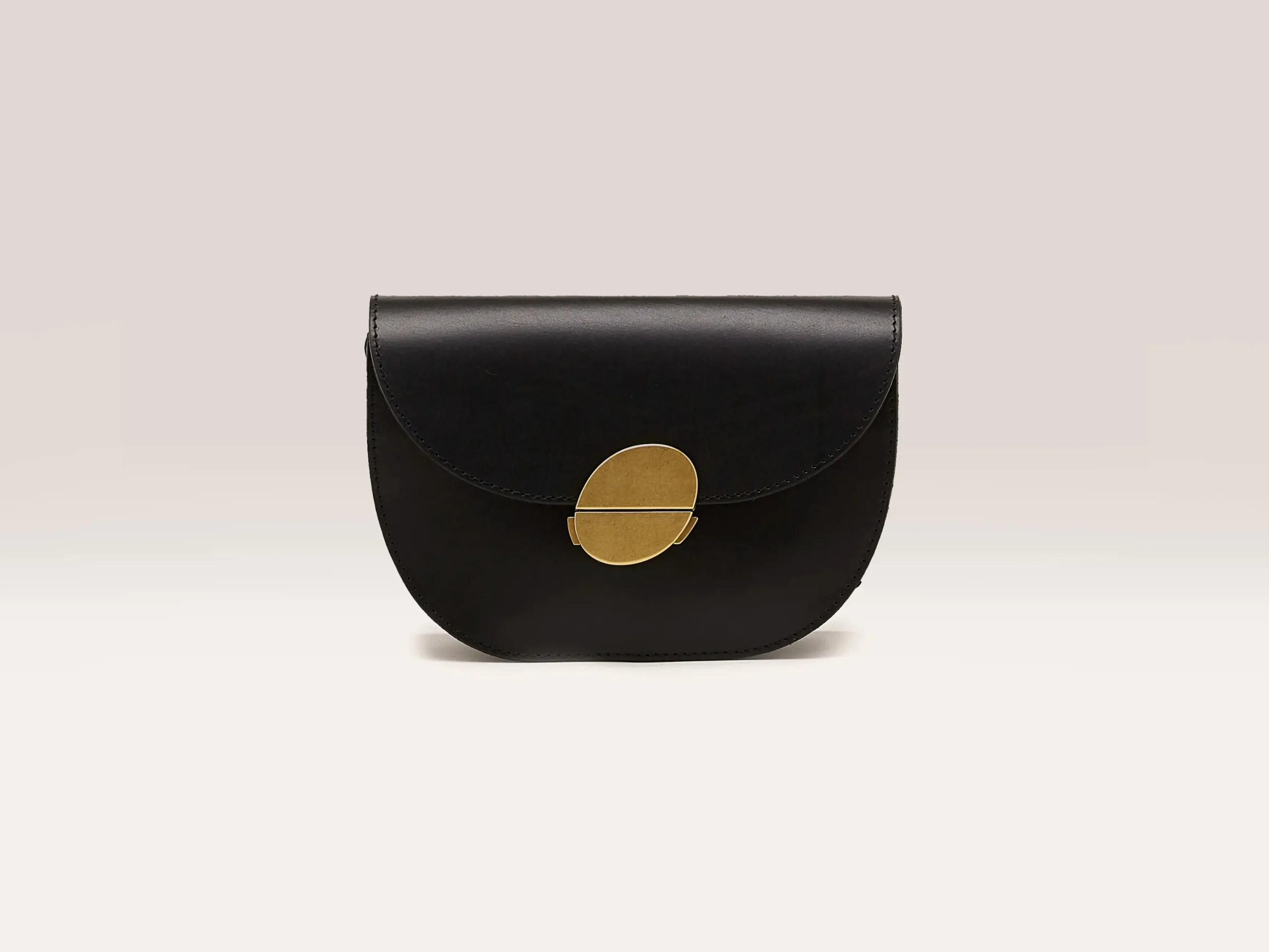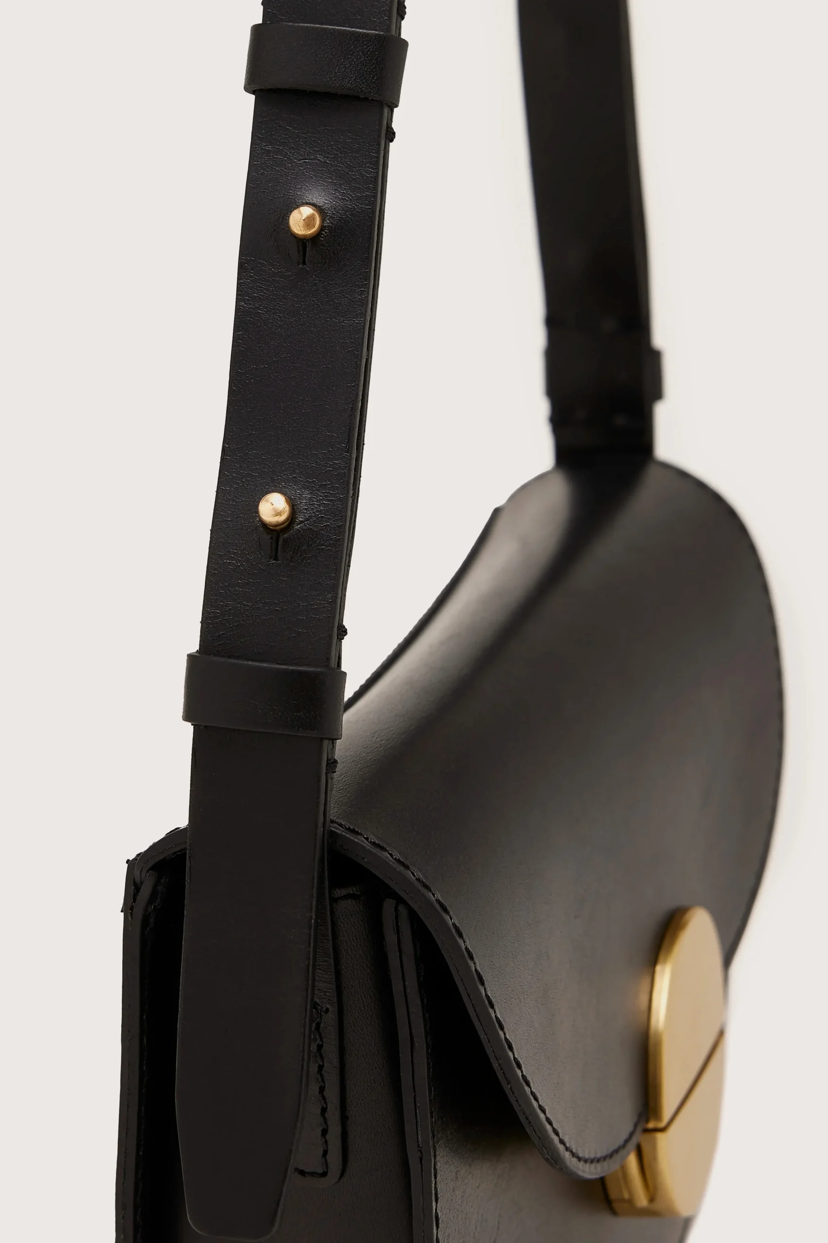 Halvemaanvormige schoudertas met gepolijste drukknoopsluiting en katoenen en leren riem van zwart, glad leer.Halvemaanvormig Schouder of crossbody Grote voorflap met antiek koperen drukknoopsluitingOpgezette binnenzak in katoenAntiek messing metalen beslag Afmetingen: 21x6x13 cmVerstelbare riem maximale lengte: 105 cm