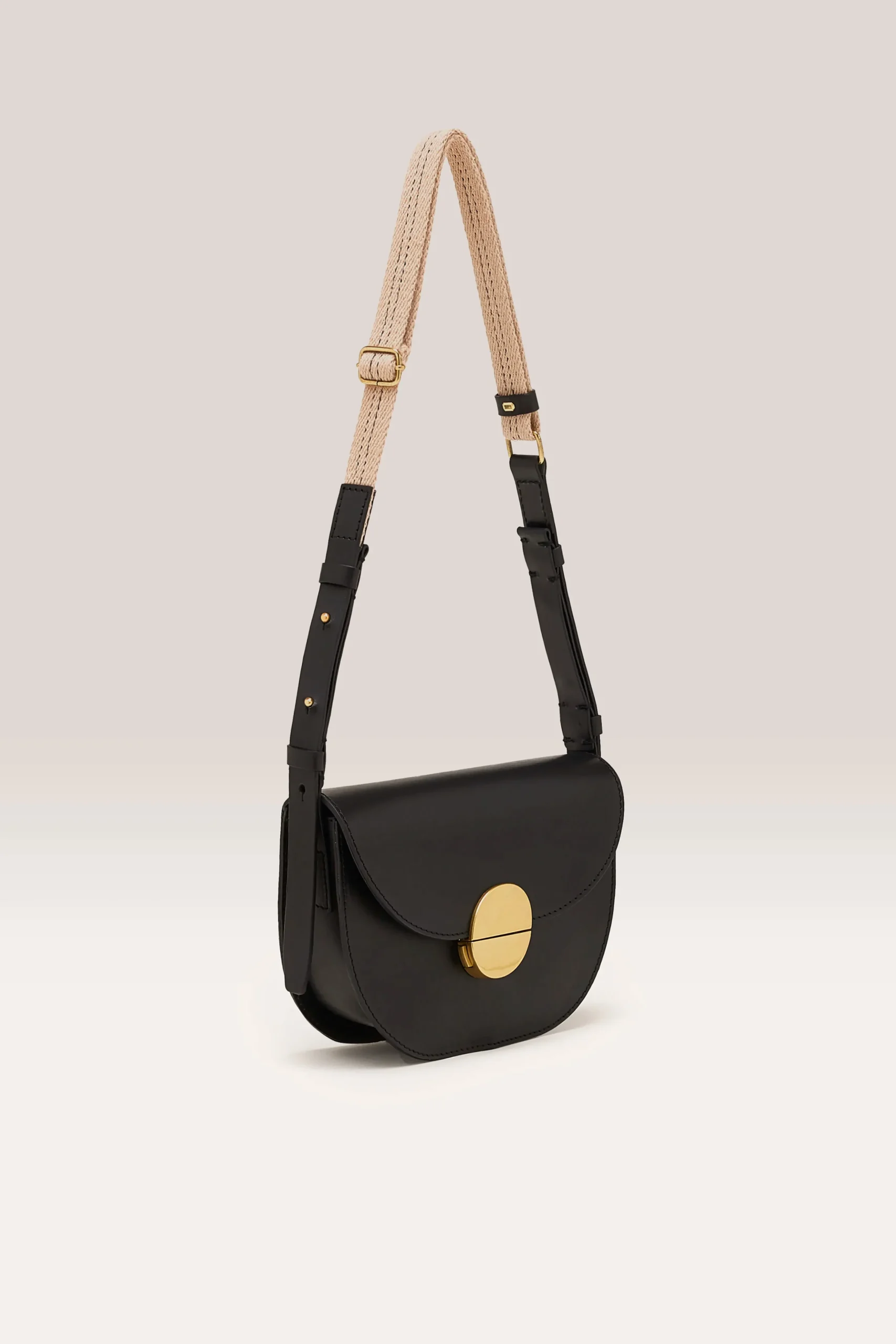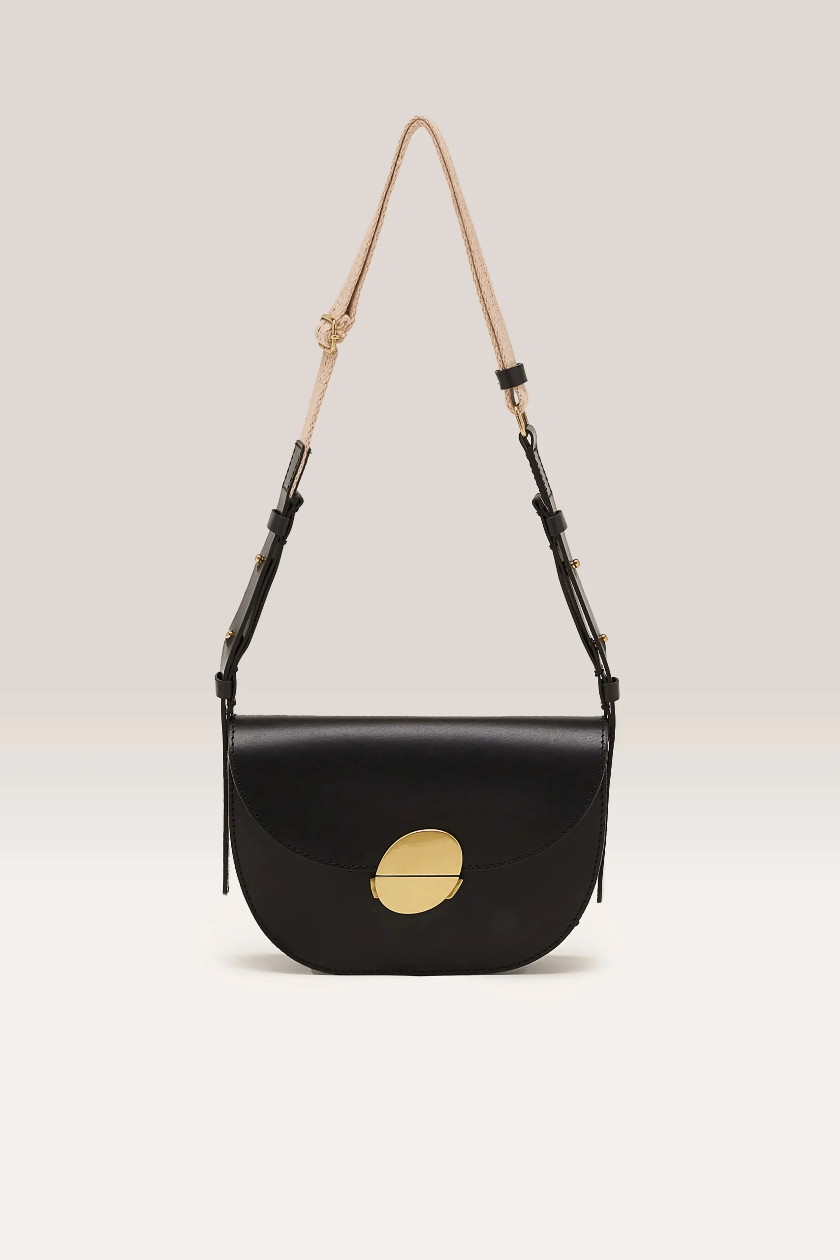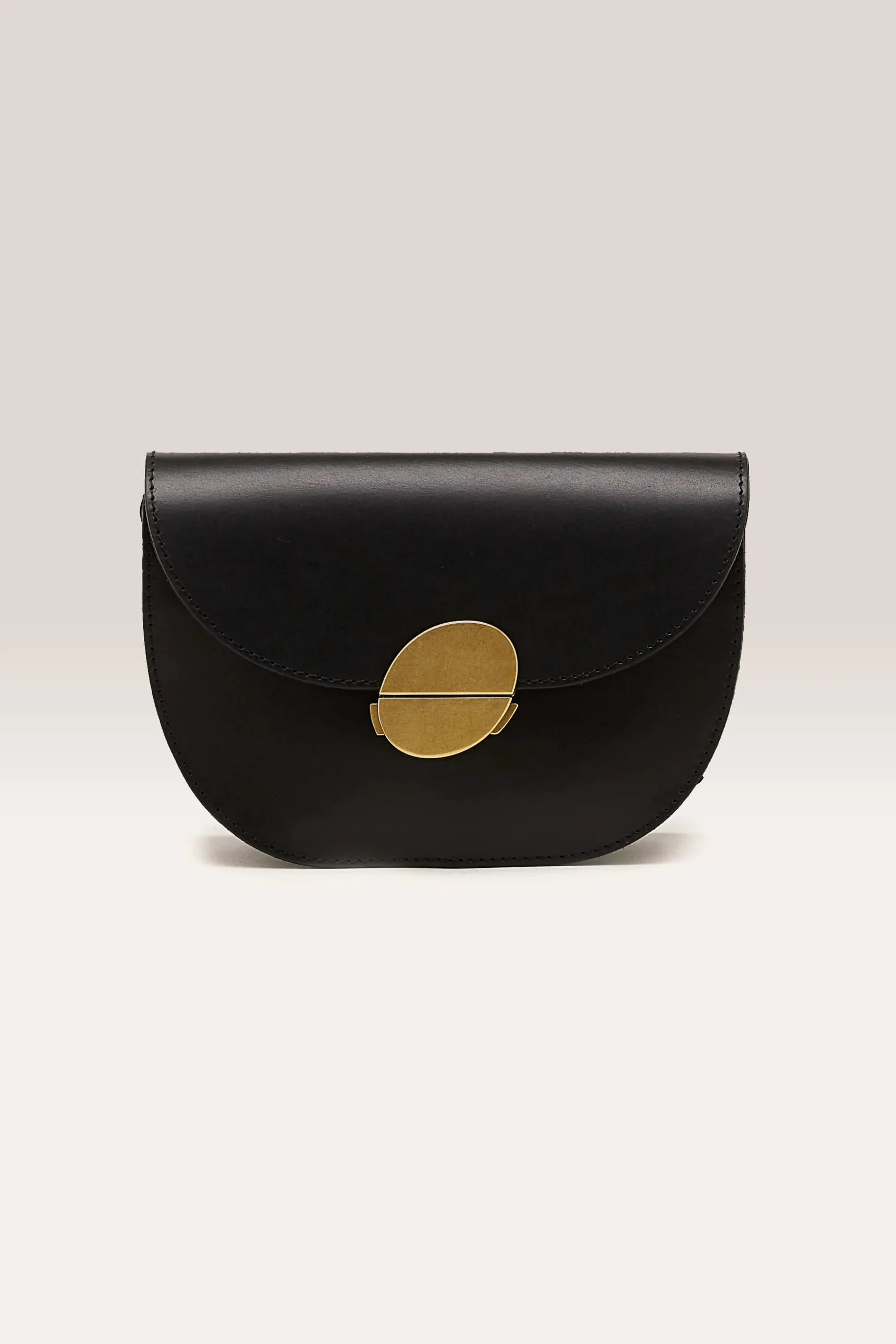 Halvemaanvormige schoudertas met gepolijste drukknoopsluiting en katoenen en leren riem van zwart, glad leer.Halvemaanvormig Schouder of crossbody Grote voorflap met antiek koperen drukknoopsluitingOpgezette binnenzak in katoenAntiek messing metalen beslag Afmetingen: 21x6x13 cmVerstelbare riem maximale lengte: 105 cm