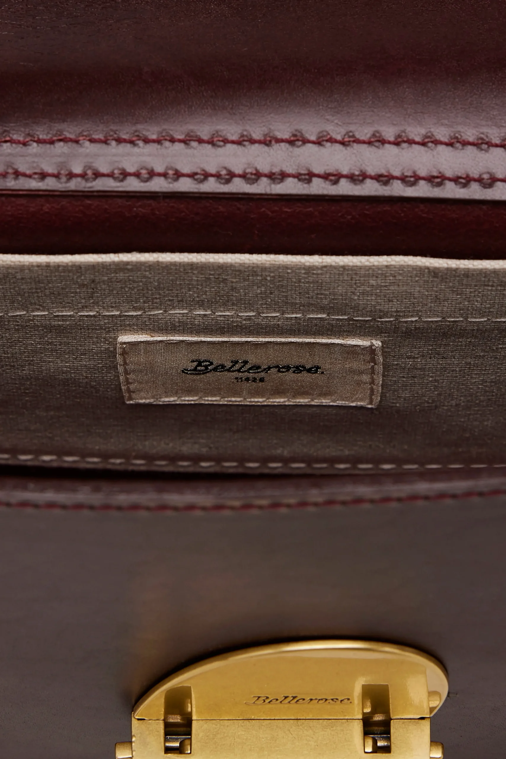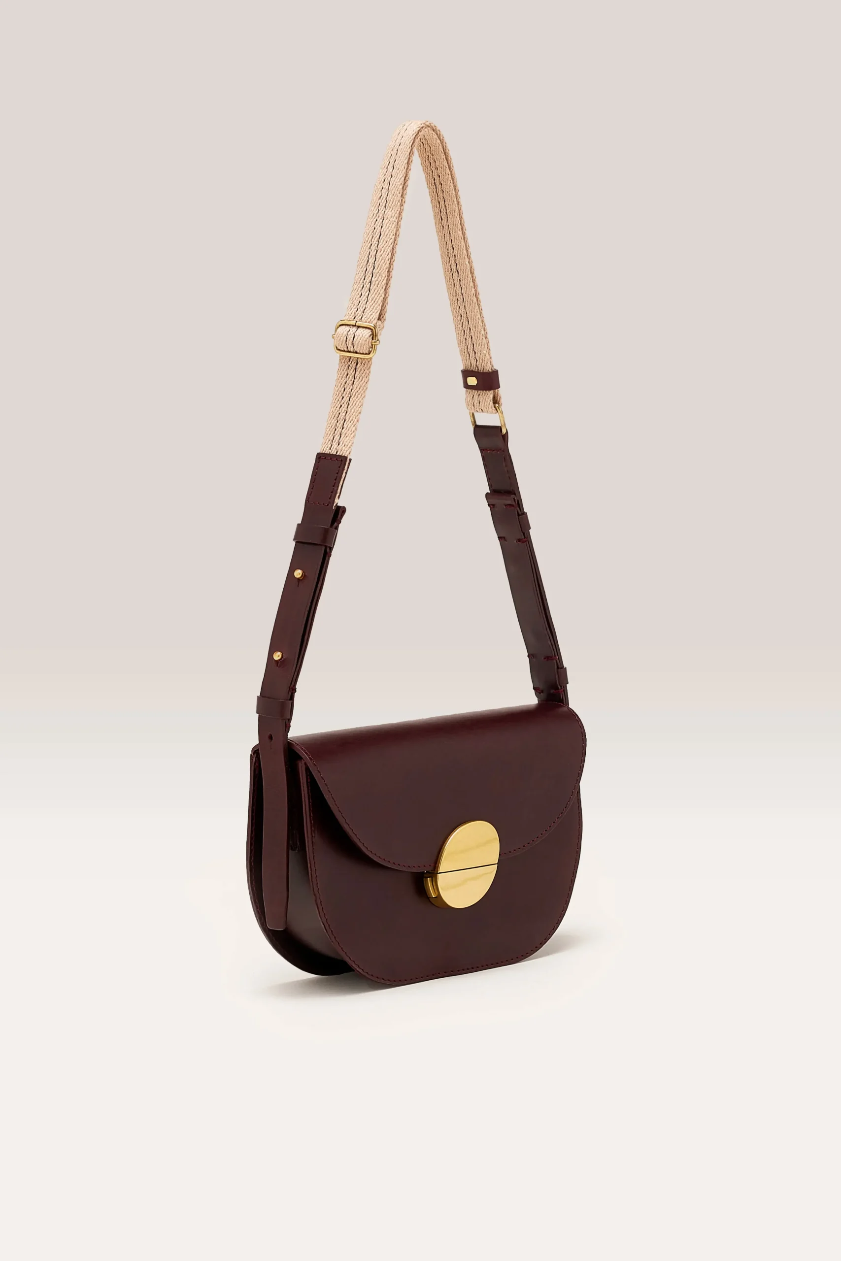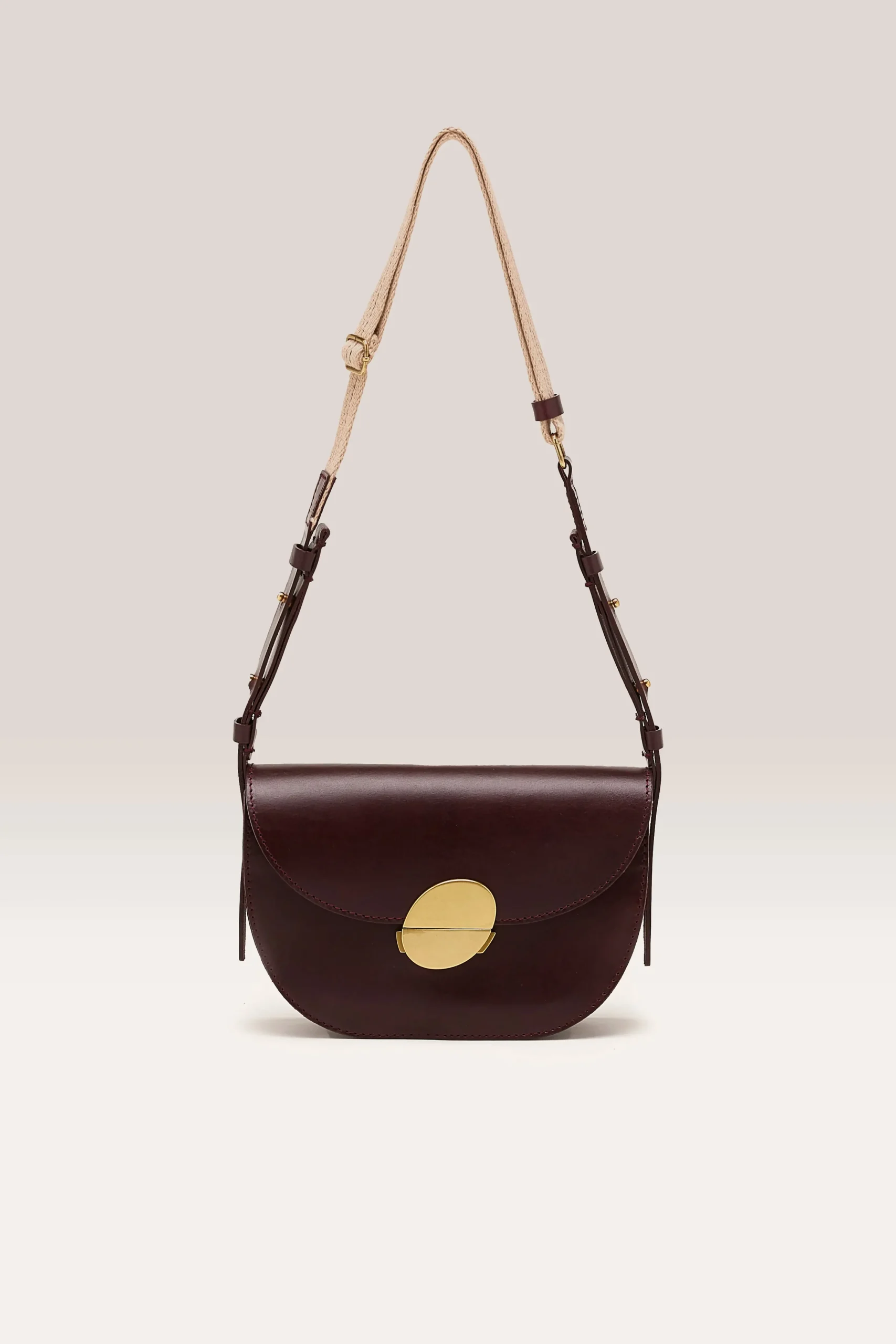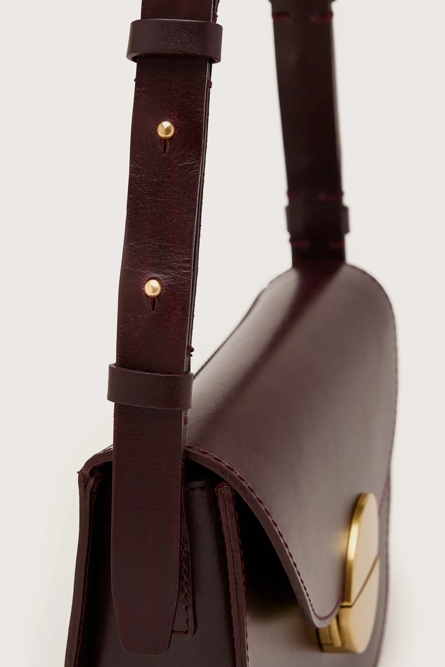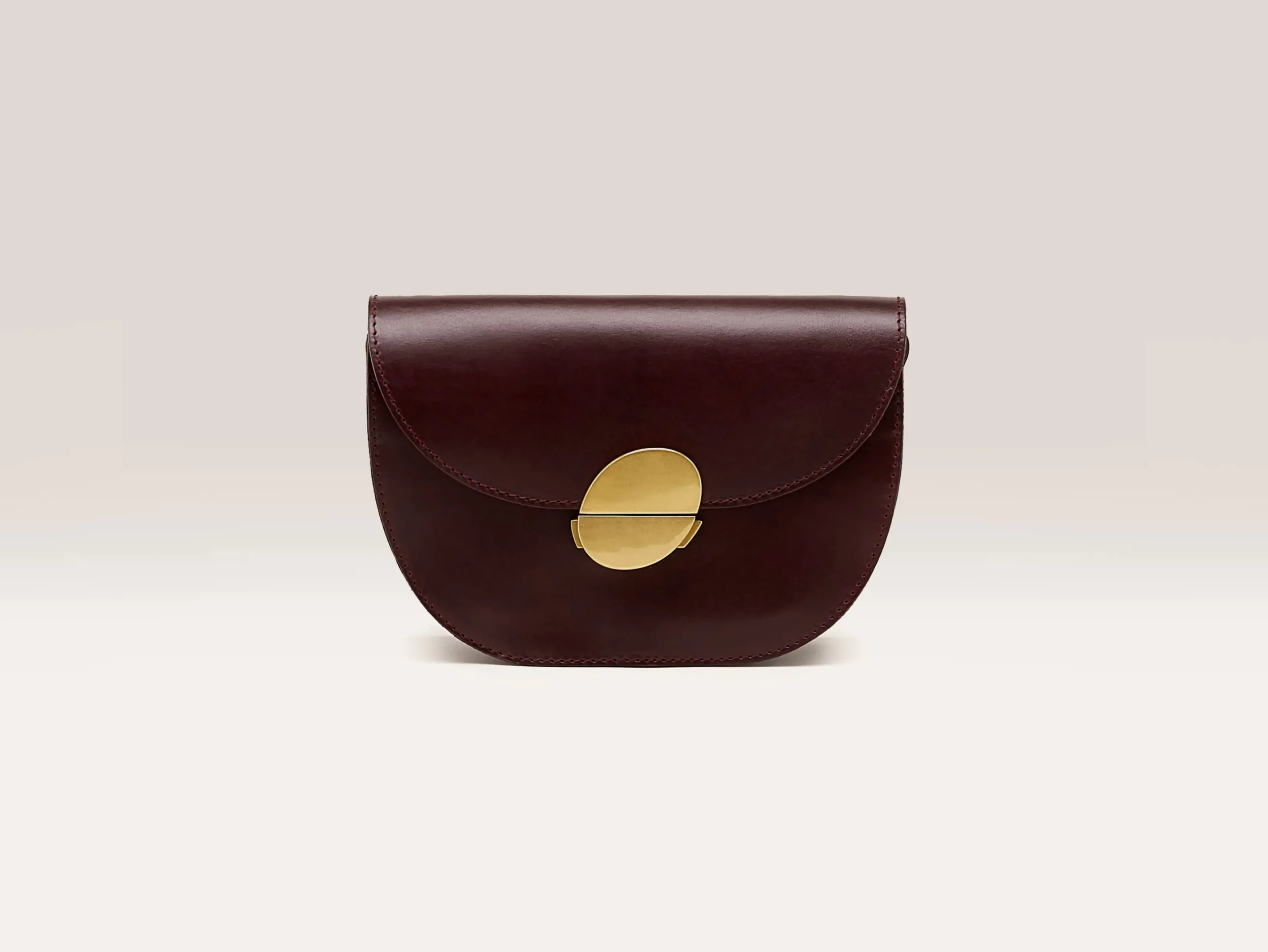 Halvemaanschoudertas met gepolijste drukknoopsluiting en katoenen en leren riem van wijnrood, glad leer.Halvemaanvormig Schouder of crossbody Grote voorflap met antiek koperen drukknoopsluitingOpgezette binnenzak in katoenAntiek messing metalen beslag Afmetingen: 21x6x13 cmVerstelbare riem maximale lengte: 105 cm