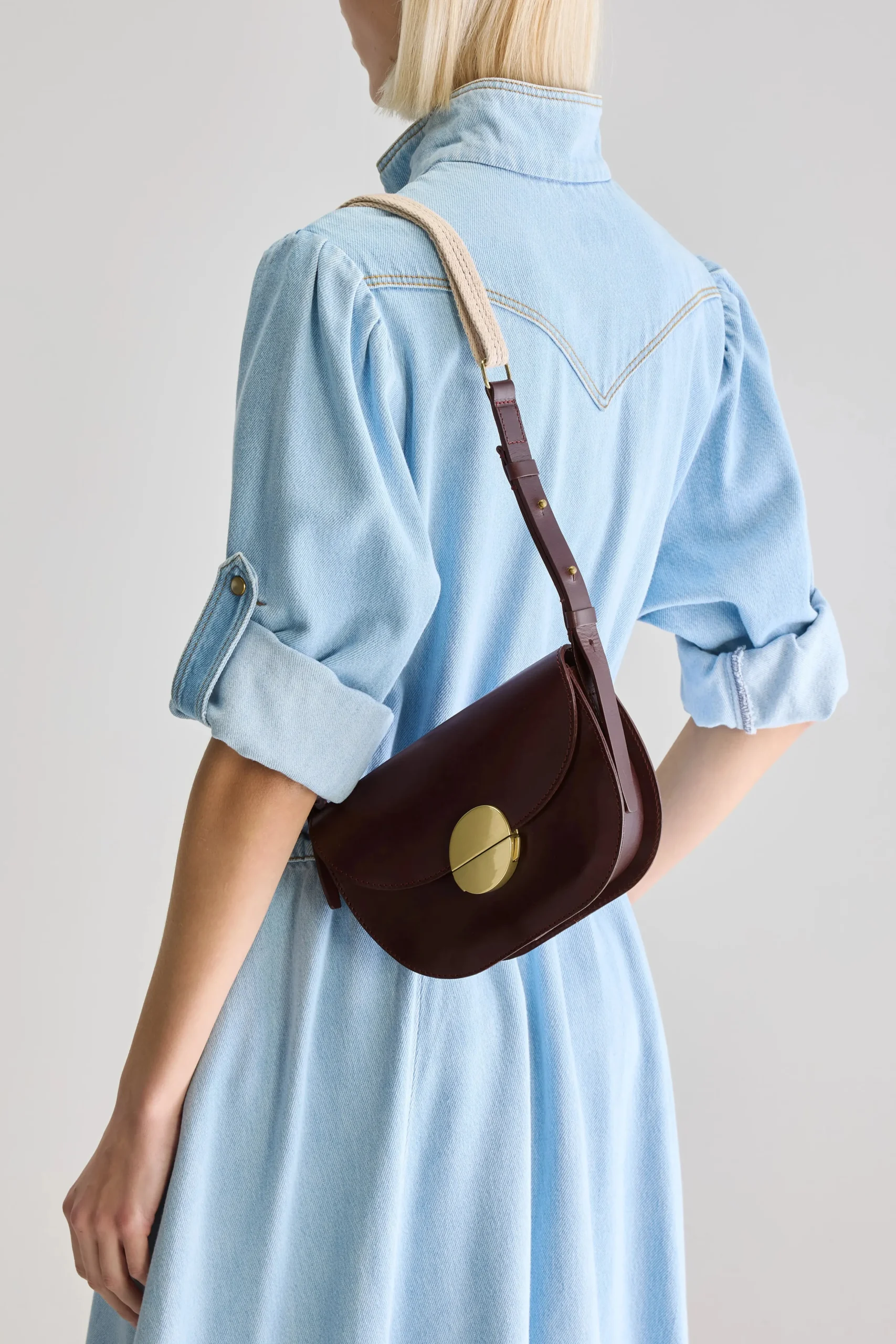 Halvemaanschoudertas met gepolijste drukknoopsluiting en katoenen en leren riem van wijnrood, glad leer.Halvemaanvormig …