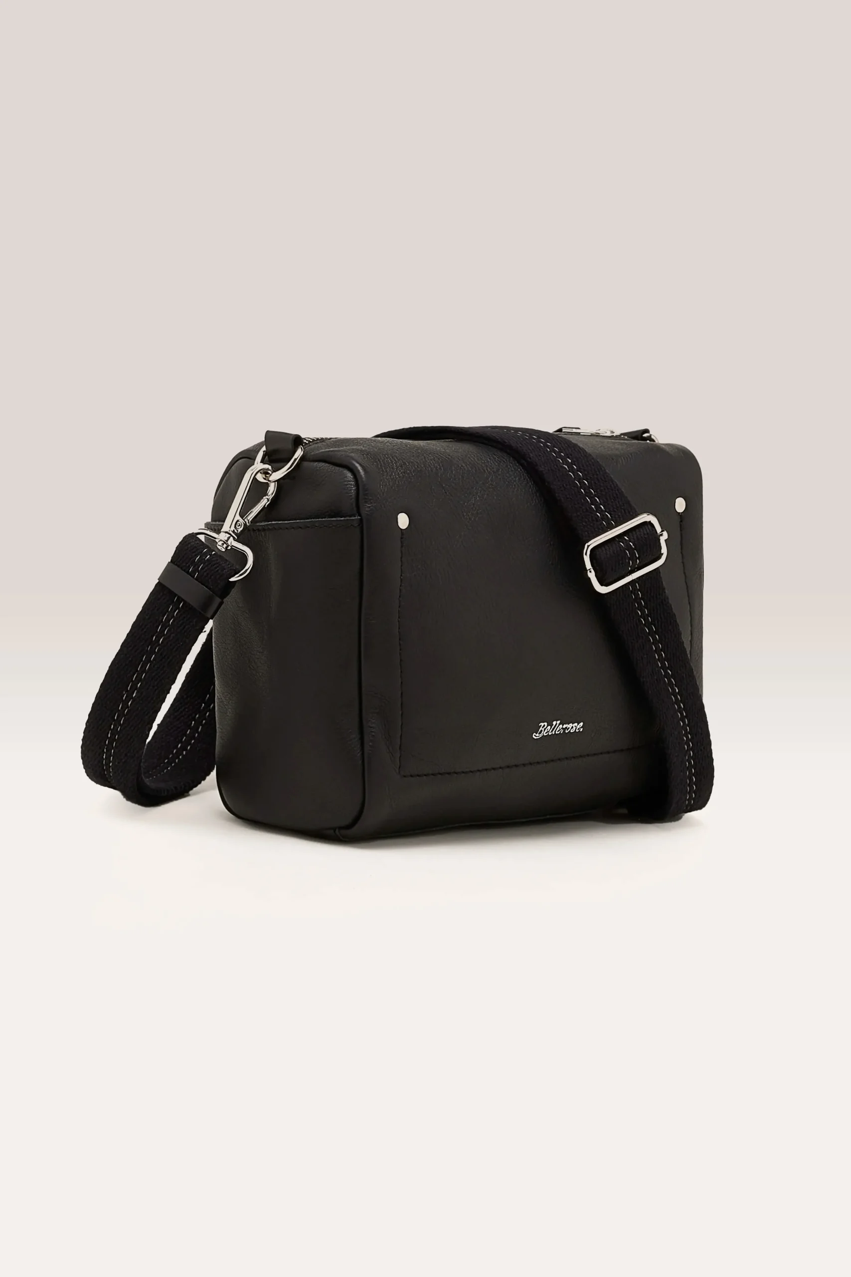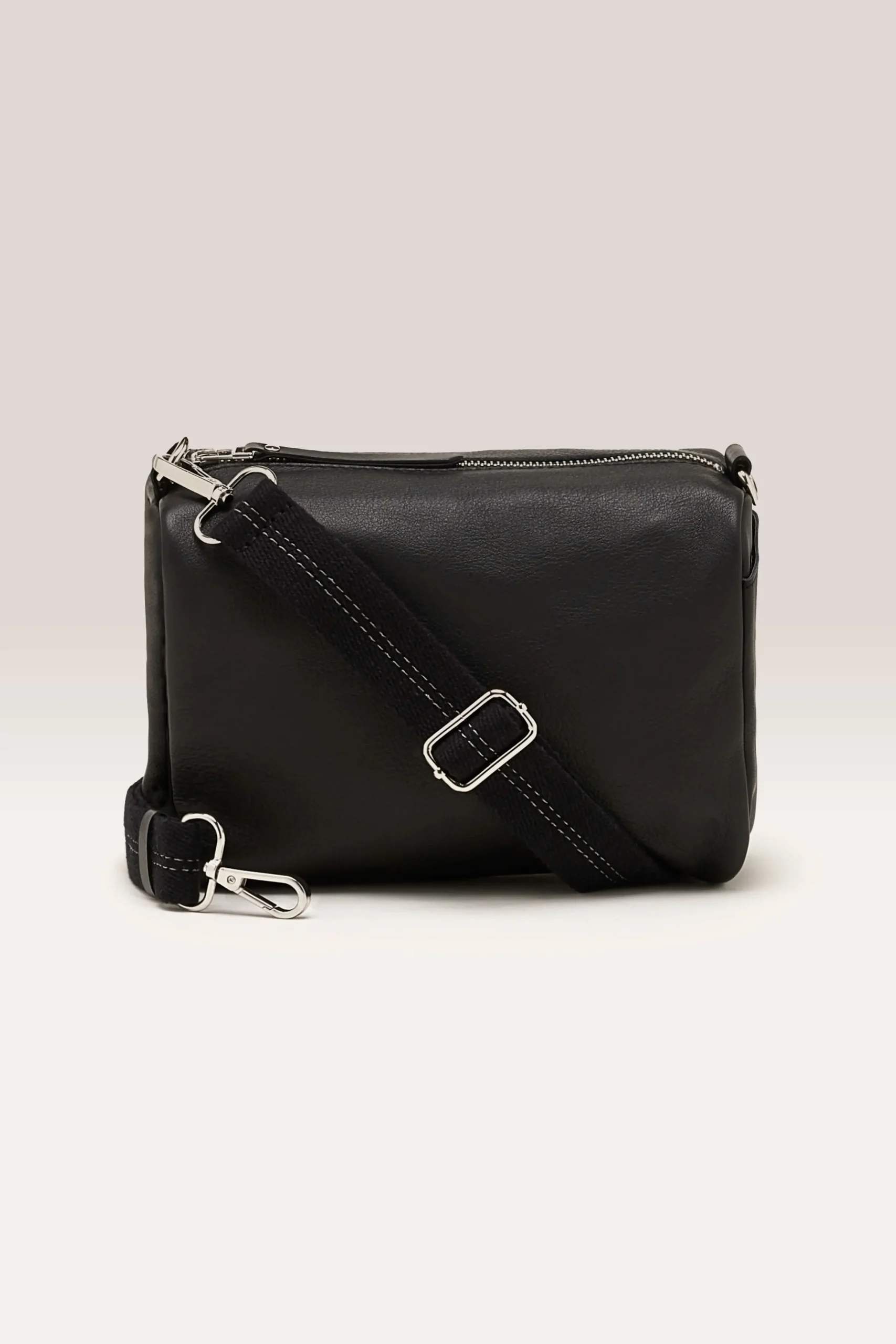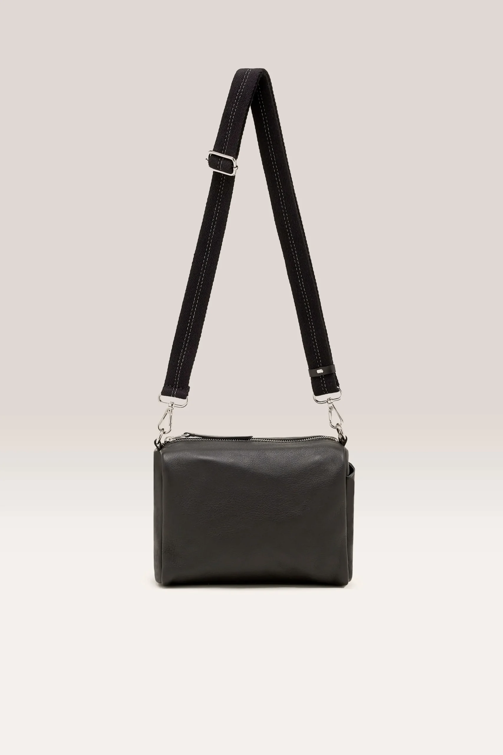 Soepele tas met ritssluiting en zijvak van zwart generfd leer.Doosvormig Ritssluiting Glanzend gecoat leer Zijvak en binnenzak beveiligd met zilveren studsVerstelbare riem, maximale lengte: 120 cmAfmetingen: 22×15.5×10 cm