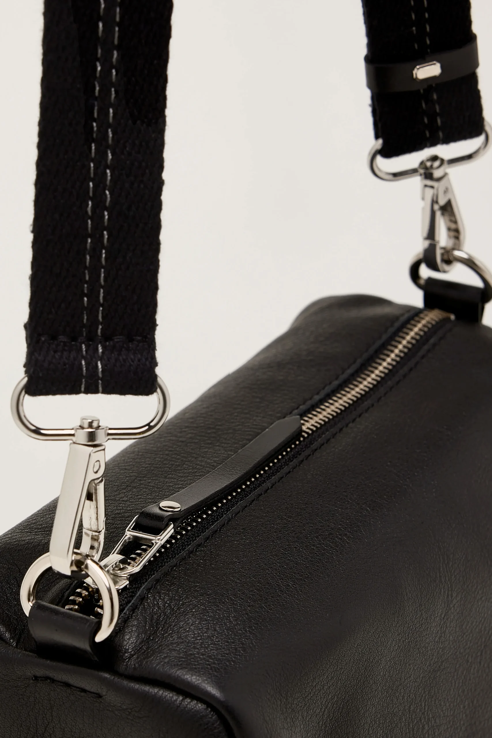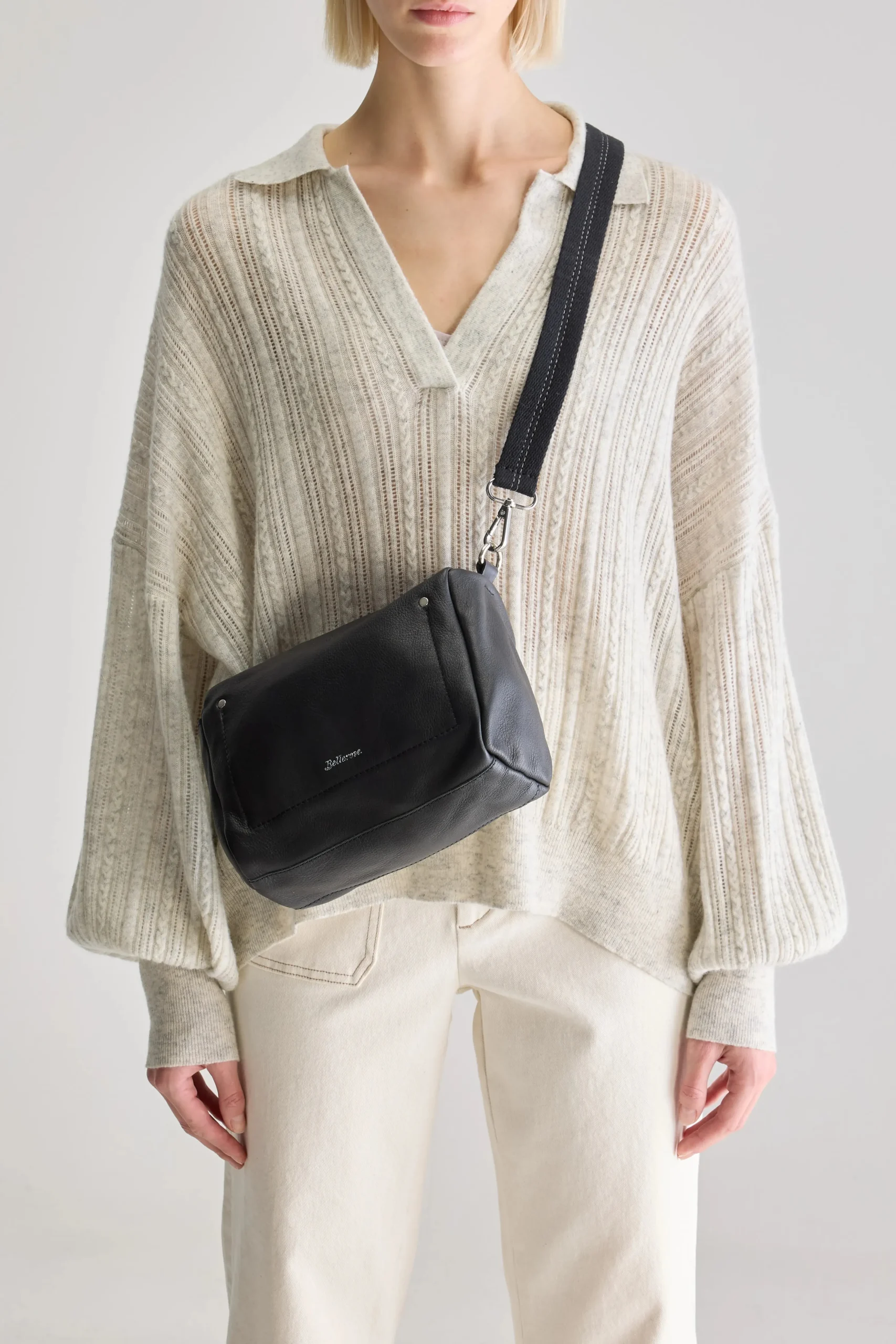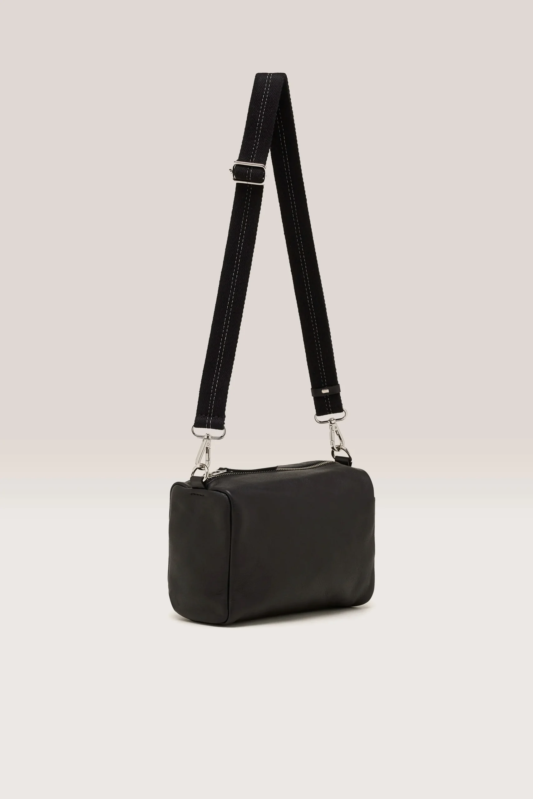 Soepele tas met ritssluiting en zijvak van zwart generfd leer.Doosvormig Ritssluiting Glanzend gecoat leer Zijvak en binnenzak beveiligd met zilveren studsVerstelbare riem, maximale lengte: 120 cmAfmetingen: 22×15.5×10 cm