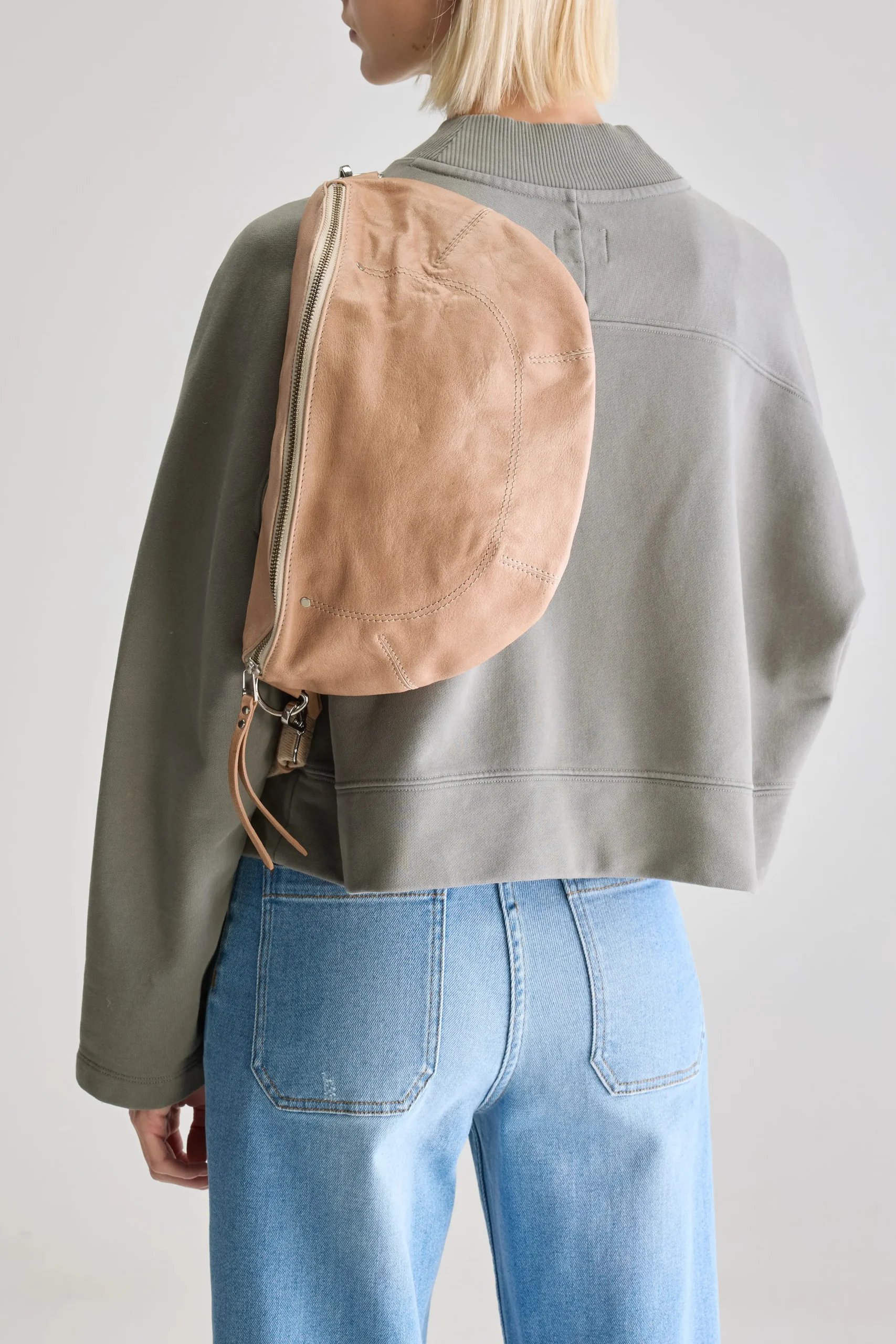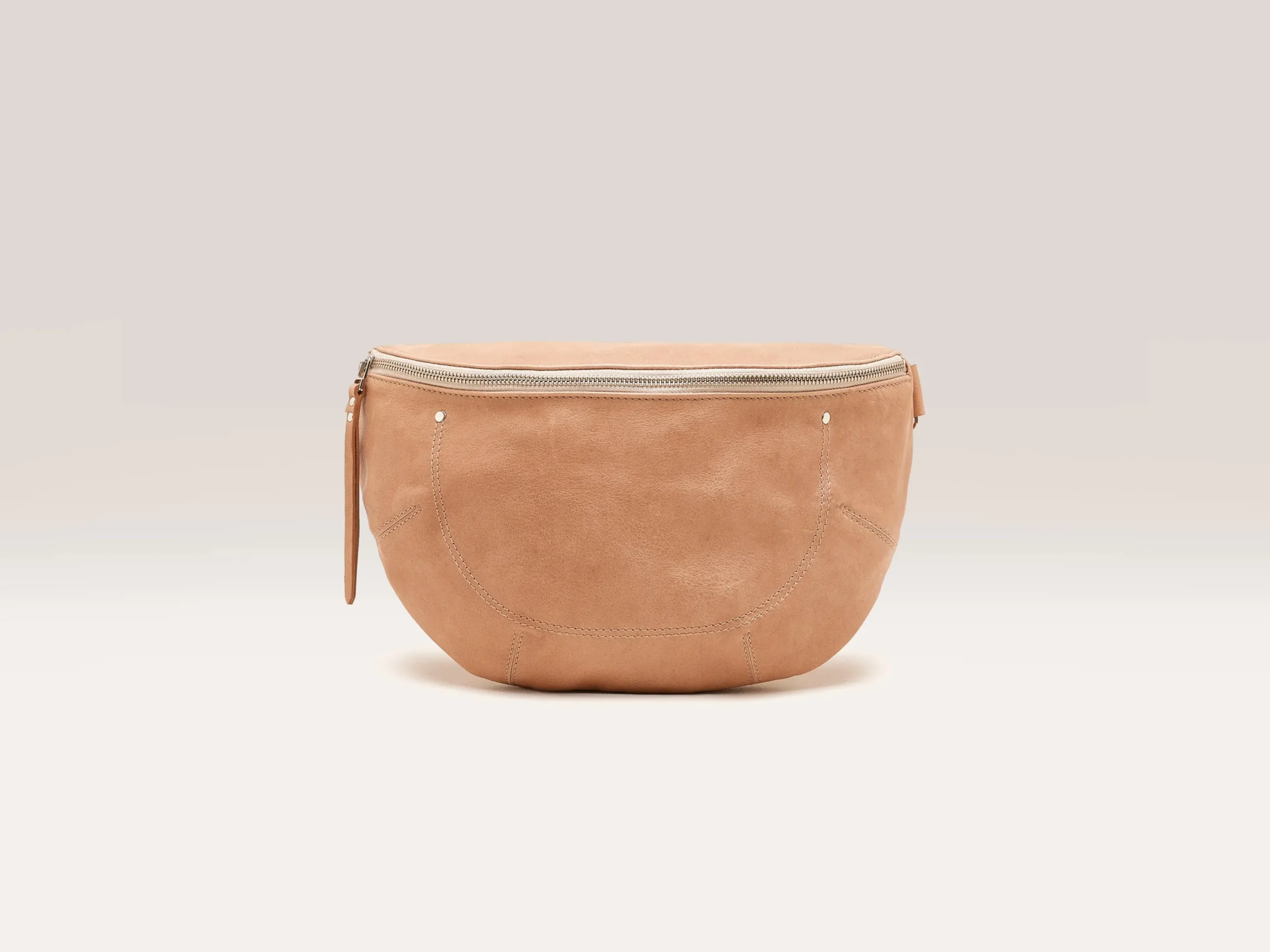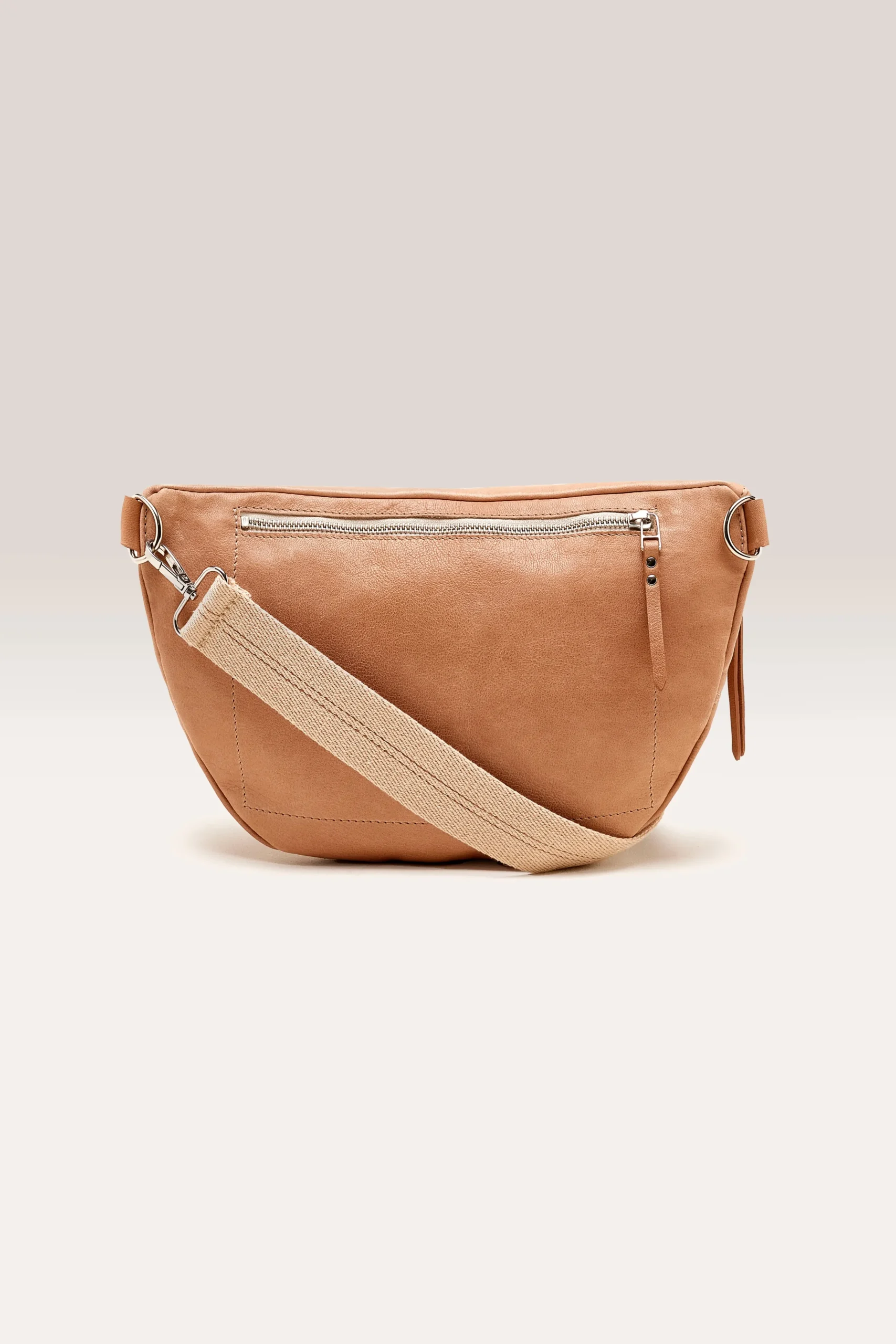 Soepele maanvormige heuptas met ritssluiting aan de voorkant en ritsvak van glad amberkleurig leer.HalvemaanvormRitsslui…