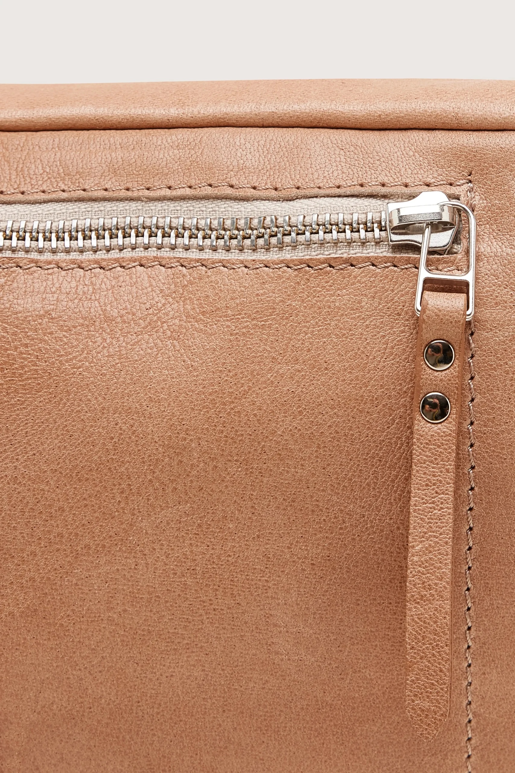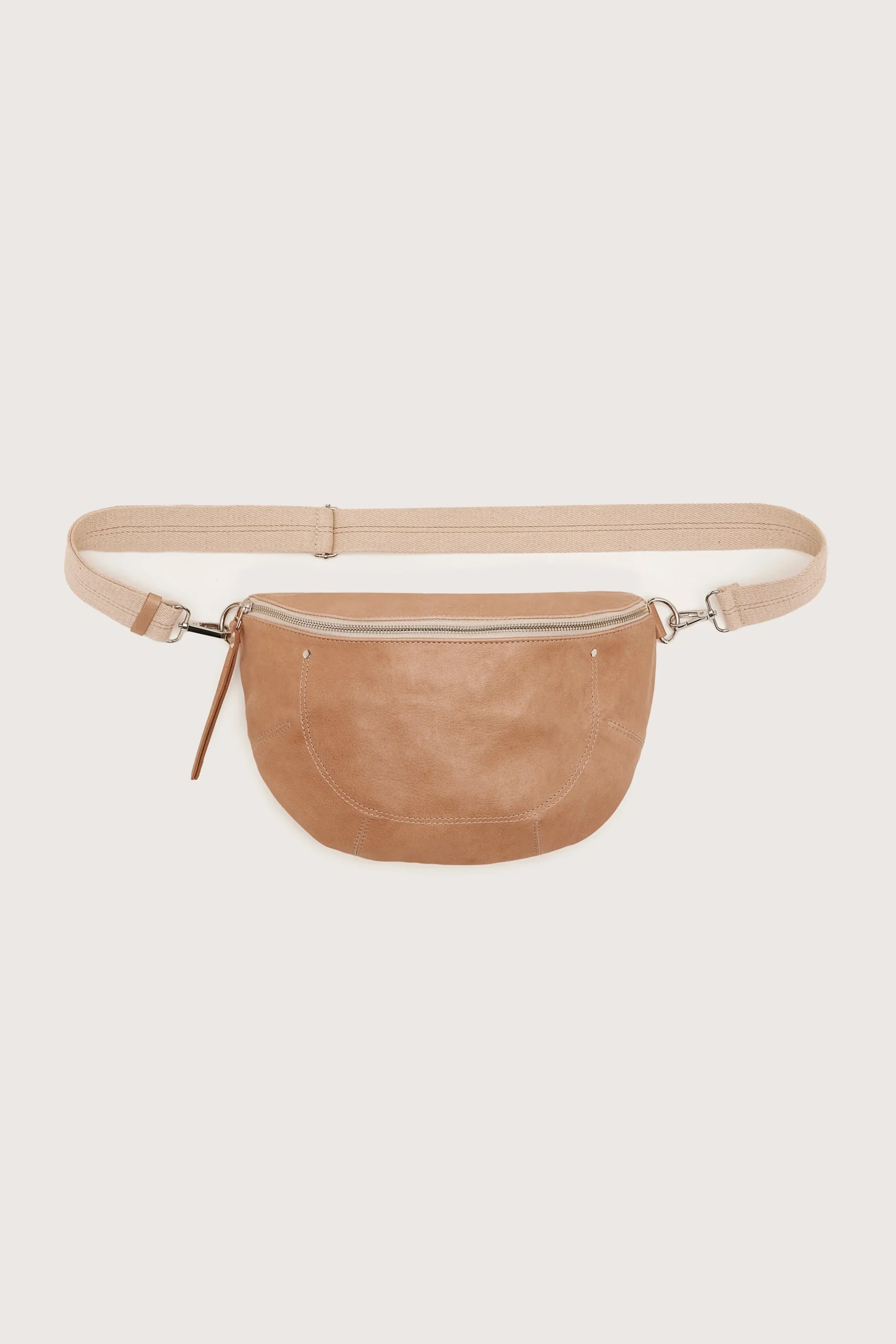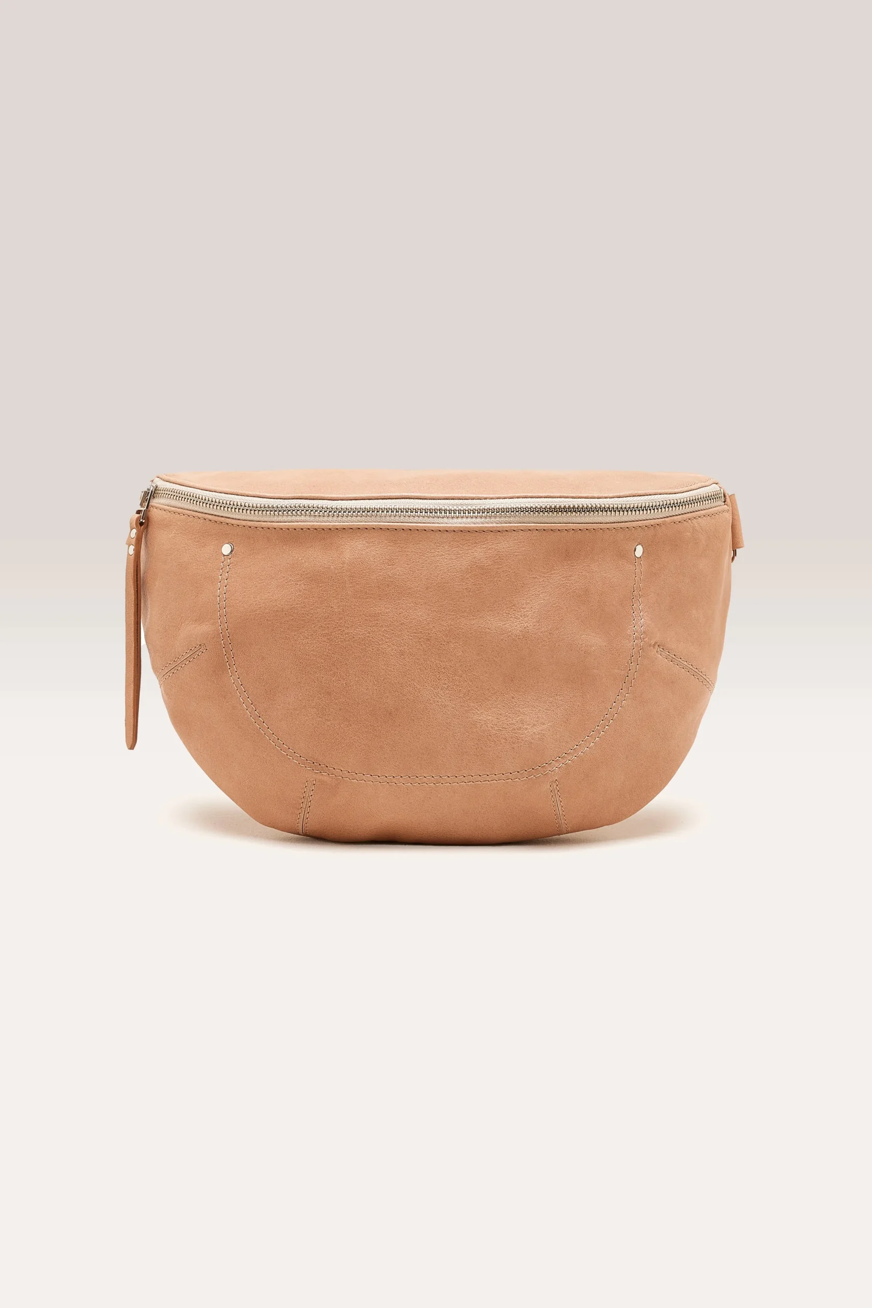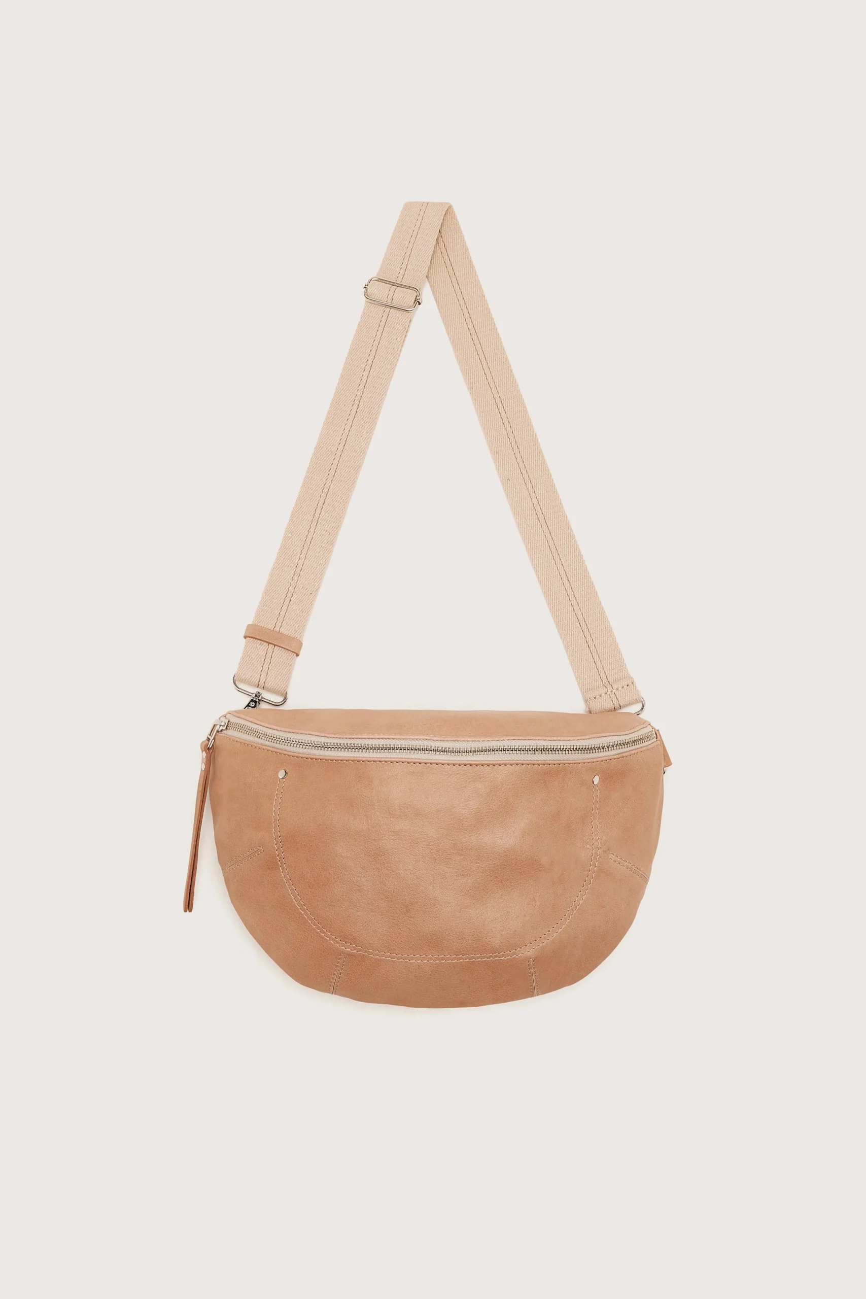 Soepele maanvormige heuptas met ritssluiting aan de voorkant en ritsvak van glad amberkleurig leer.HalvemaanvormRitssluiting aan de voorkant Volledig gevoerdPlantaardig gelooid Italiaans leerBinnenzak Extra zak met rits achteraan Hardware van verouderd messingAfmetingen: 33x22x9.2 cm Maximale riemlengte: 120 cm
