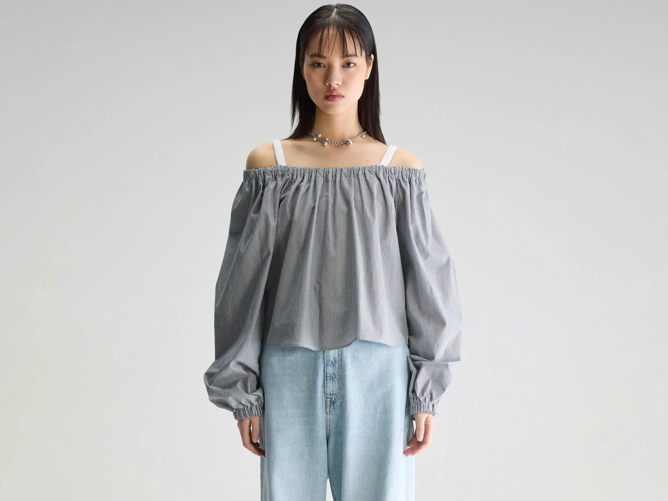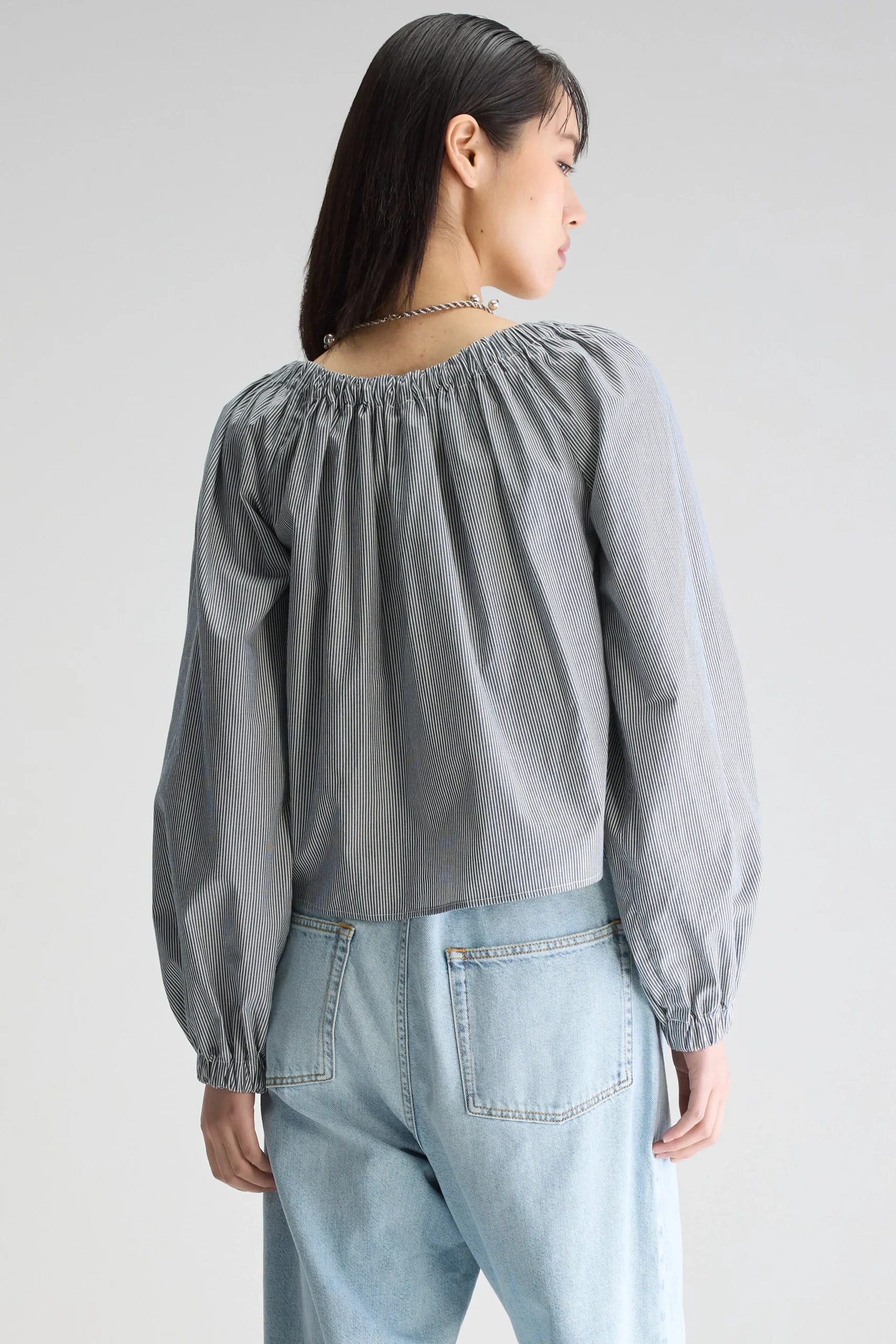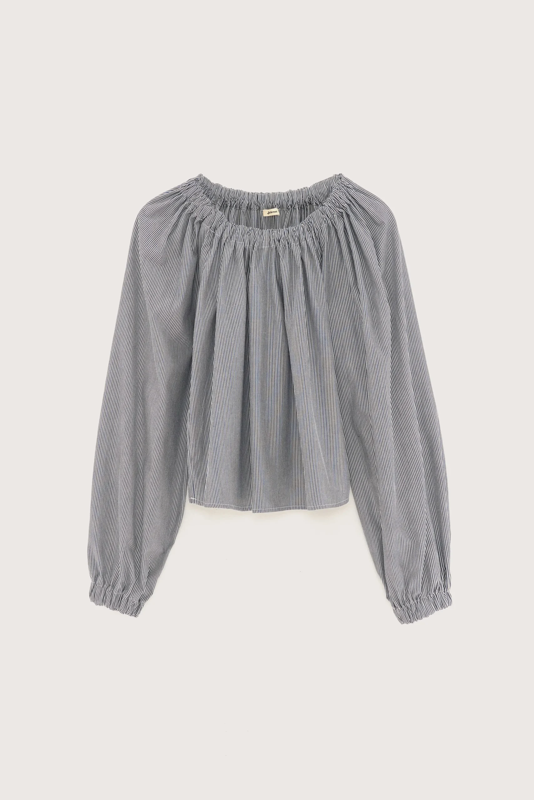 Romantische blouse met lange mouwen, een elastische halslijn en gerimpelde details, gemaakt van katoen met zwart-witte microstrepen.Regular pasvorm Elastische kraag die rond of van de schouders gedragen kan wordenLange mouwen met ballonsteekGerimpelde details Gebogen zoom