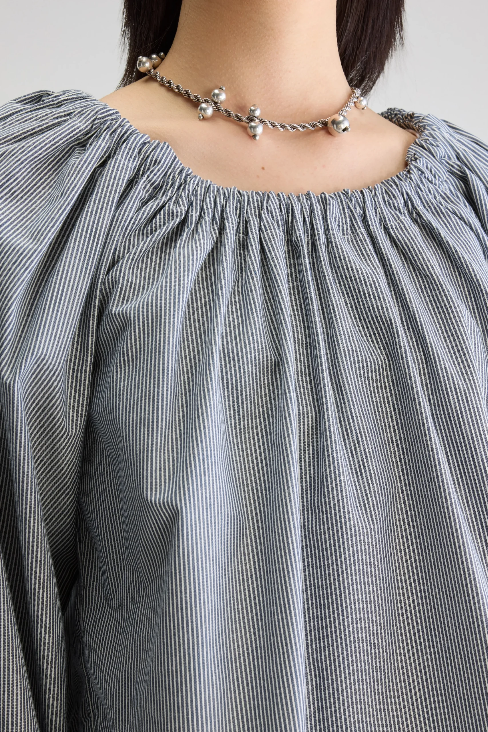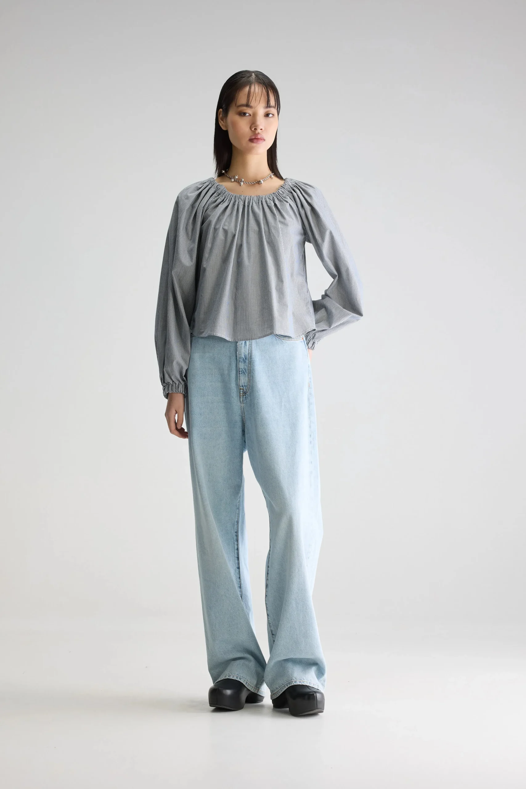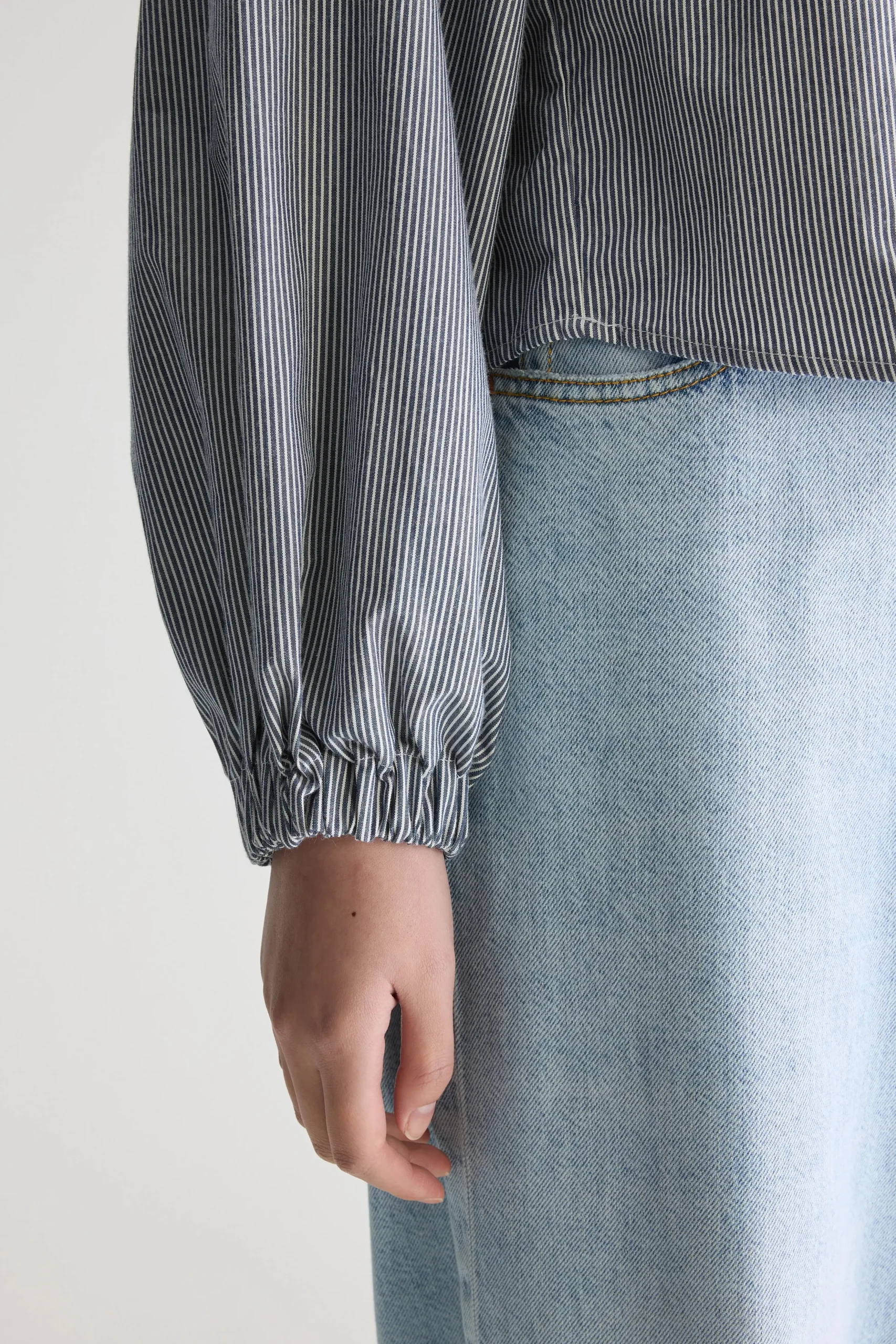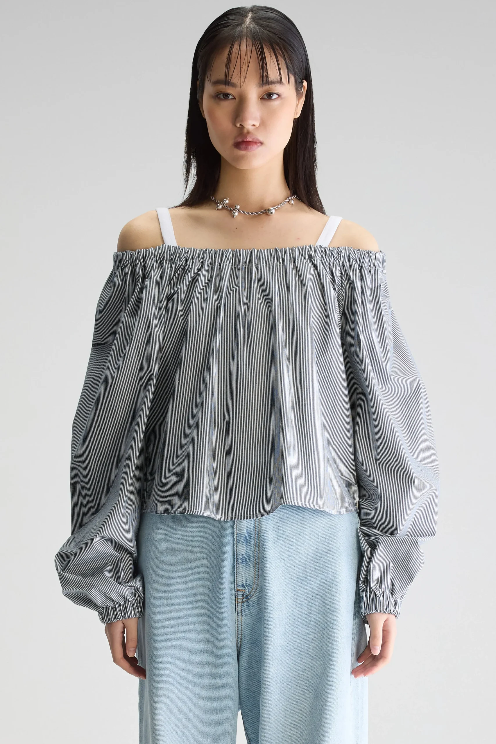 Romantische blouse met lange mouwen, een elastische halslijn en gerimpelde details, gemaakt van katoen met zwart-witte microstrepen.Regular pasvorm Elastische kraag die rond of van de schouders gedragen kan wordenLange mouwen met ballonsteekGerimpelde details Gebogen zoom