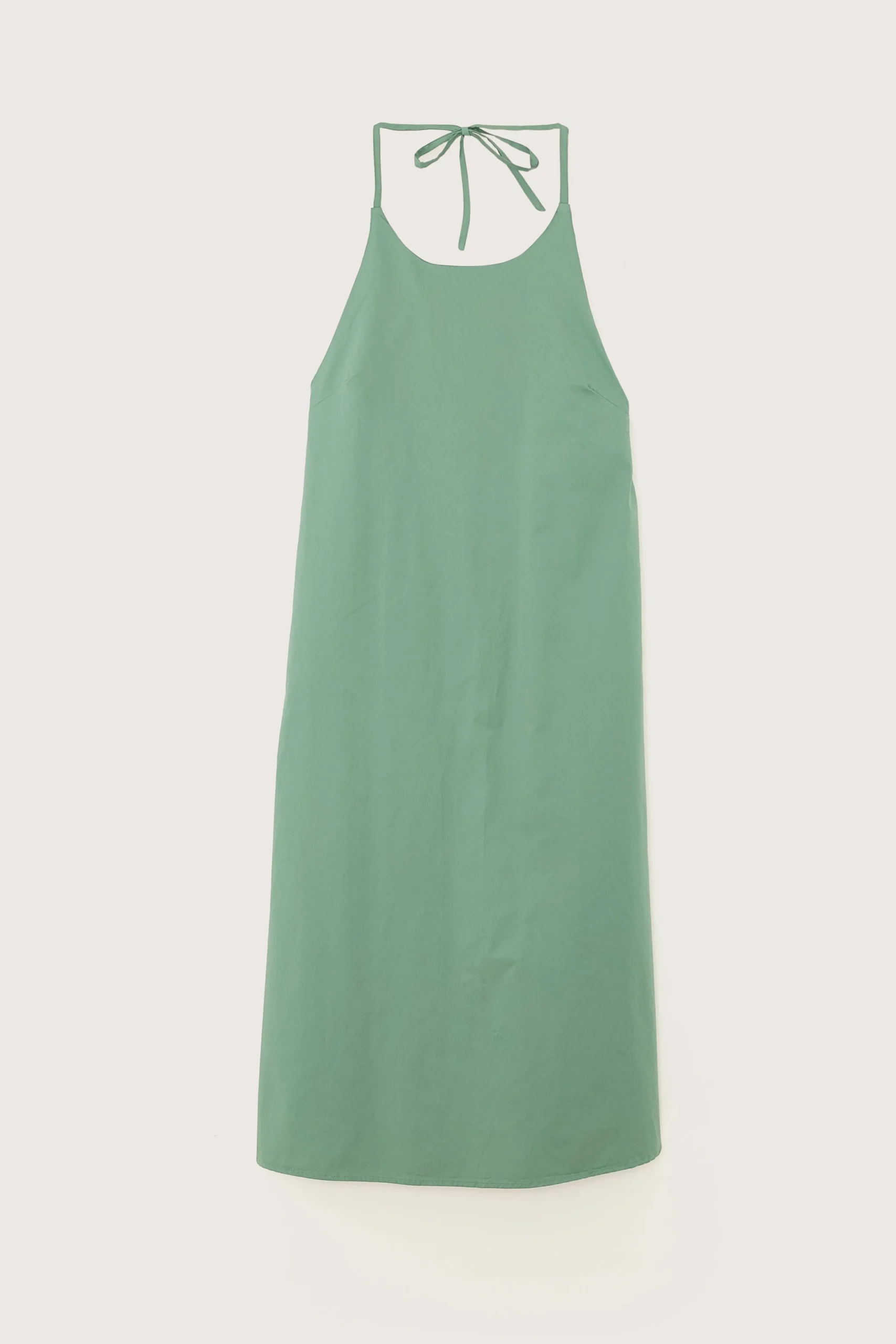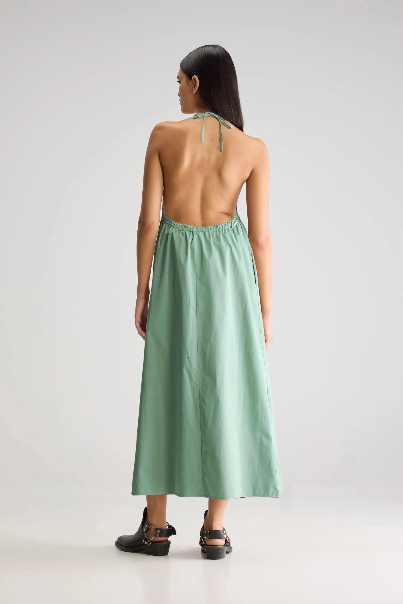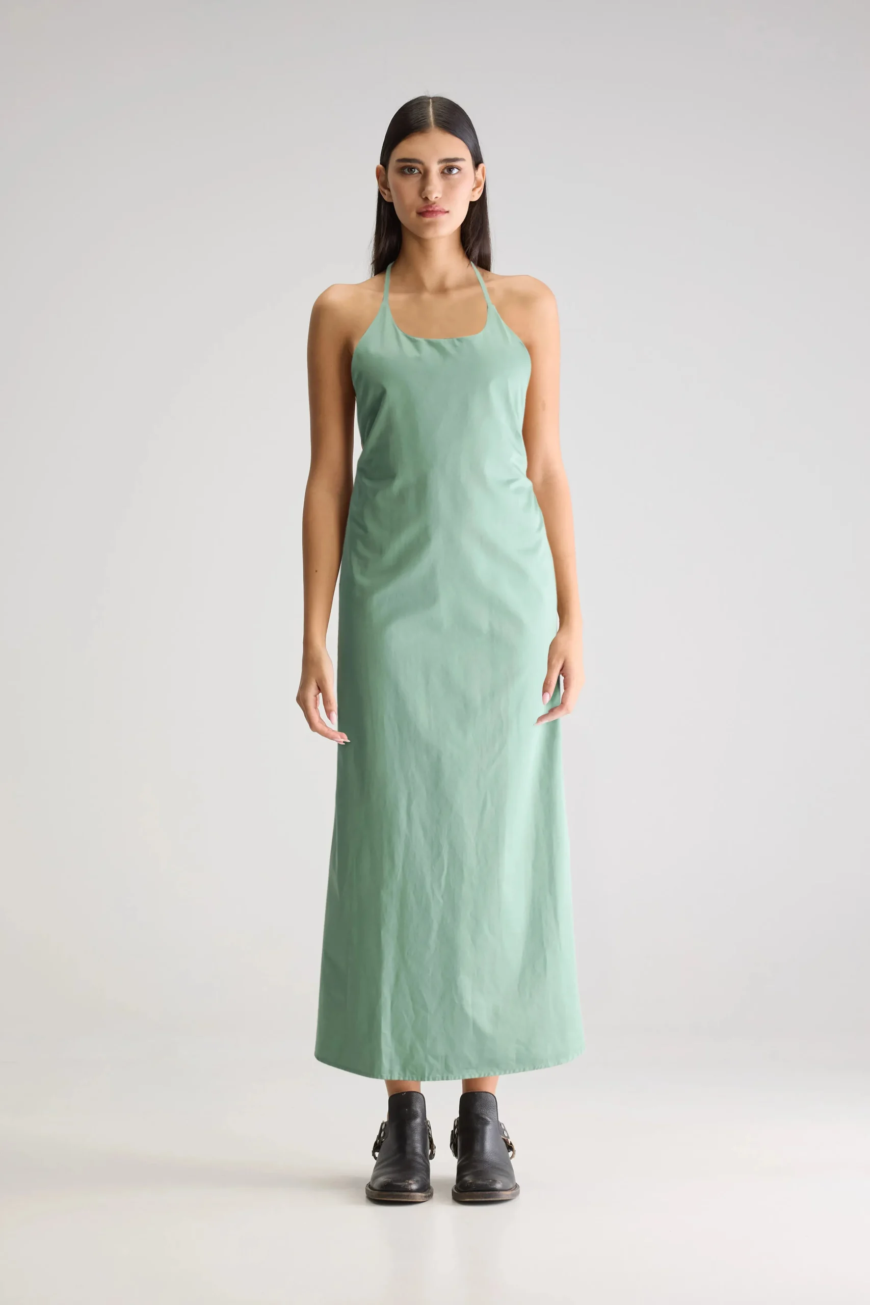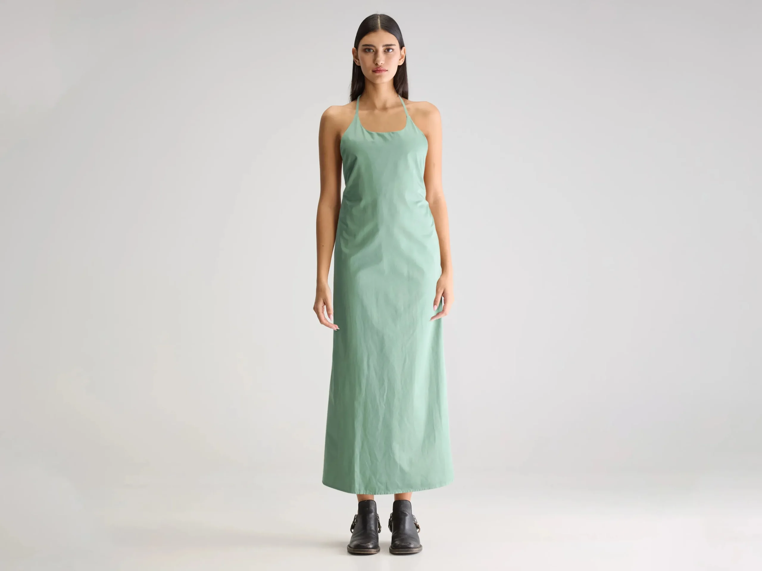 Lichte saliekleurige lange jurk met open rug en strikdetail aan de achterkant van de hals.Klassieke pasvormMouwloos Halternek met striksluiting op de rugElastische laag uitgesneden rug