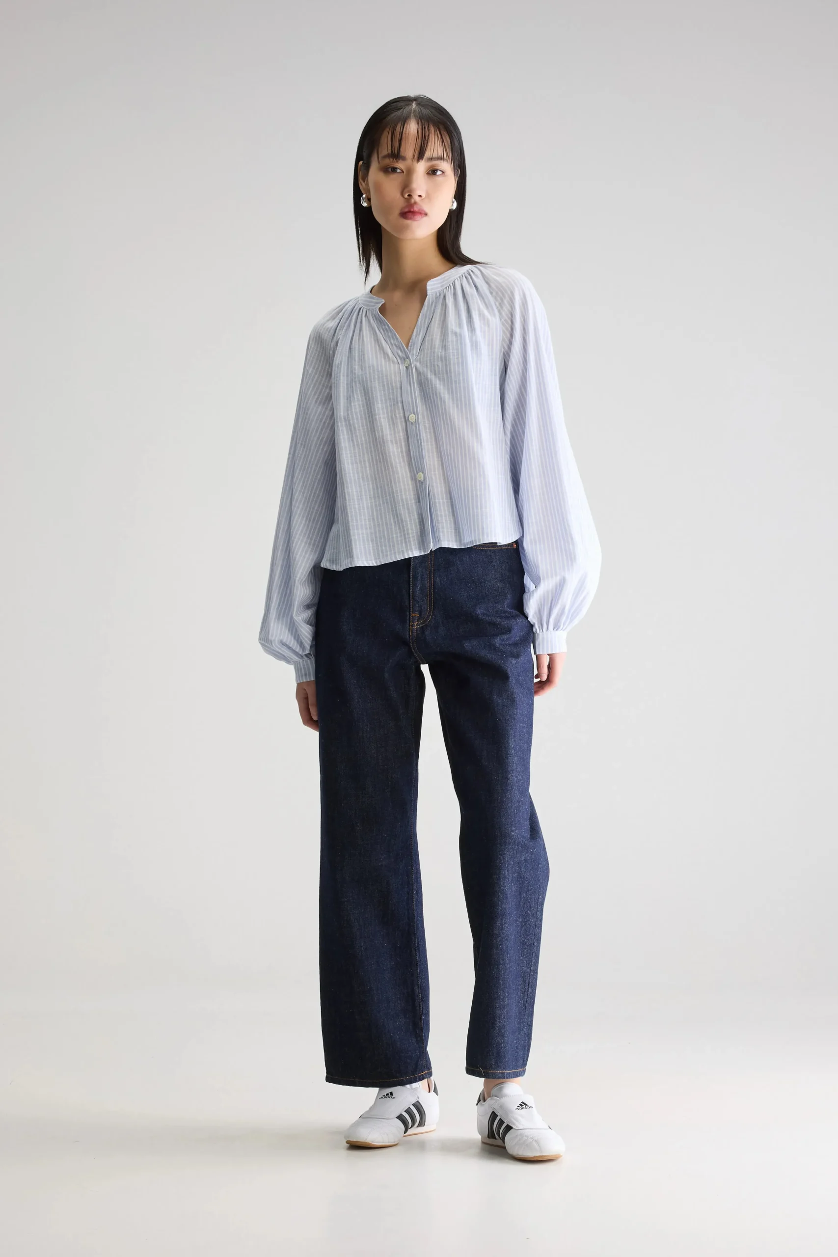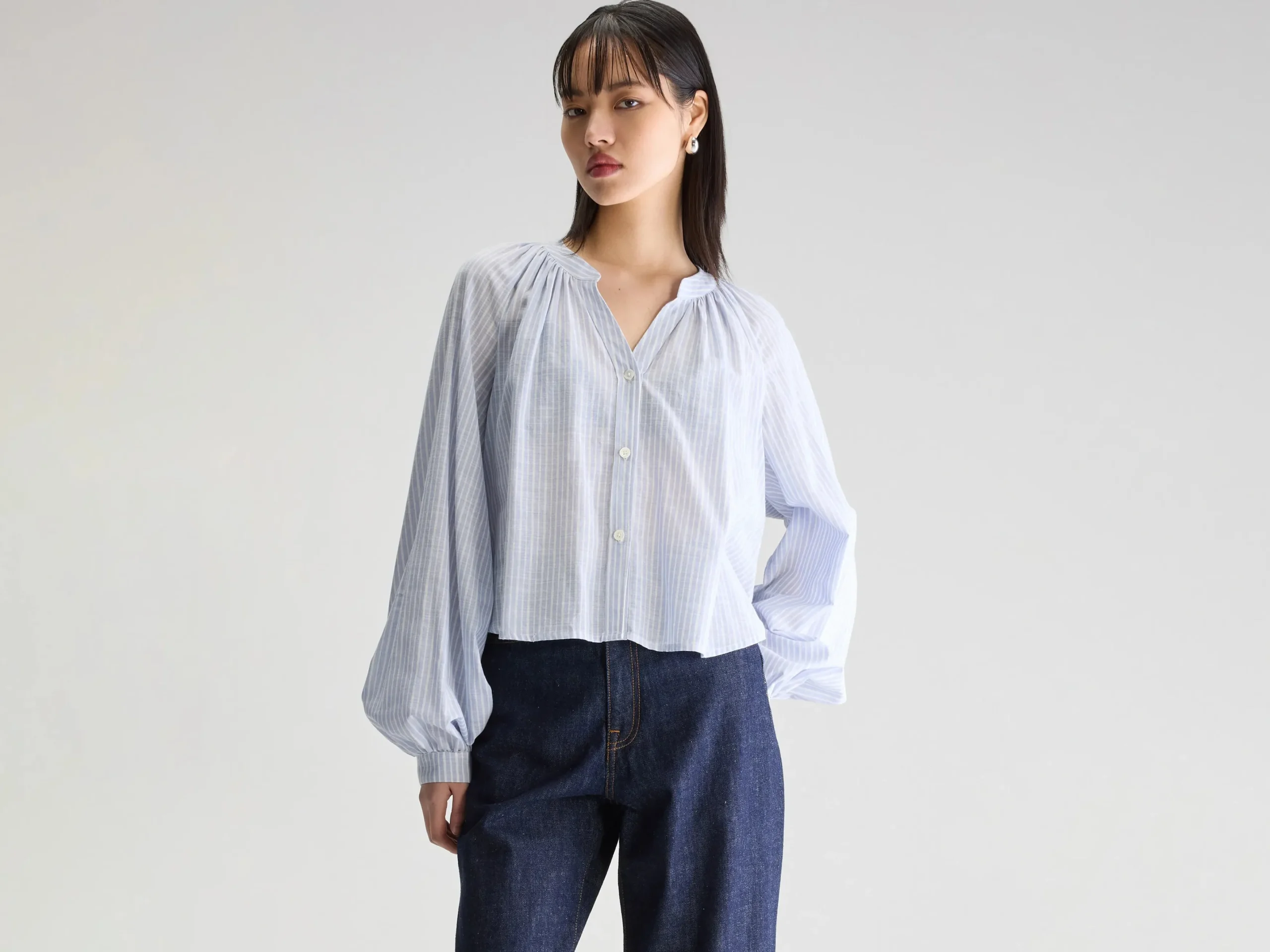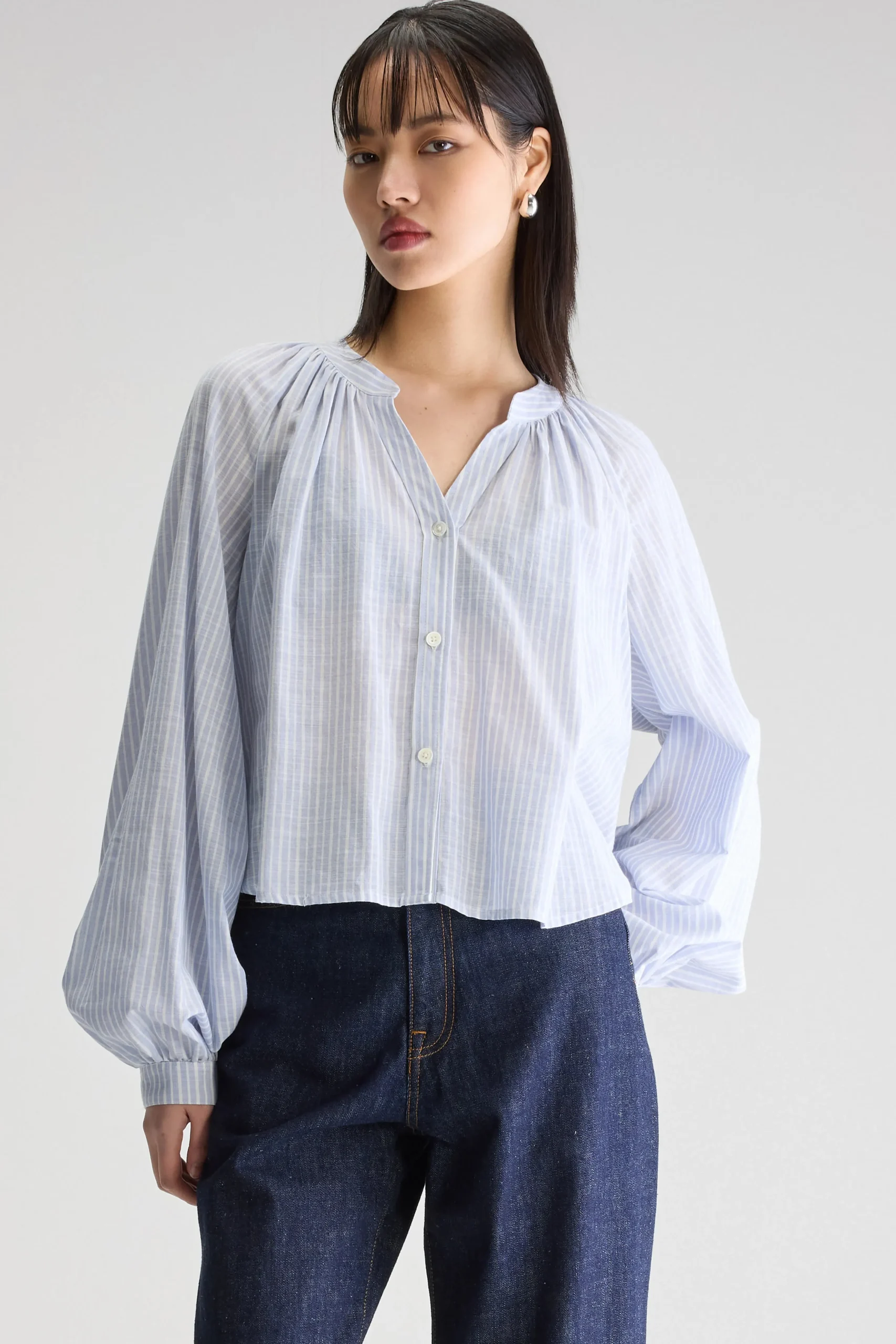 Klassieke blouse met Tunesische halslijn en ballonmouwen met aangezette manchetten, van gestreept katoen.Regular pasvorm…
