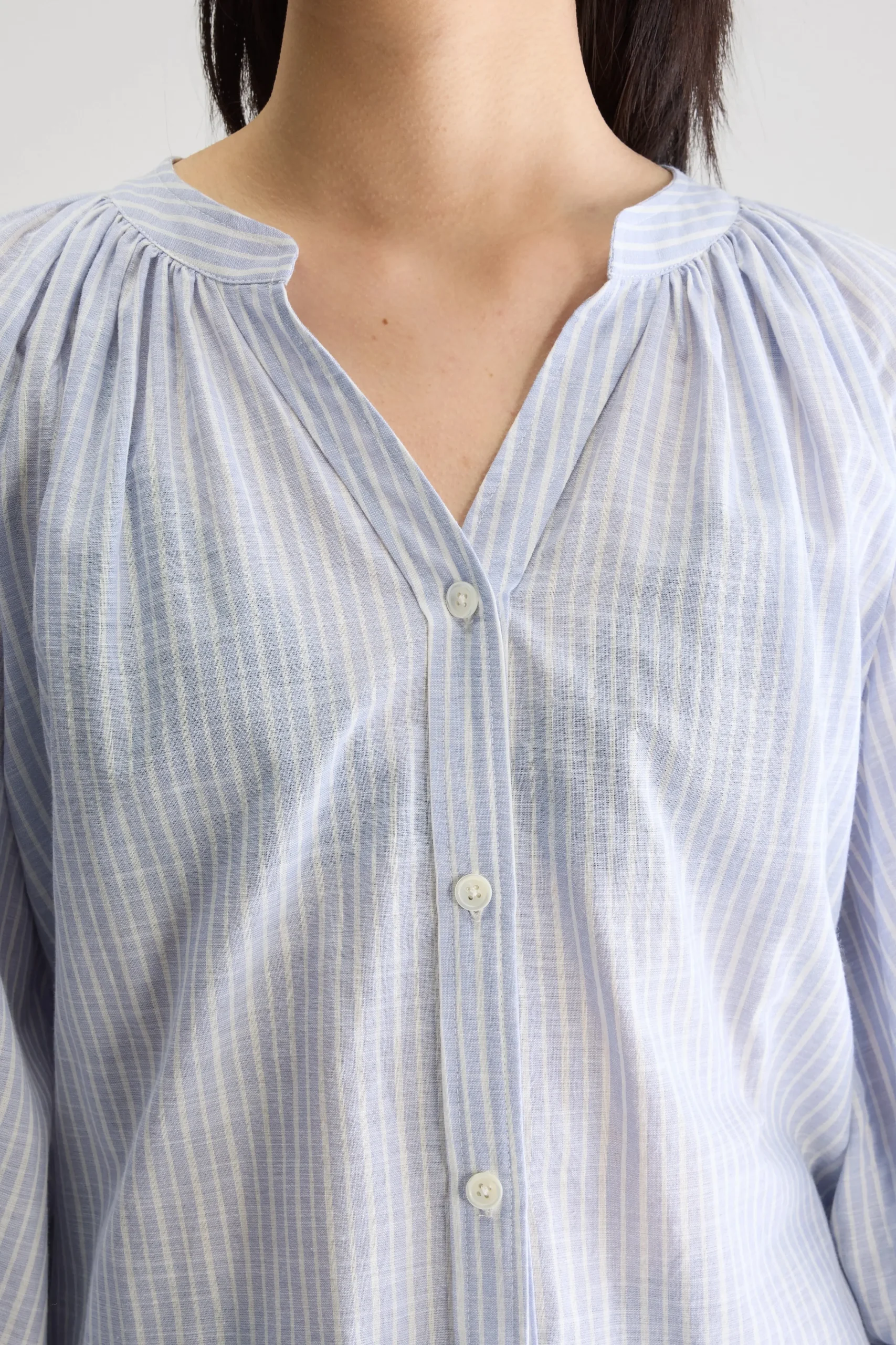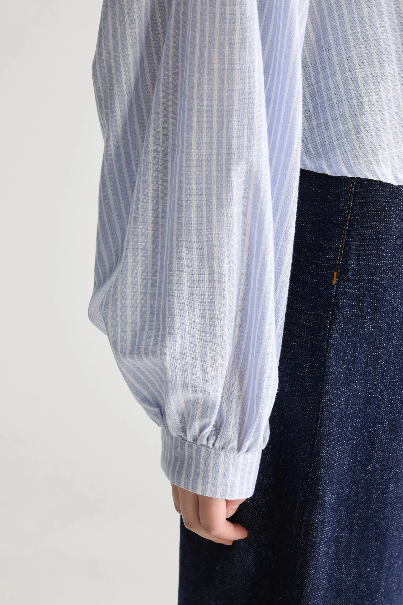 Klassieke blouse met Tunesische halslijn en ballonmouwen met aangezette manchetten, van gestreept katoen.Regular pasvorm Tunesische kraag Lange mouwen met getailleerde manchettenGerimpelde details Gebogen zoom met kleine zijsplitjes