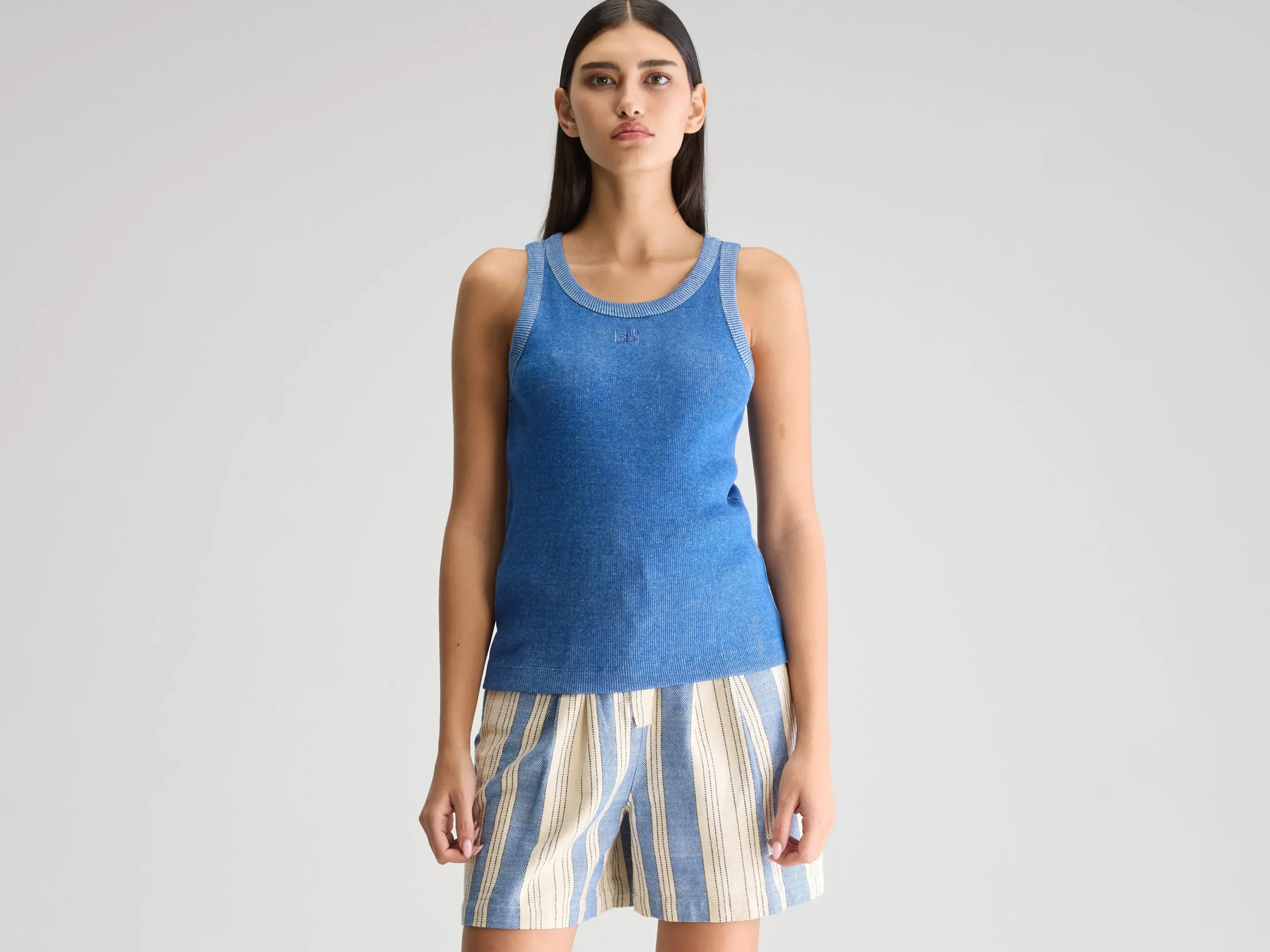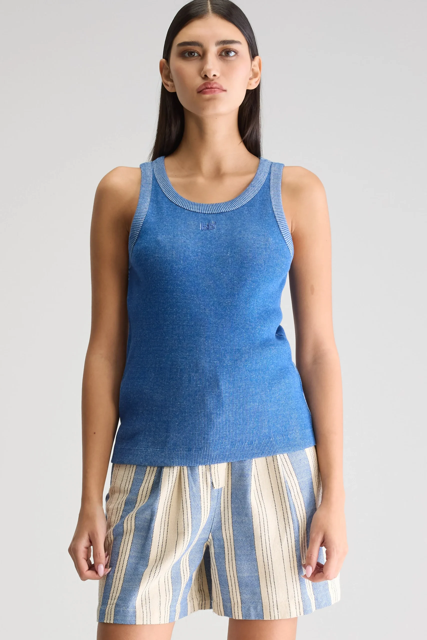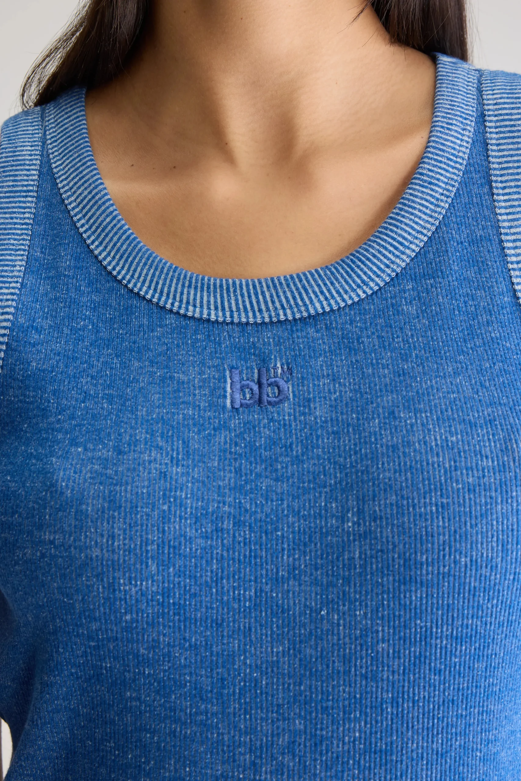 Slim fit tanktop, gemaakt van geribd, chinéblauw katoenjersey met “bb”-borduursel op de voorkant. Slim fitRonde hals Racer-rug “bb”-borduursel op de voorkantMiddelzwaar, geribd katoenjersey