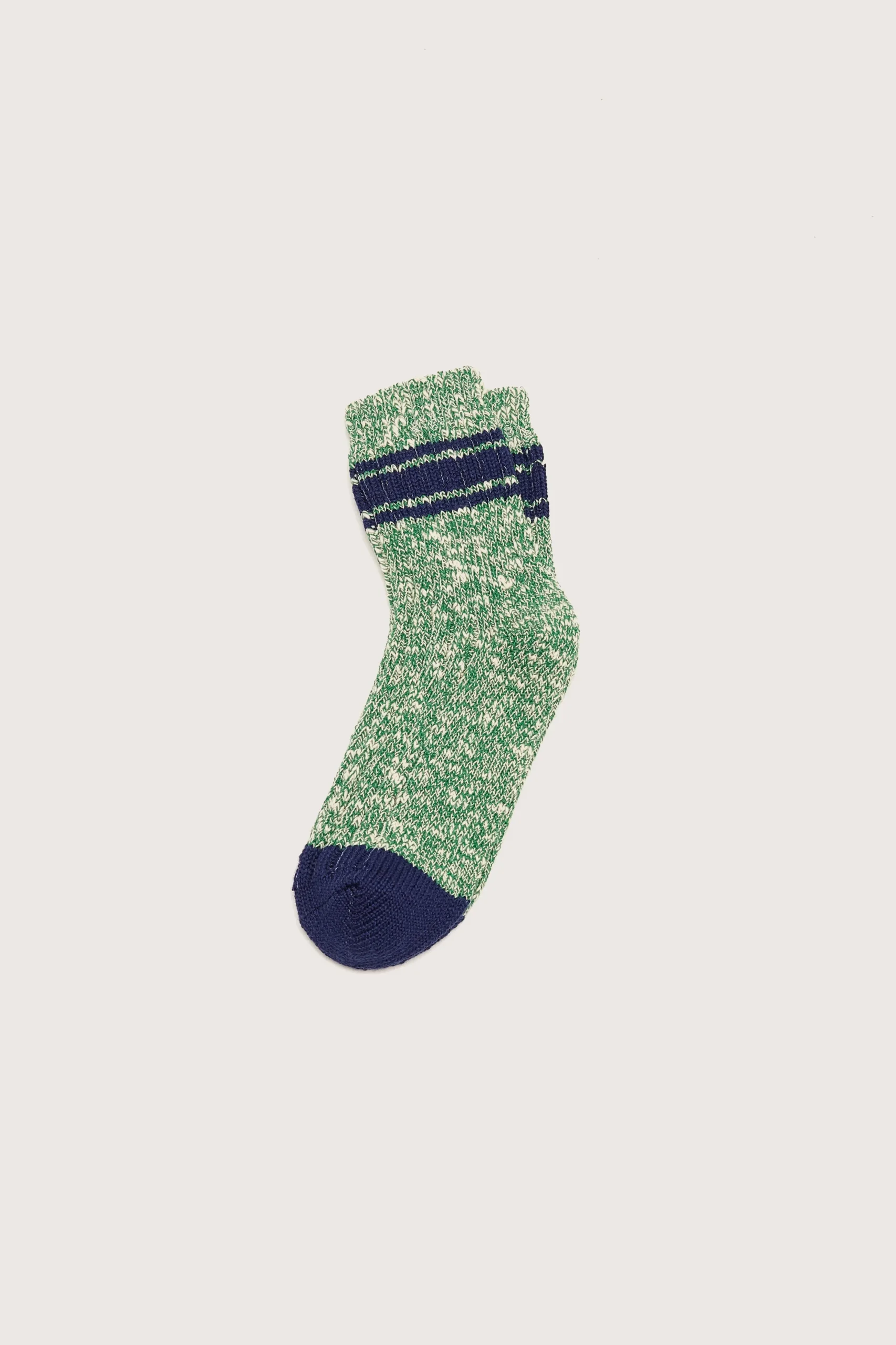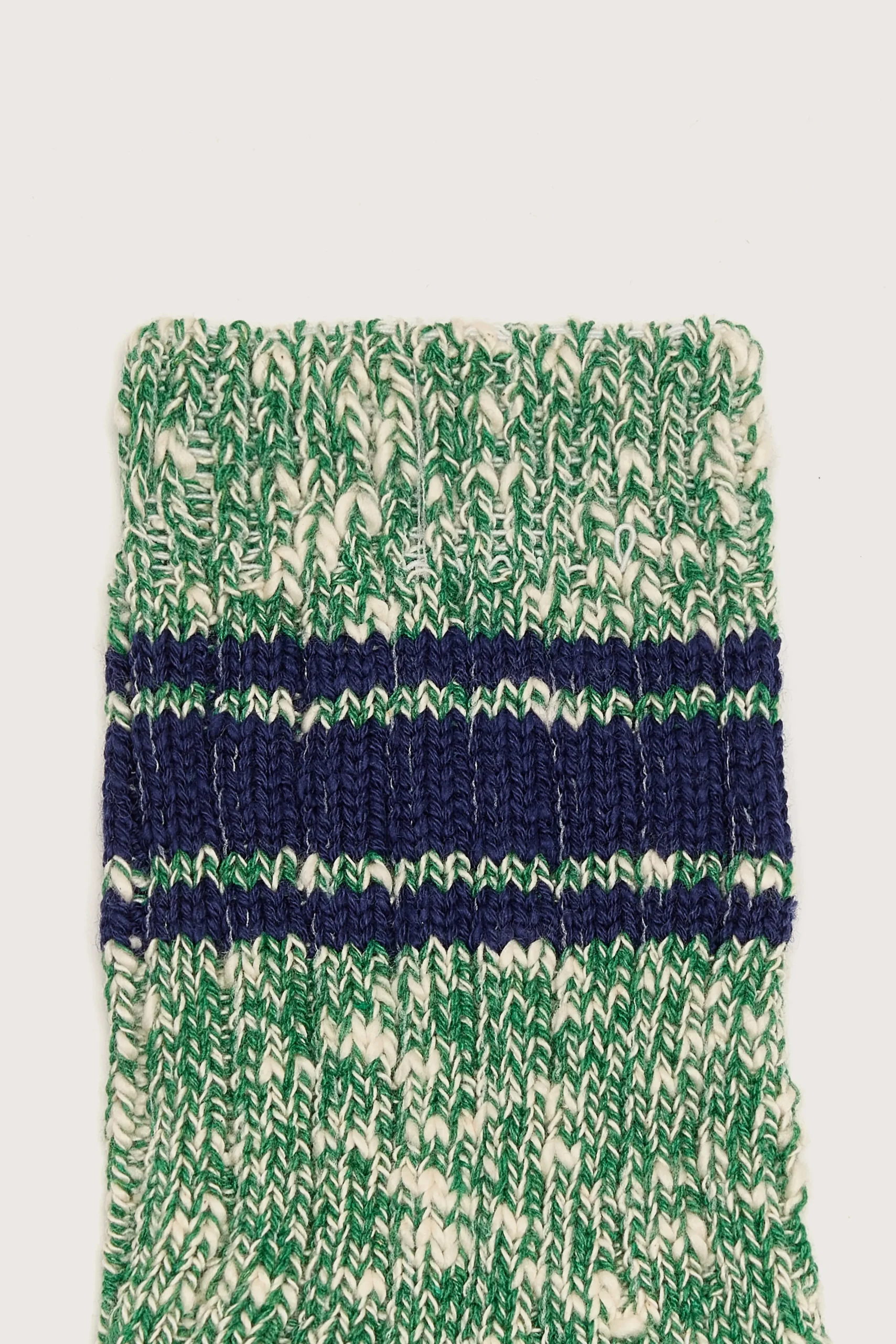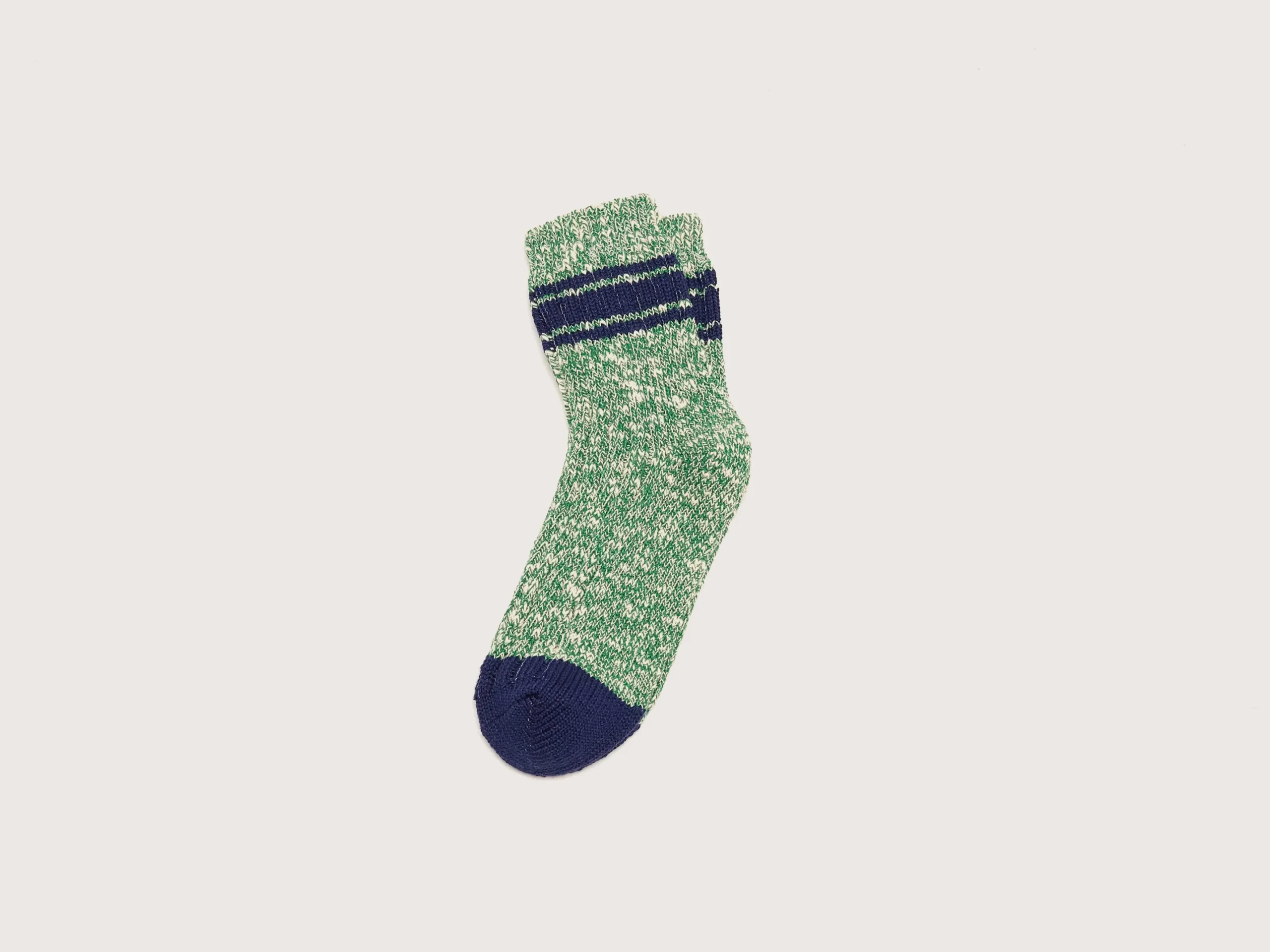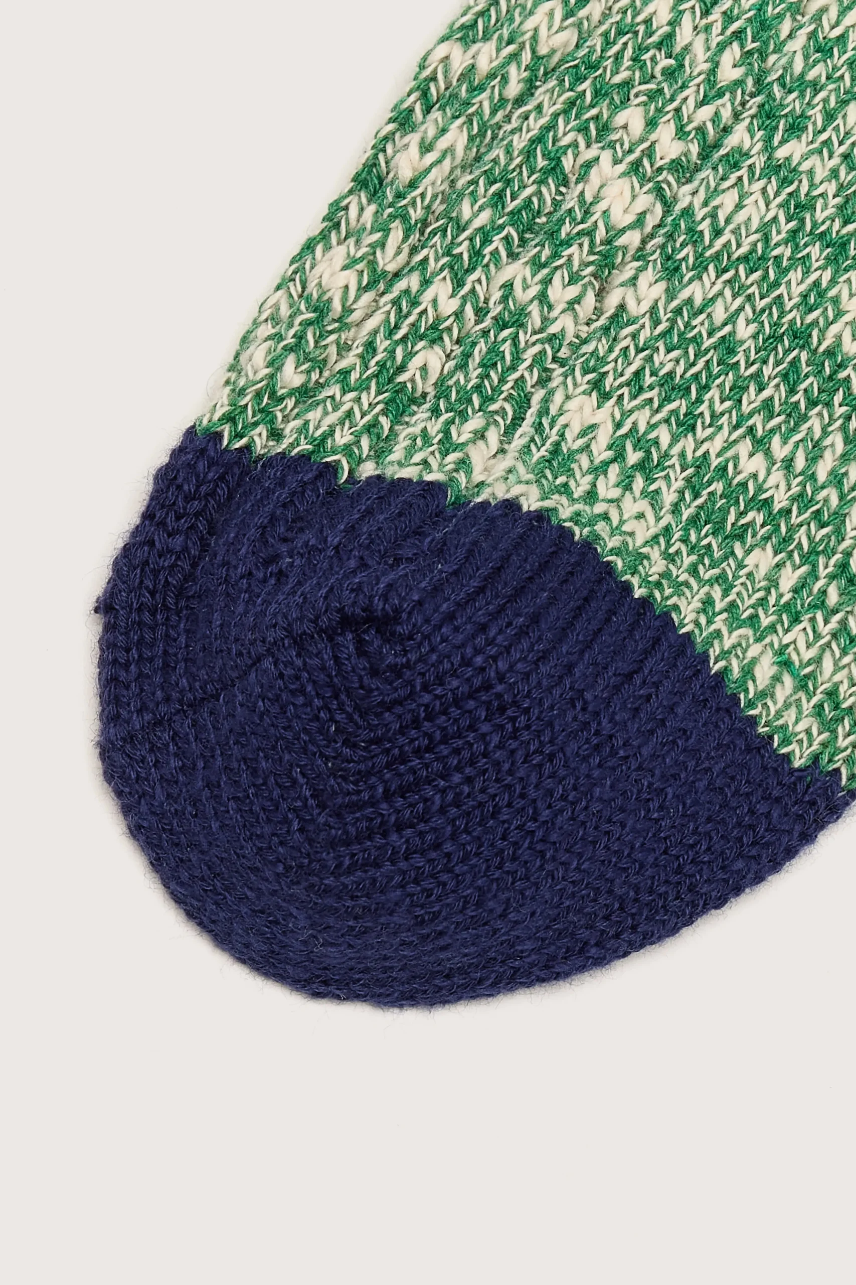 Dikke, halflange sokken met opvallende marineblauwe teen en manchet, groen-wit gespikkeld gebreid patroon, geribde textuur, gemaakt van zachte stof.HalflangGebreid patroonMarineblauwe accenten op teen en manchetKatoen en polyester