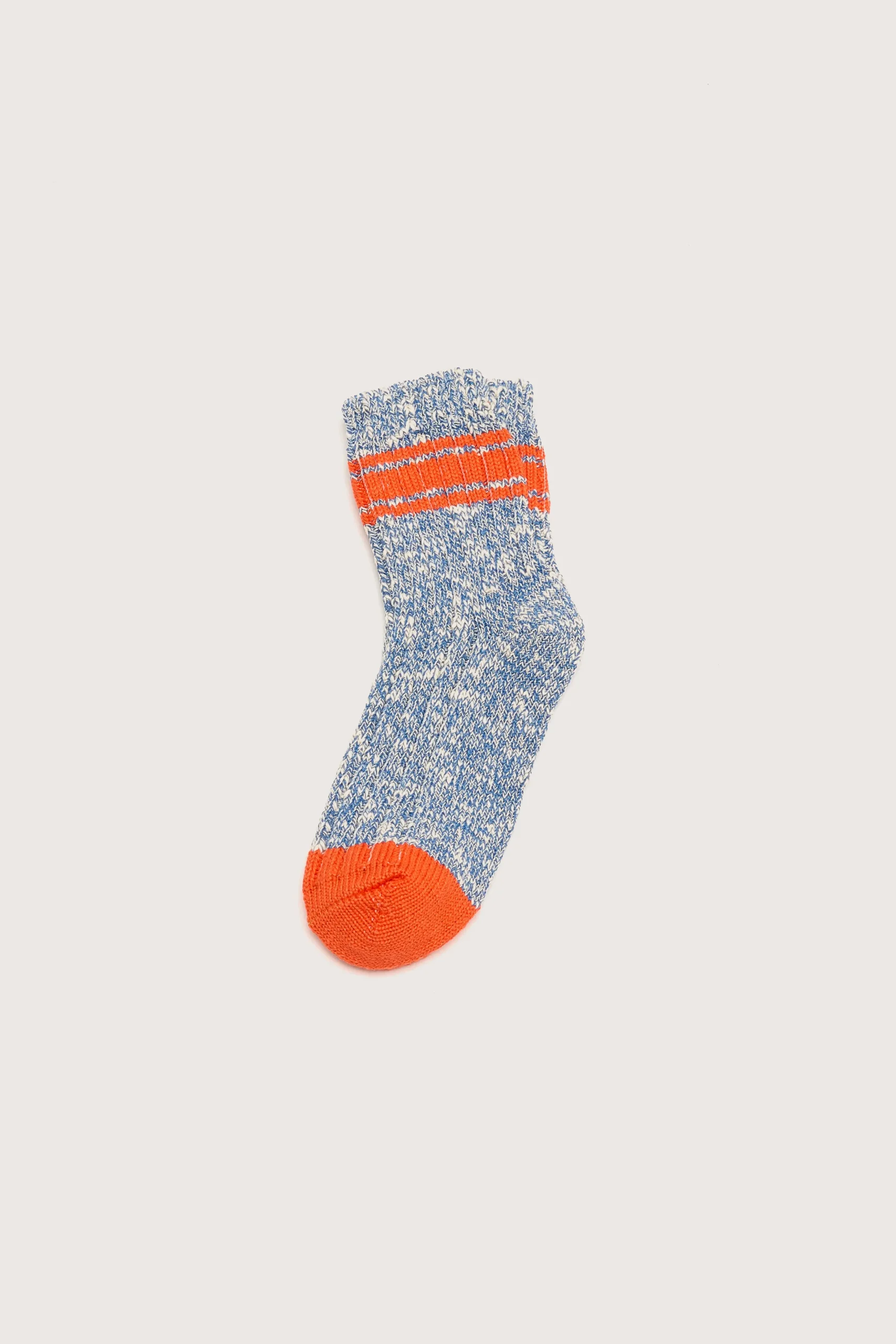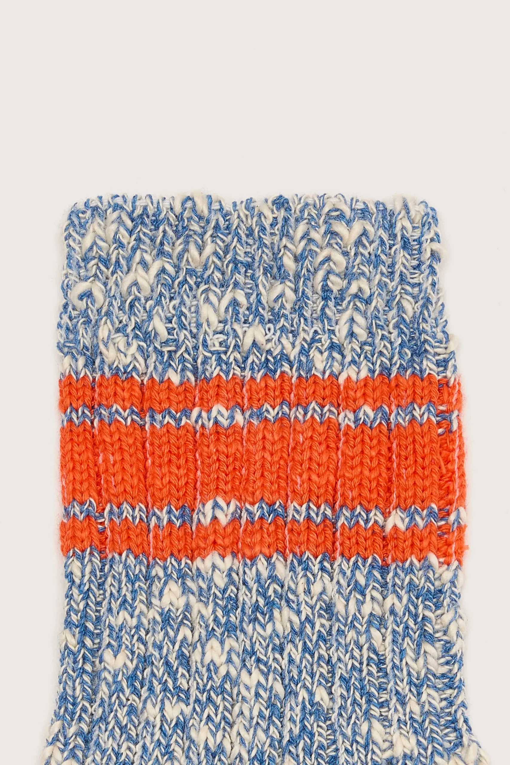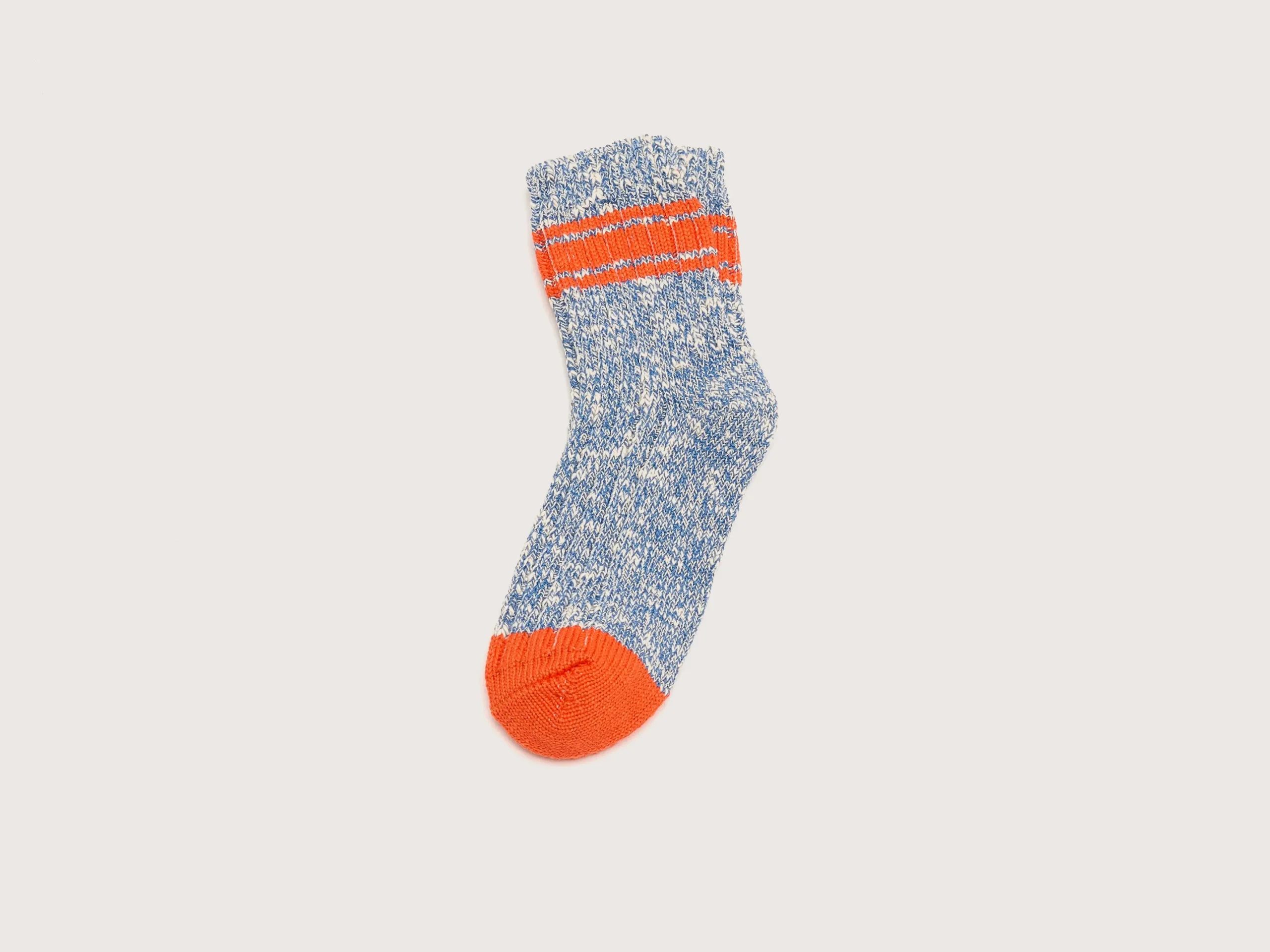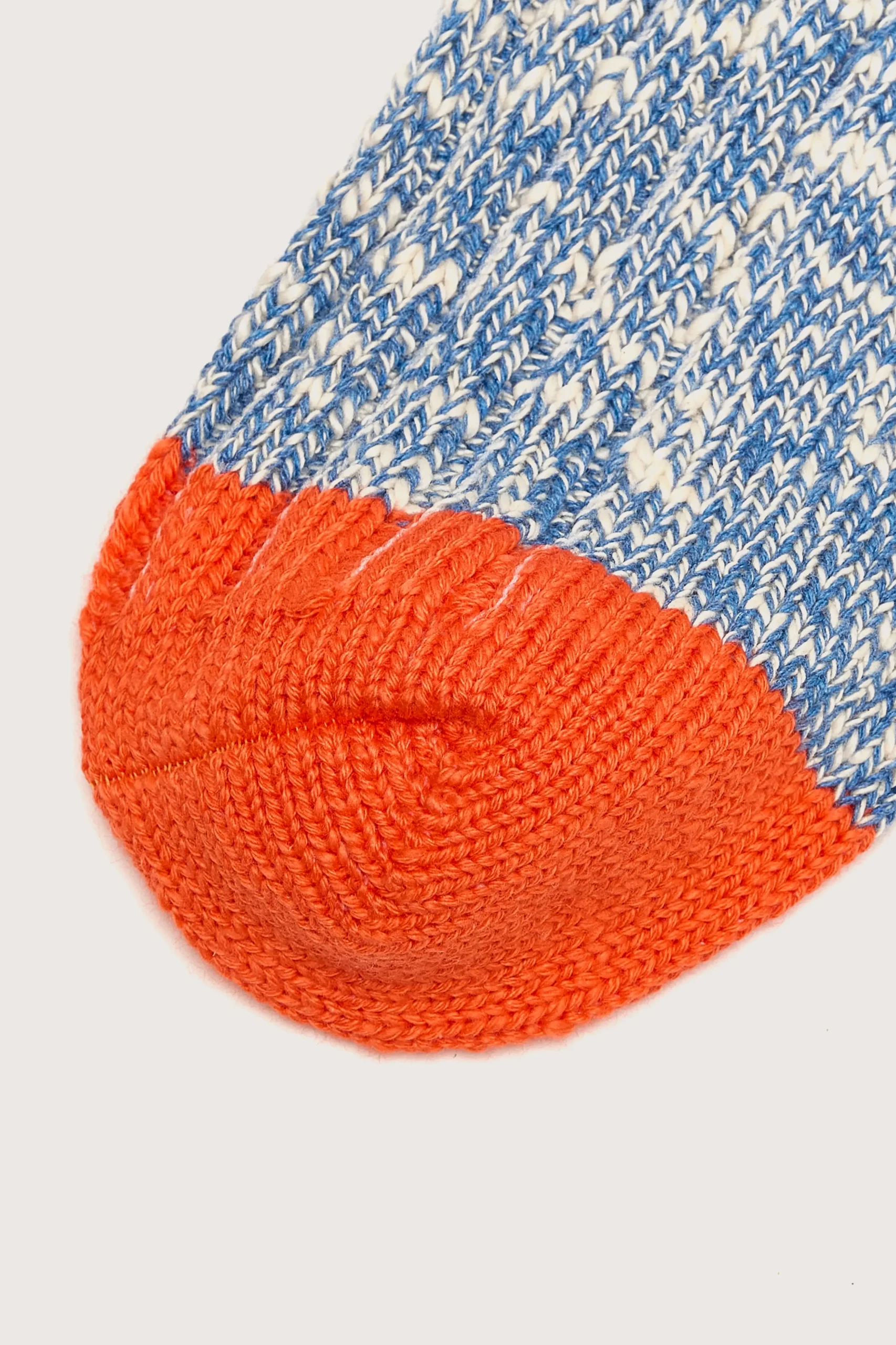 Dikke, halflange sokken met opvallende oranje teen en manchet, blauw-wit gespikkeld gebreid patroon, geribde textuur, gemaakt van zachte stof.HalflangGebreid patroonOranje accenten teen en manchetKatoen en polyester