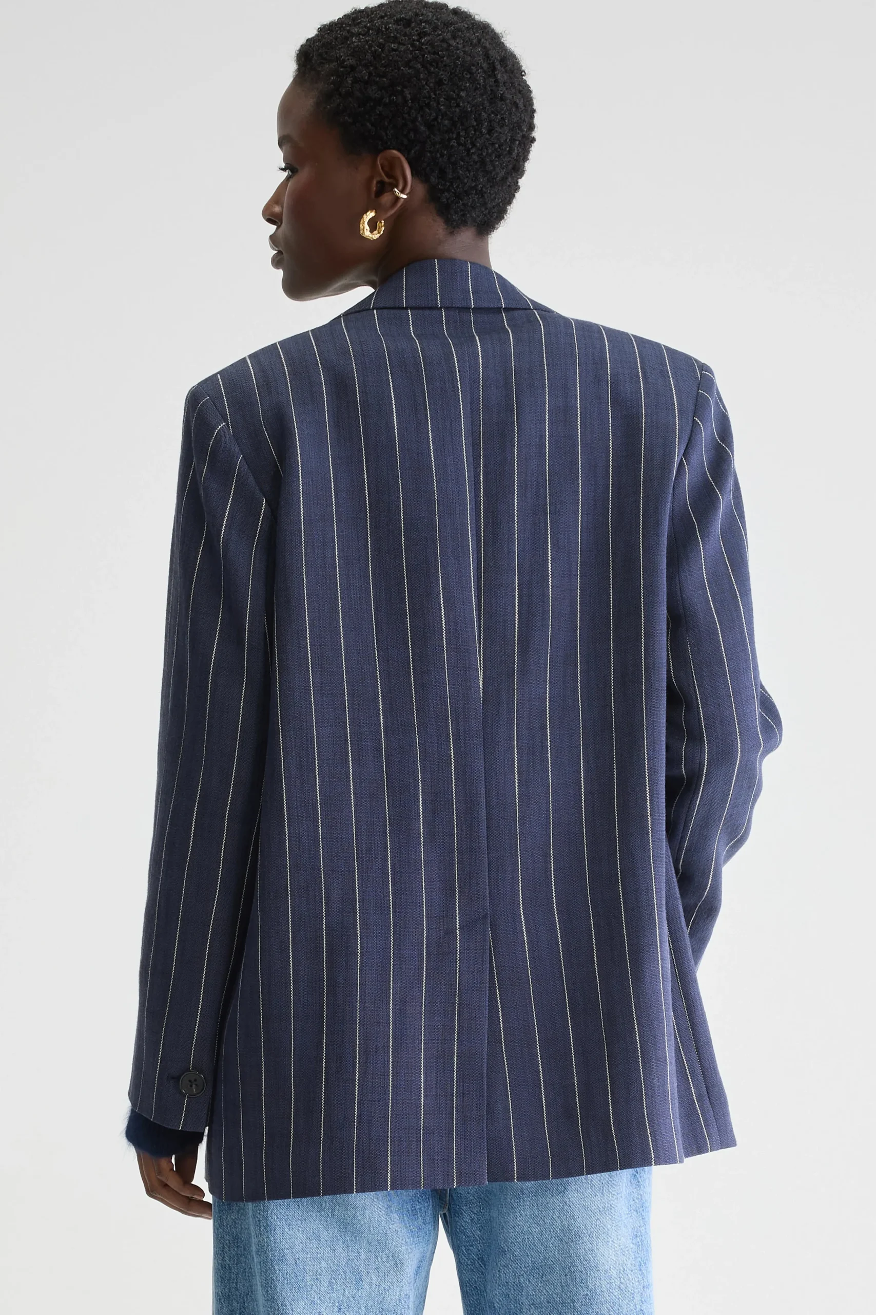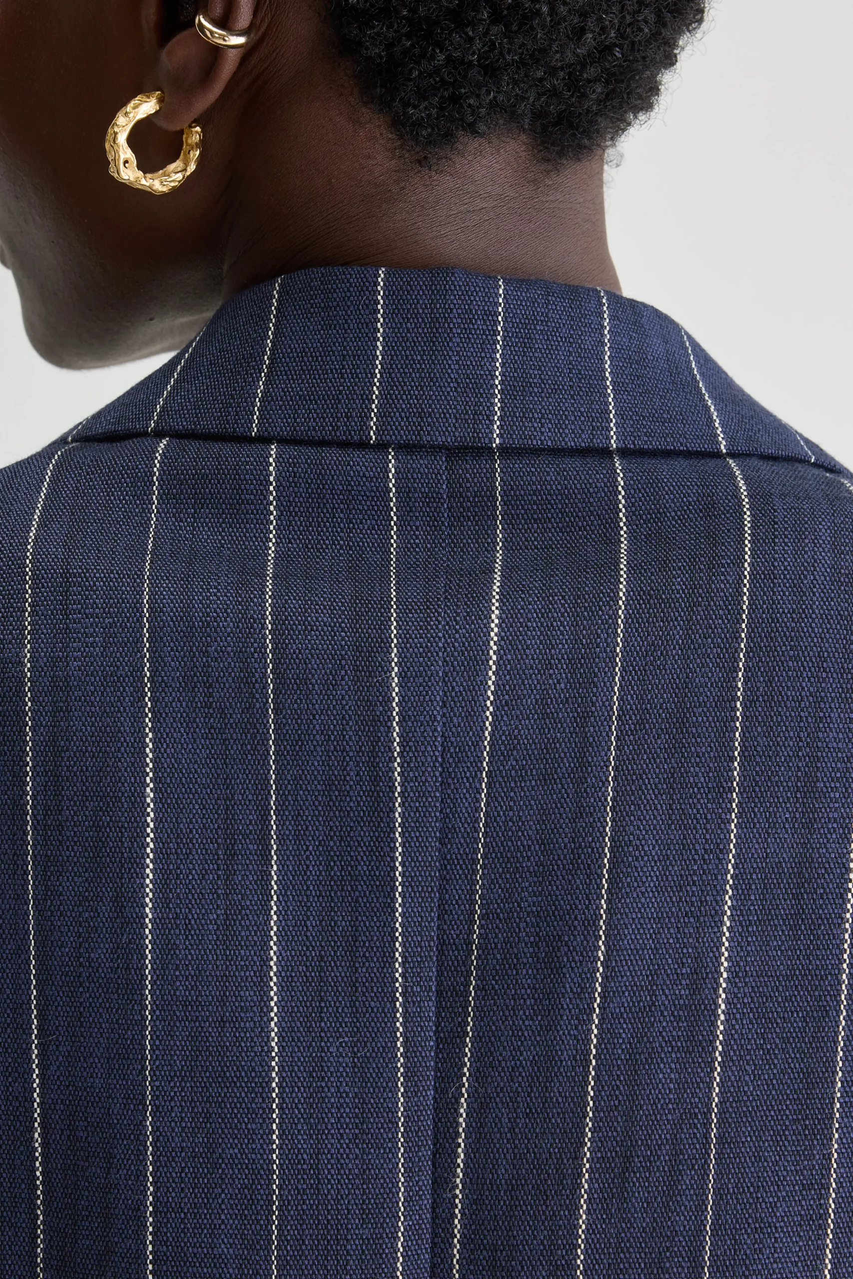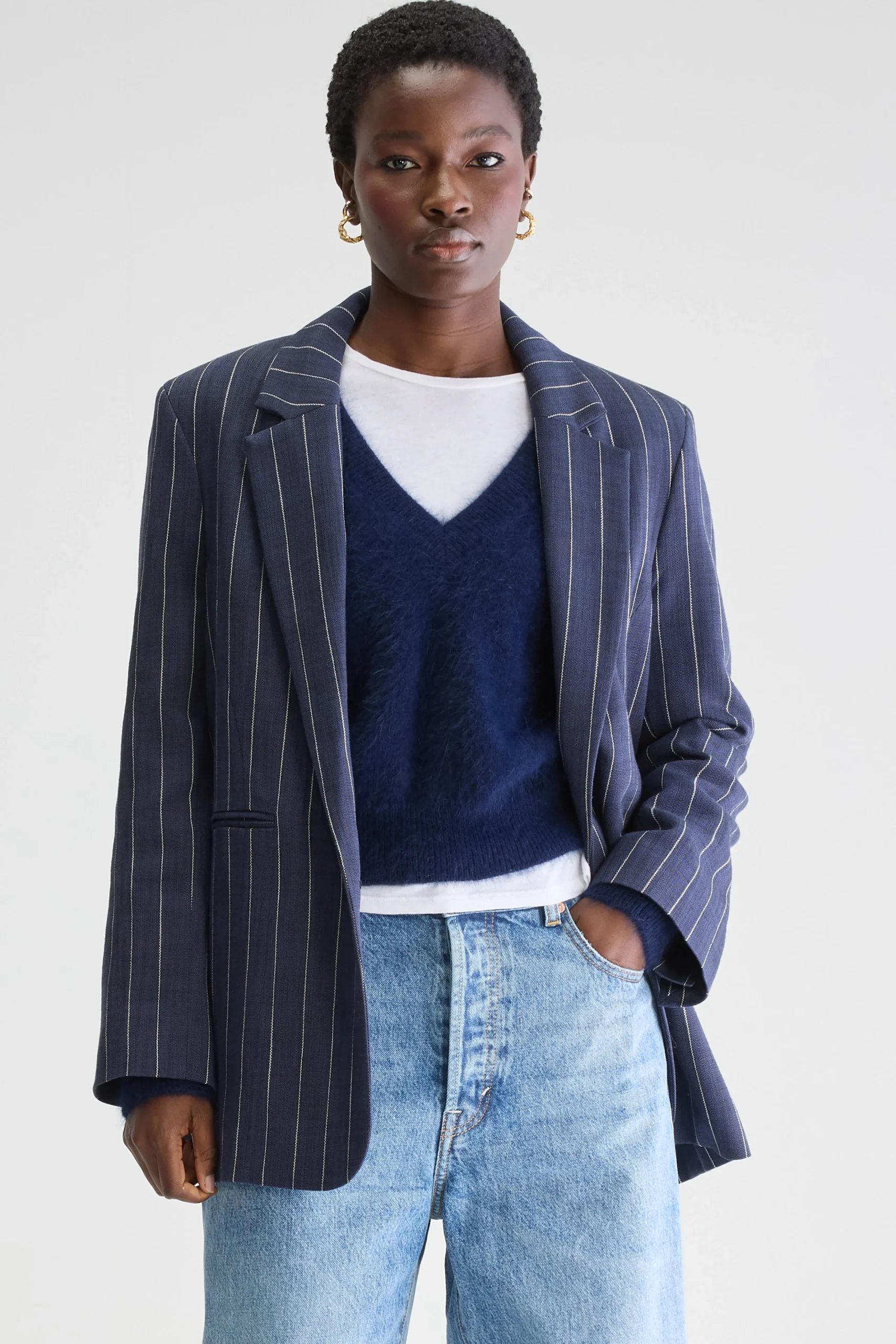 Relaxte blazer van klassieke krijtstreepstof in donkerblauw en ecru met ingekeepte revers en paspelzakken.Relaxed modelDiepe revers Enkele knoopsluiting Gewatteerde zakken Manchetten met knoopGedeeltelijk gevoerd