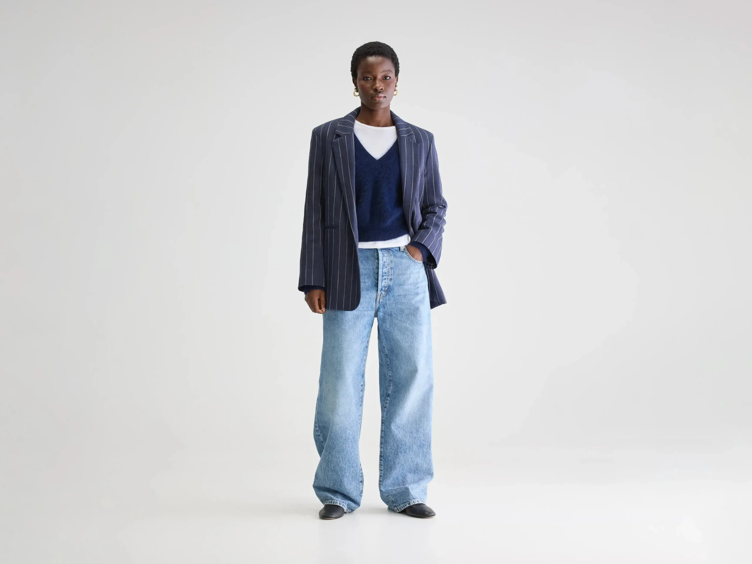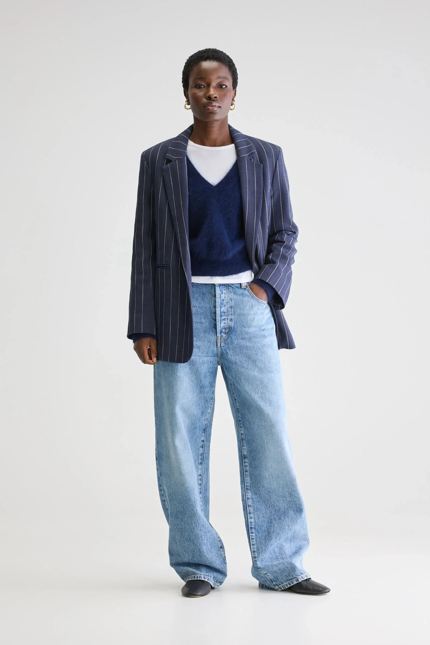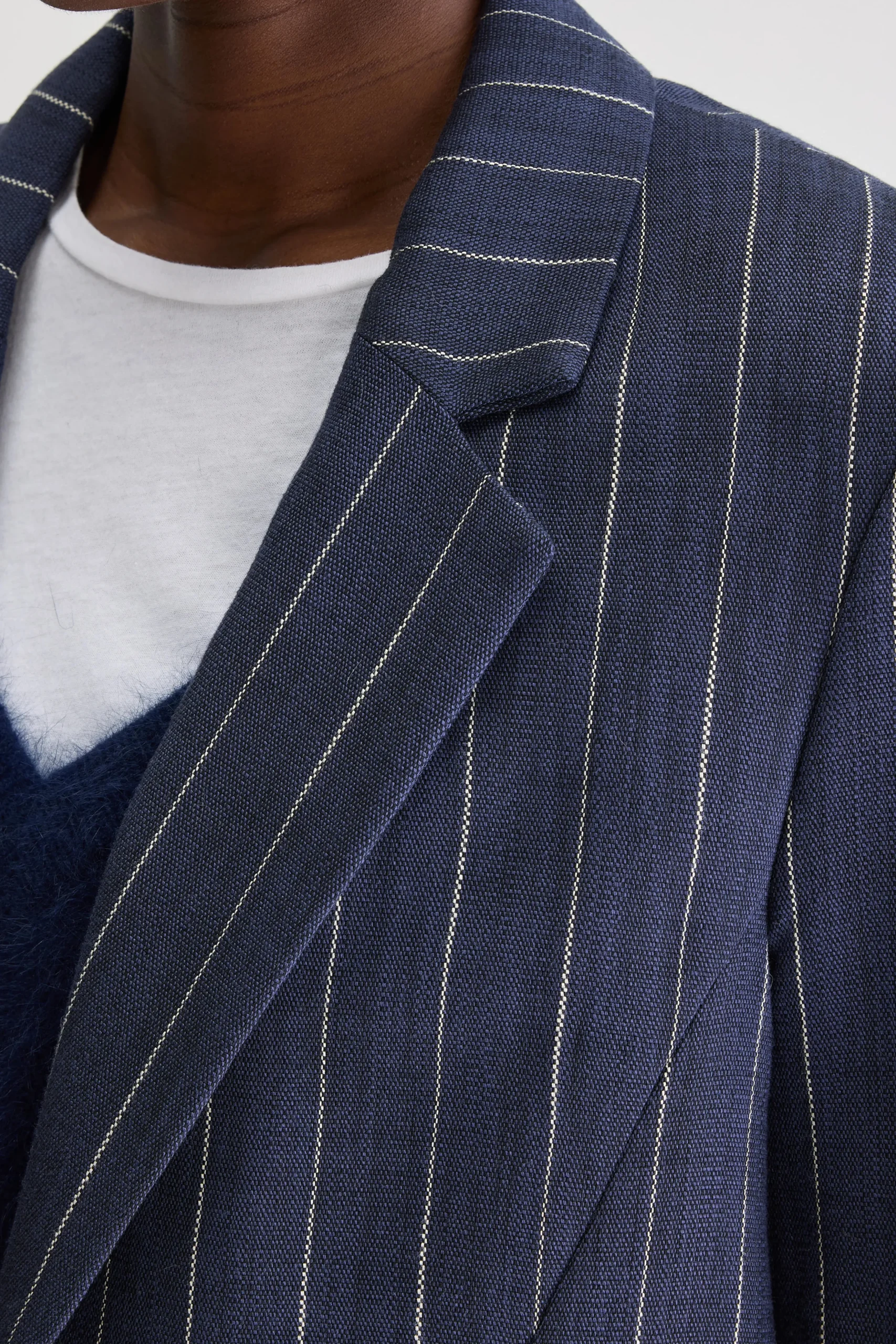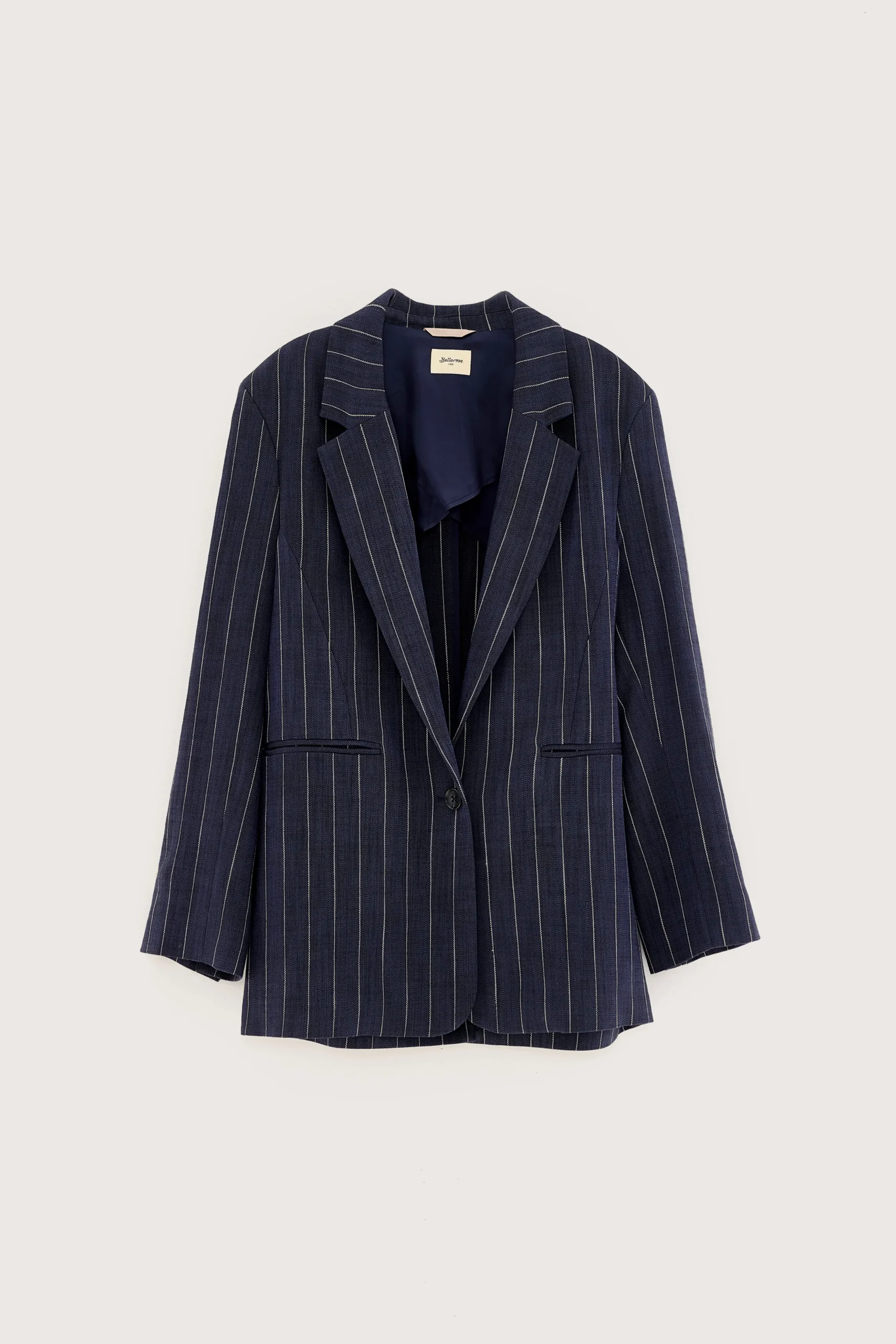Relaxte blazer van klassieke krijtstreepstof in donkerblauw en ecru met ingekeepte revers en paspelzakken.Relaxed modelDiepe revers Enkele knoopsluiting Gewatteerde zakken Manchetten met knoopGedeeltelijk gevoerd