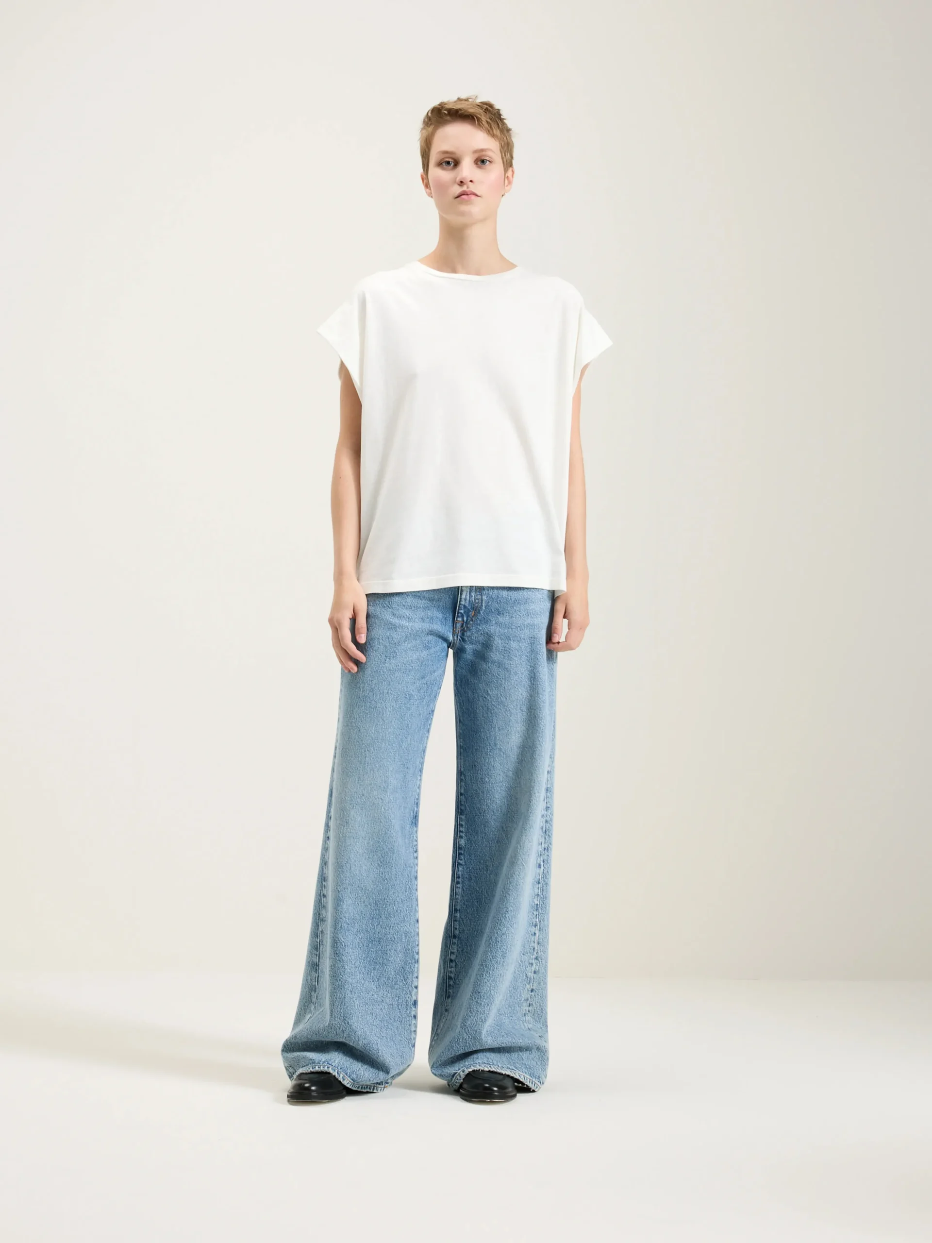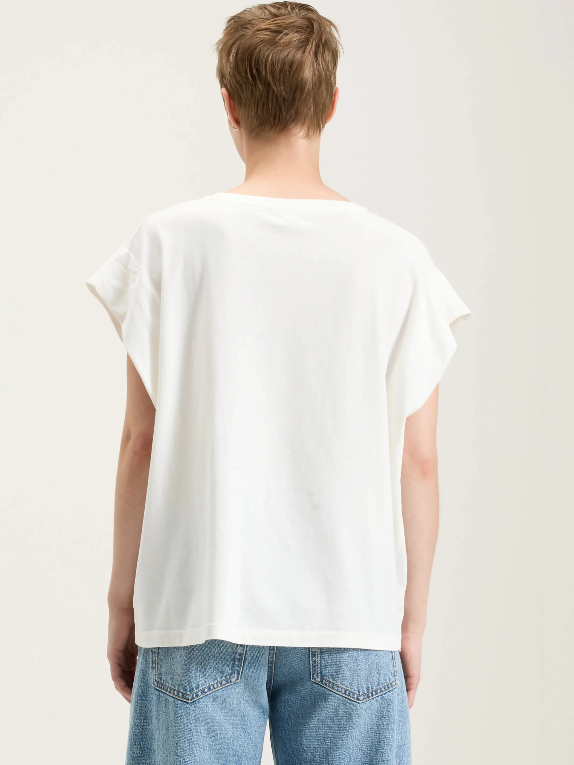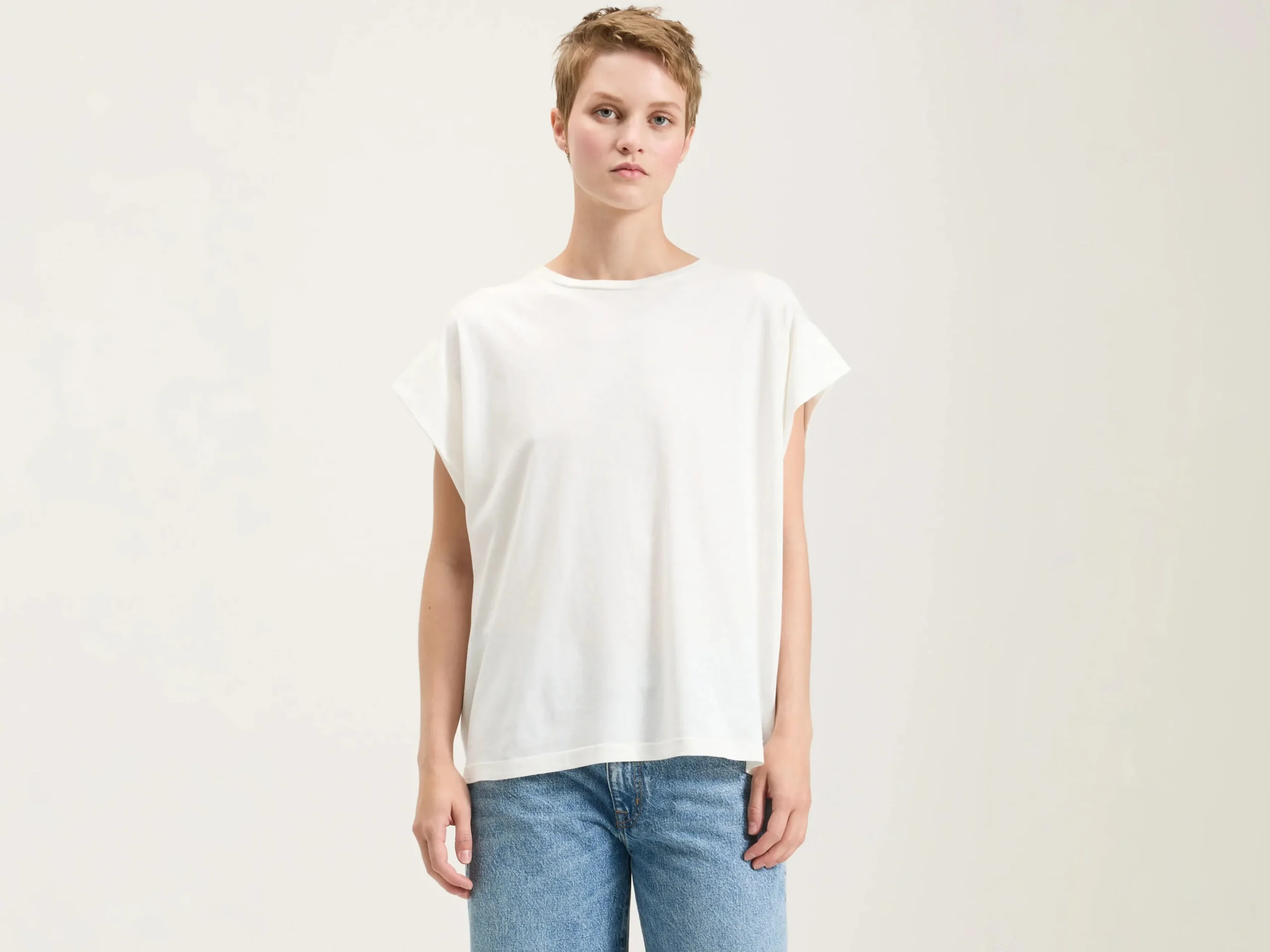 Muscle t-shirt met gevouwen schouders en ronde hals in wit katoen jersey.Regular modelGeribde ronde halsBreed armsgatOverhangende, gevouwen schoudersMiddelzware rustieke jersey stof