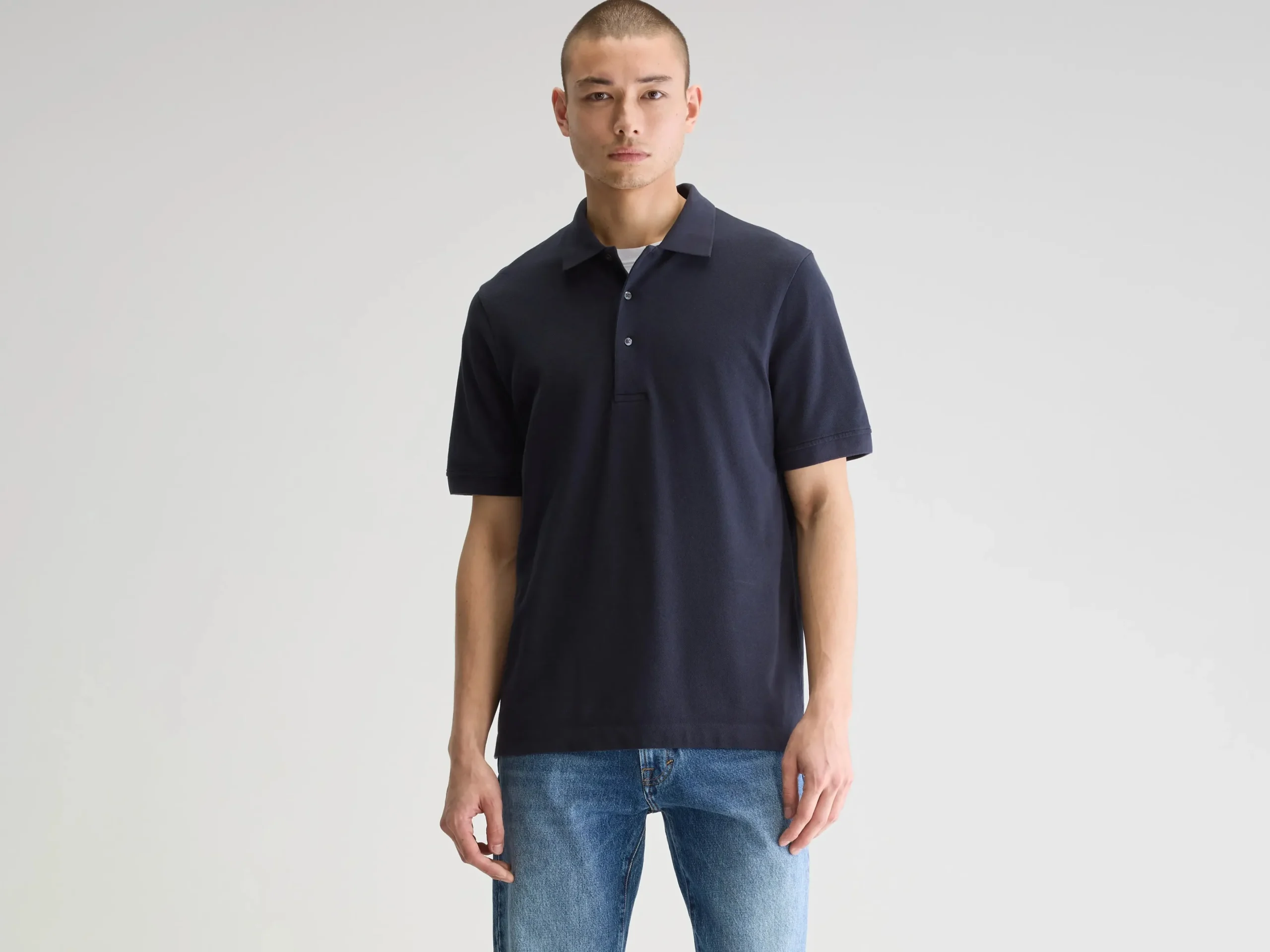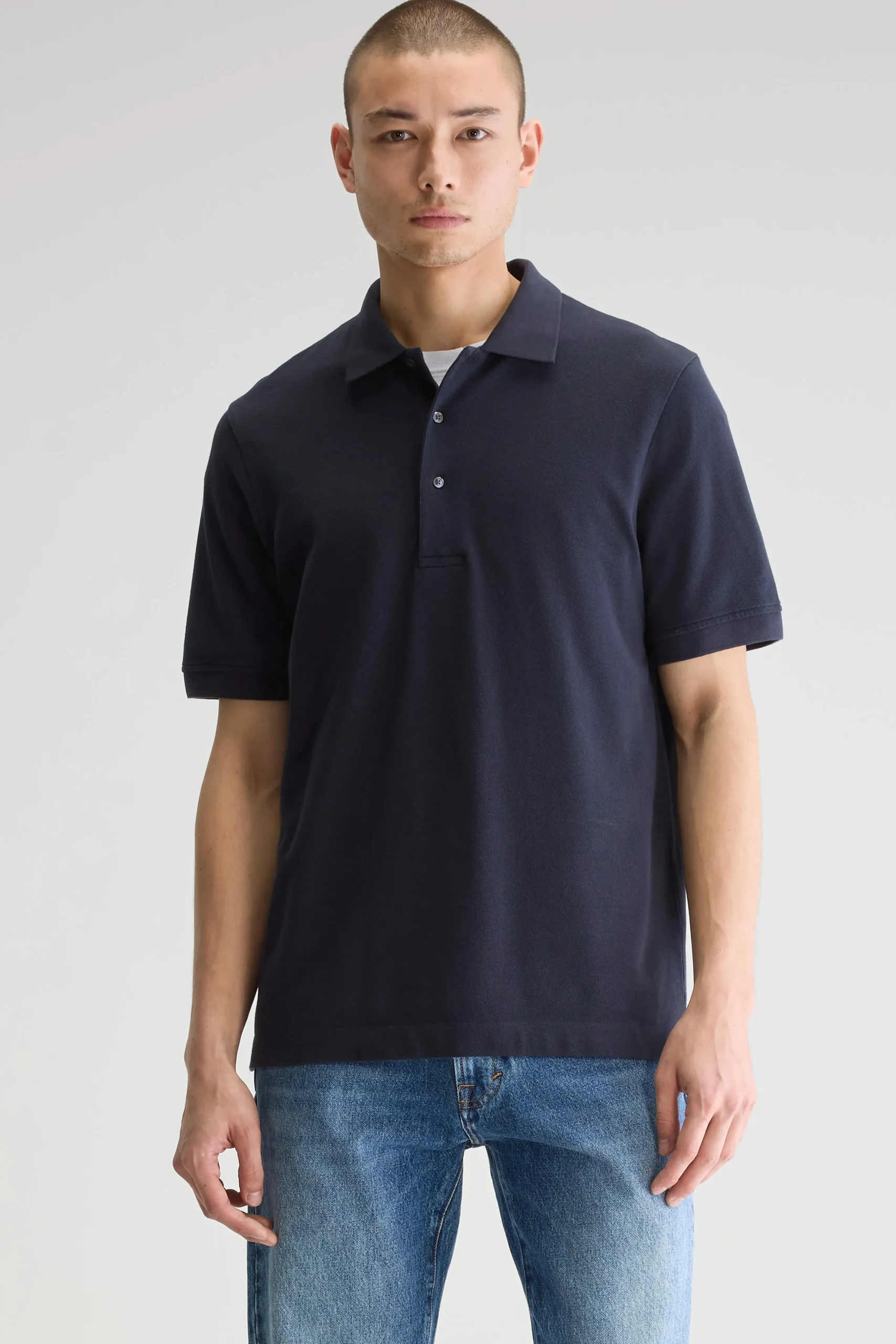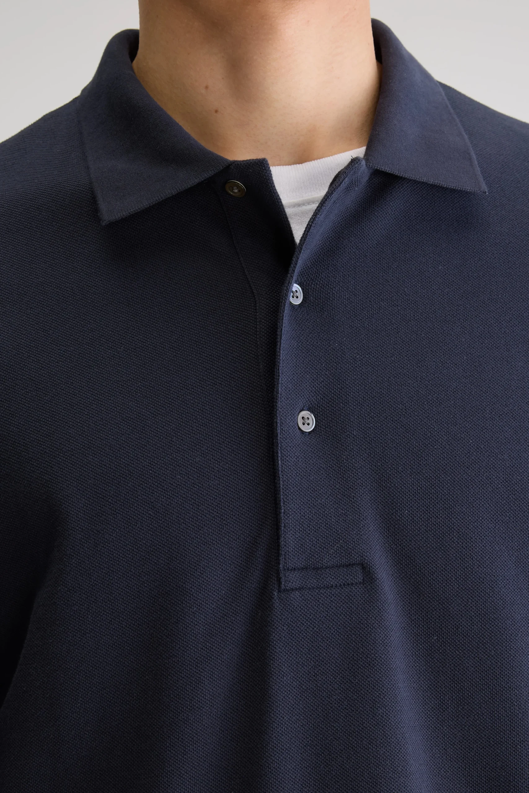 Losse polo met geribde boorden en kraag met knoopsluiting, gemaakt van klassiek marineblauw piqué katoen.Losse pasvorm Geribde kraagKorte mouwen met geribde boordenPiqué katoen