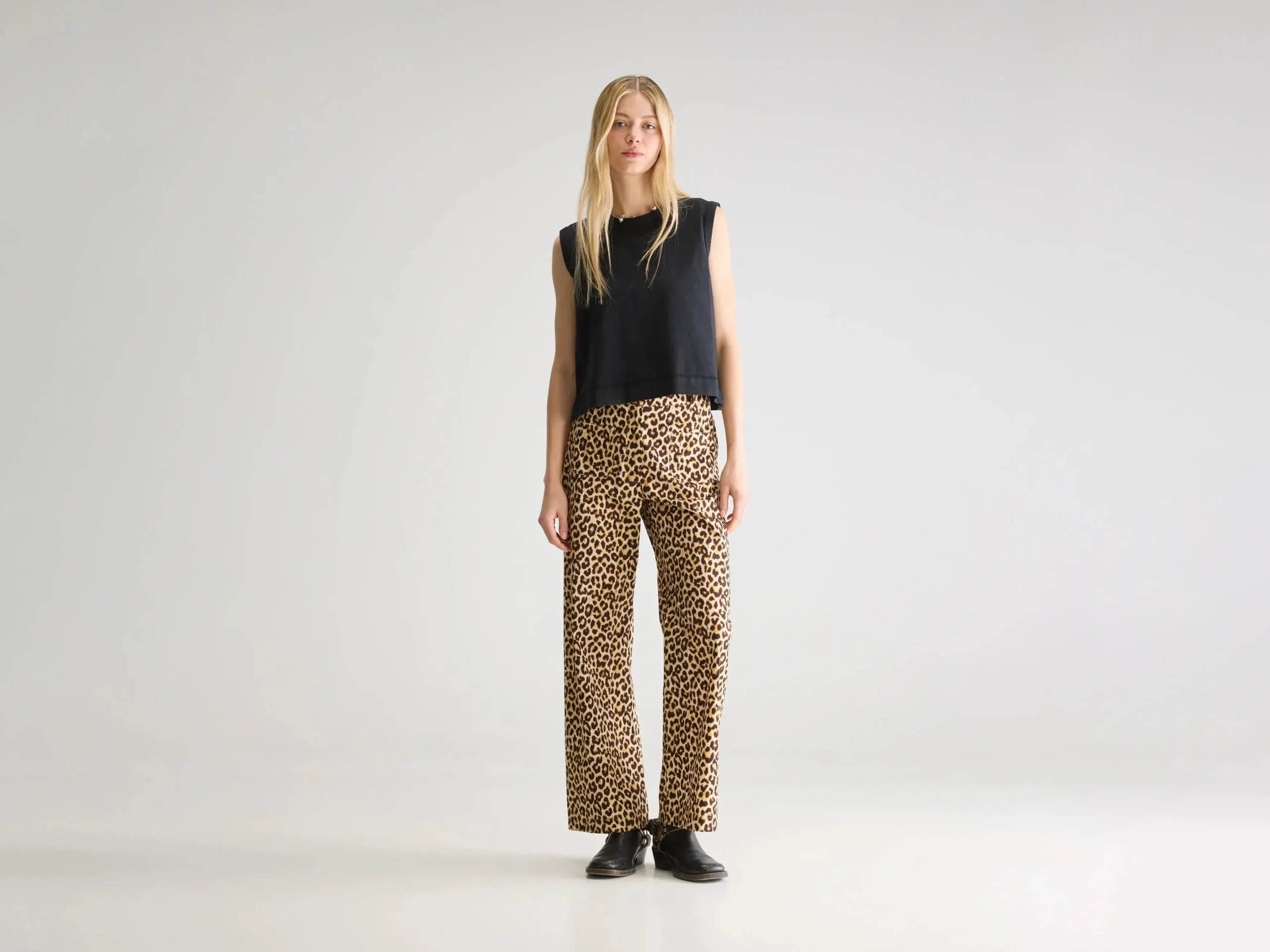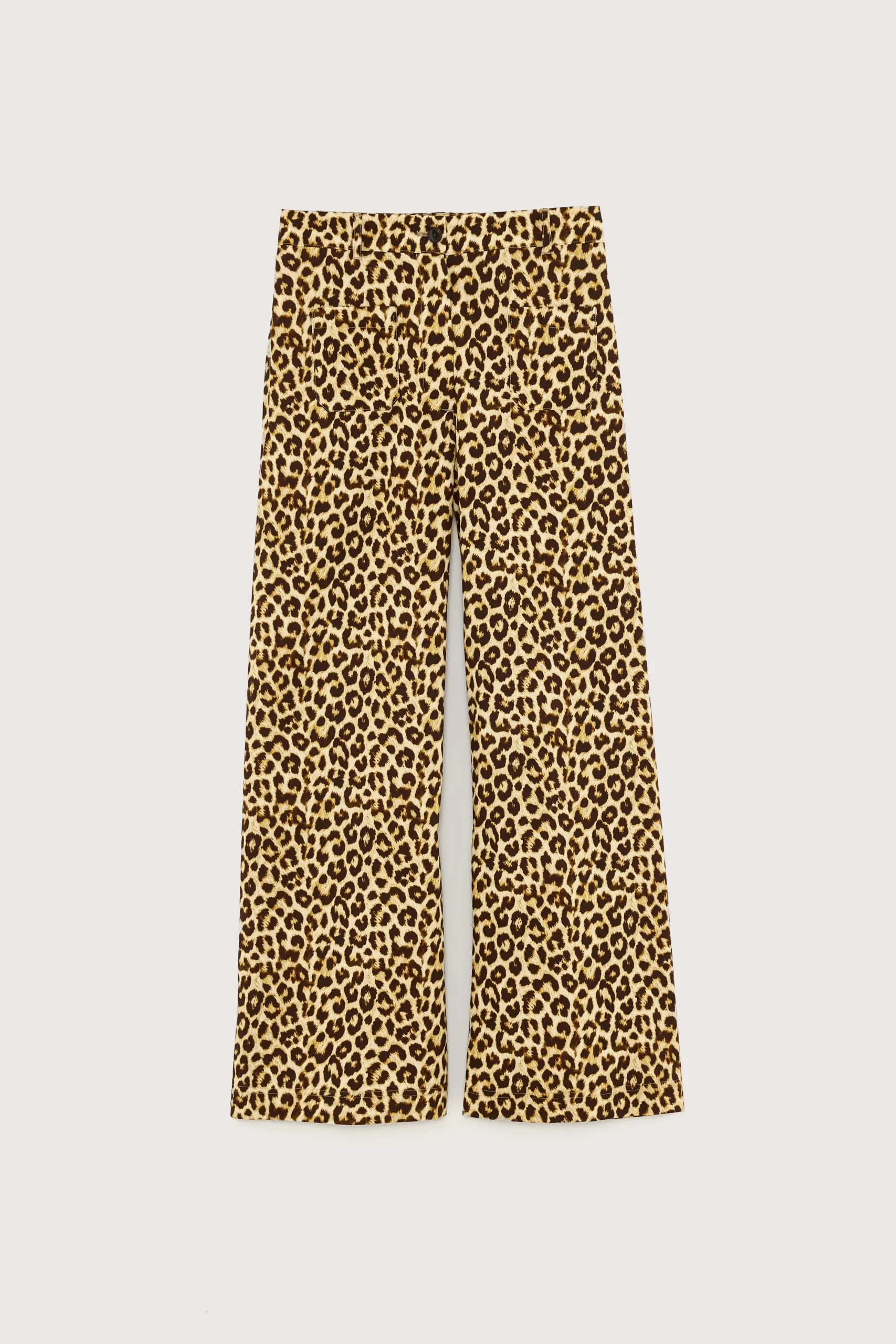 Broek met wijde pijpen, all-over luipaardprint, gepatchte voor- en achterzakken en riemlussen.Rechte pasvormWijde pijpenHoge taille LuipaardprintOpgezette voor- en achterzakkenKnoop- en ritssluitingBinnenbeenlengte: 30″(gebaseerd op maat 36)De binnenbeenlengte past zich lichtjes aan afhankelijk van de gekozen maat, zodat de pasvorm proportioneel blijft.