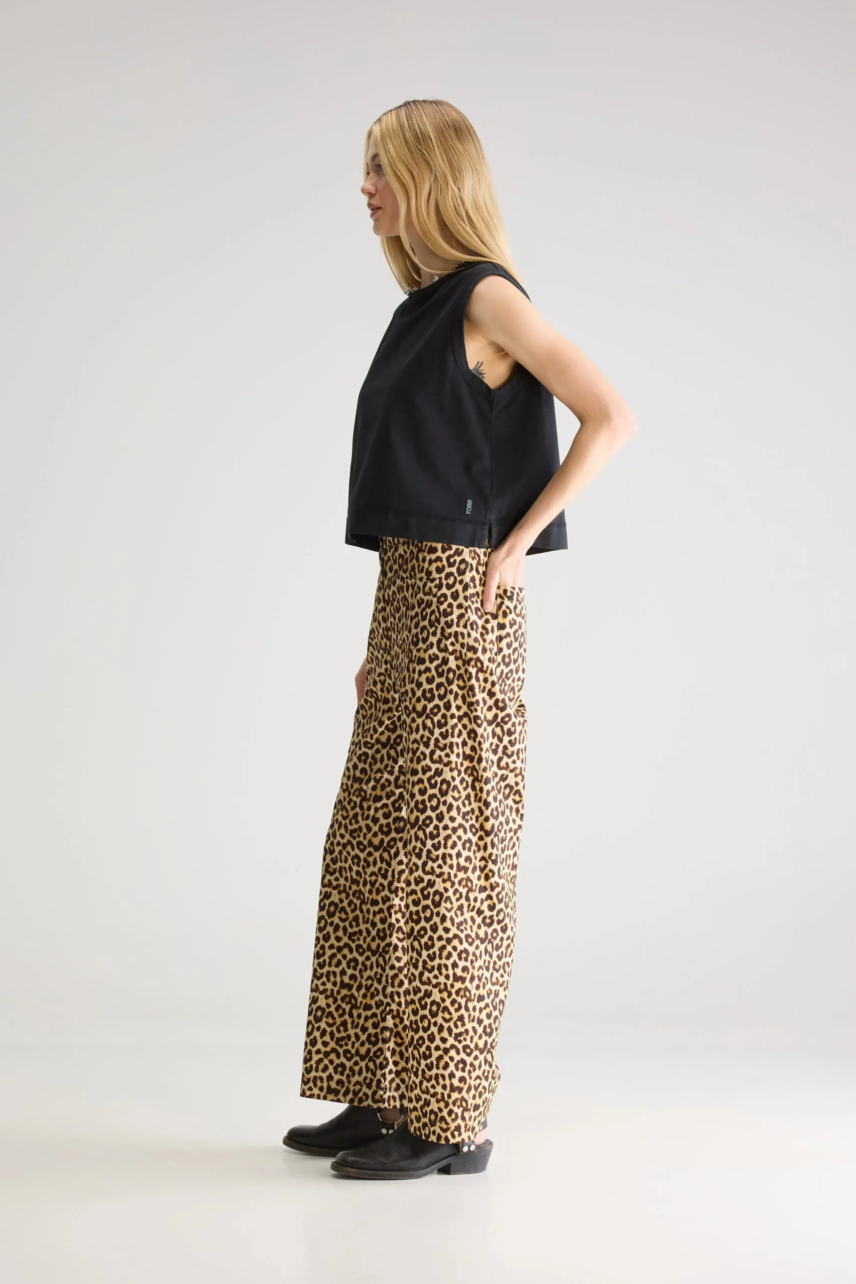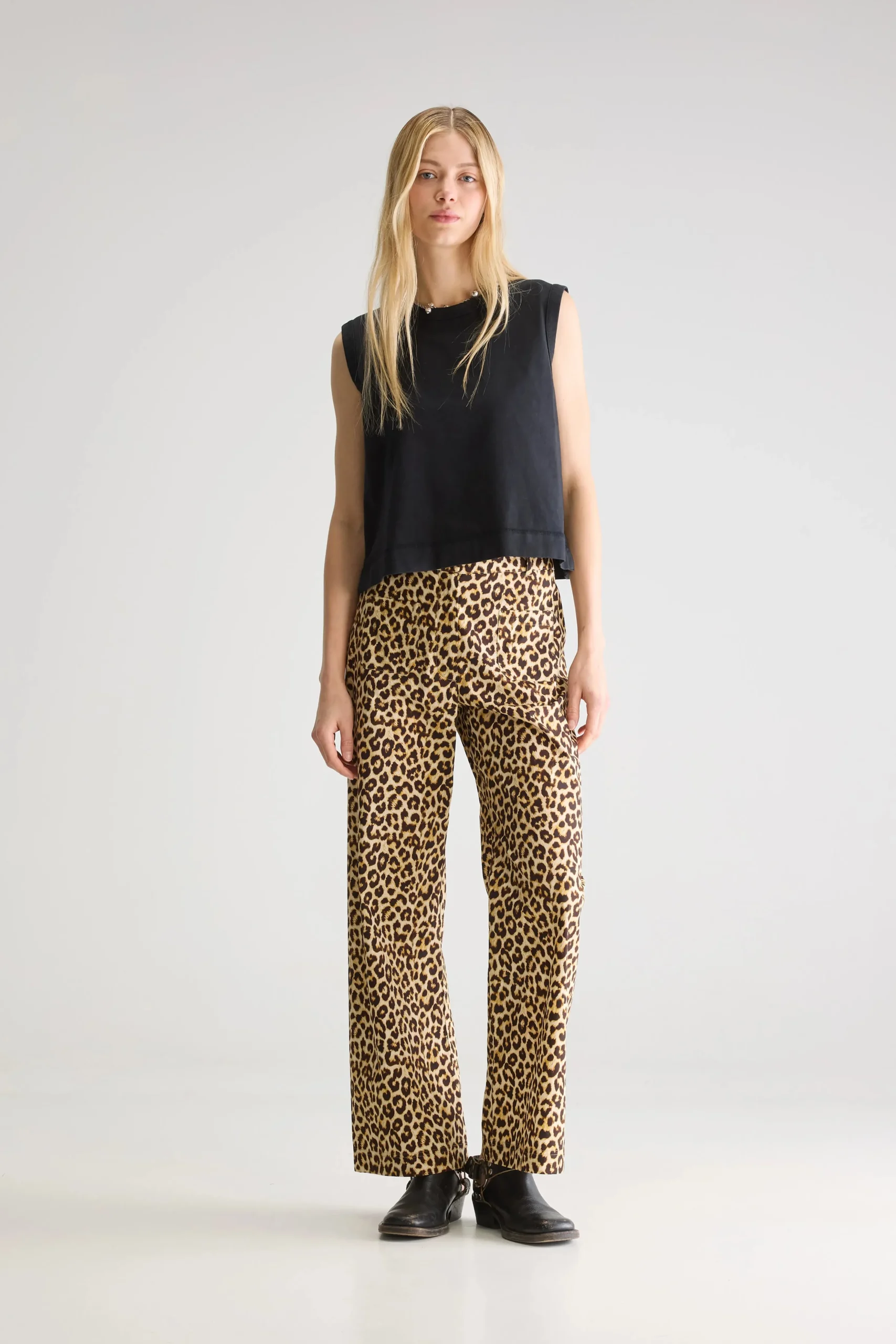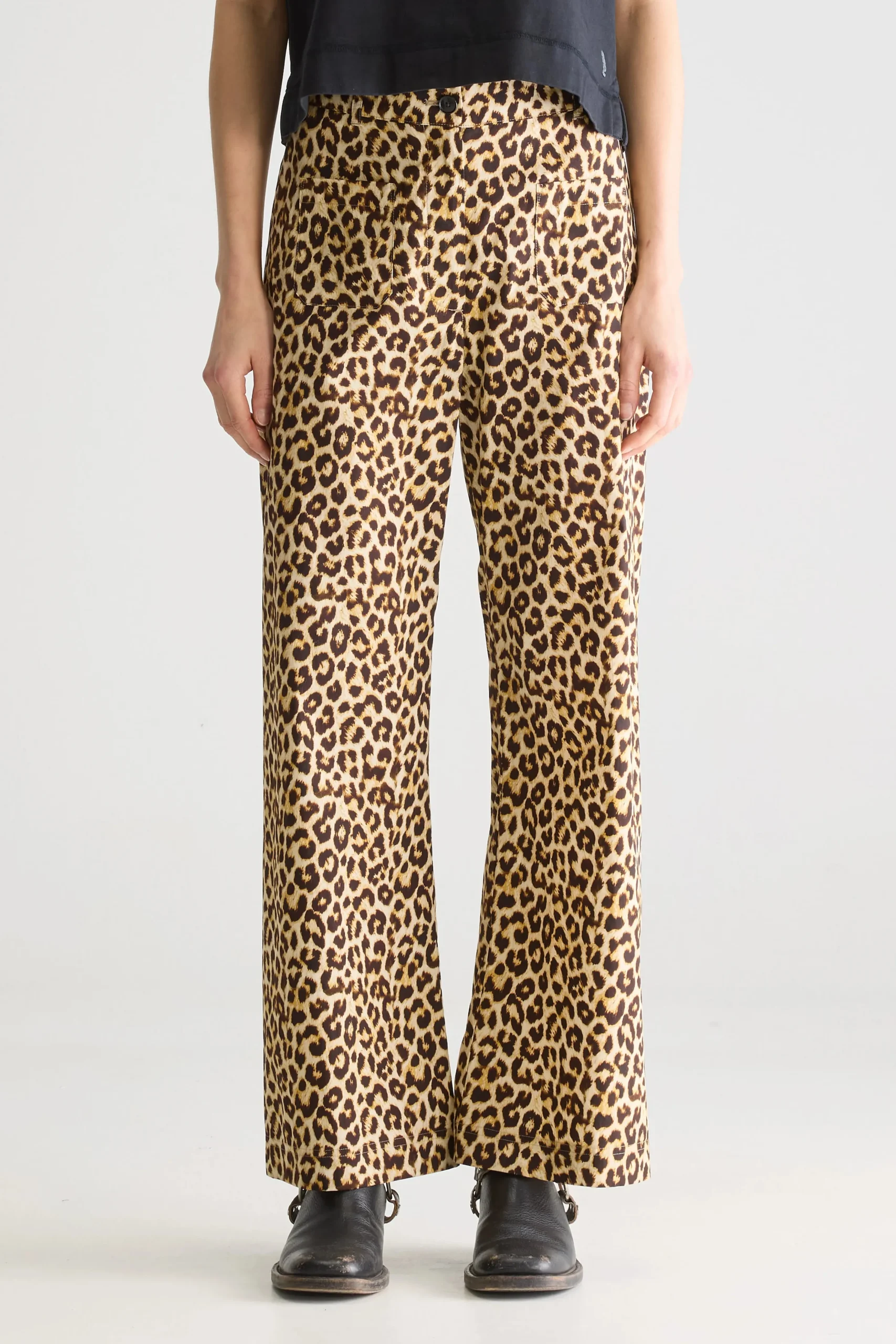 rBroek met wijde pijpen, all-over luipaardprint, gepatchte voor- en achterzakken en riemlussen.Rechte pasvormWijde pijp…