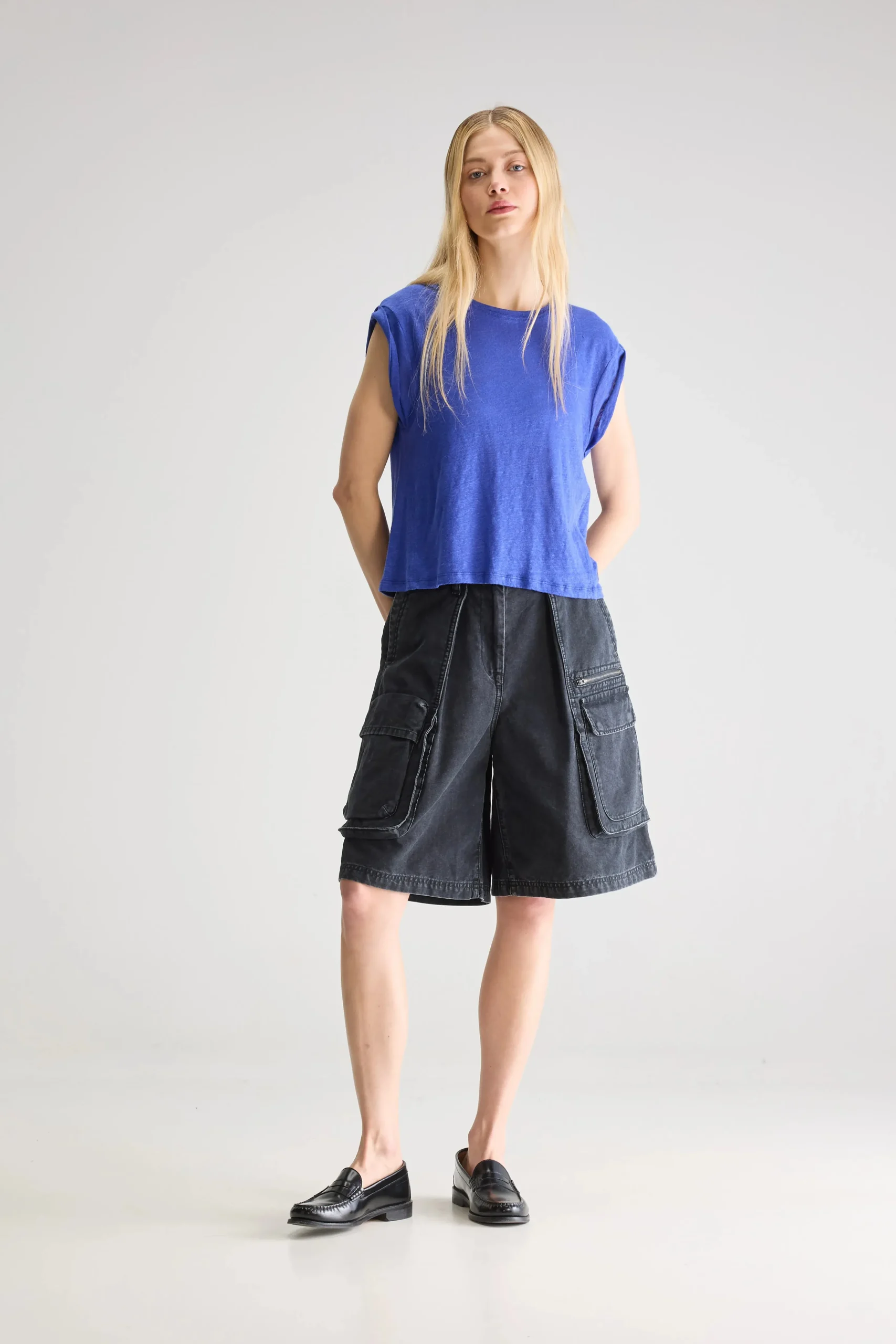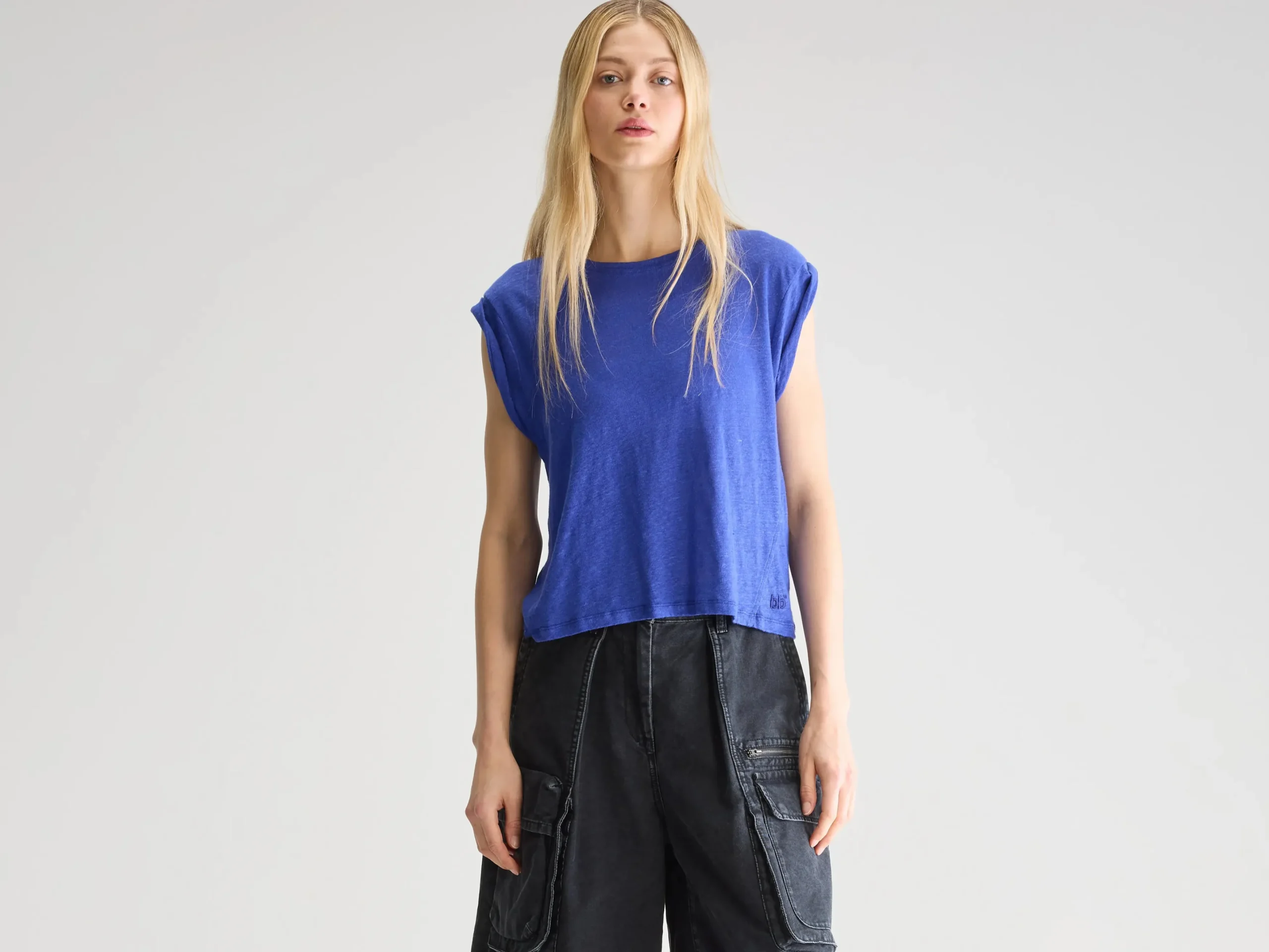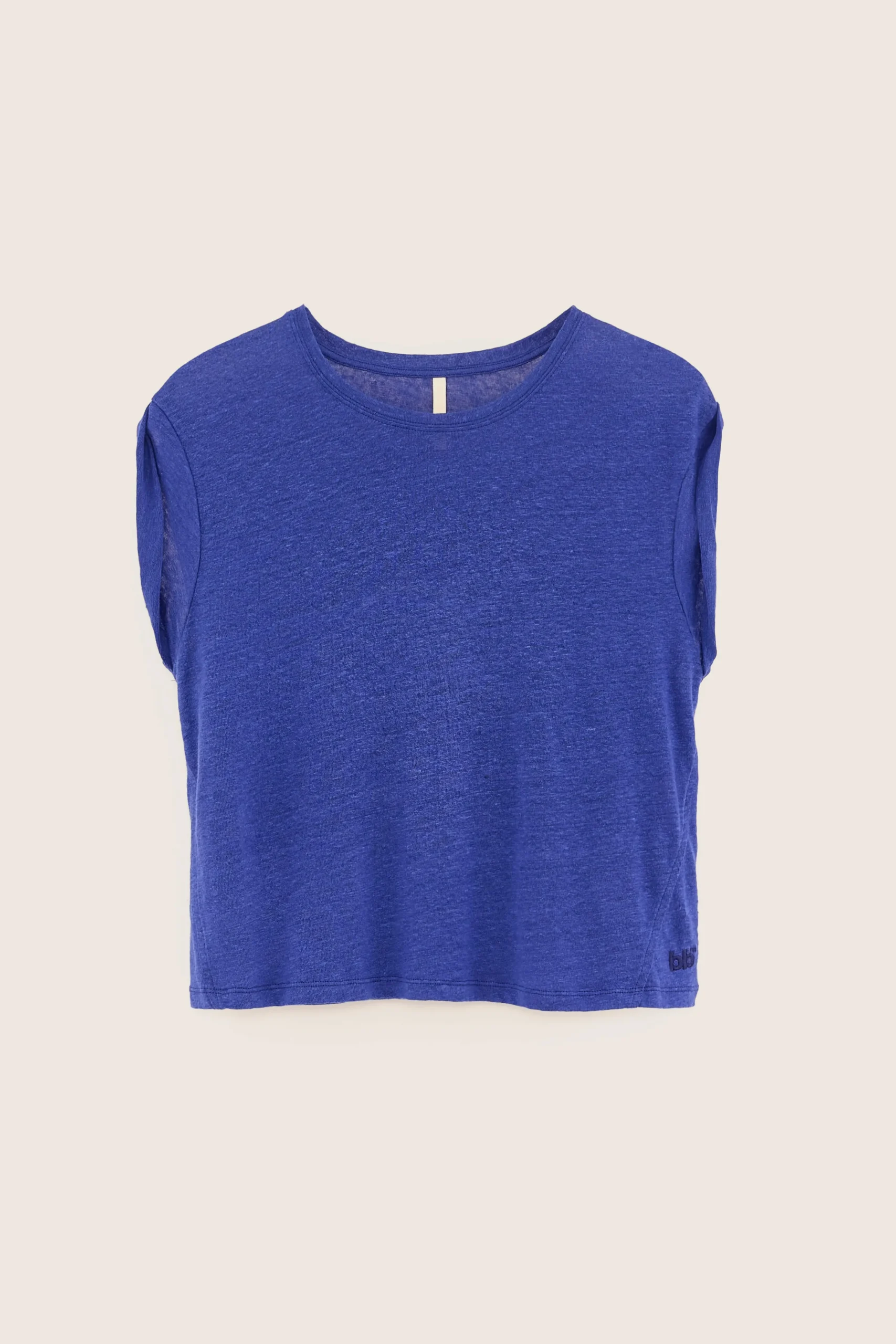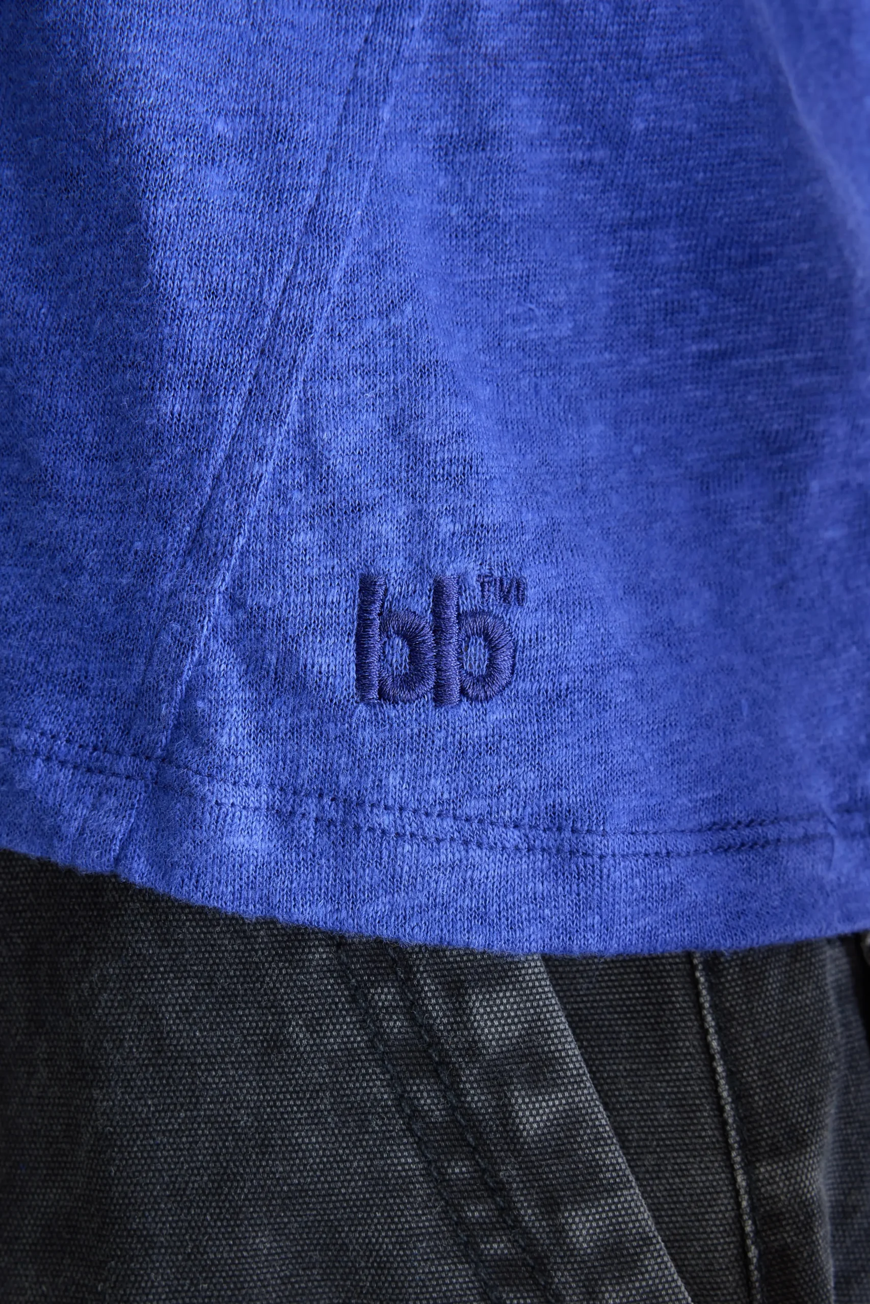 Klassiek T-shirt met ronde hals, omgeslagen schouders en schuine zijnaden, gemaakt van middelzwaar, blauw katoenjersey in worker-stijl. Klassieke pasvorm Ronde hals Omgeslagen schouders Schuine zijnaden”bb”-borduursel op de voorkantLicht katoenjersey