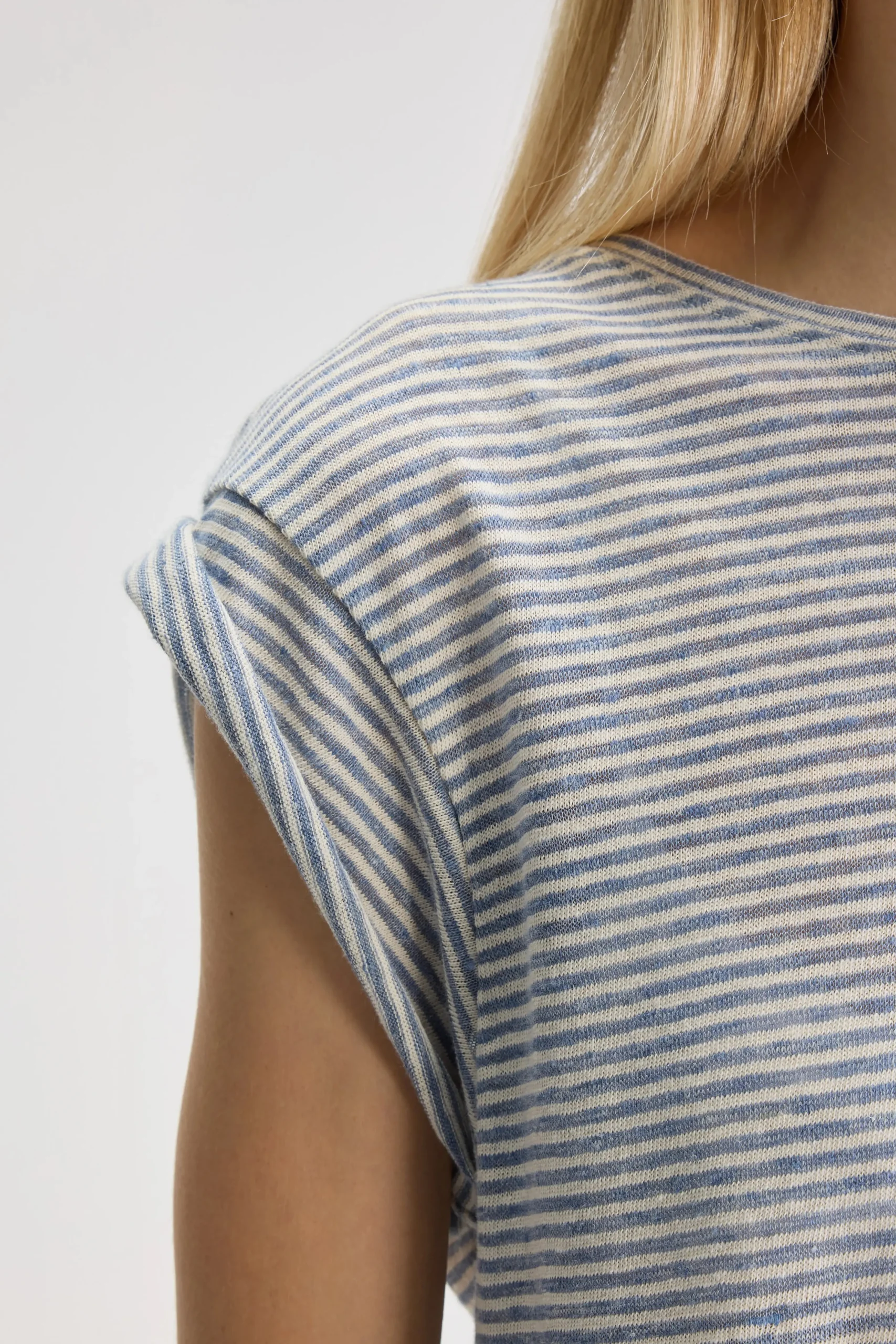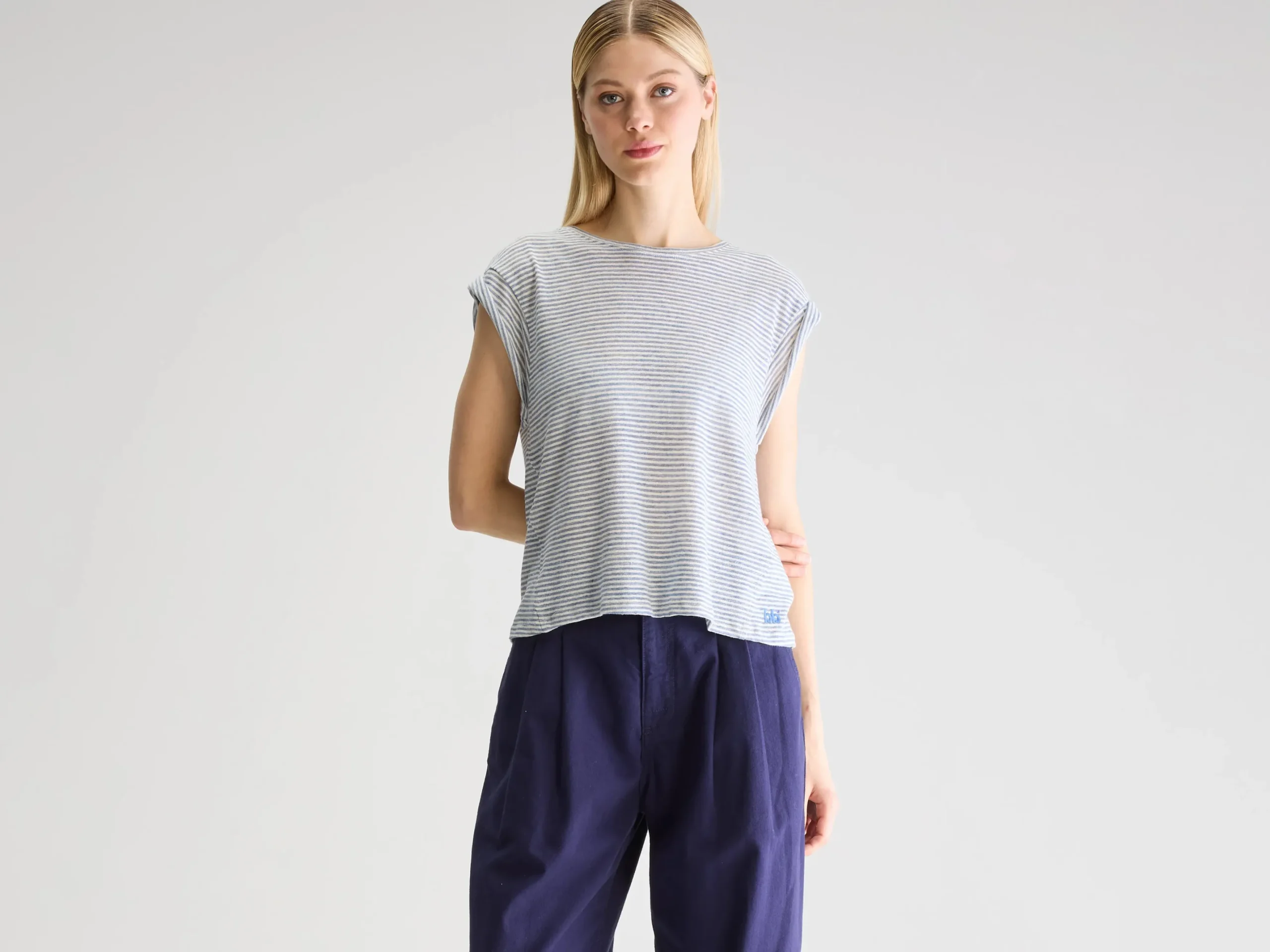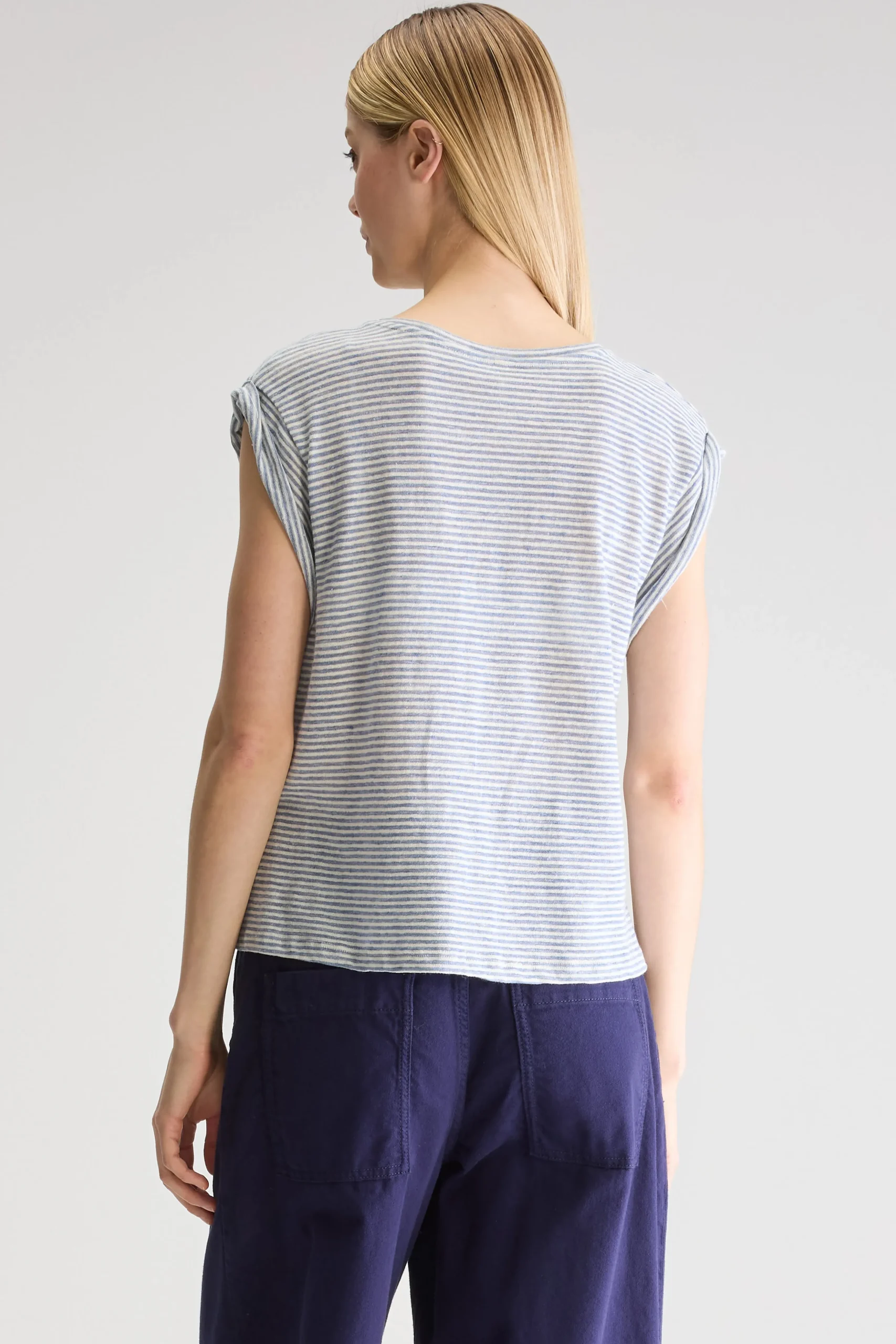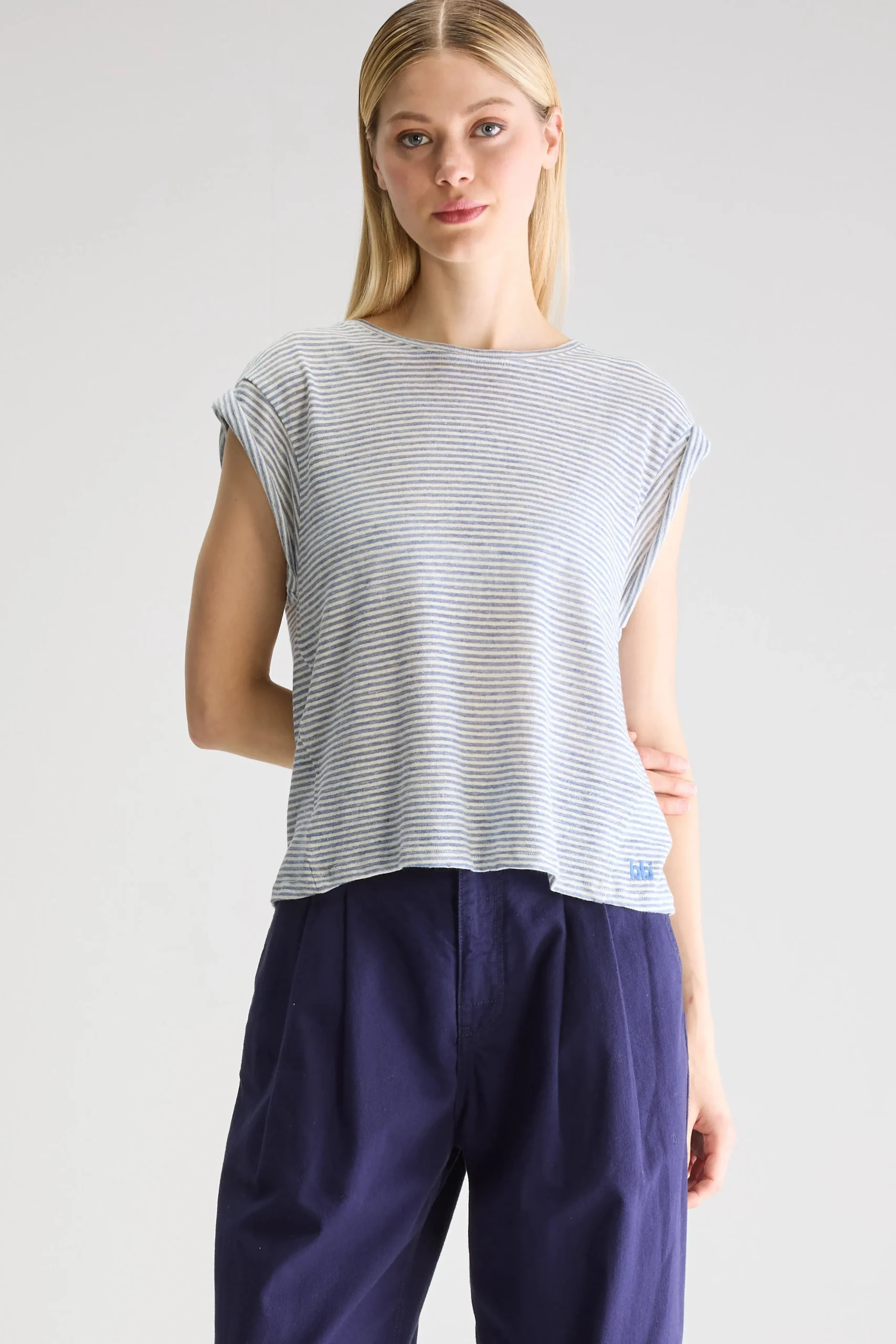 Klassiek T-shirt met ronde hals, omgeslagen schouders en schuine zijnaden, gemaakt van licht katoenjersey met blauwe en …