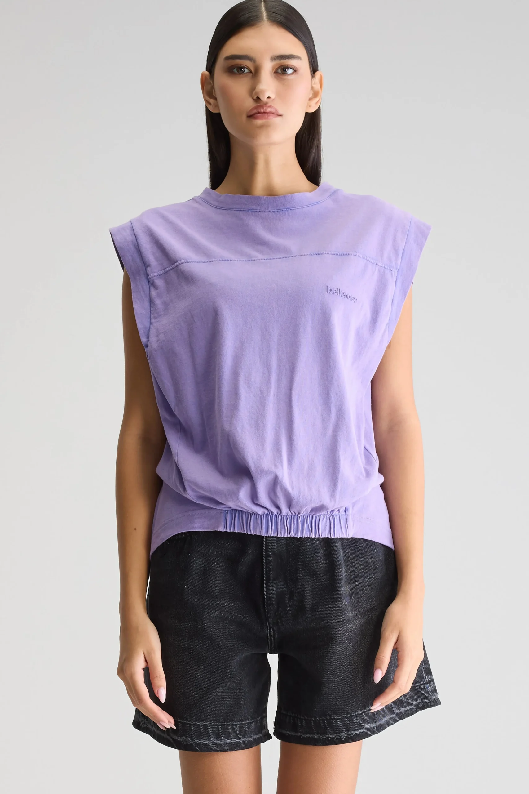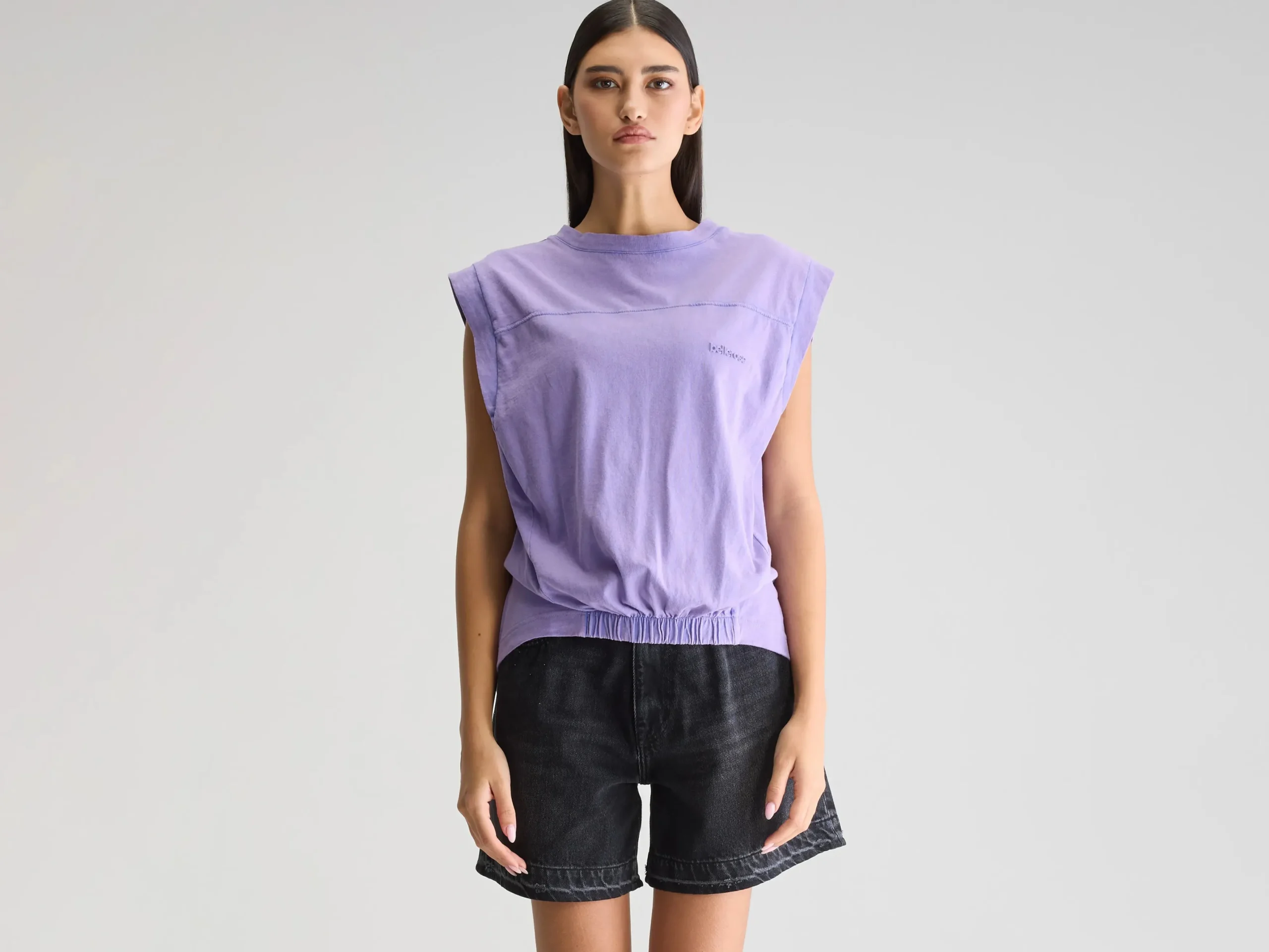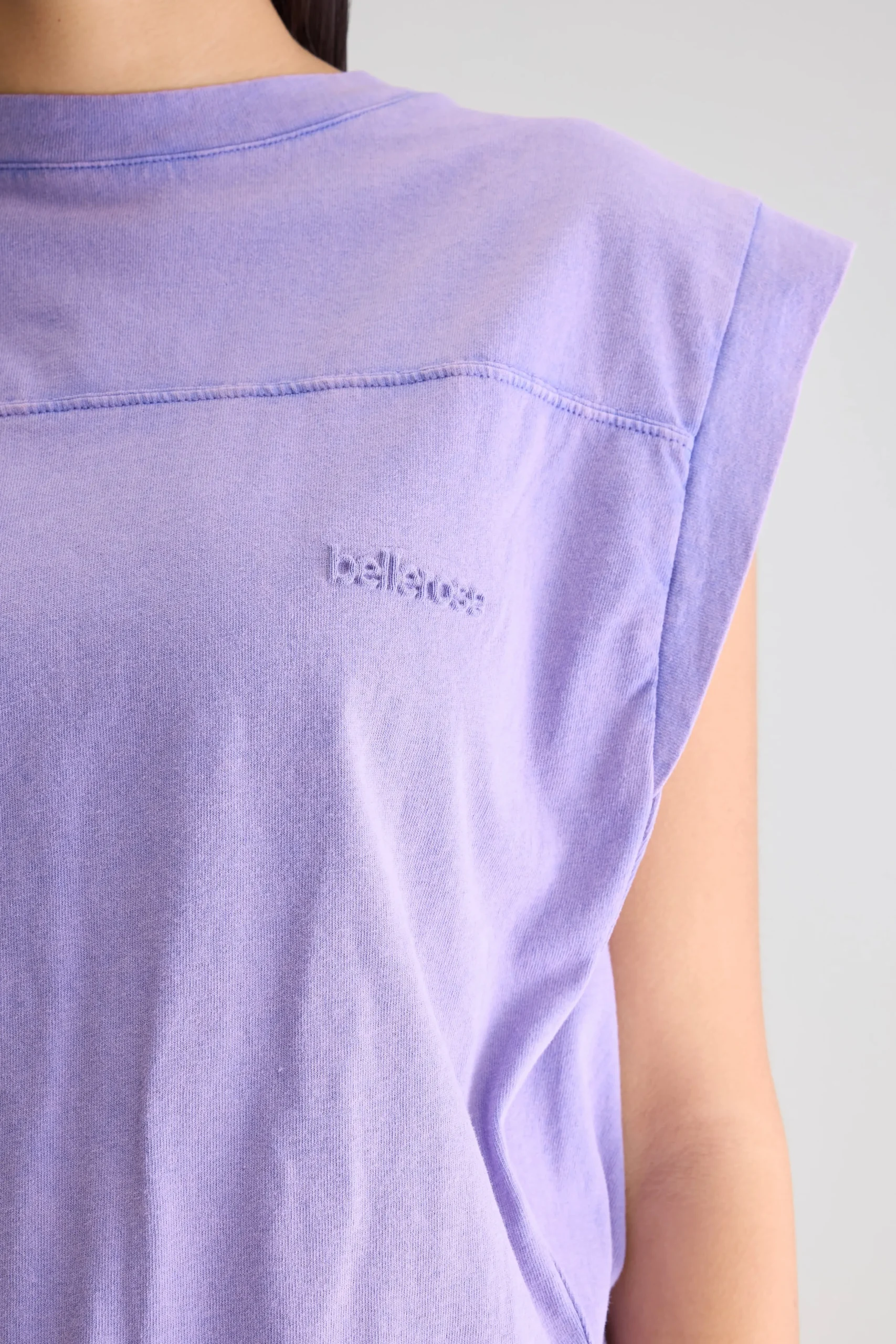 Klassiek, mouwloos T-shirt met ronde hals, recht juk, omgeslagen schouders en halfelastische zoom, gemaakt van middelzwaar, iristint katoenjersey. Klassieke pasvorm Ronde halsOmgeslagen schouders Recht juk Halfelastische zoom met plooien aan de voorkant”Bellerose”-reliëfopdrukMiddelzwaar katoenjersey