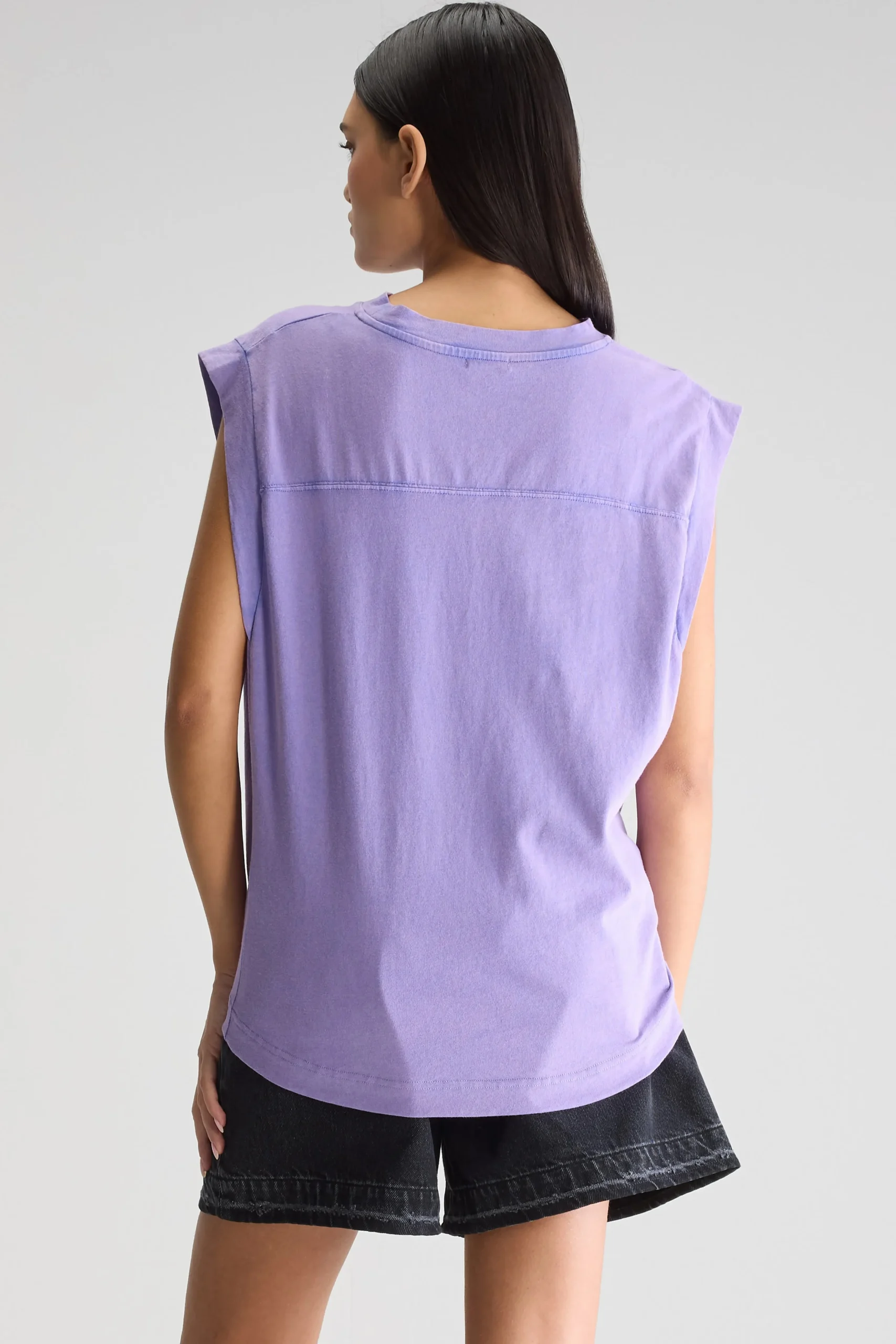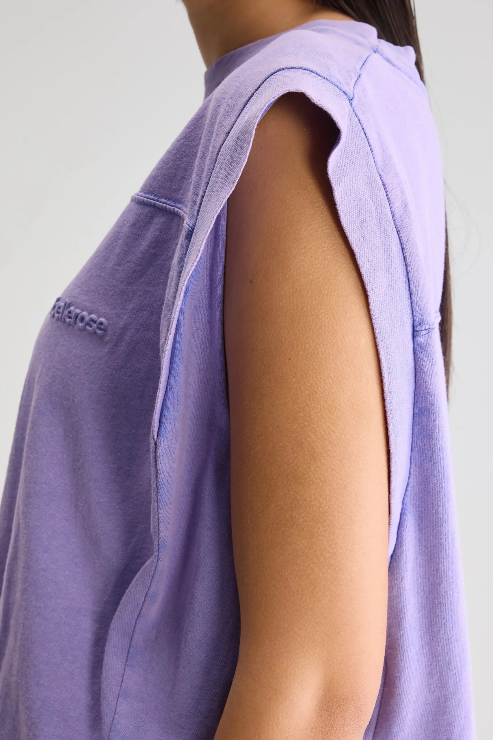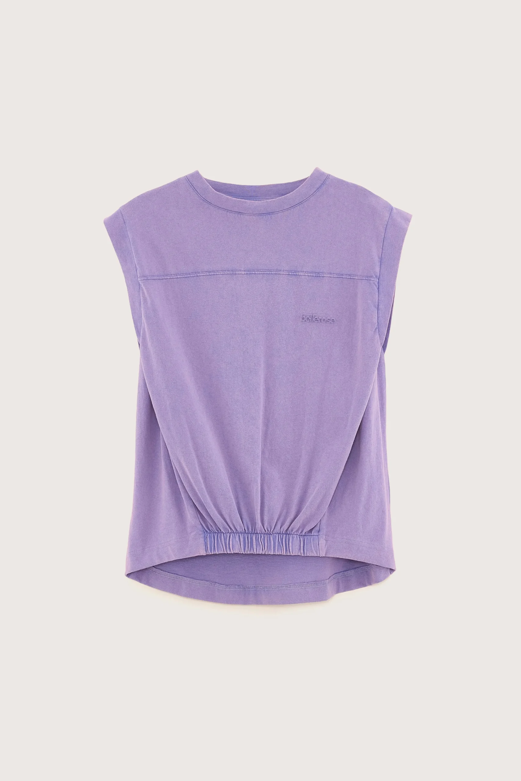 Klassiek, mouwloos T-shirt met ronde hals, recht juk, omgeslagen schouders en halfelastische zoom, gemaakt van middelzwaar, iristint katoenjersey. Klassieke pasvorm Ronde halsOmgeslagen schouders Recht juk Halfelastische zoom met plooien aan de voorkant”Bellerose”-reliëfopdrukMiddelzwaar katoenjersey
