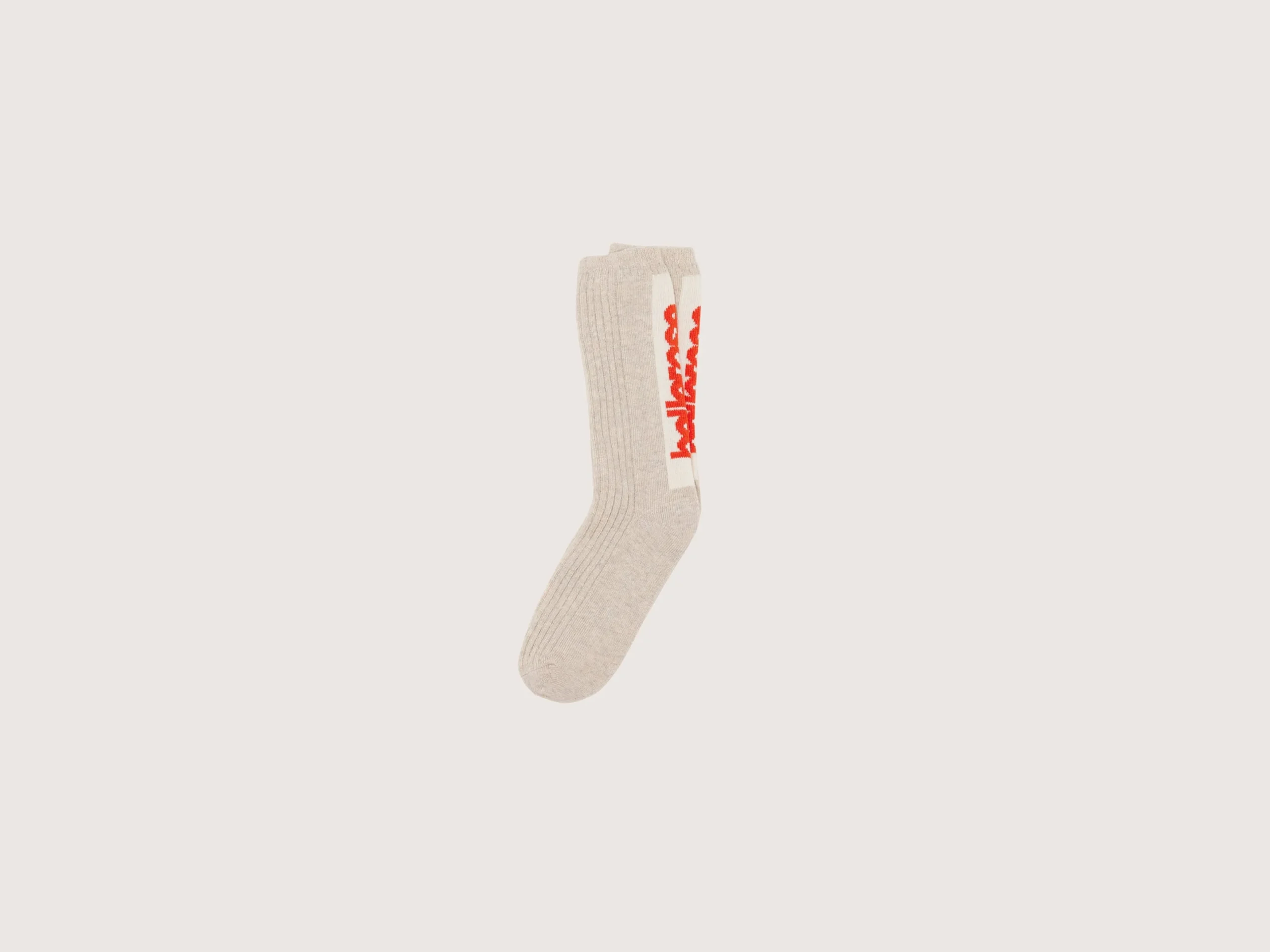 Heidebeige crew sokken van een ribgebreide katoenmix met contrasterend Bellerose logo op de hiel.Crew lengteRibtricot Be…