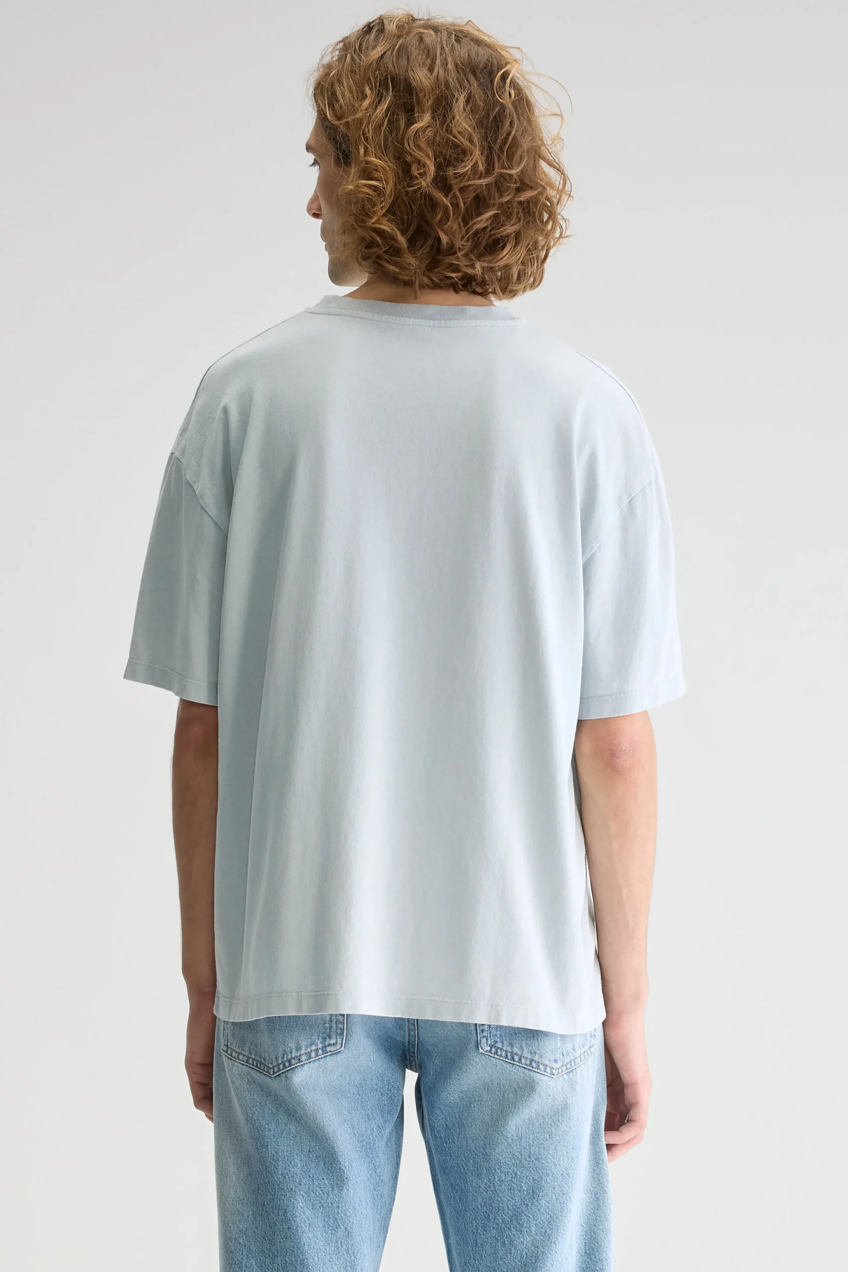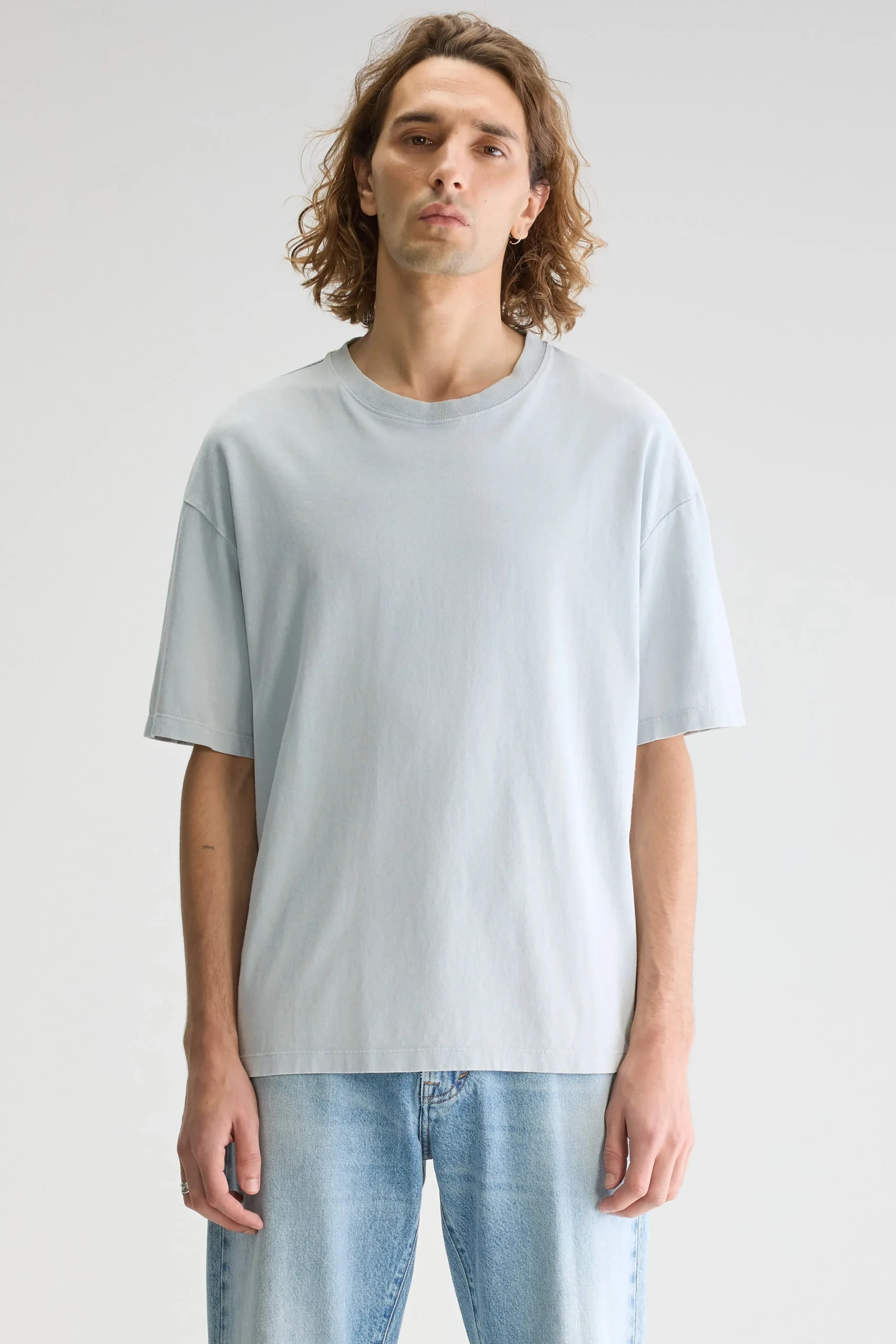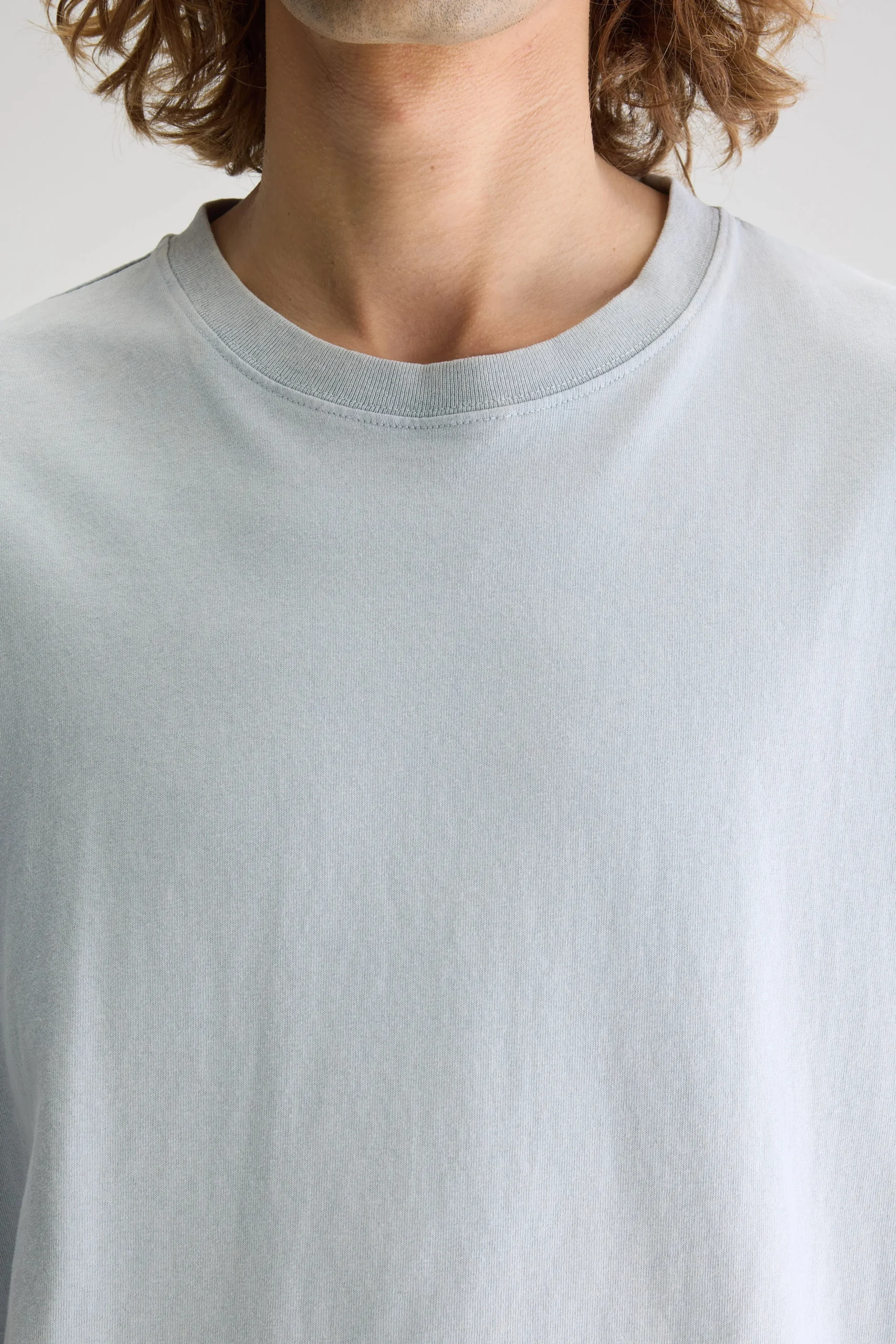 Los T-shirt met ronde hals en korte mouwen, gemaakt van middengewicht, rustiek, lichtblauw blauwgrijs katoenjersey.Losse pasvorm Geribde ronde hals Korte mouwen Rustiek, middengewicht jersey