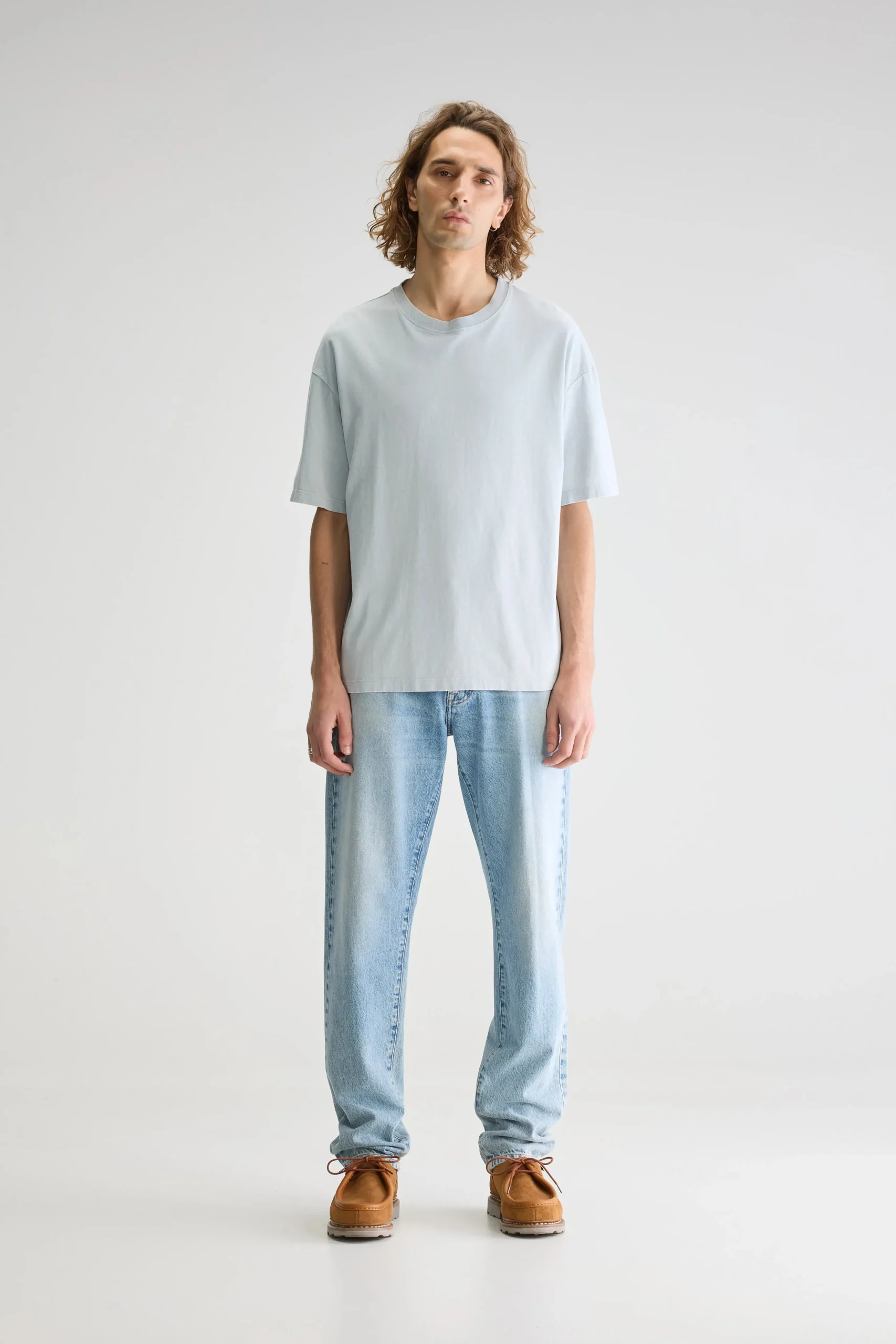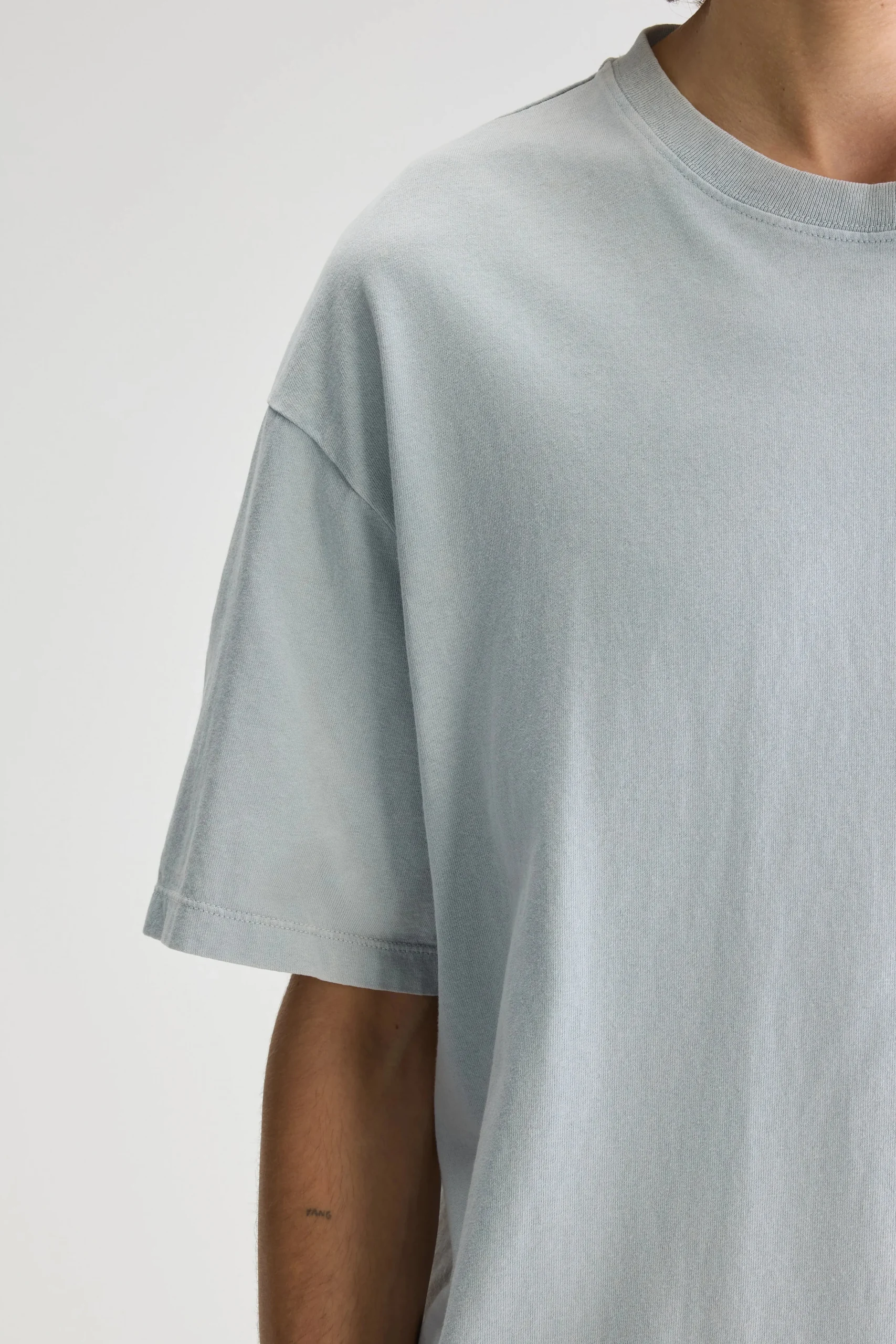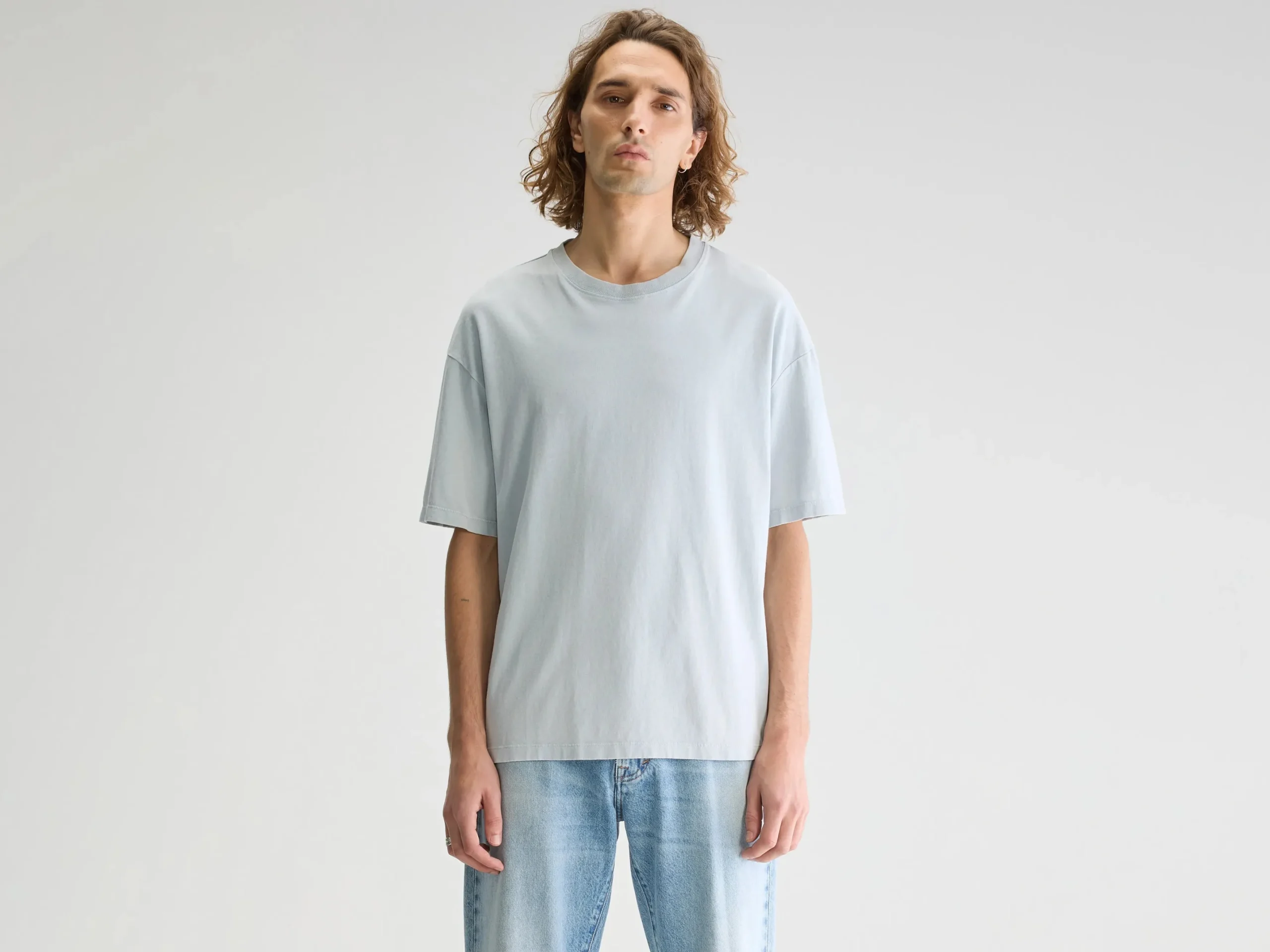 Los T-shirt met ronde hals en korte mouwen, gemaakt van middengewicht, rustiek, lichtblauw blauwgrijs katoenjersey.Losse pasvorm Geribde ronde hals Korte mouwen Rustiek, middengewicht jersey