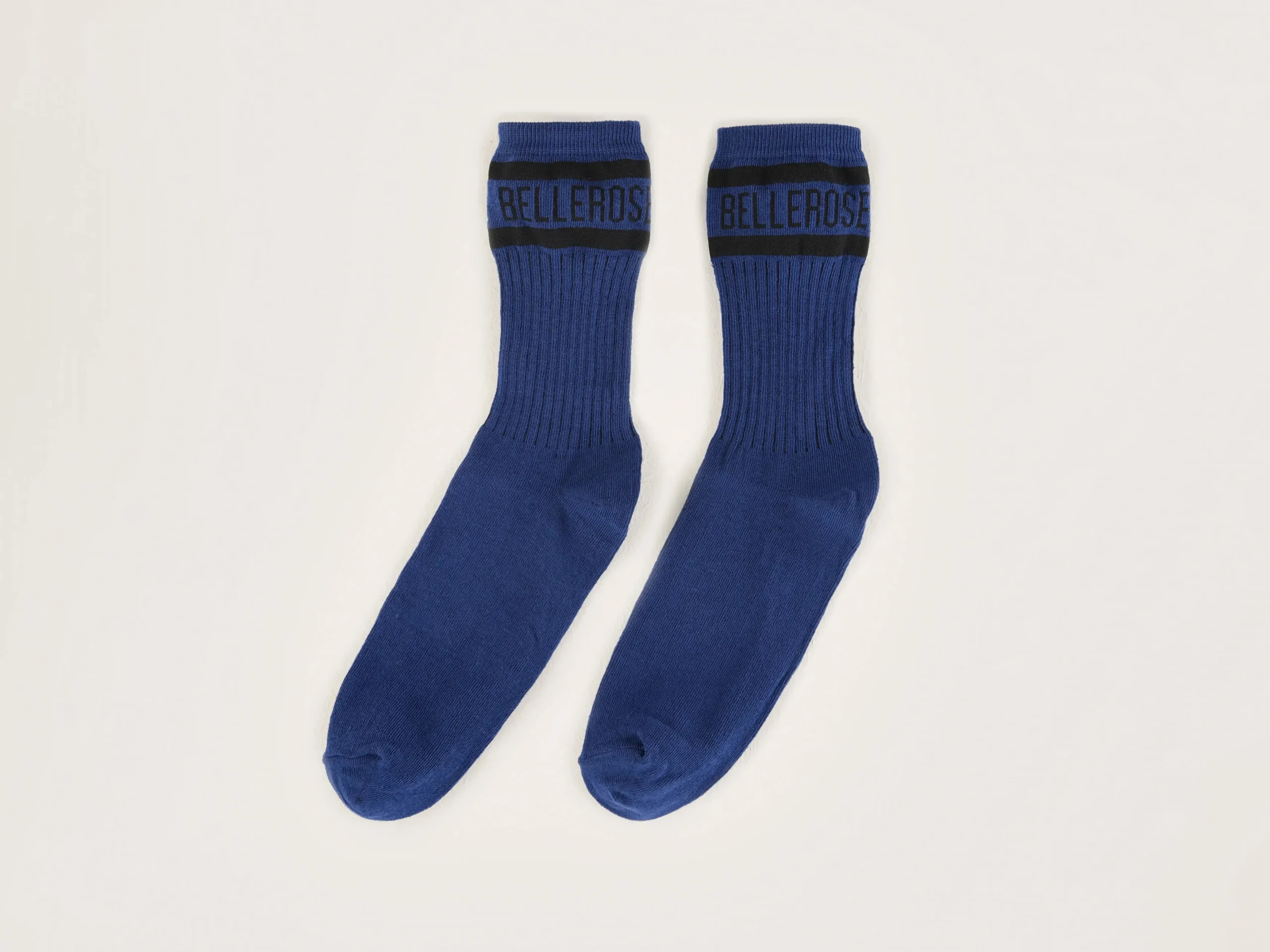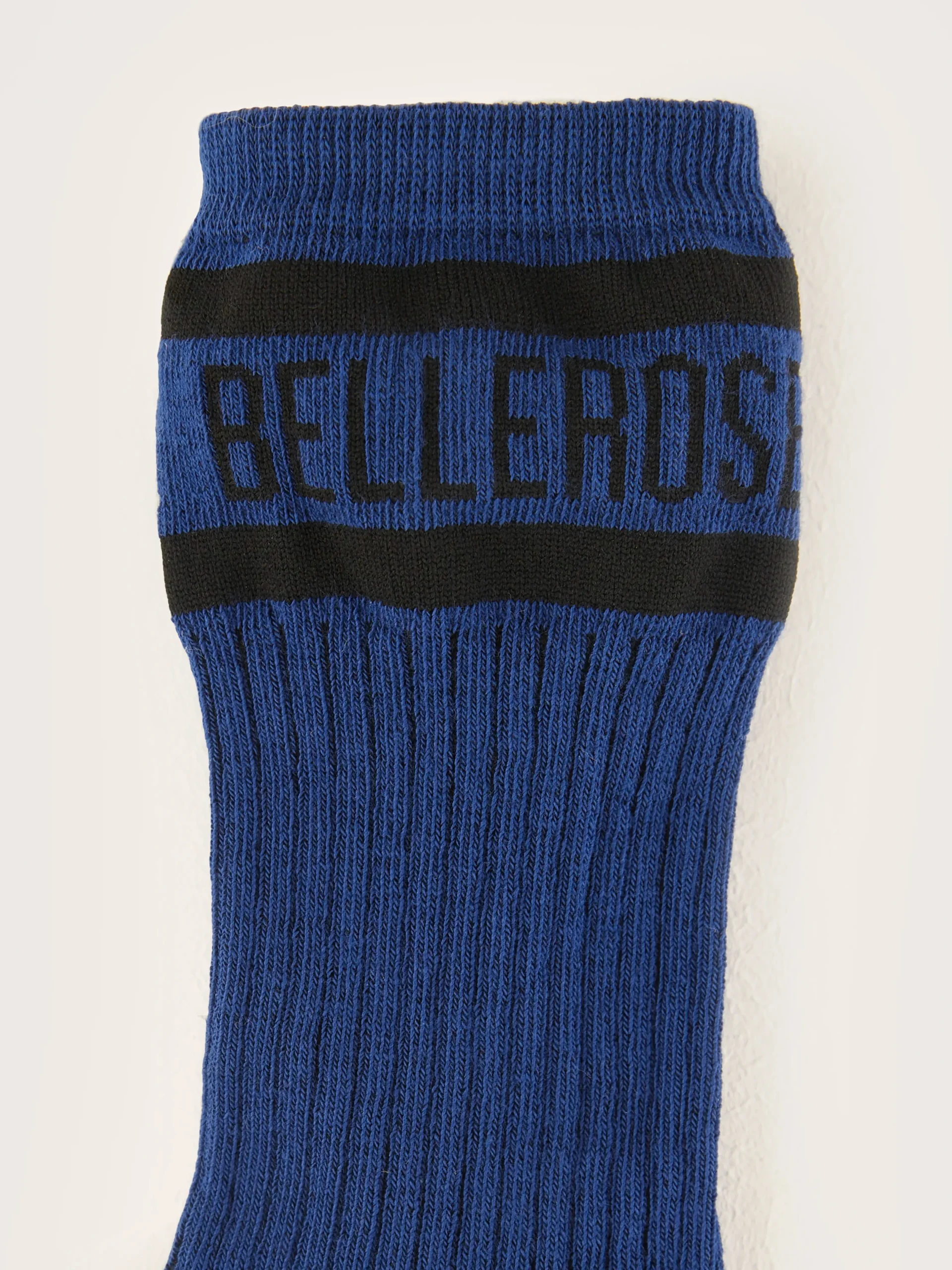 Klassieke sokken in blauw met het Bellerose-logo in zwart op de enkel.rKlassieke crew pasvormrGeribde enkelsrContrast…