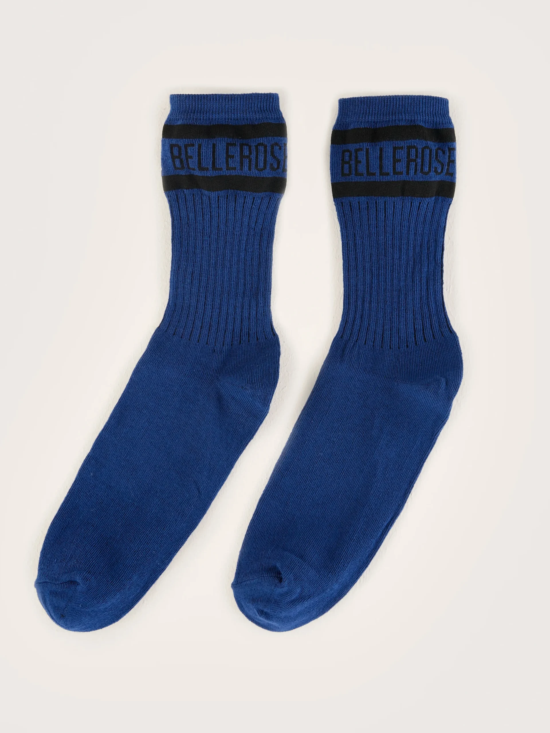 Klassieke sokken in blauw met het Bellerose-logo in zwart op de enkel.r