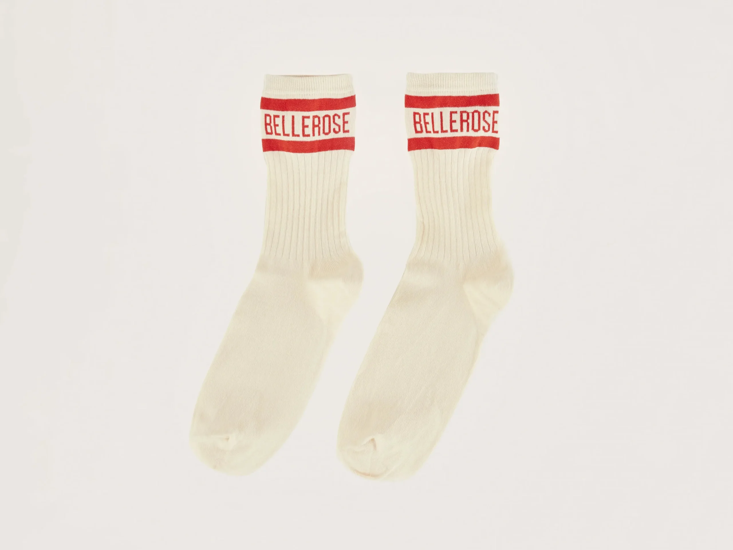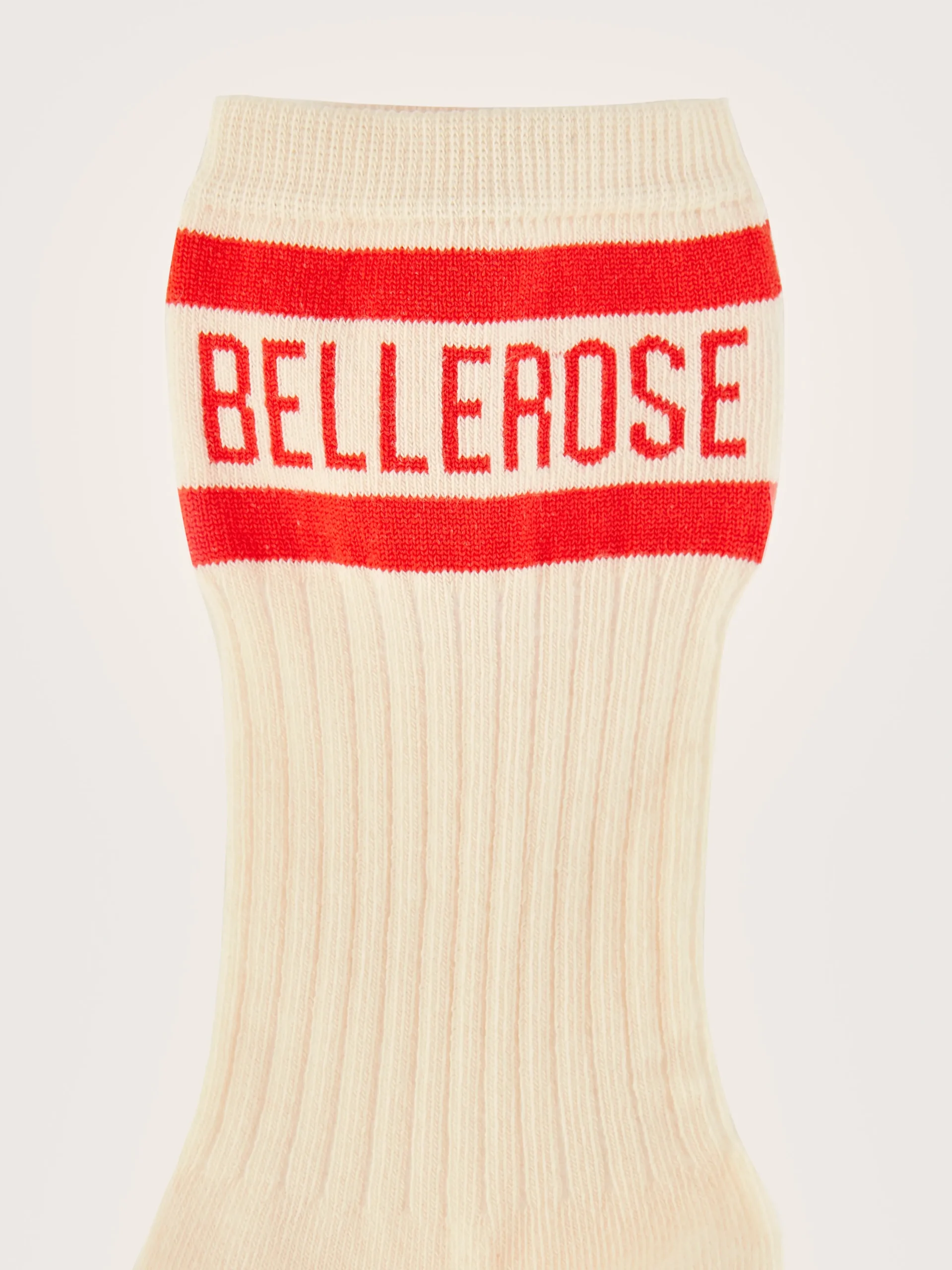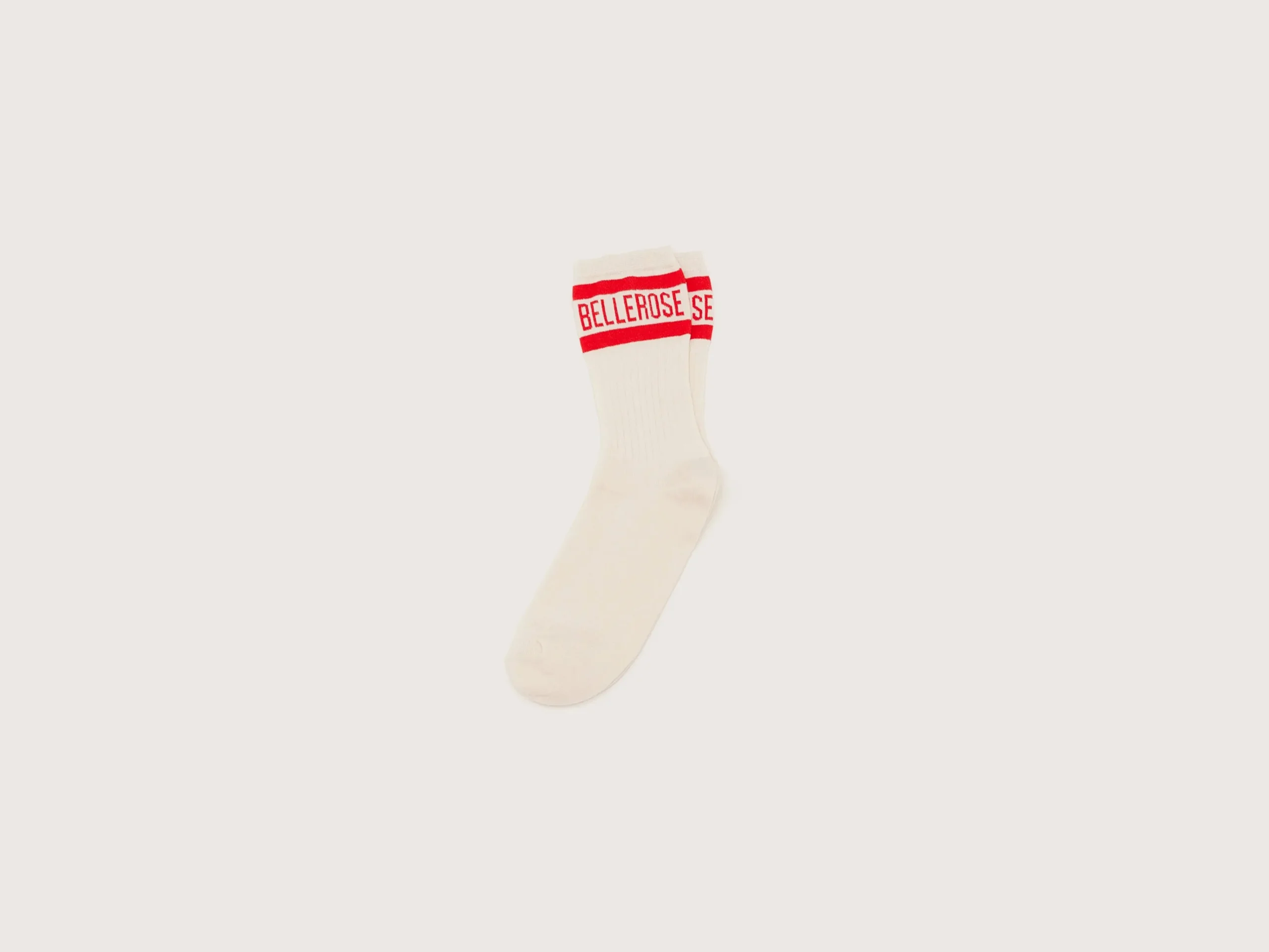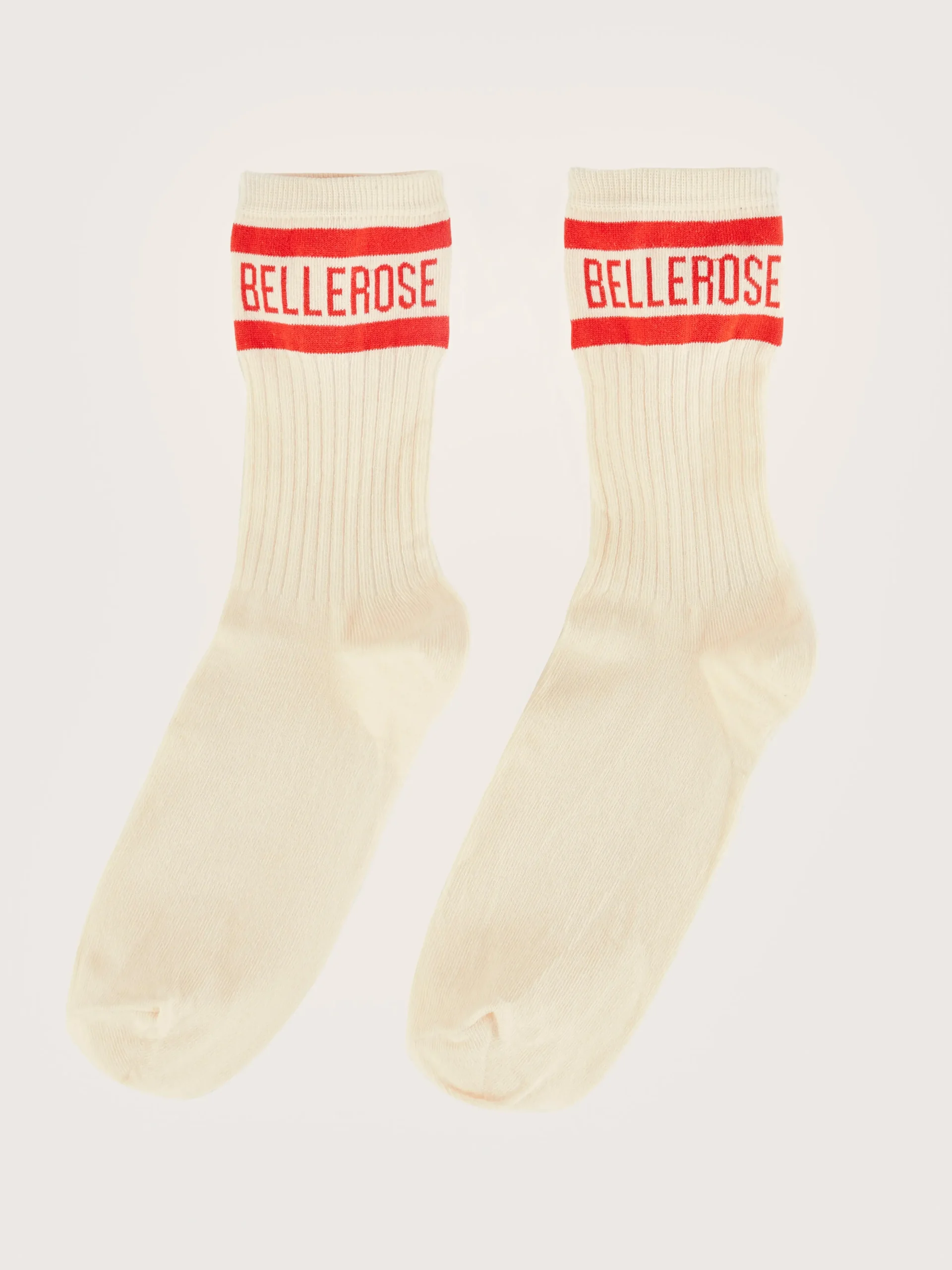Klassieke sokken in ecru met Bellerose-logo in rood op de enkel.rKlassieke crew pasvormrGeribde enkelsrContrasterend …