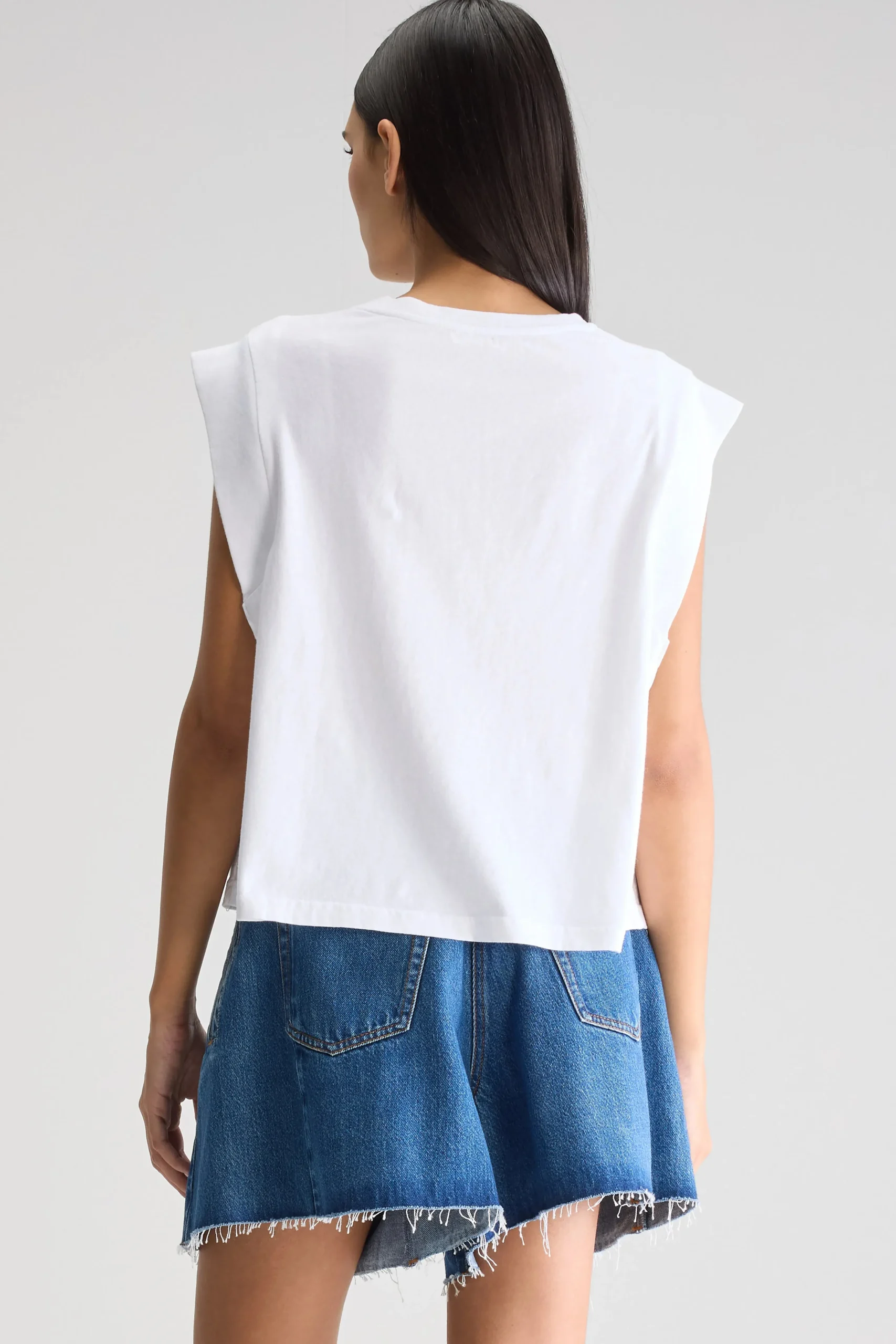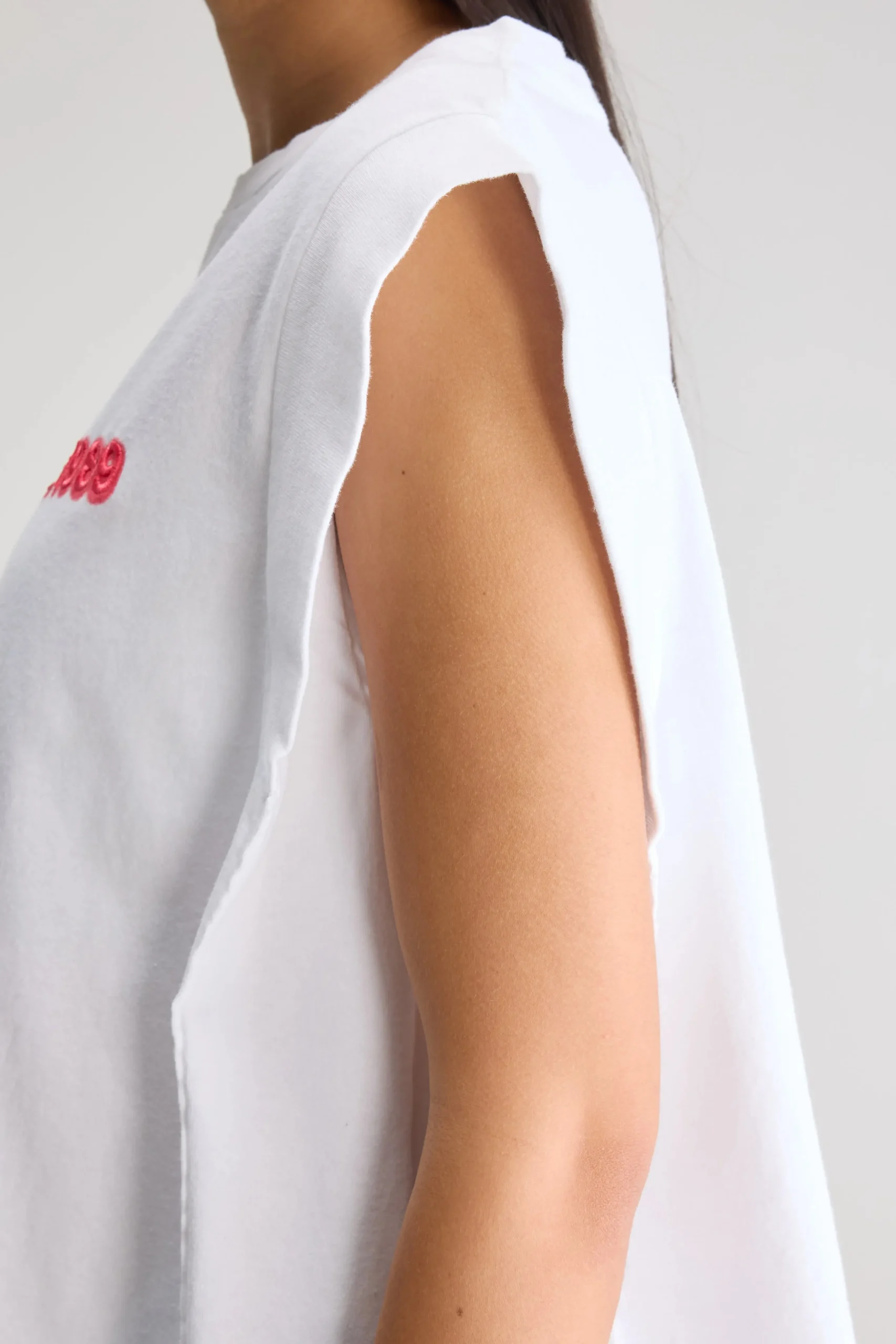 Klassiek, mouwloos T-shirt met geribde schouderranden en ronde hals, gemaakt van middelzwaar, wit katoenjersey. Klassiek…