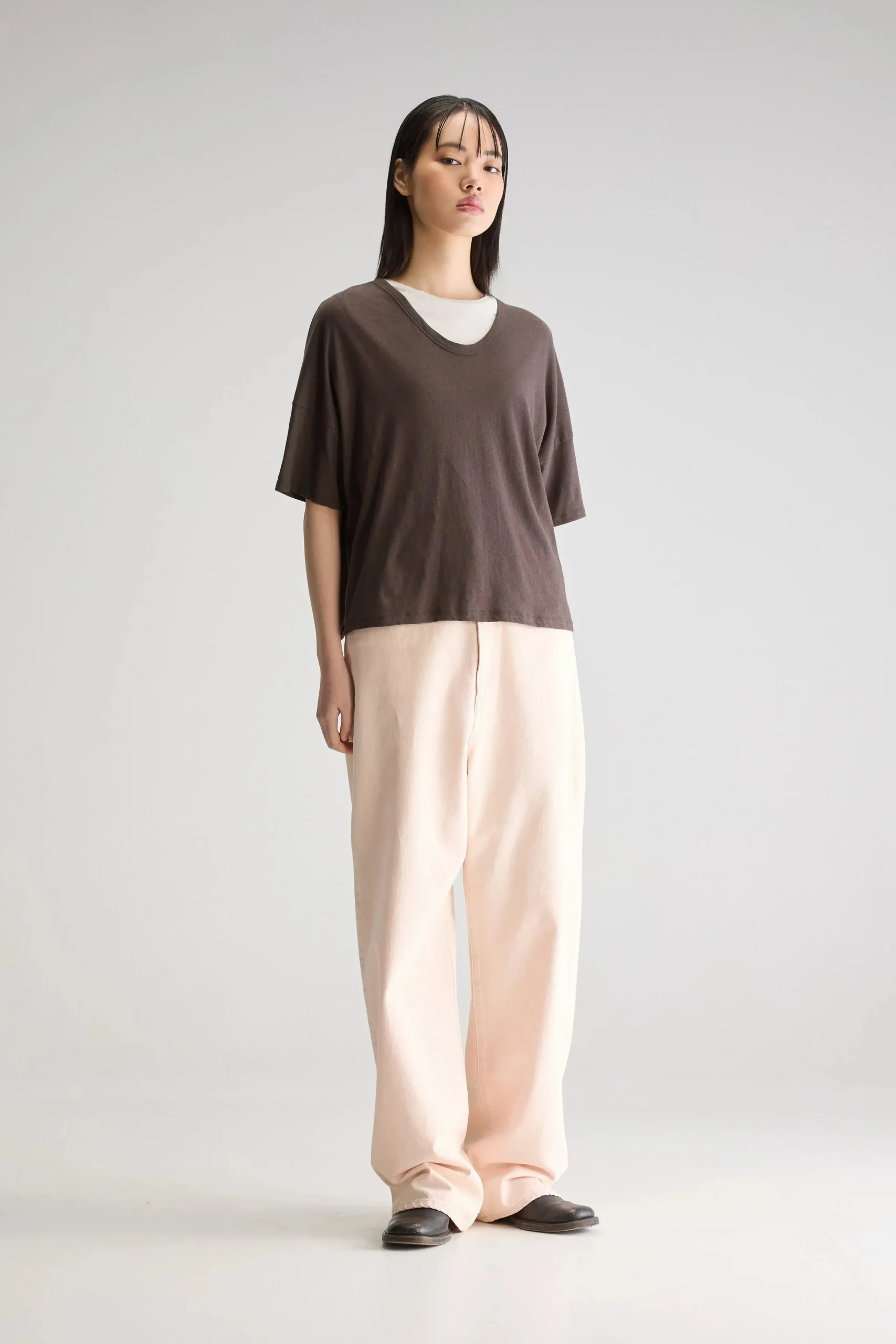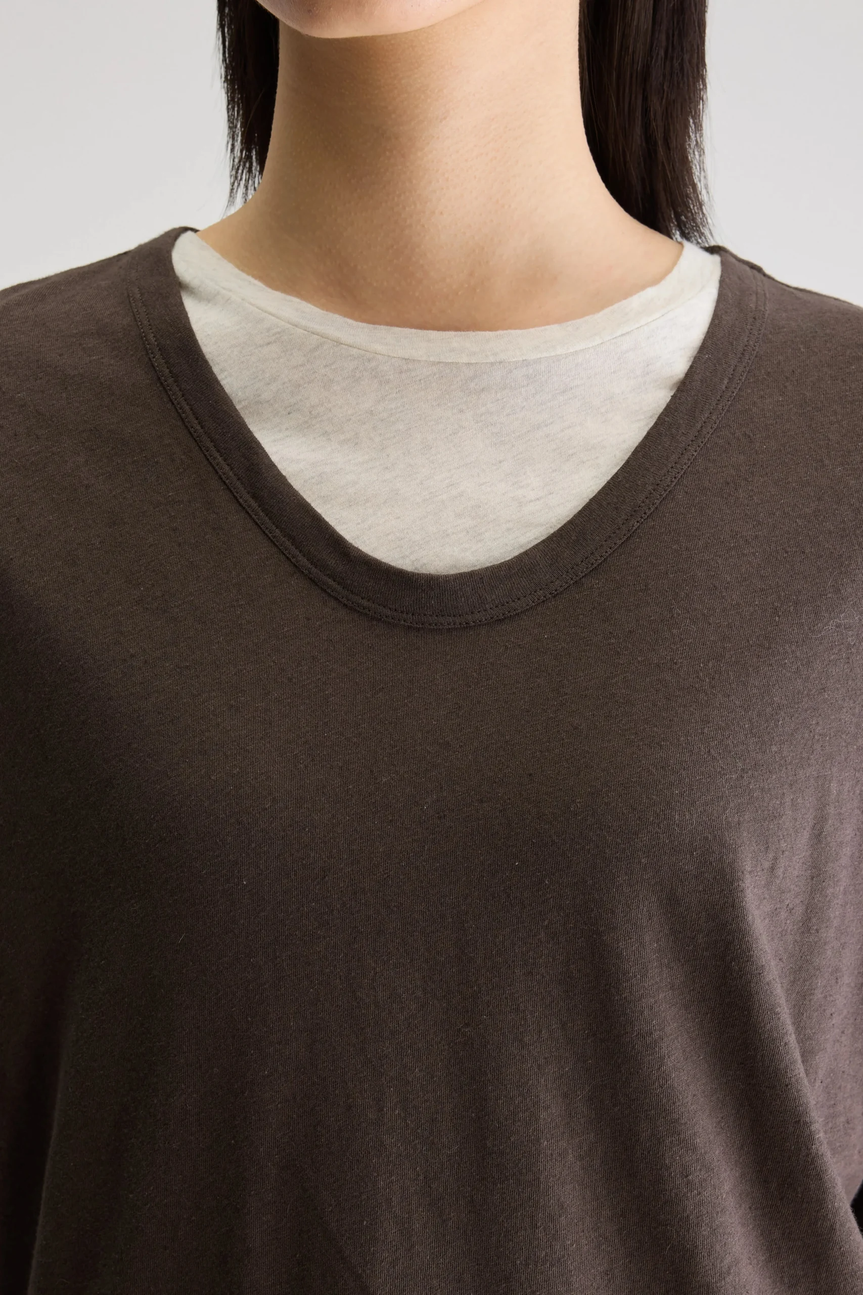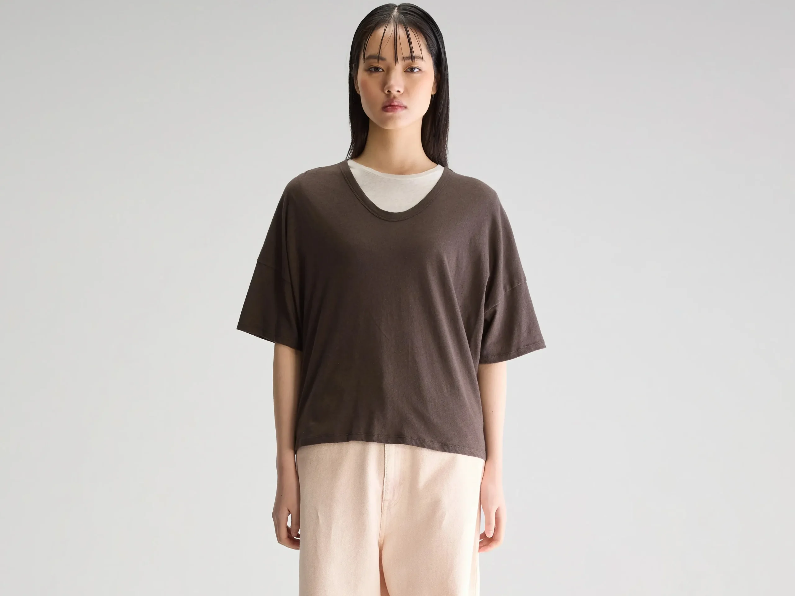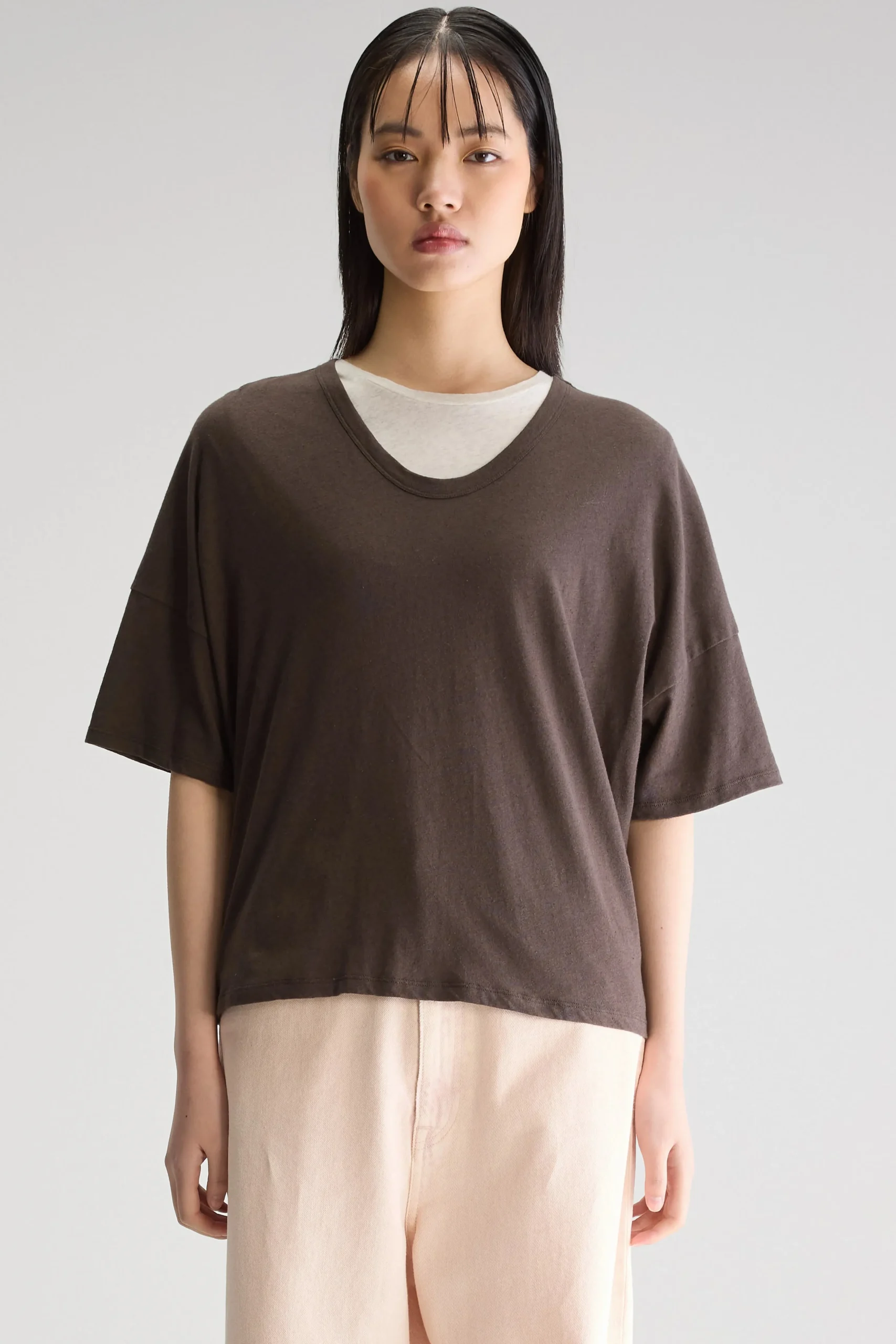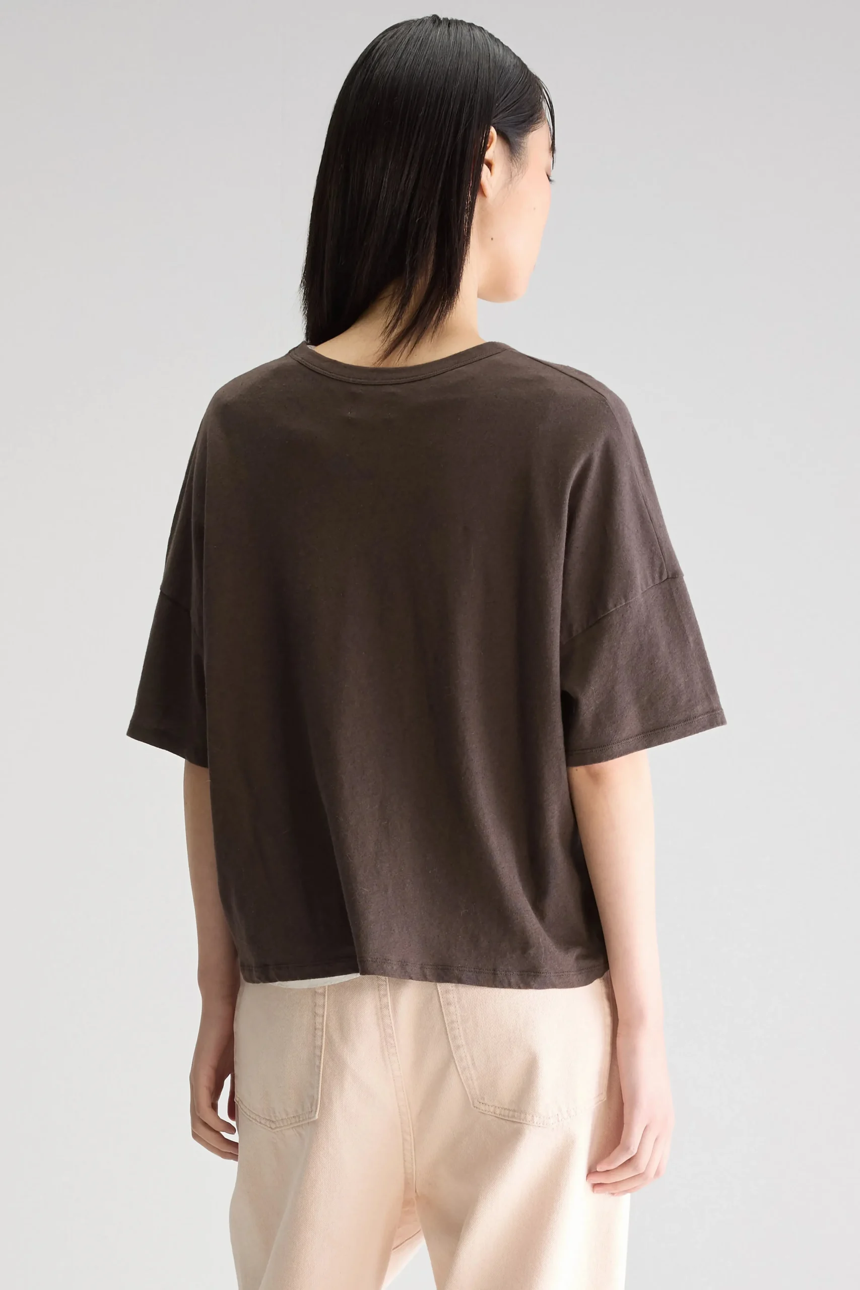 Regular t-shirt met korte mouwen en een ronde hals, gemaakt van licht katoen en linnen in donkerbruin.Regular pasvormKorte mouwenRonde halsMiddelzware jersey stof