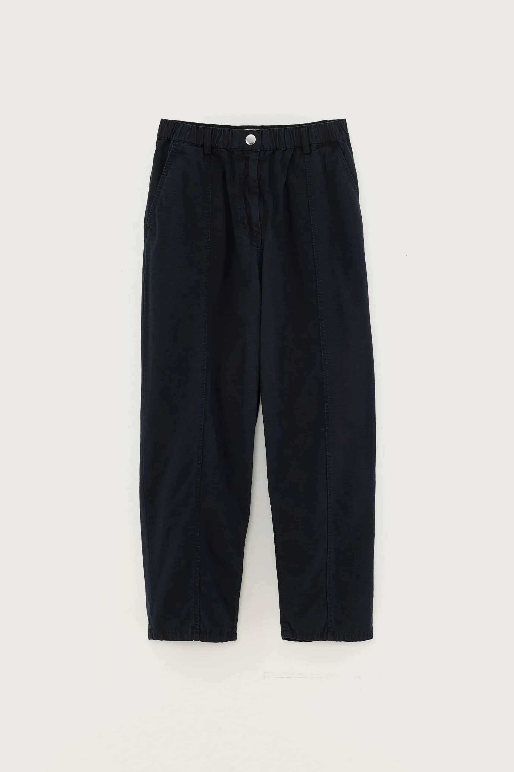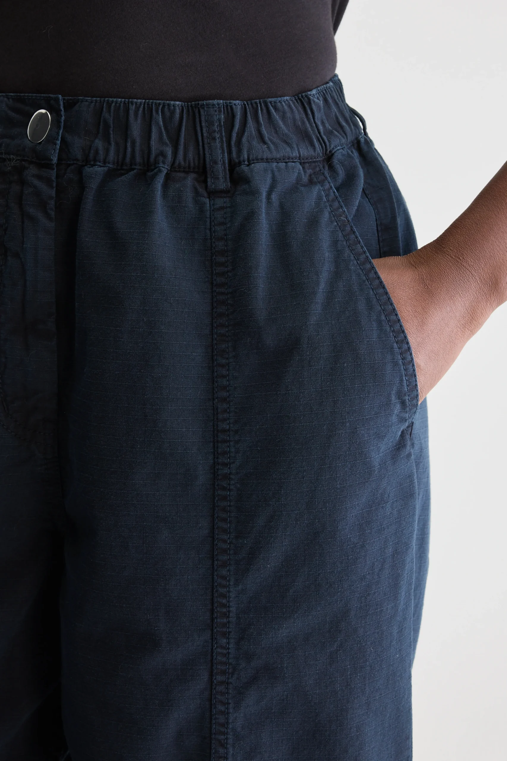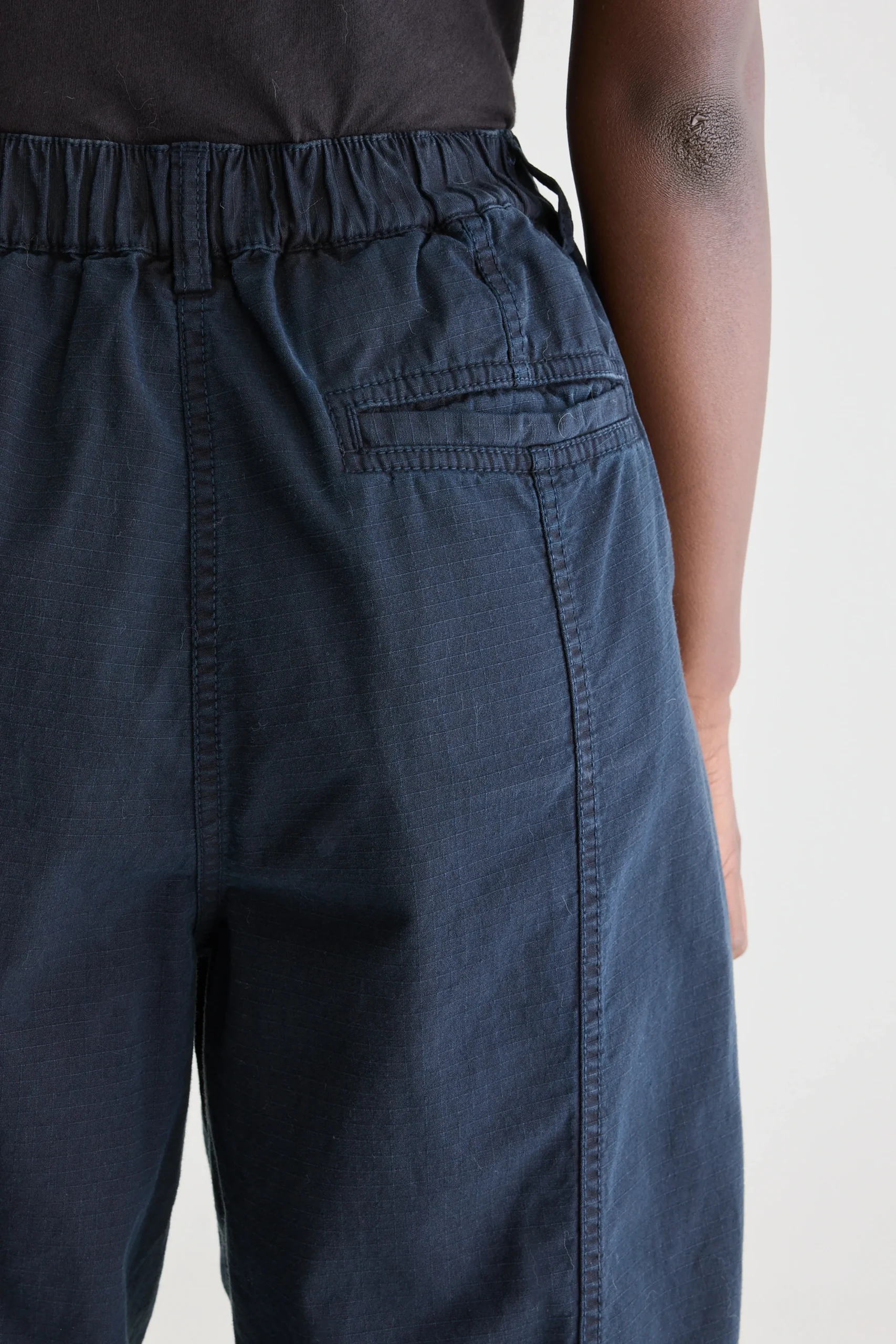 Relaxte broek met elastische taille, tapered pijpen en gestikte plooien vooraan, gemaakt van marineblauw ripstop katoen.Relaxte pasvorm Elastische taille, tapered pijpen Ripstop katoen, geen stretchSchuine zakken aan de voorkantRitssluiting en drukknoopsluitingBinnenbeenlengte: 26″(gebaseerd op maat 36)De binnenbeenlengte past zich lichtjes aan afhankelijk van de gekozen maat, zodat de pasvorm proportioneel blijft.