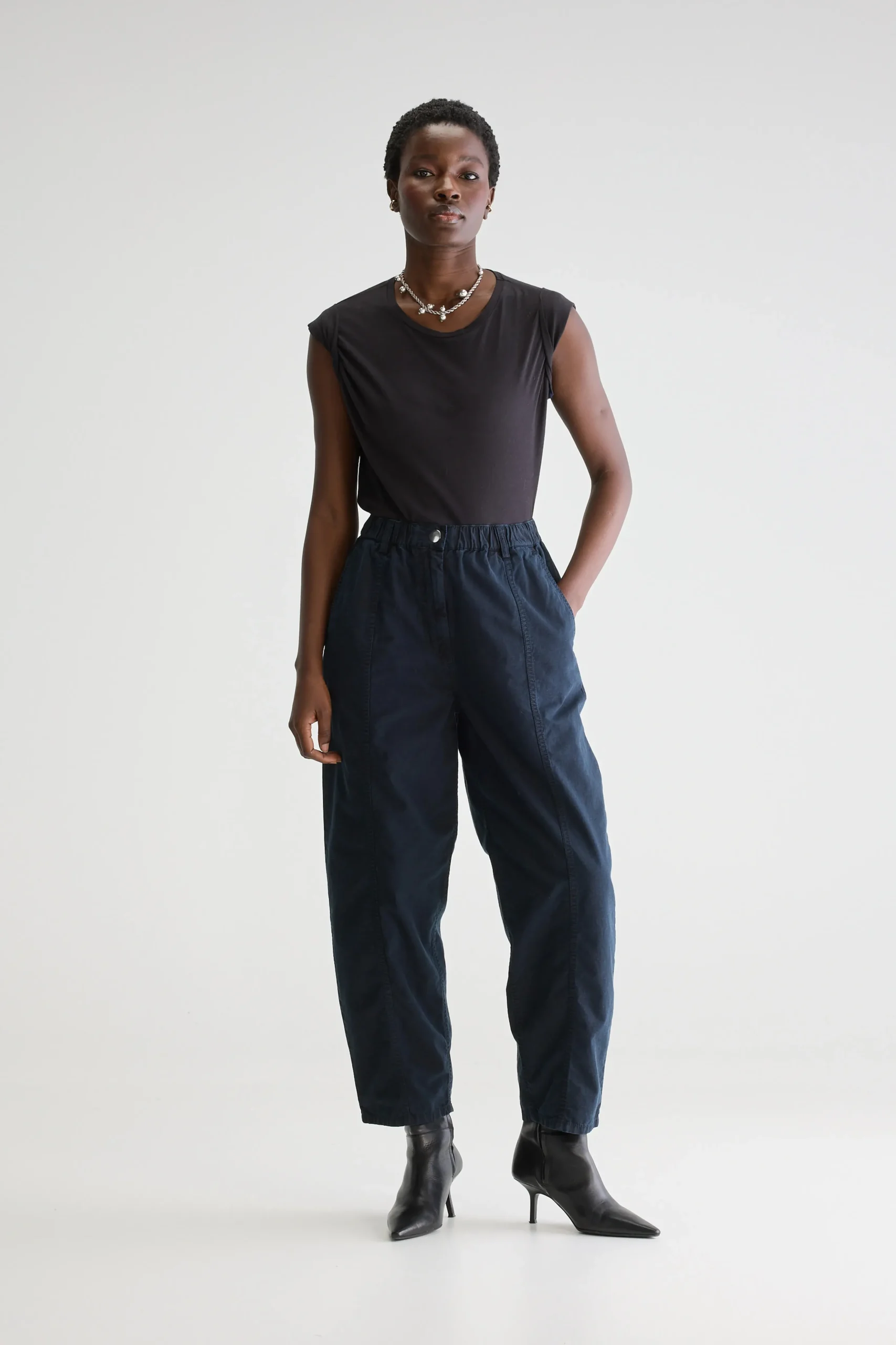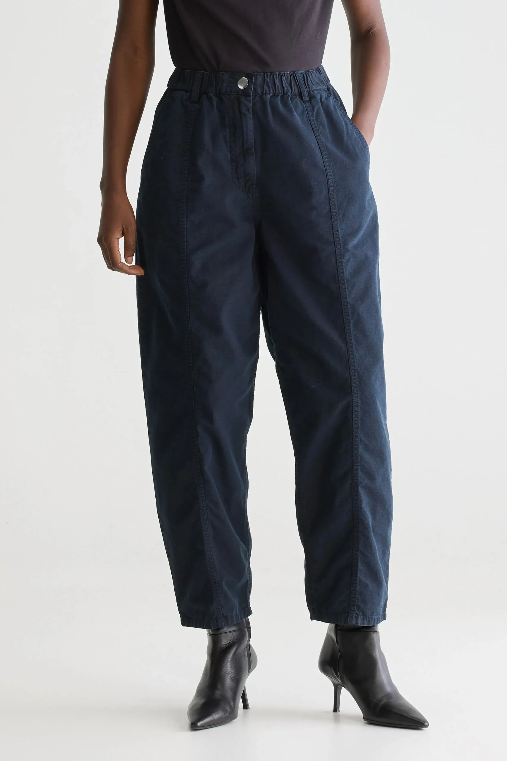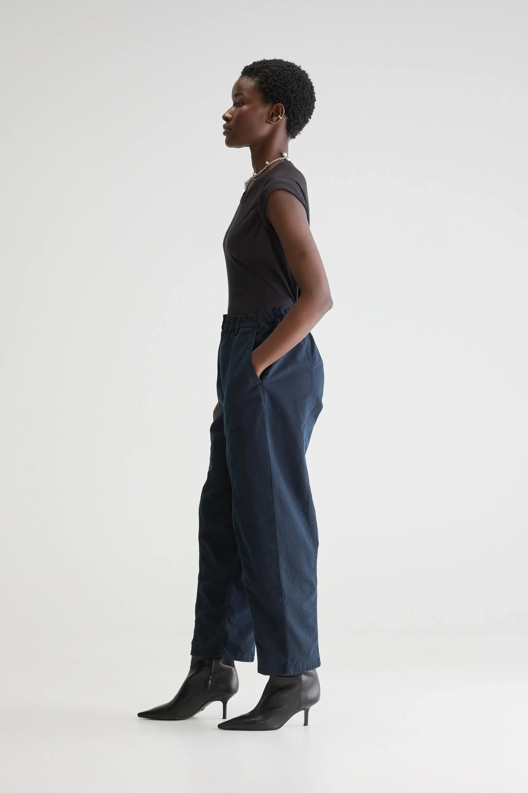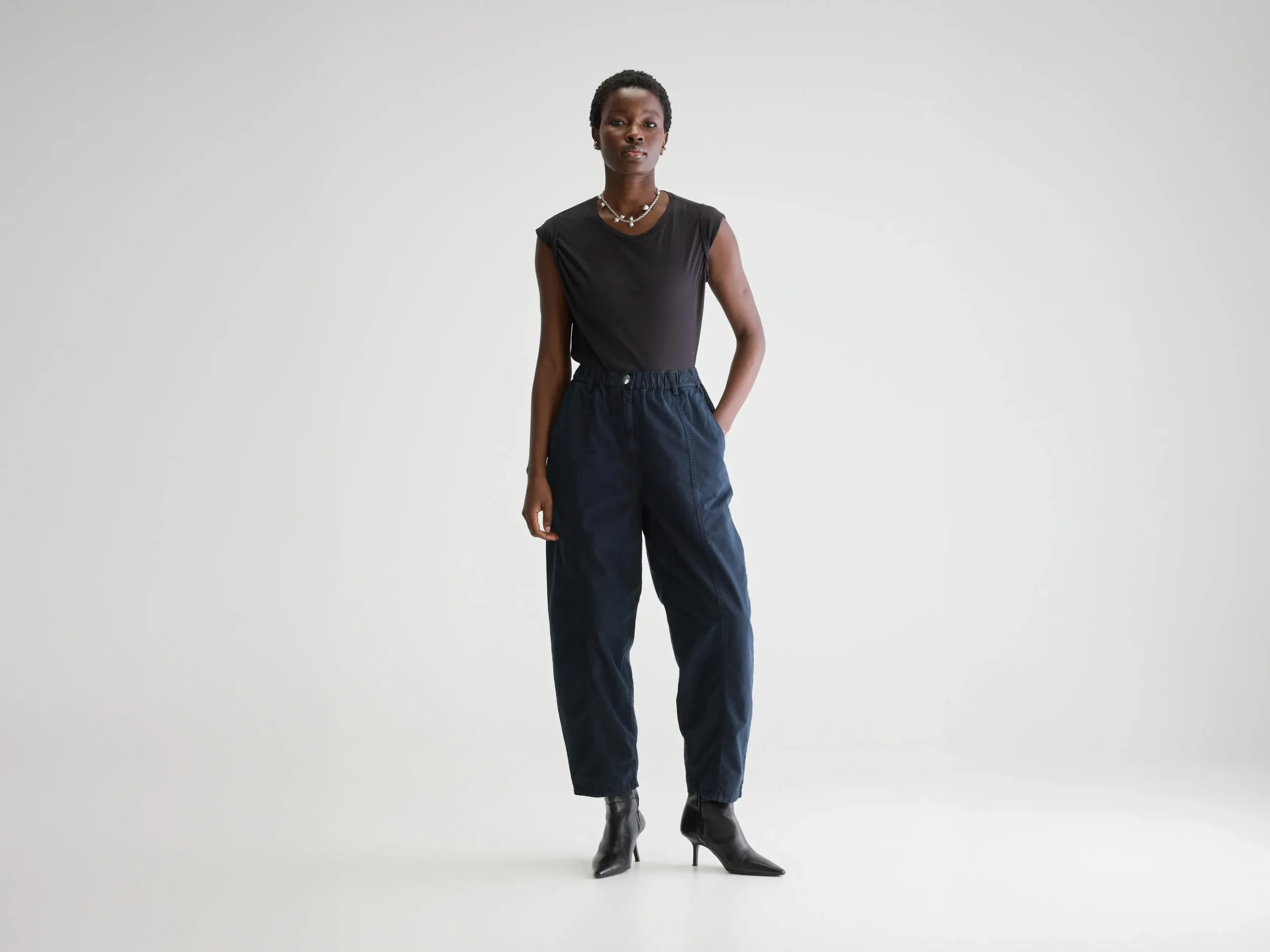 Relaxte broek met elastische taille, tapered pijpen en gestikte plooien vooraan, gemaakt van marineblauw ripstop katoen.Relaxte pasvorm Elastische taille, tapered pijpen Ripstop katoen, geen stretchSchuine zakken aan de voorkantRitssluiting en drukknoopsluitingBinnenbeenlengte: 26″(gebaseerd op maat 36)De binnenbeenlengte past zich lichtjes aan afhankelijk van de gekozen maat, zodat de pasvorm proportioneel blijft.
