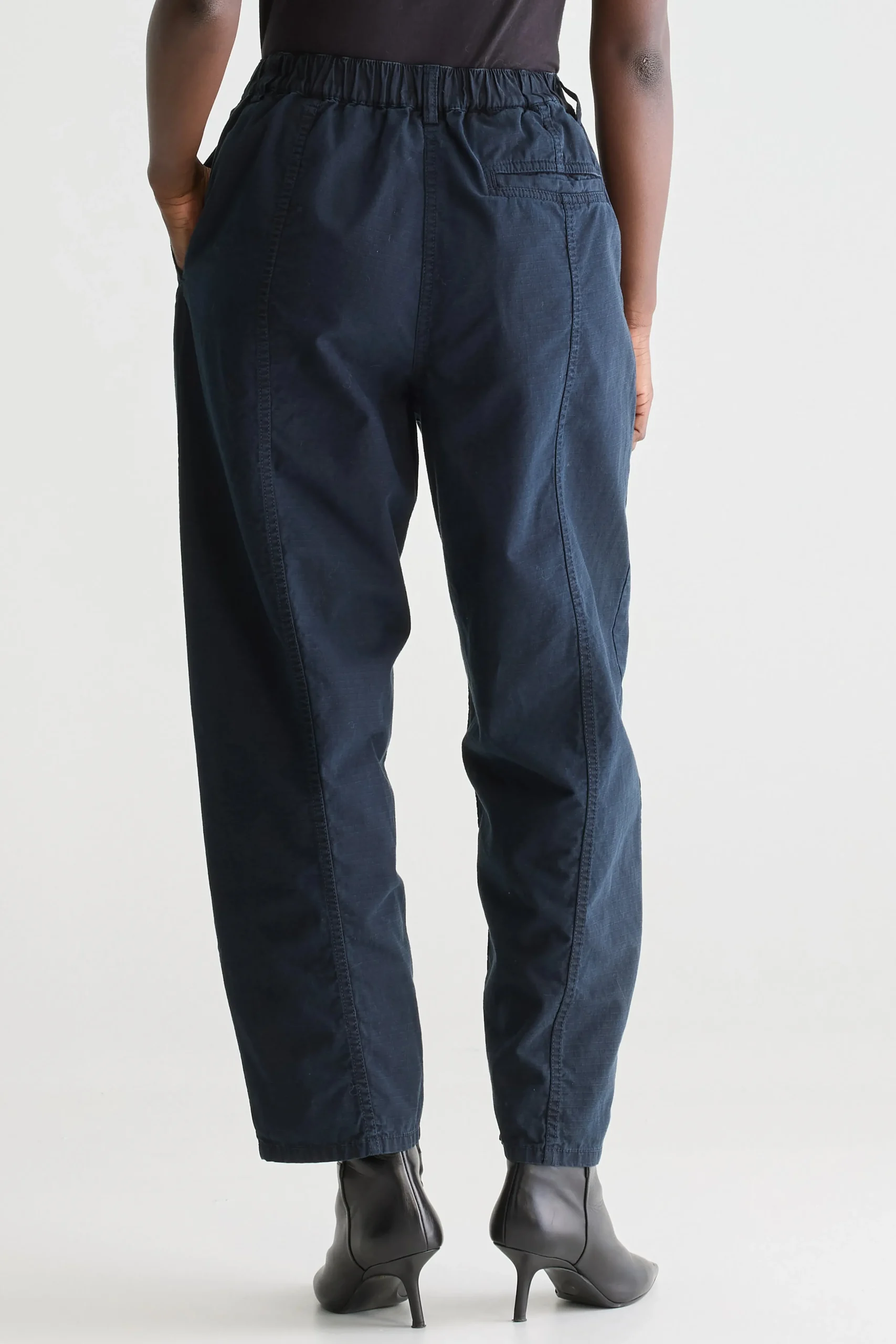 Relaxte broek met elastische taille, tapered pijpen en gestikte plooien vooraan, gemaakt van marineblauw ripstop katoen….