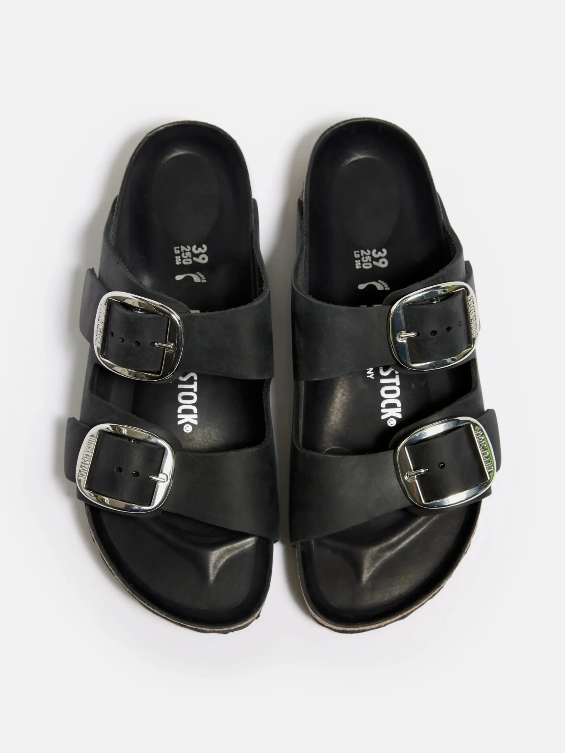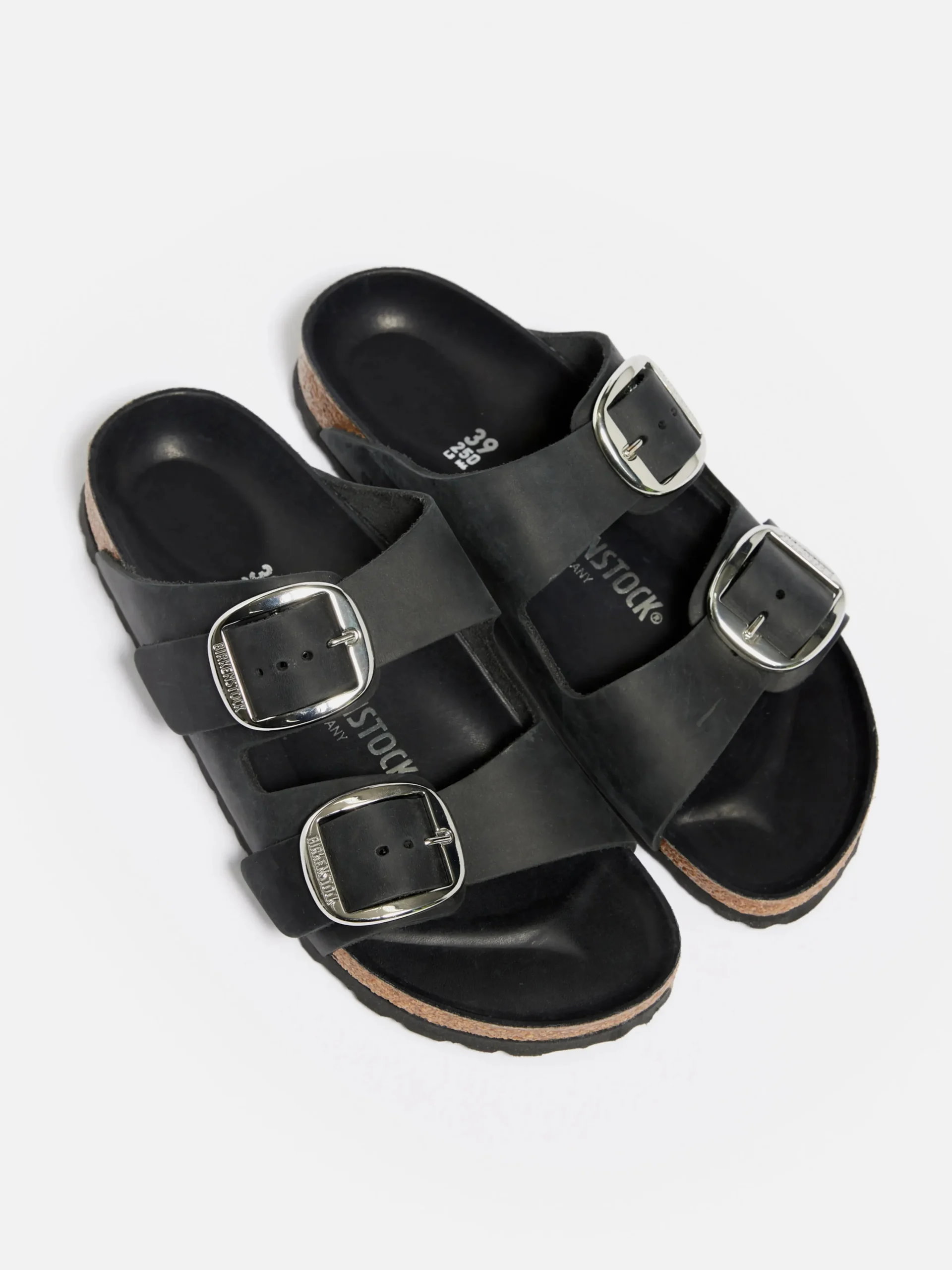 The Birkenstock Arizona Big Buckle sandals feature two large metal pin buckles, soft leather lining, and a thick oiled n…