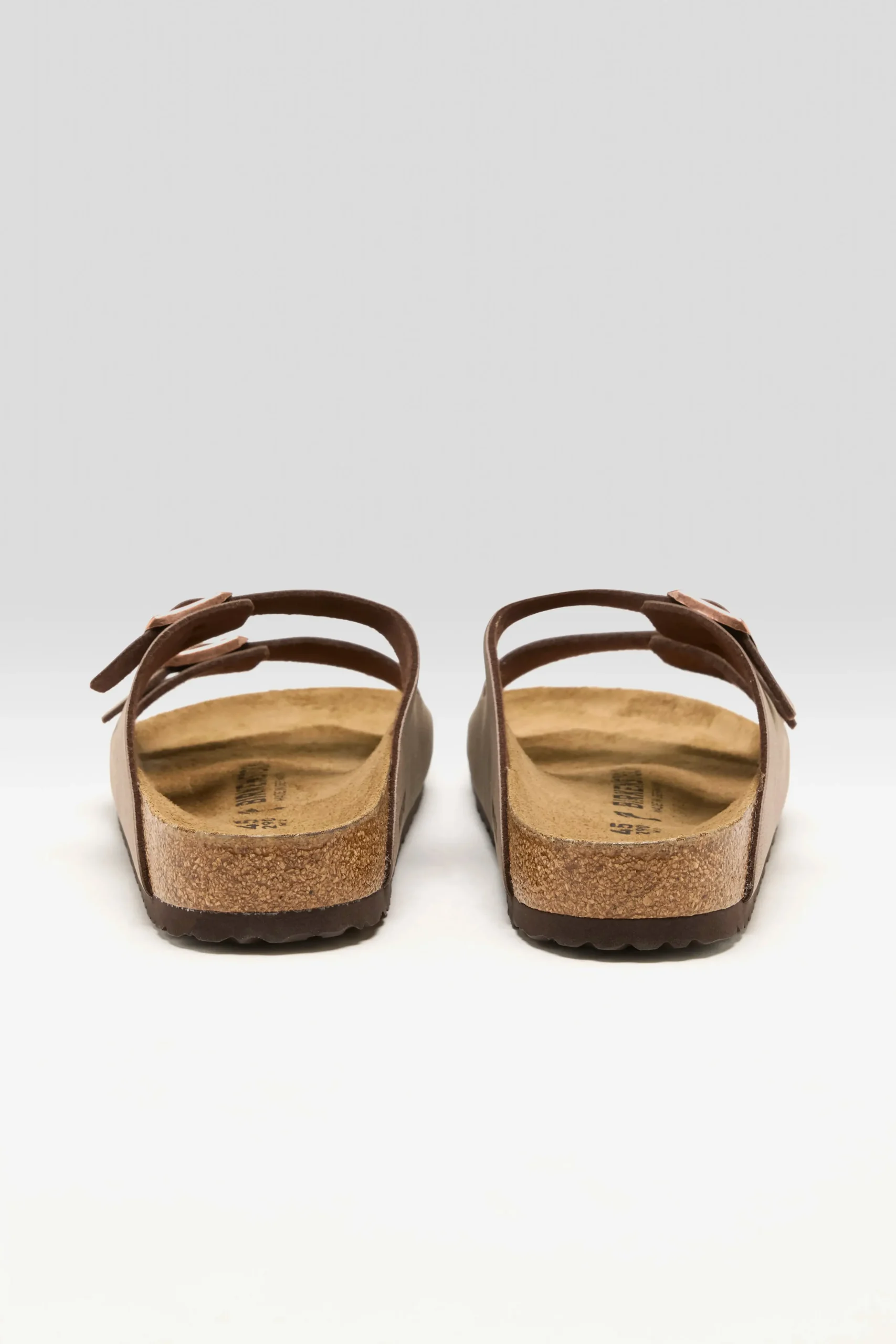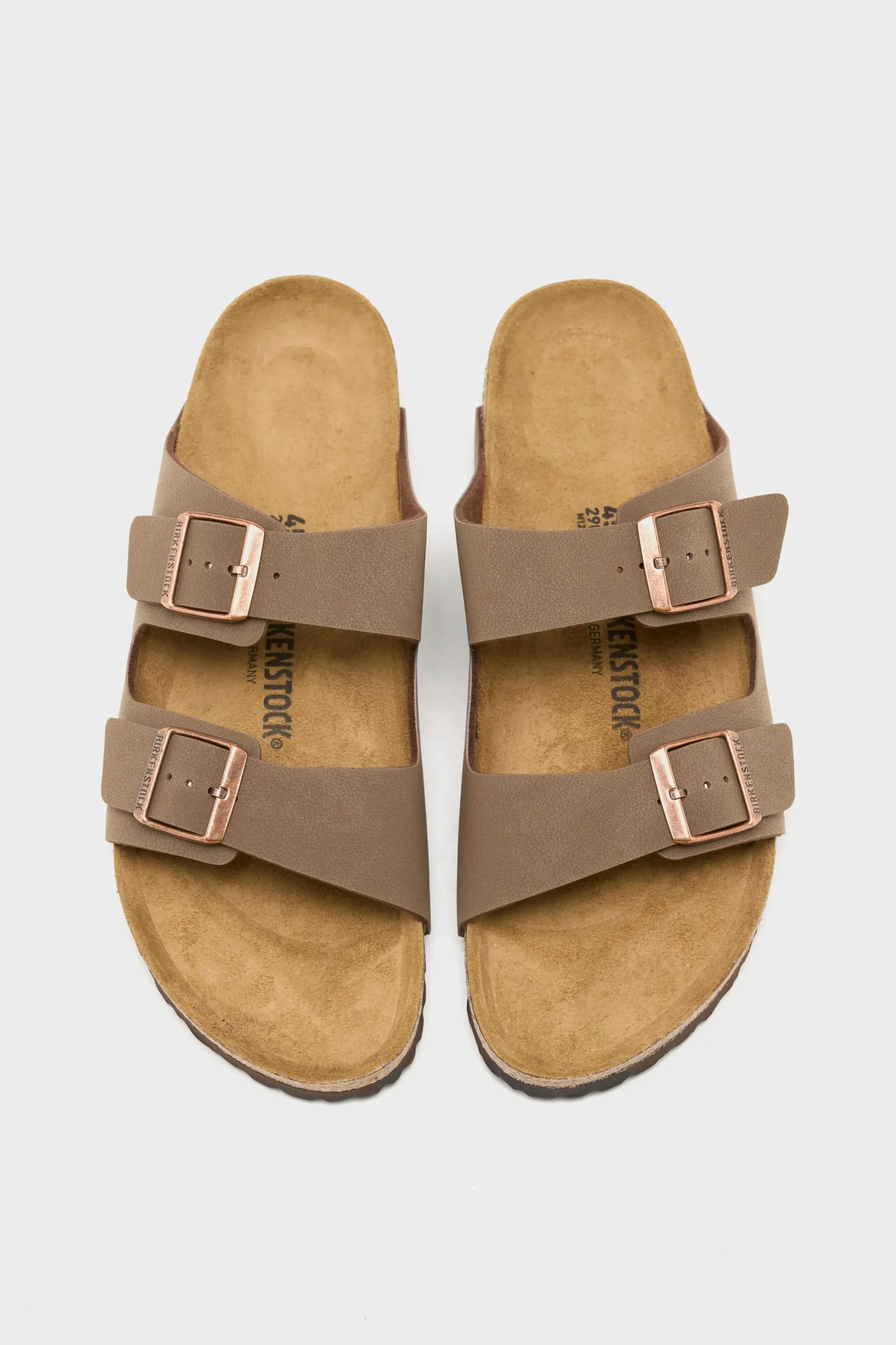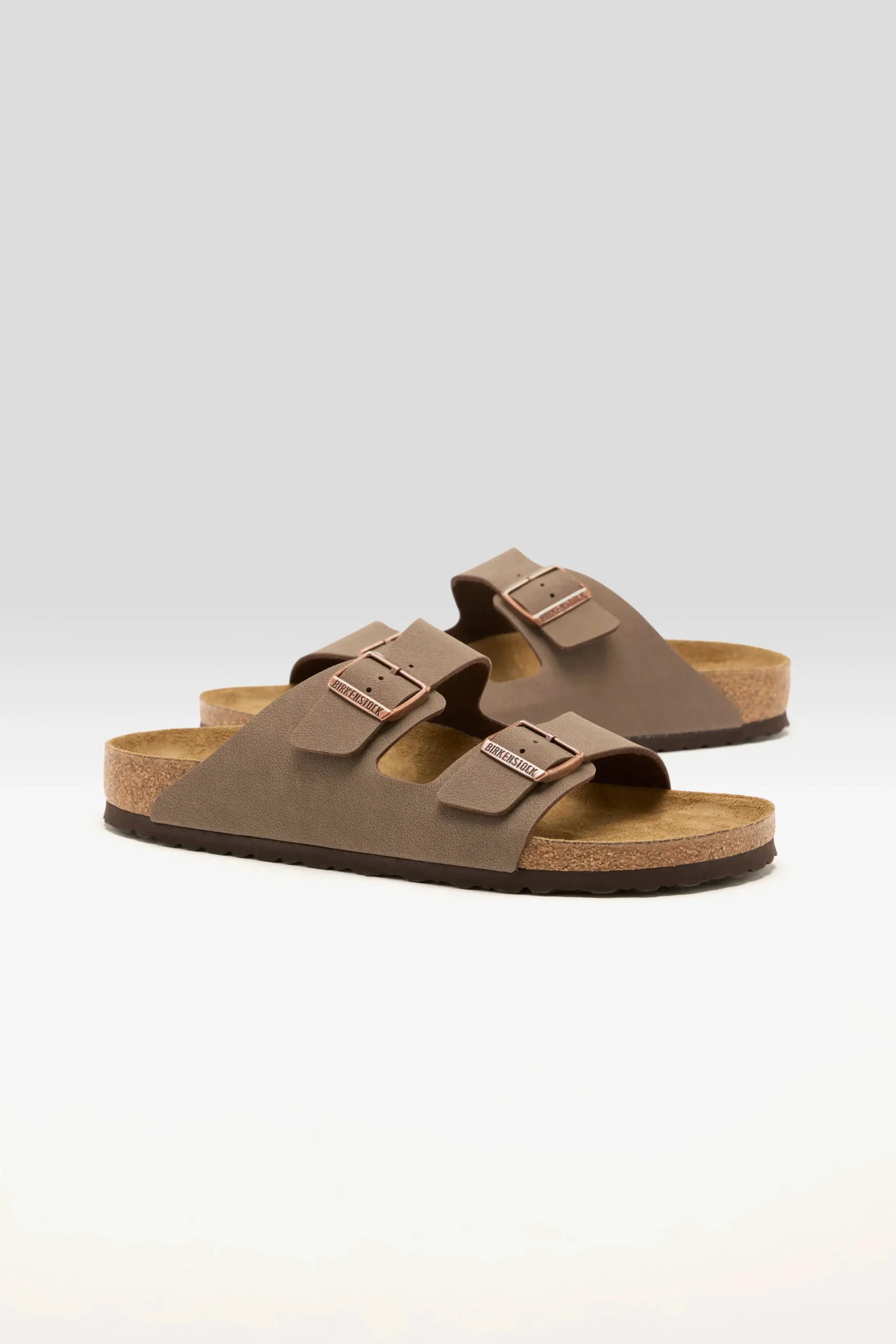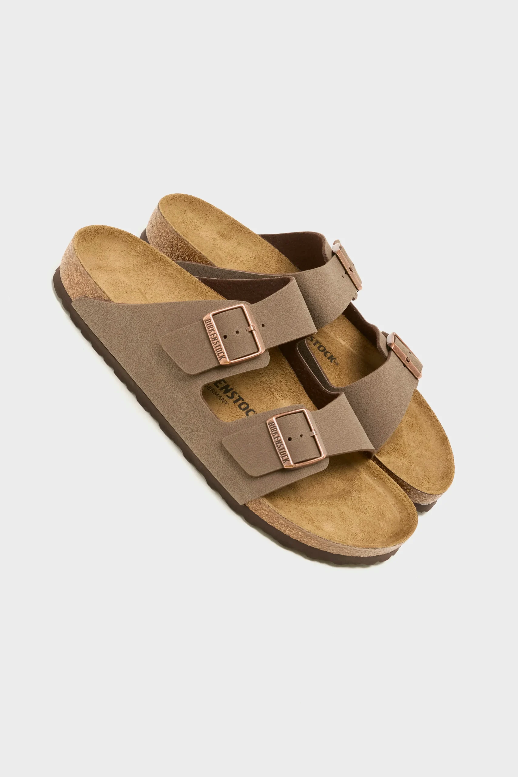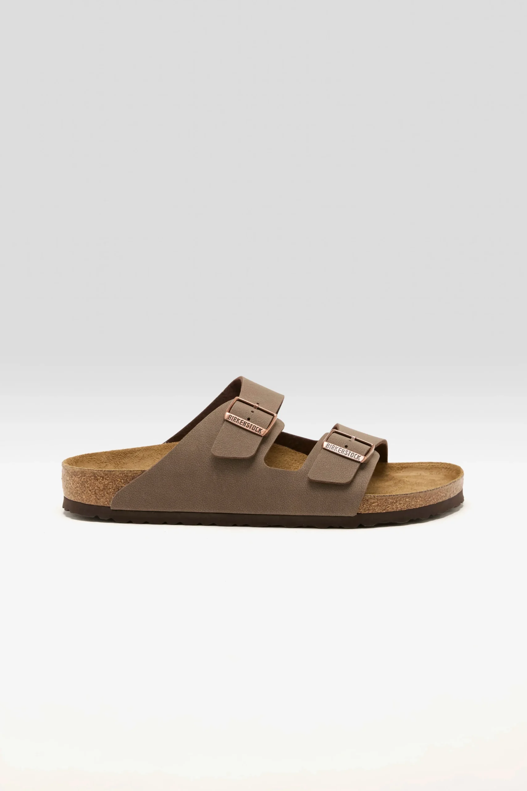The Birkenstock Arizona Birkibuc sandals have a durable synthetic leather upper, a cork footbed, and two adjustable straps with metal pin buckles.