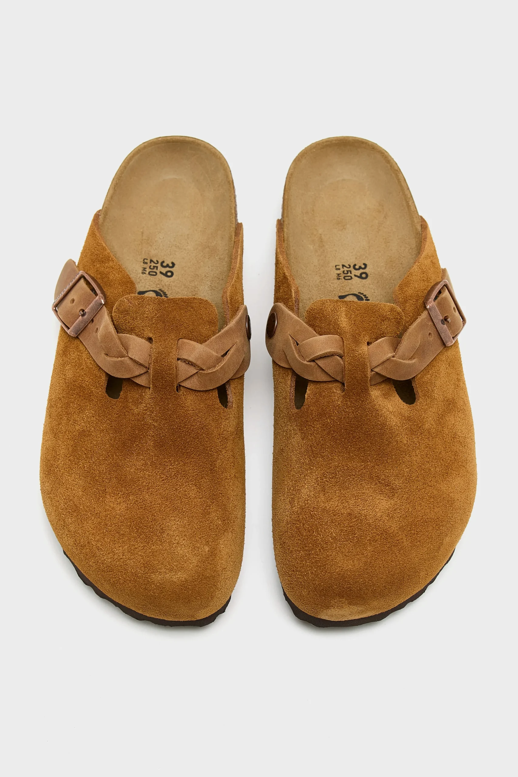The Birkenstock Braided Suede clog features a suede upper with a braided leather adjustable strap with a metal pin buckle, suede lining, cork insole, and EVA outsole.