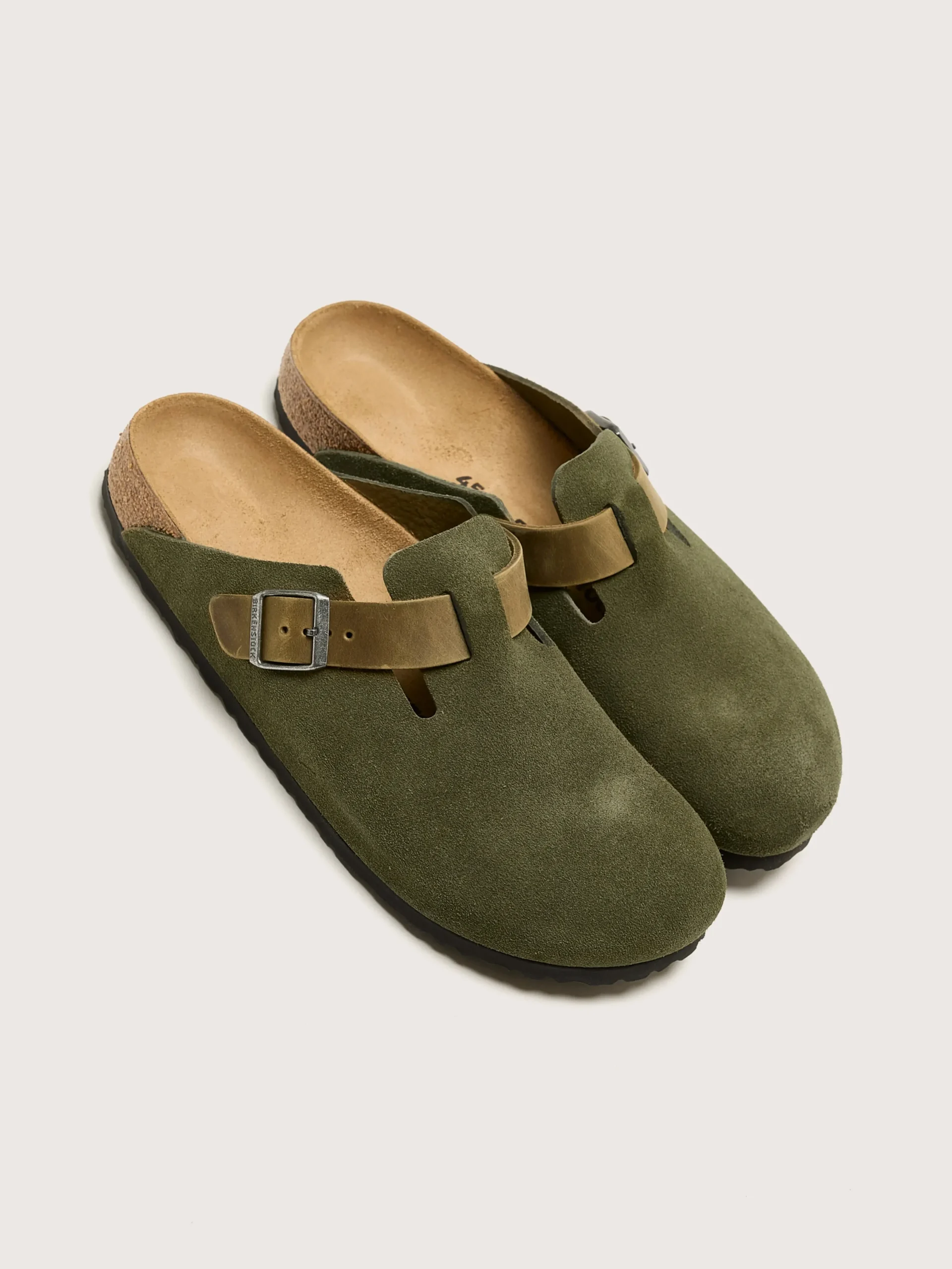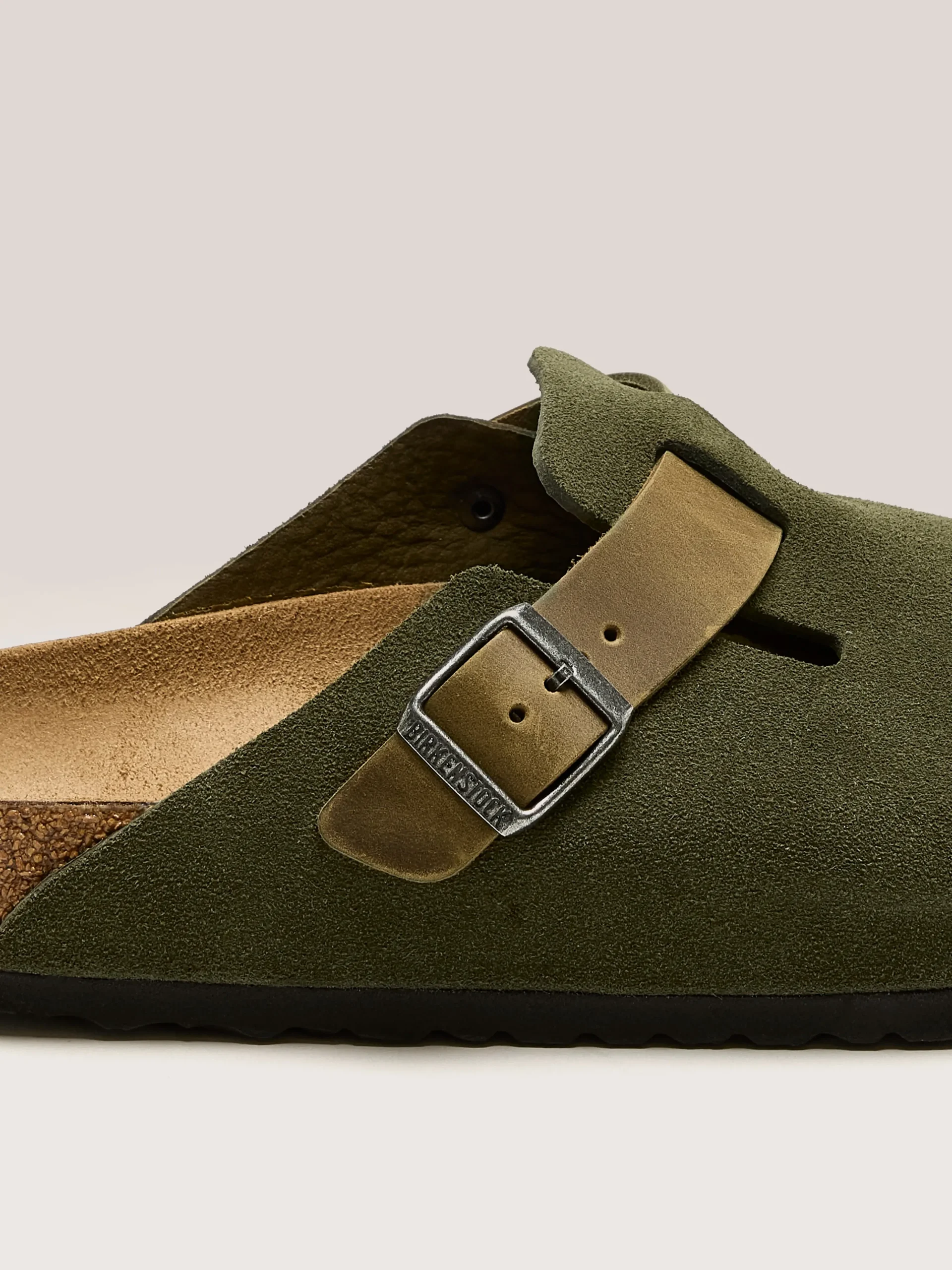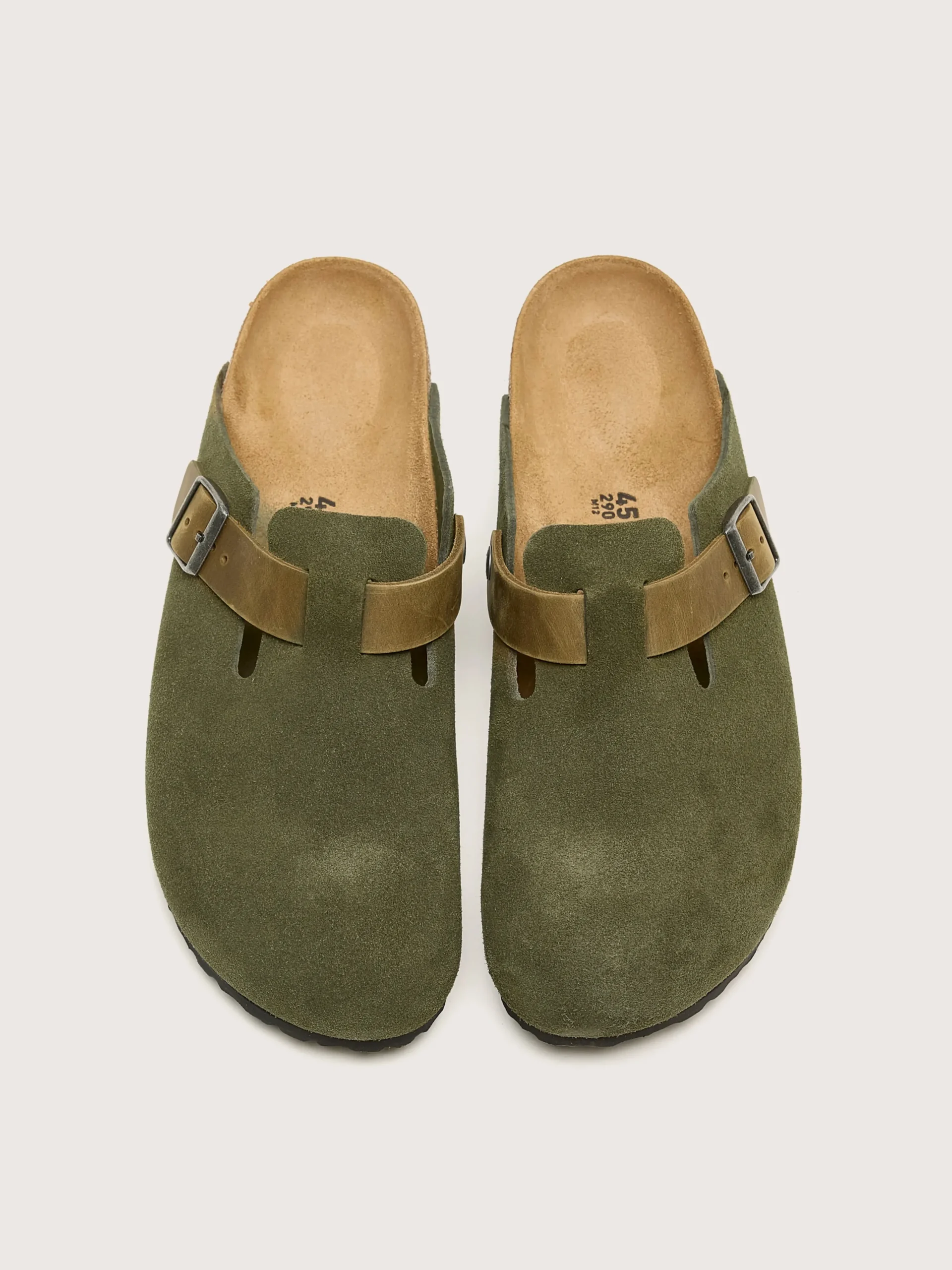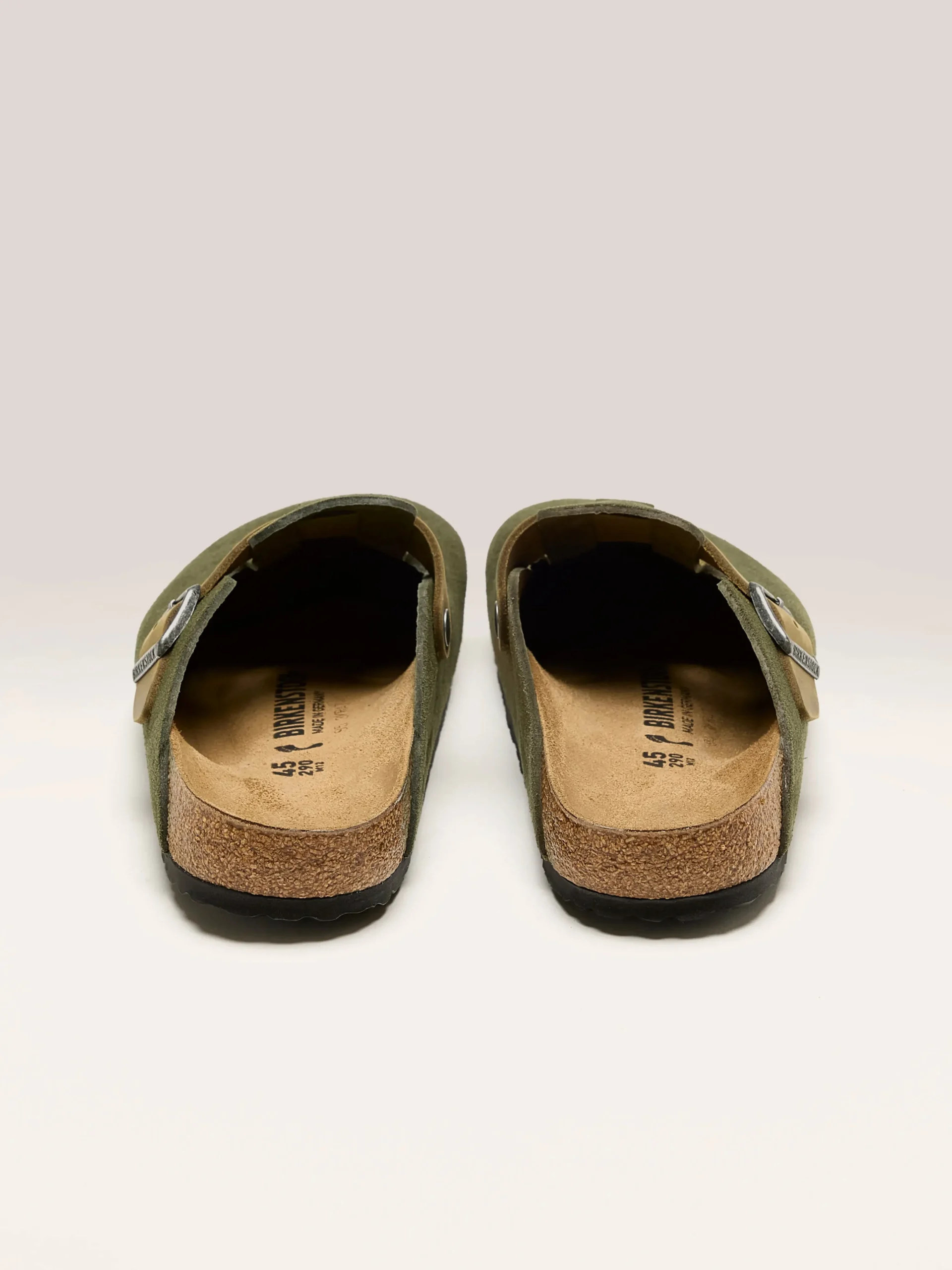 De Birkenstock Boston Gemengd Leder klompen hebben een zacht suède bovenwerk met een geolied lederen verstelbaar riempj…