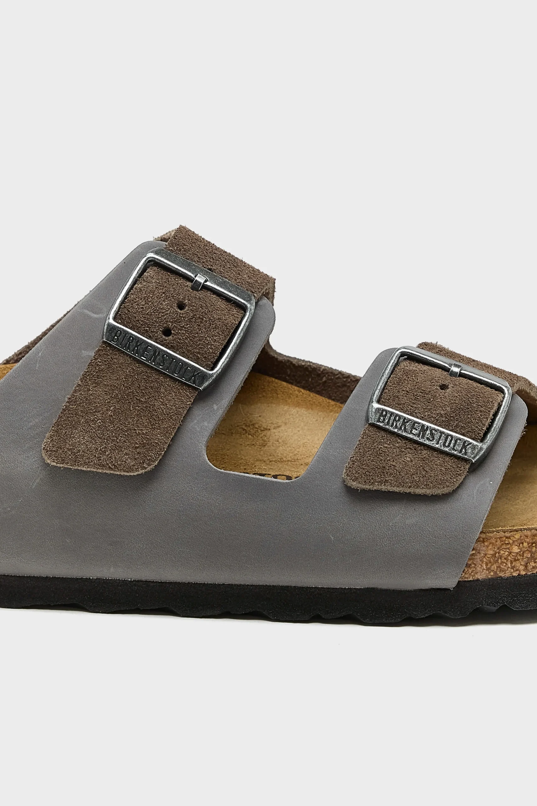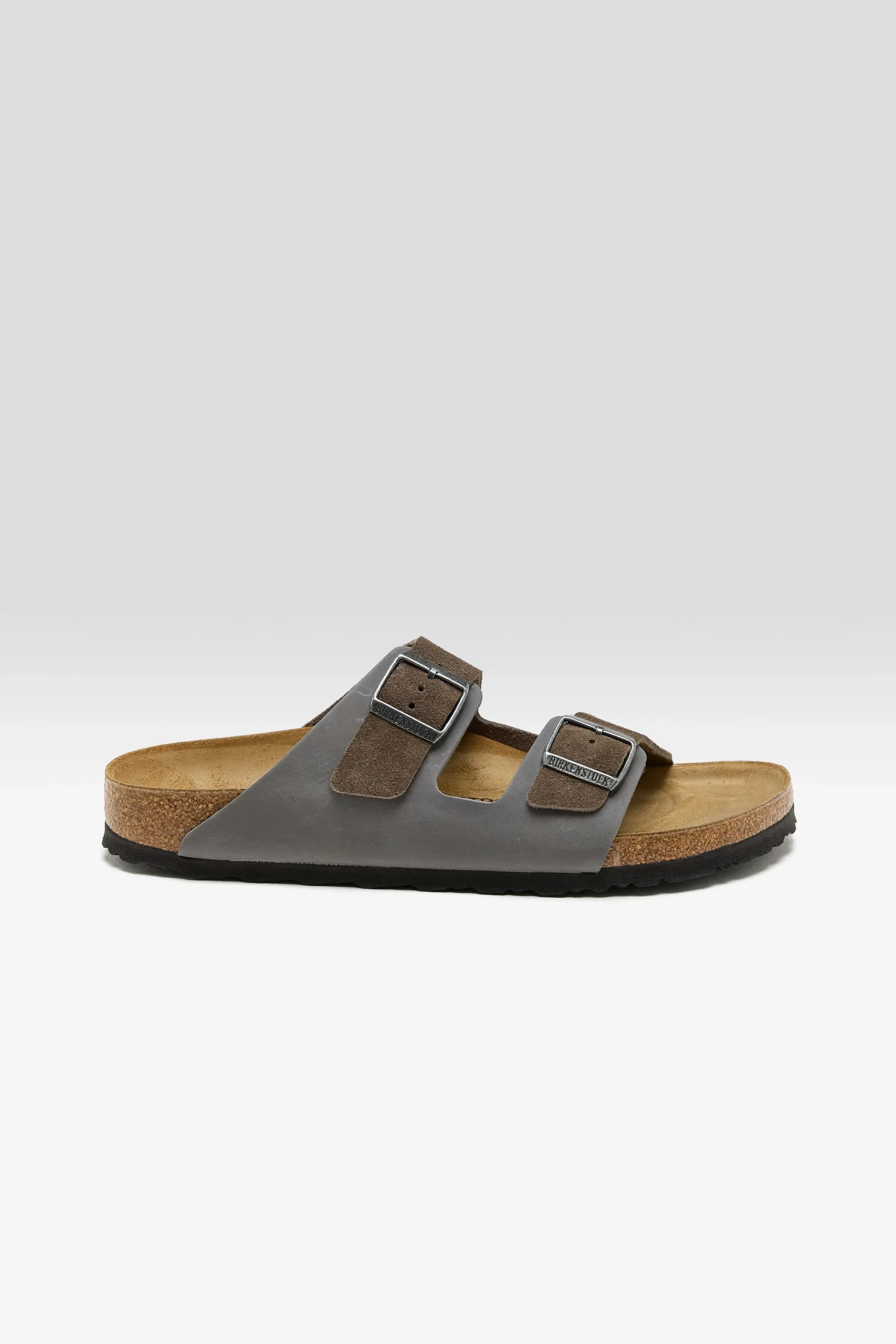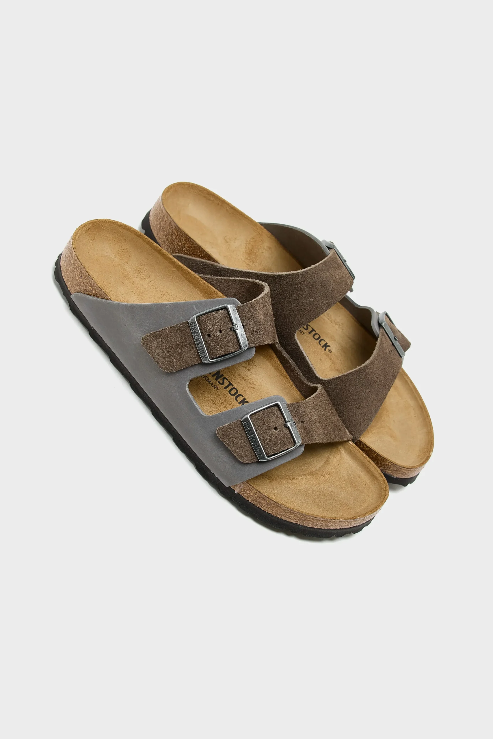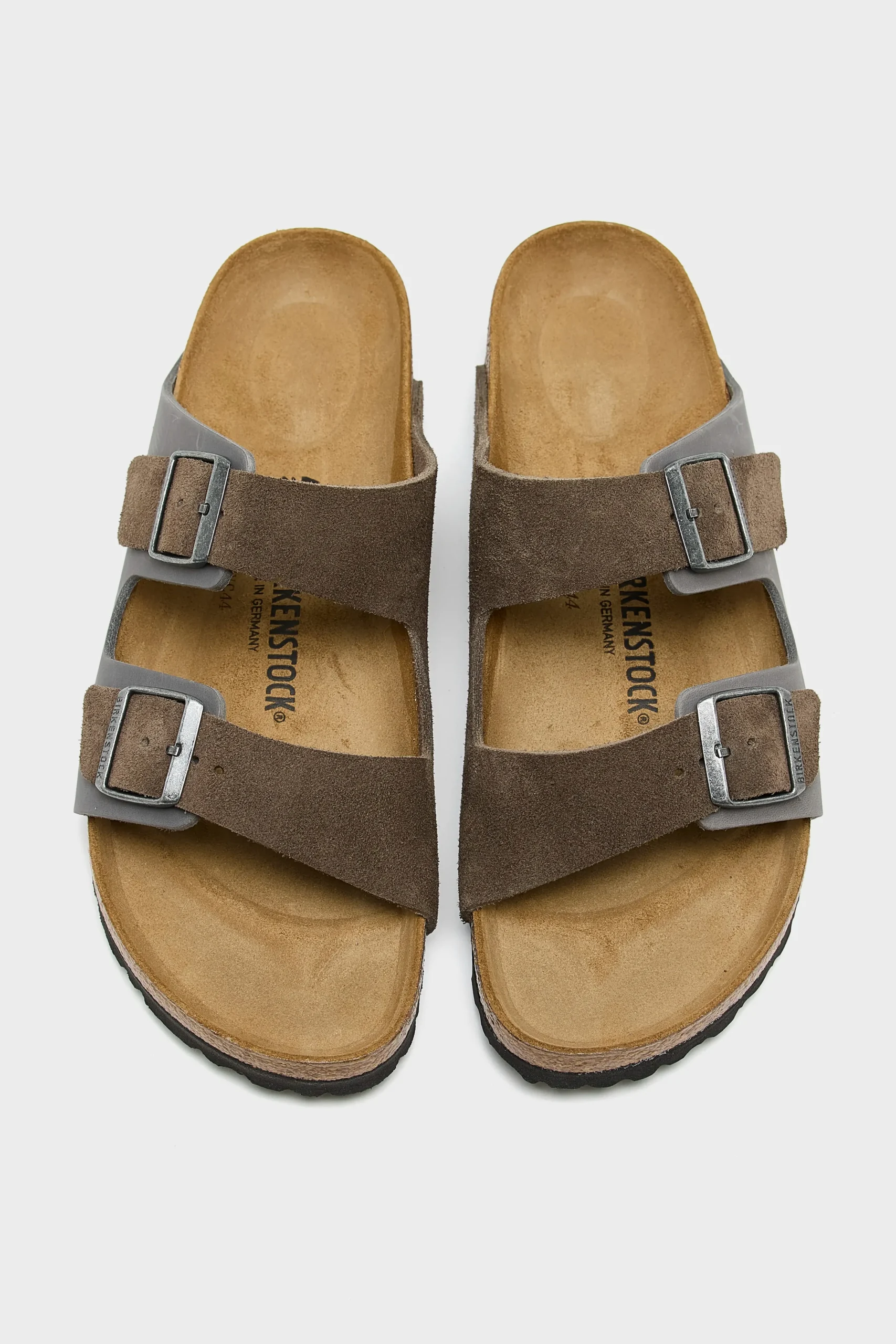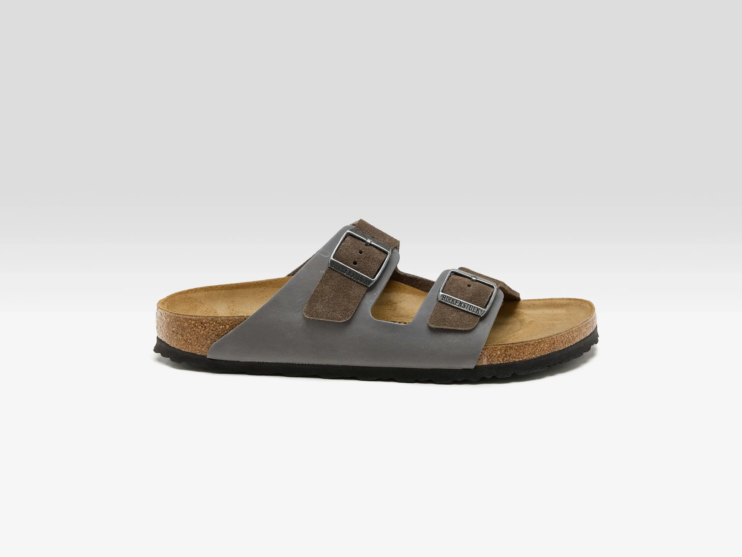 The Birkenstock Boston mixed leather clogs feature a soft suede upper, an adjustable oiled leather strap with a metal pin buckle, suede lining, cork footbed, and EVA-rubber outsole.