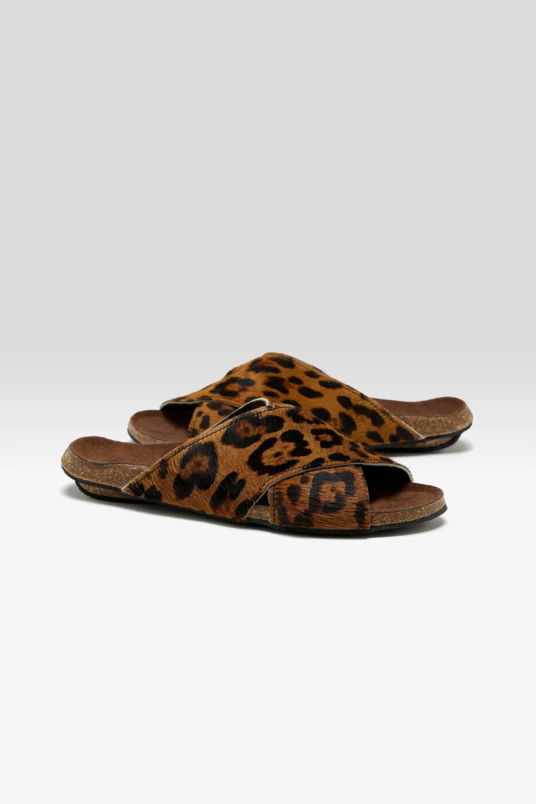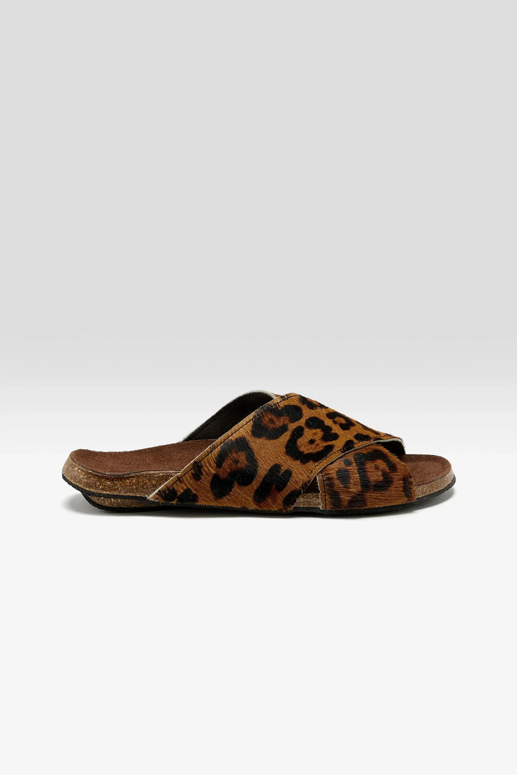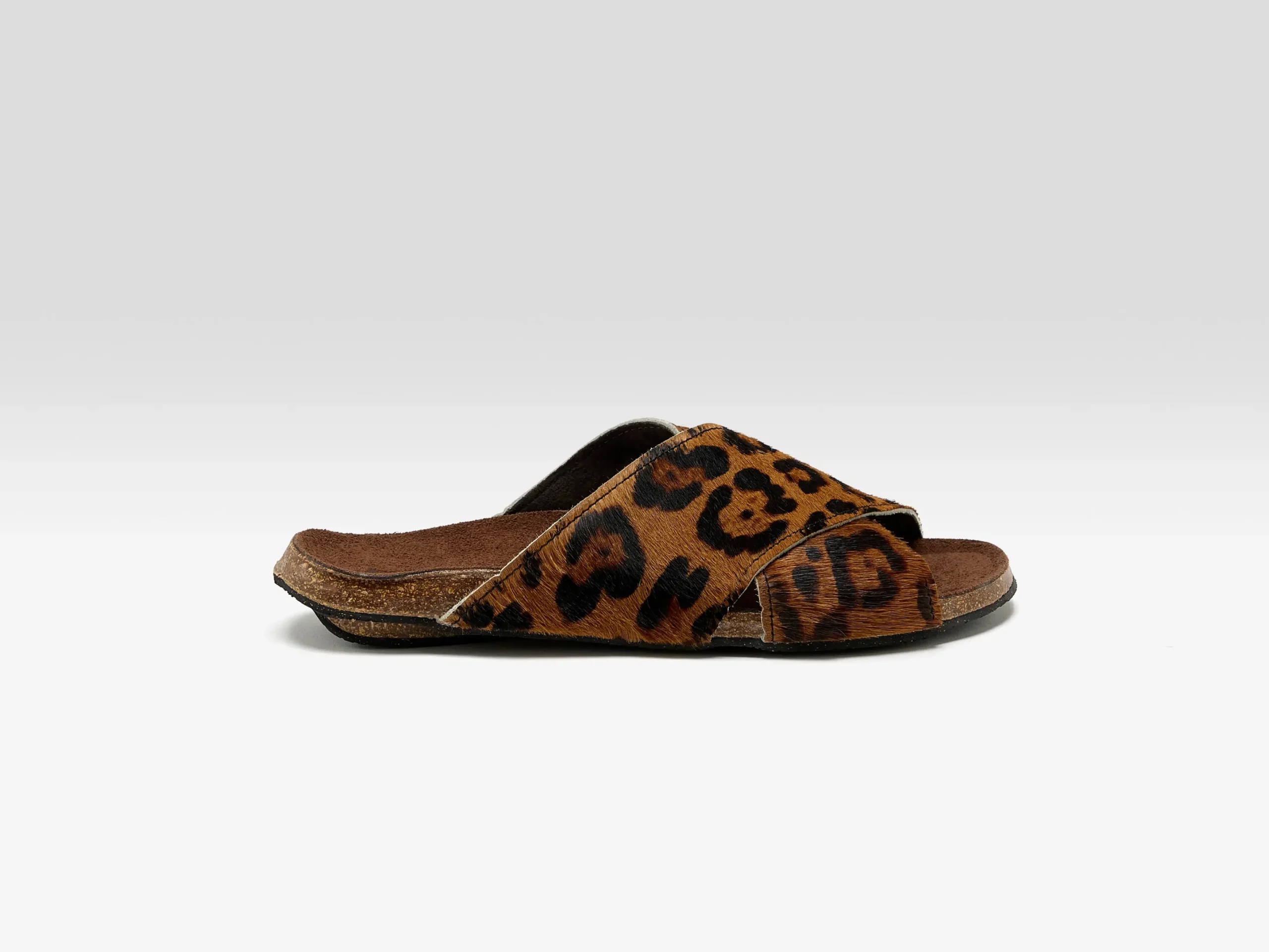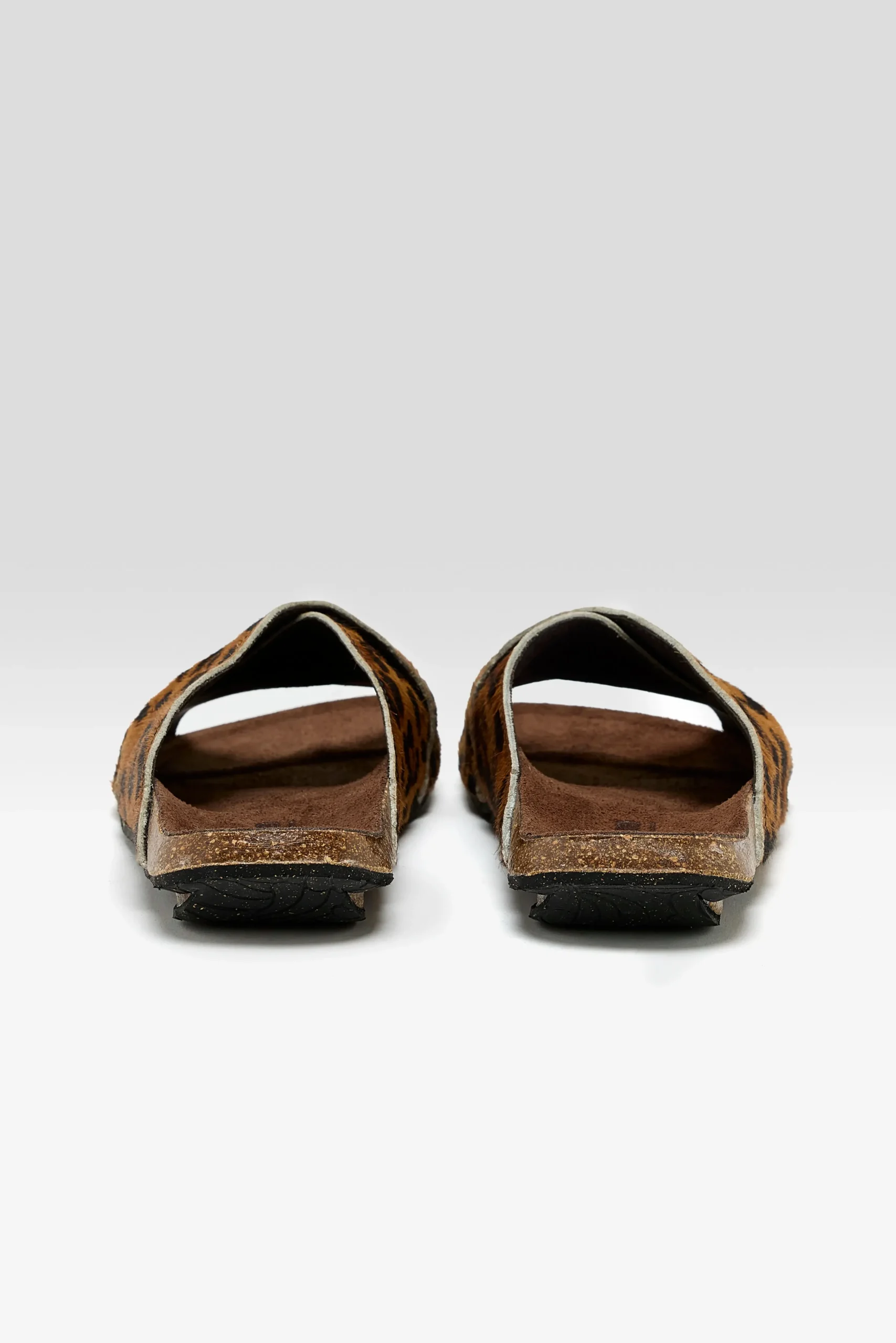 The handmade Bosabo Guepard leather sandals feature a hair-on leather upper, cork insole, suede lining, and rubber outso…