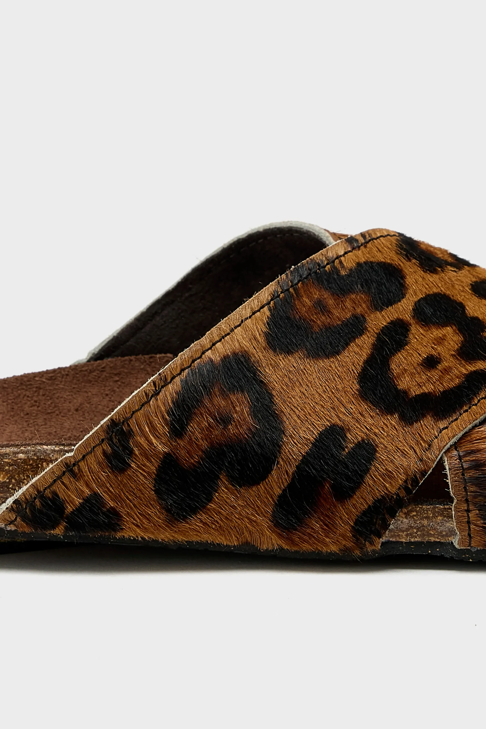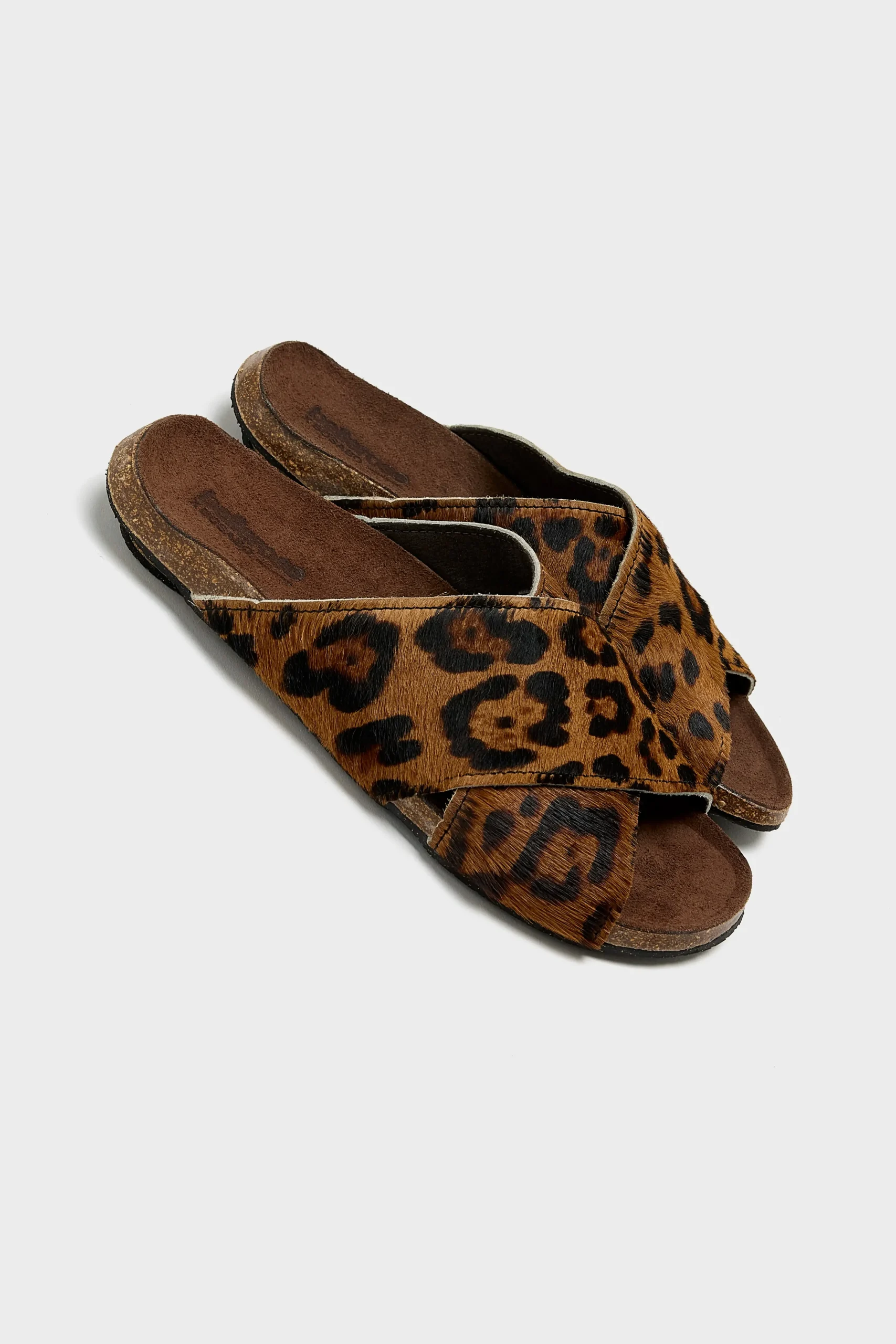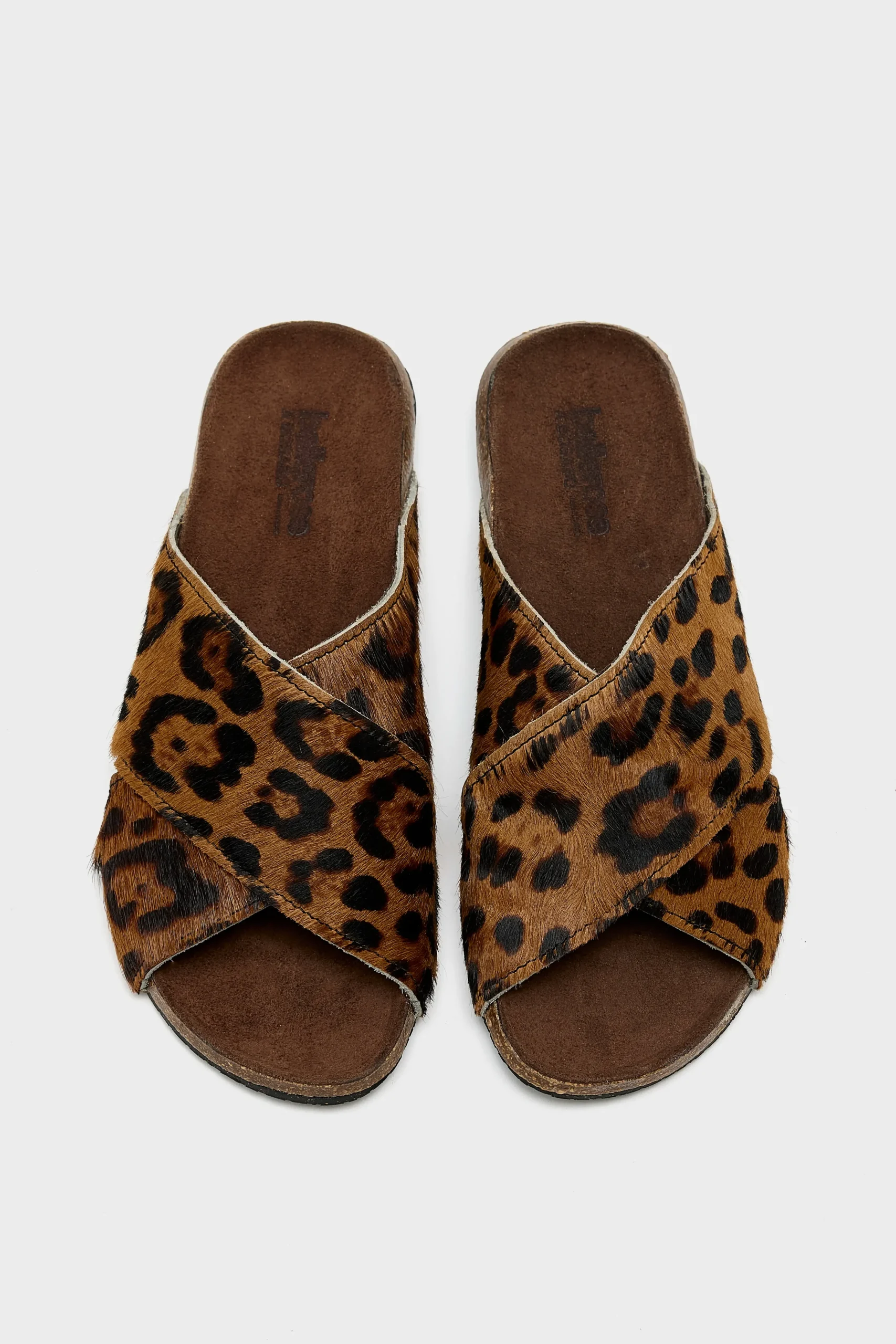 The handmade Bosabo Guepard leather sandals feature a hair-on leather upper, cork insole, suede lining, and rubber outsole.