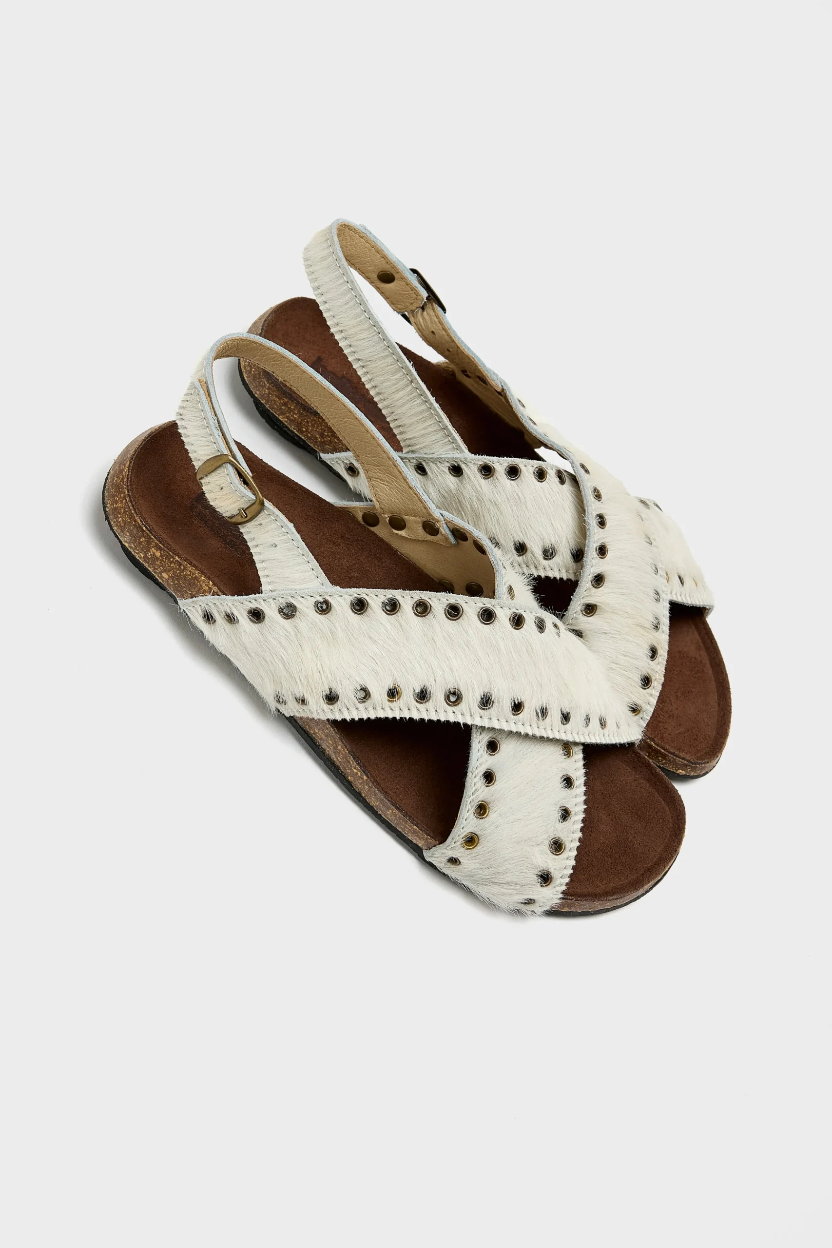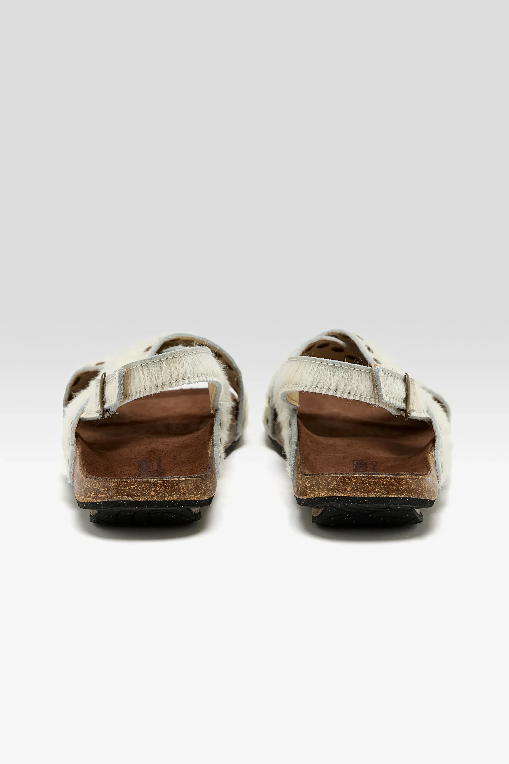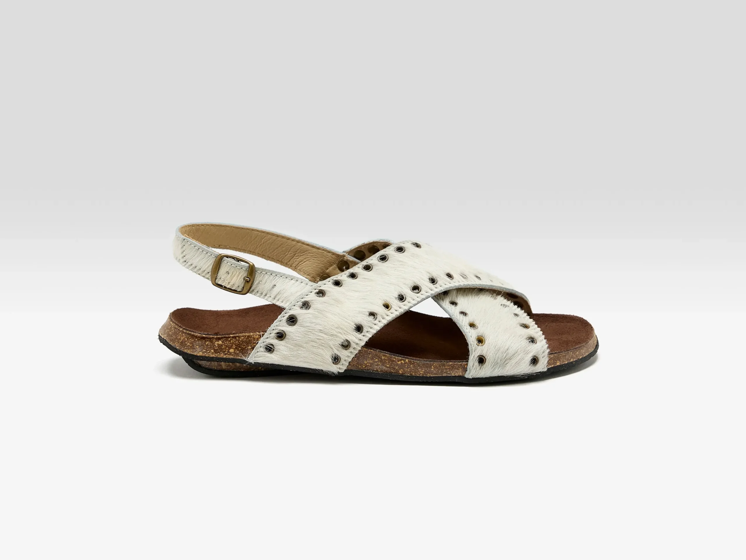 The handmade Bosabo Tevir leather sandals feature a hair-on leather upper with metal eyelets, adjustable heel strap, suede lining, and cork midsole.