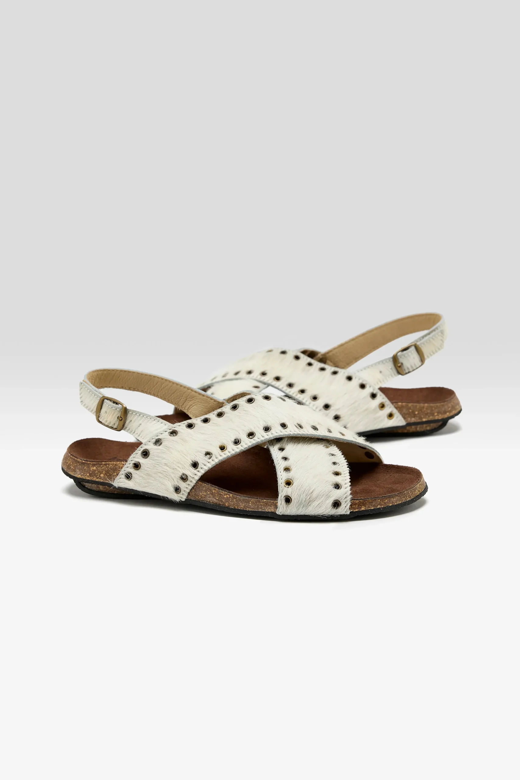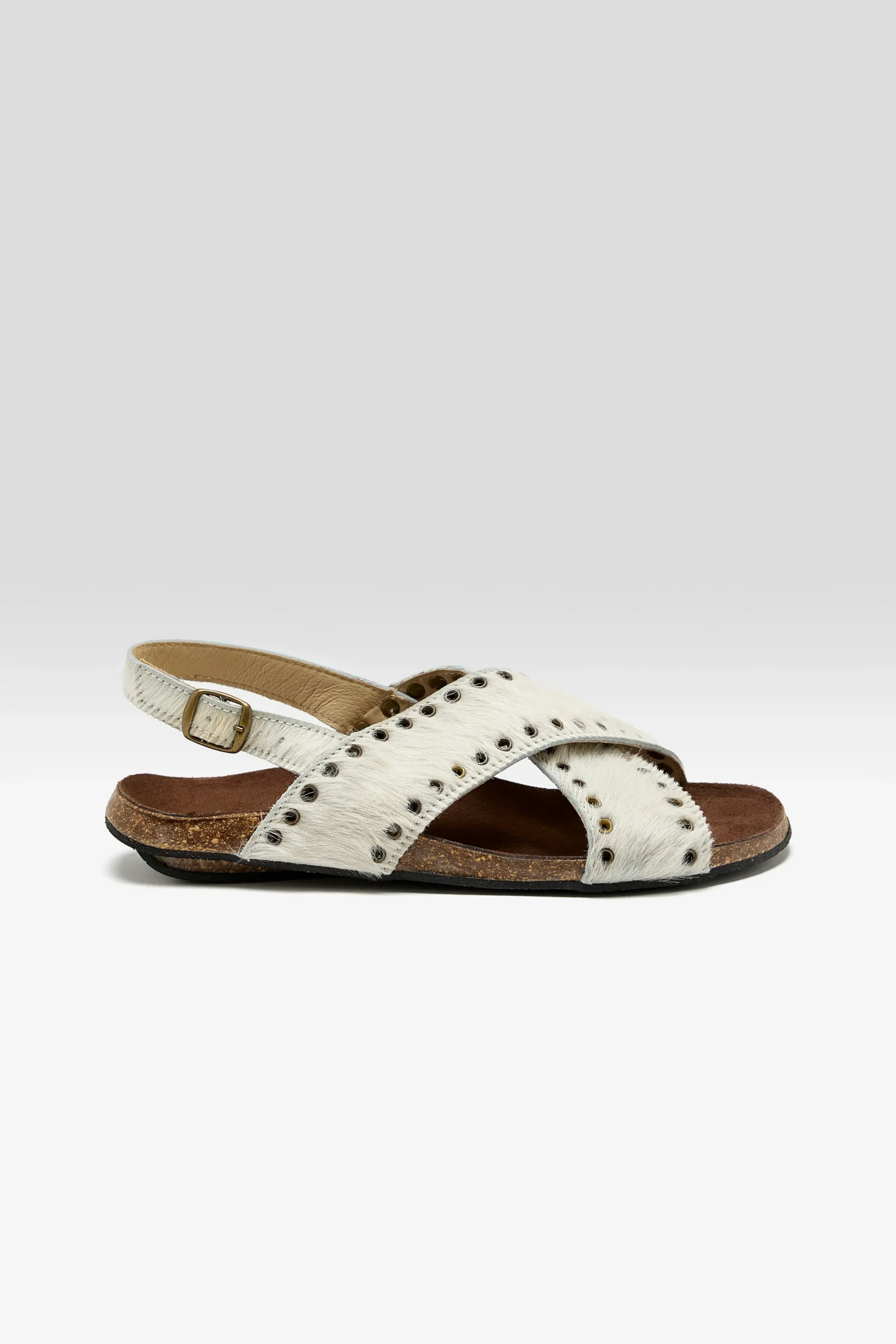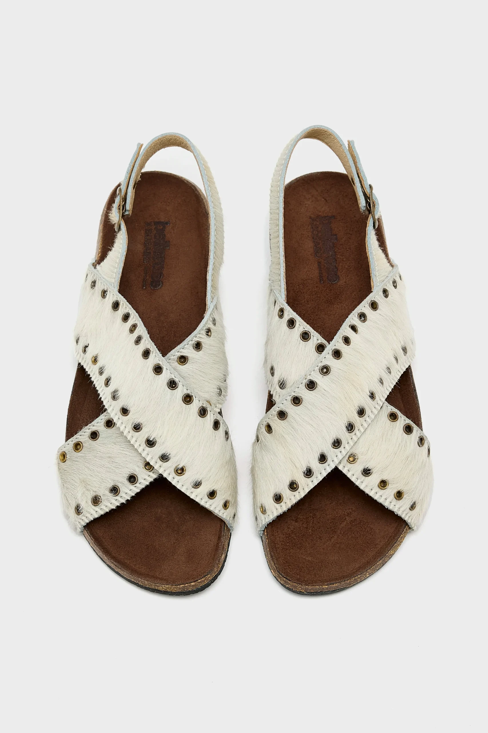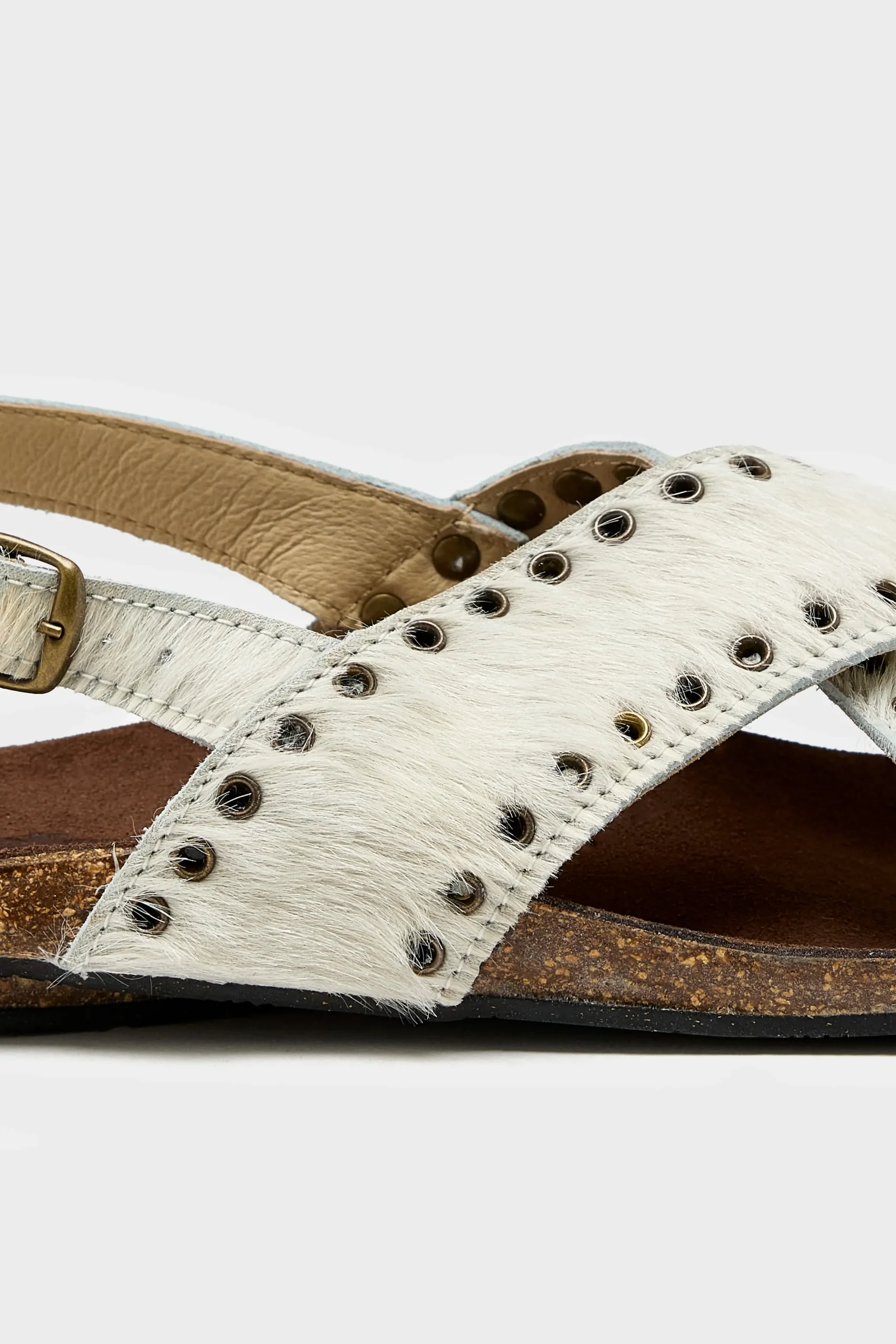 The handmade Bosabo Tevir leather sandals feature a hair-on leather upper with metal eyelets, adjustable heel strap, suede lining, and cork midsole.
